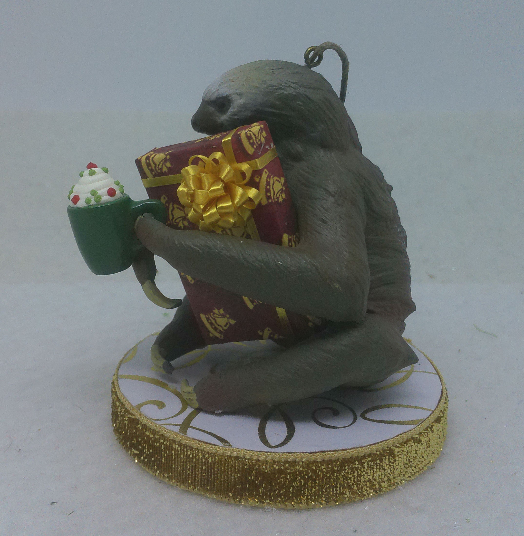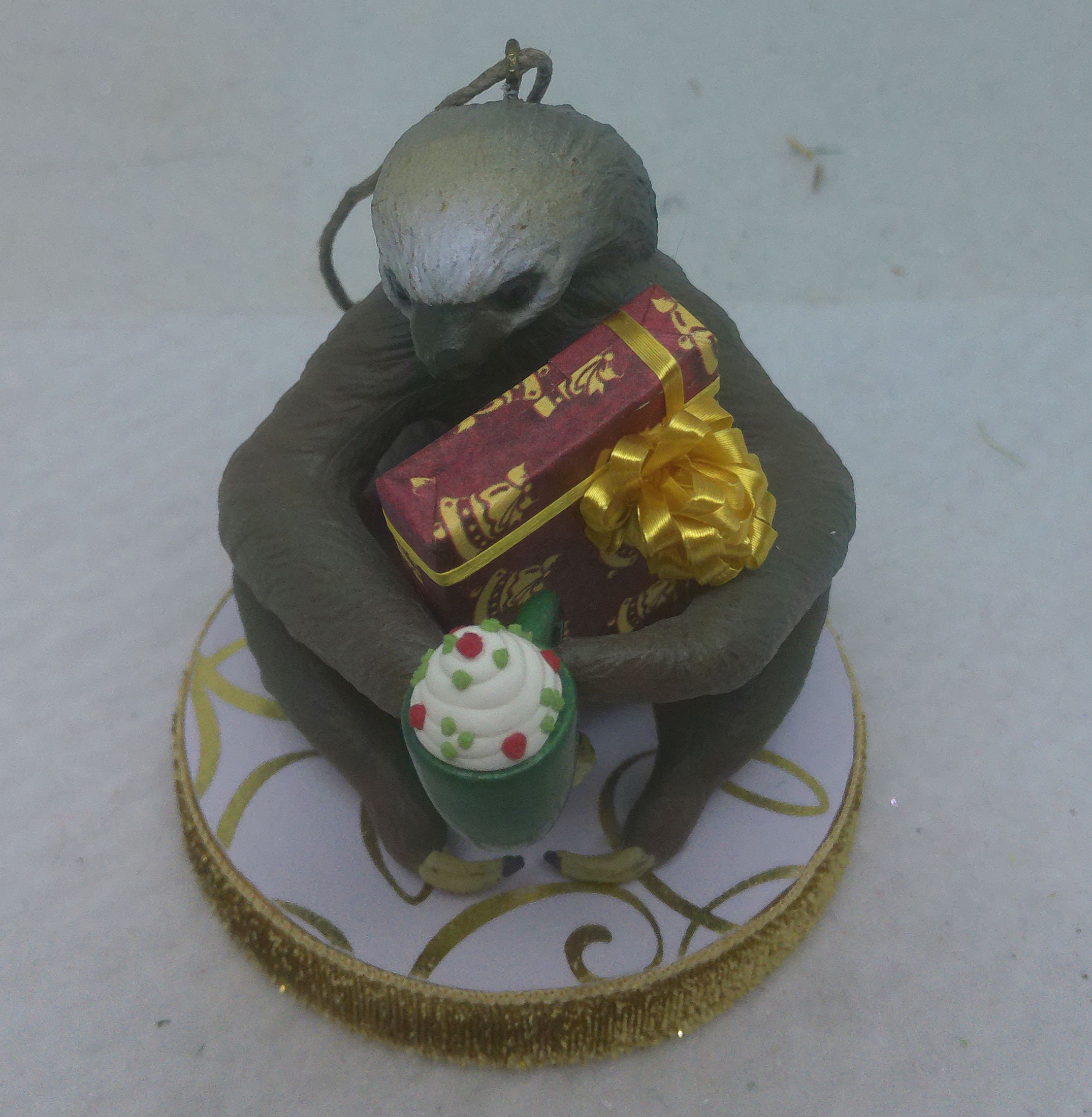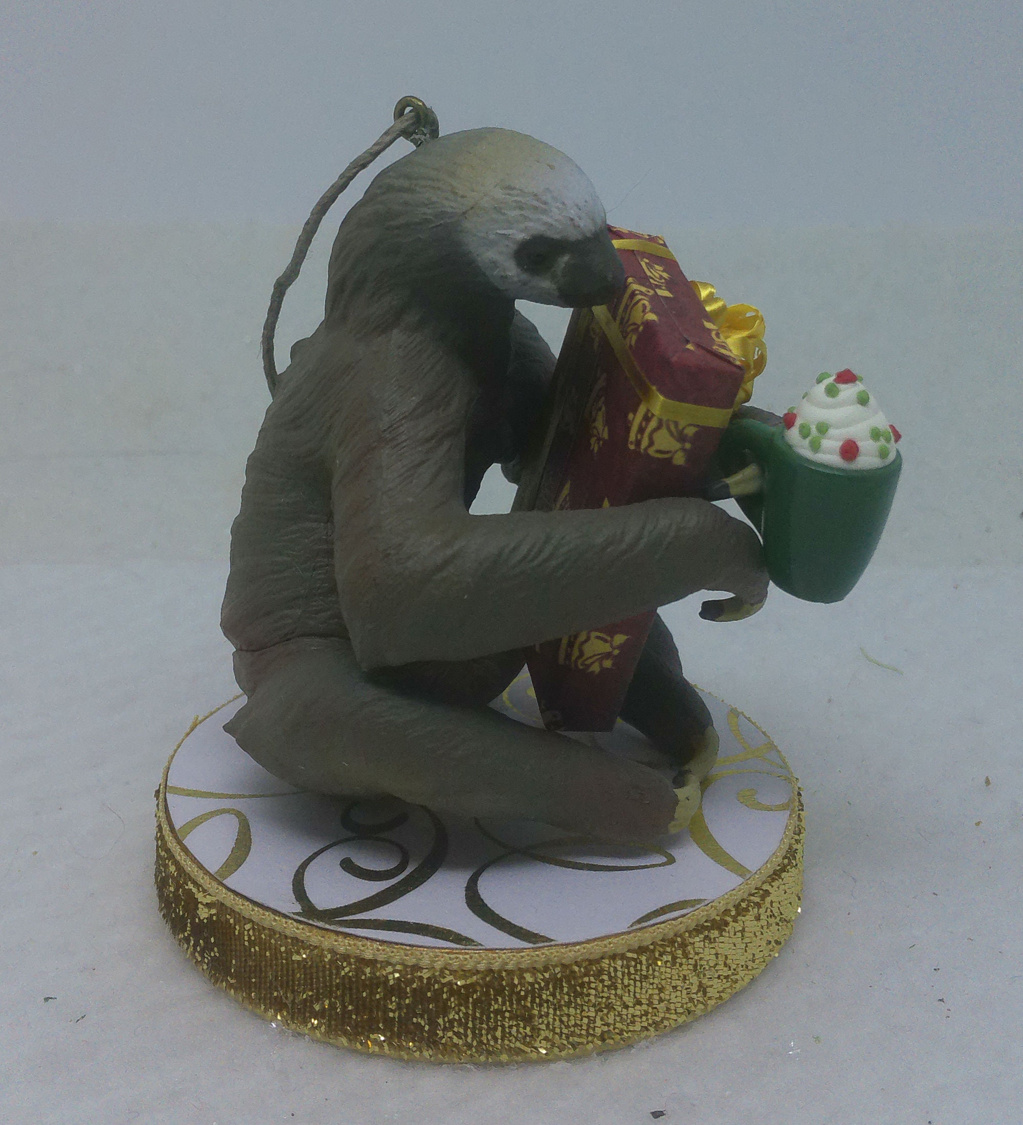 One of a kind, handcrafted Two Toed Sloth Christmas Ornament titled: Look What I Got! Want to guess how long it will take Susie Sloth to open her present? Susie is a Safari, Ltd realistic toy figurine. The base of this fun ornament is wood that I covered with scrapbook paper sealed with decoupage. The sides were painted then covered with decorative trim. The wrapped present and mug of hot chocolate topped with whipped cream are dollhouse miniature accessories.