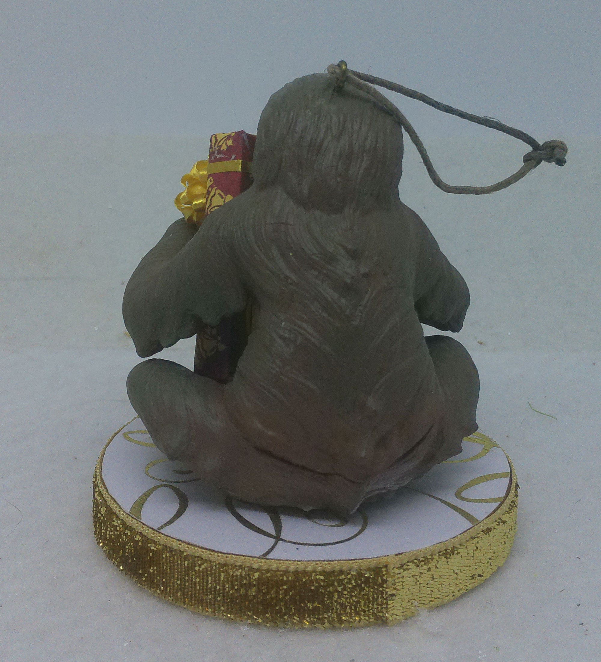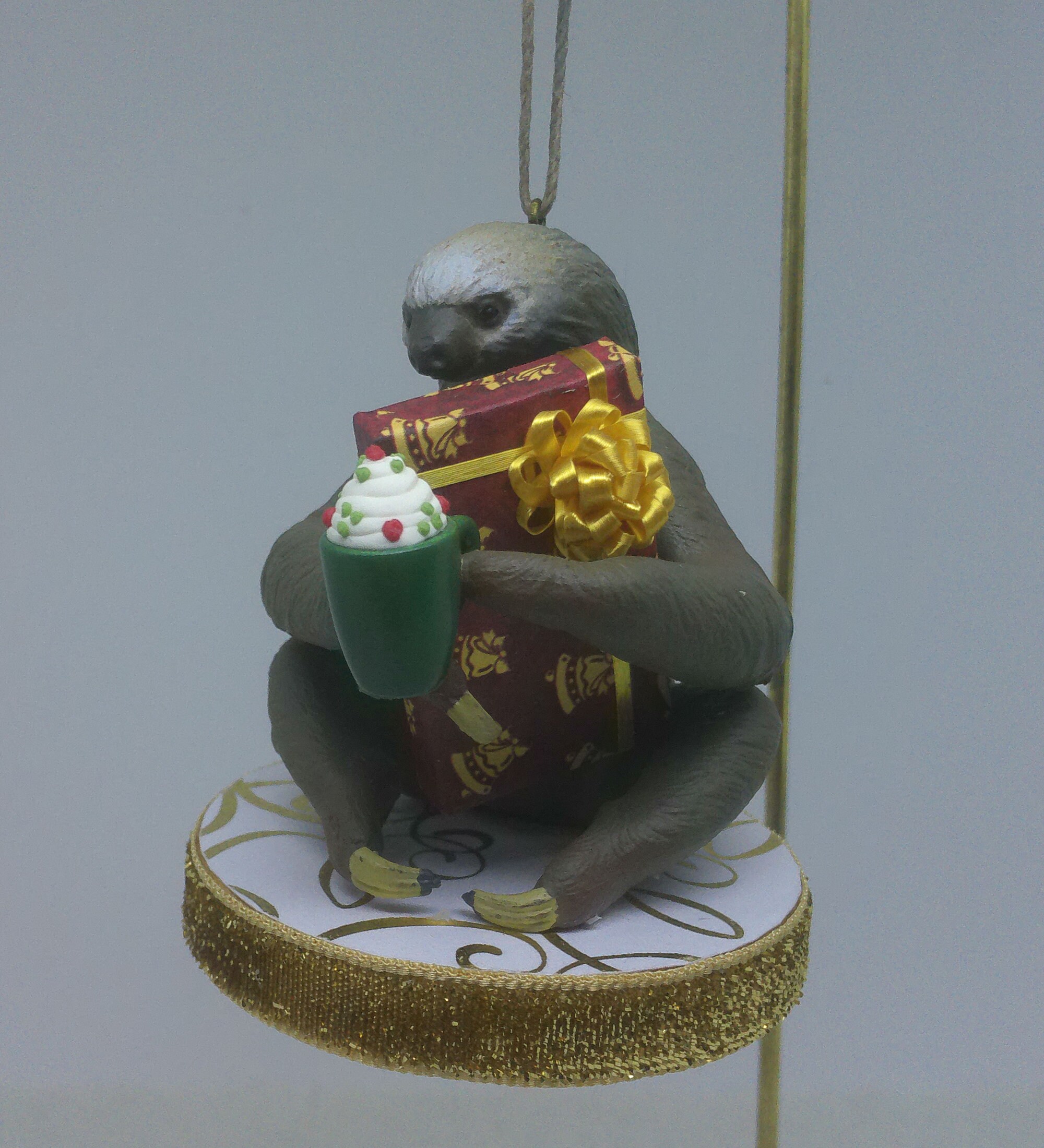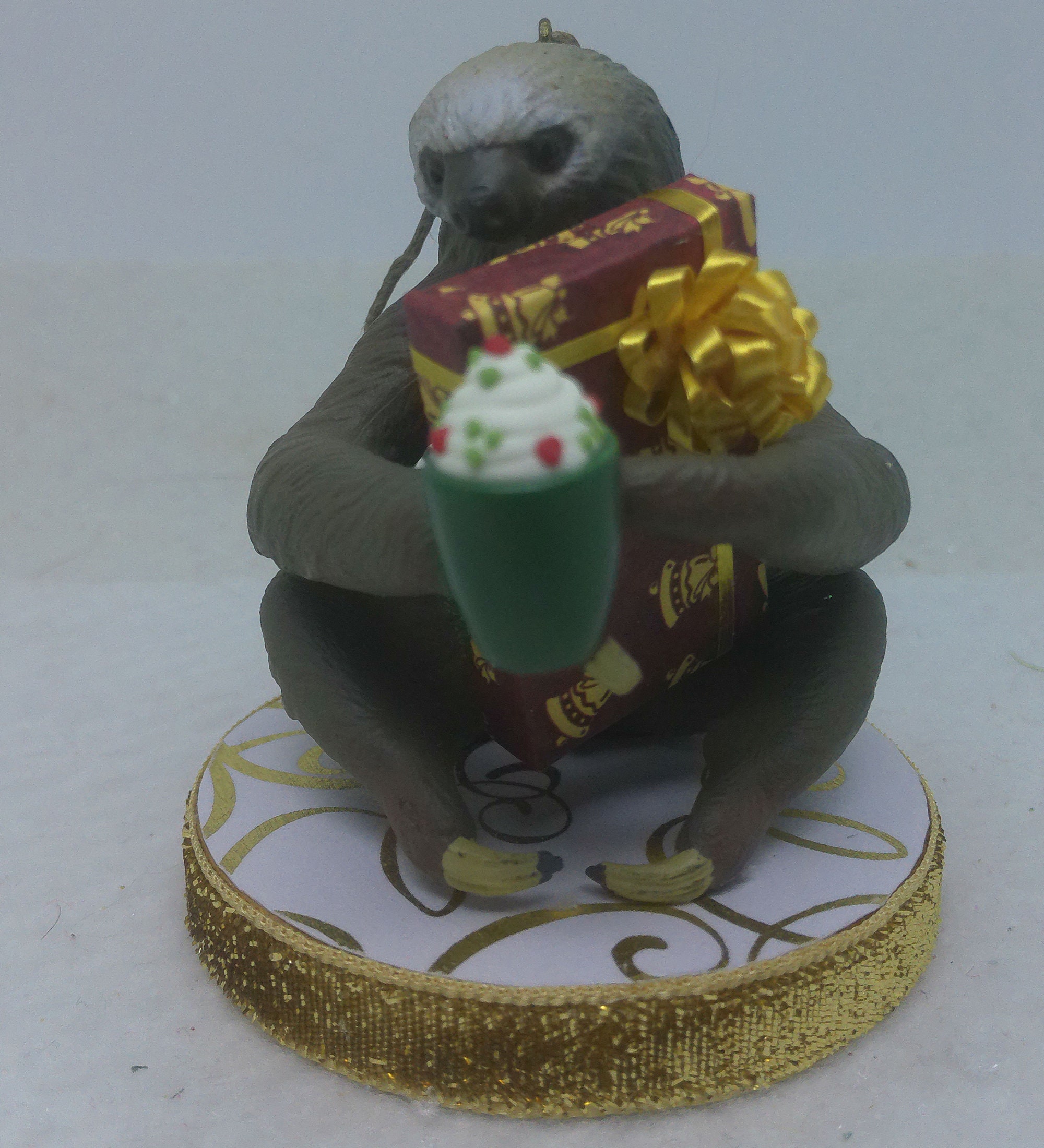 One of a kind, handcrafted Two Toed Sloth Christmas Ornament titled: Look What I Got! Want to guess how long it will take Susie Sloth to open her present? Susie is a Safari, Ltd realistic toy figurine. The base of this fun ornament is wood that I covered with scrapbook paper sealed with decoupage. The sides were painted then covered with decorative trim. The wrapped present and mug of hot chocolate topped with whipped cream are dollhouse miniature accessories.