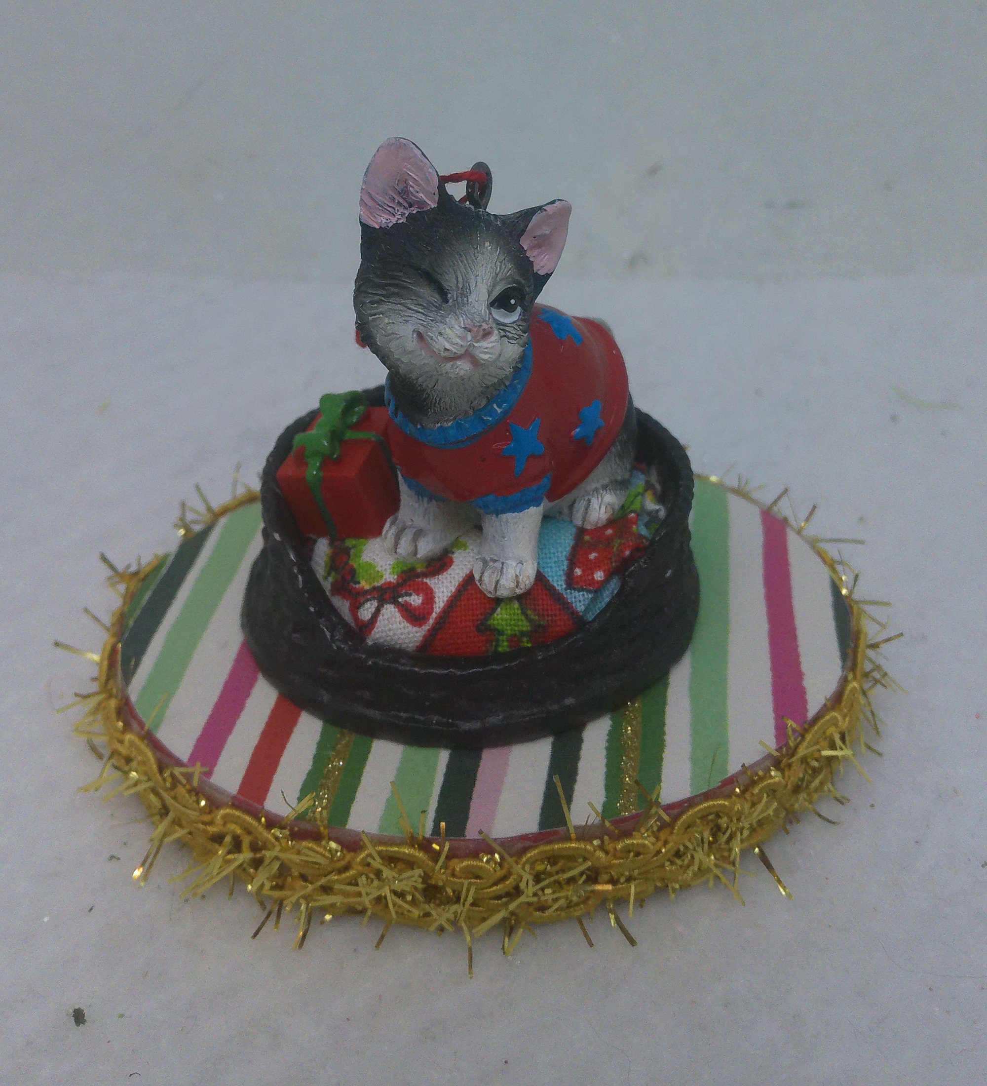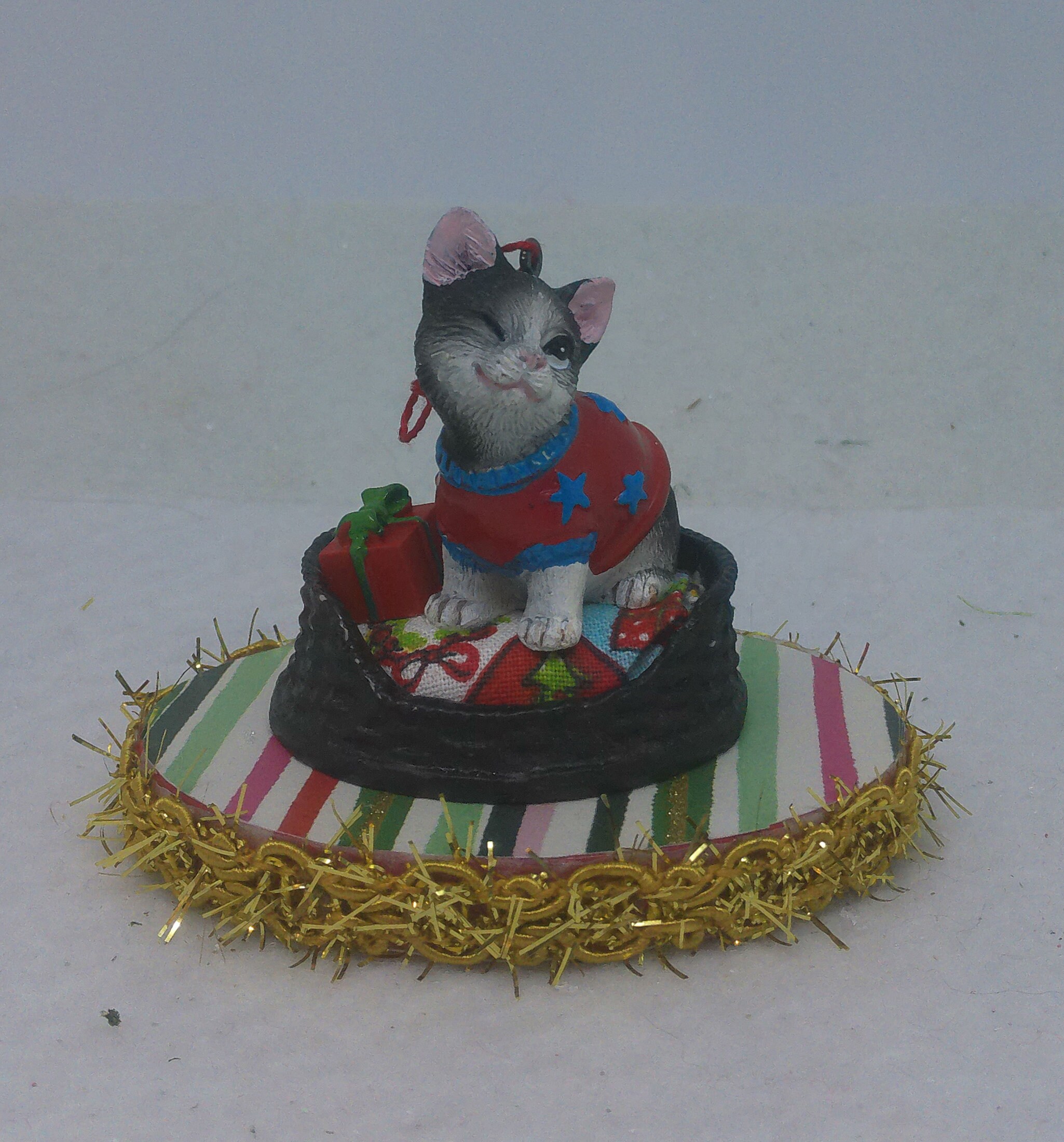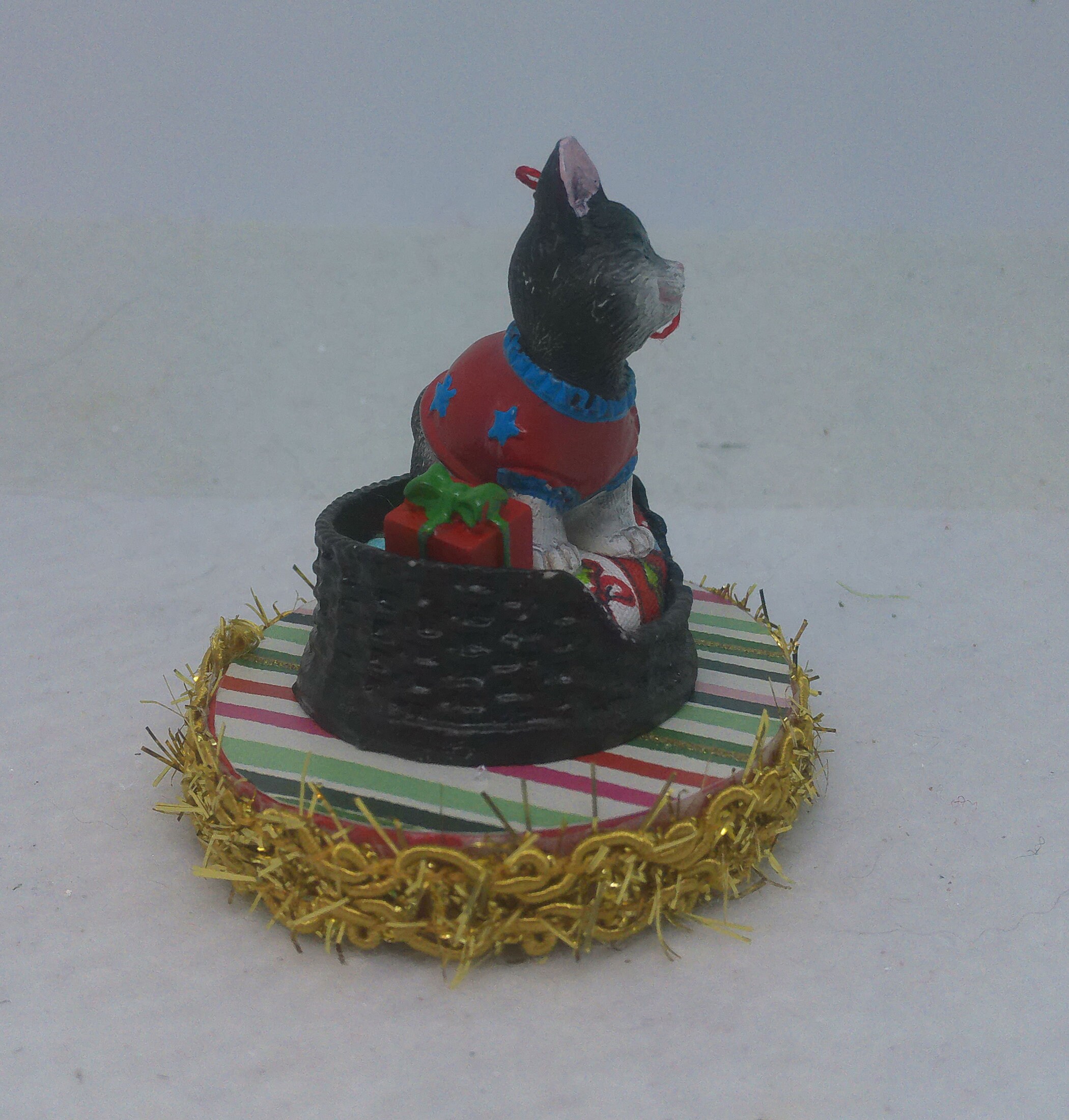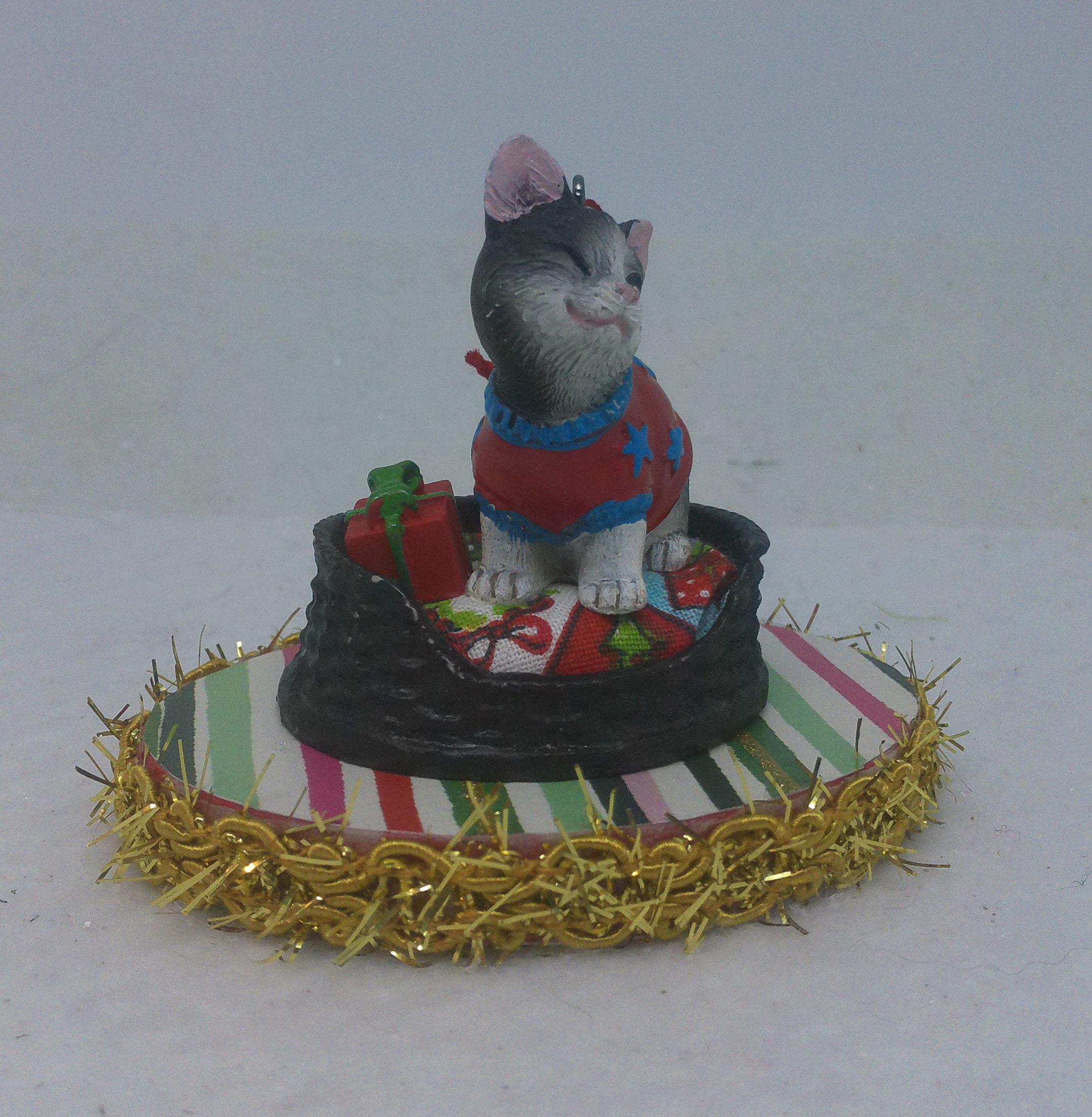 The base of this ornament is wood. I covered the top and bottom with scrapbook paper sealed with decoupage. The sides were painted then covered with decorative trim. The winking, grayish black and white kitten is made of resin. I covered the bed cushion with a holiday themed fabric and added the wrapped present.