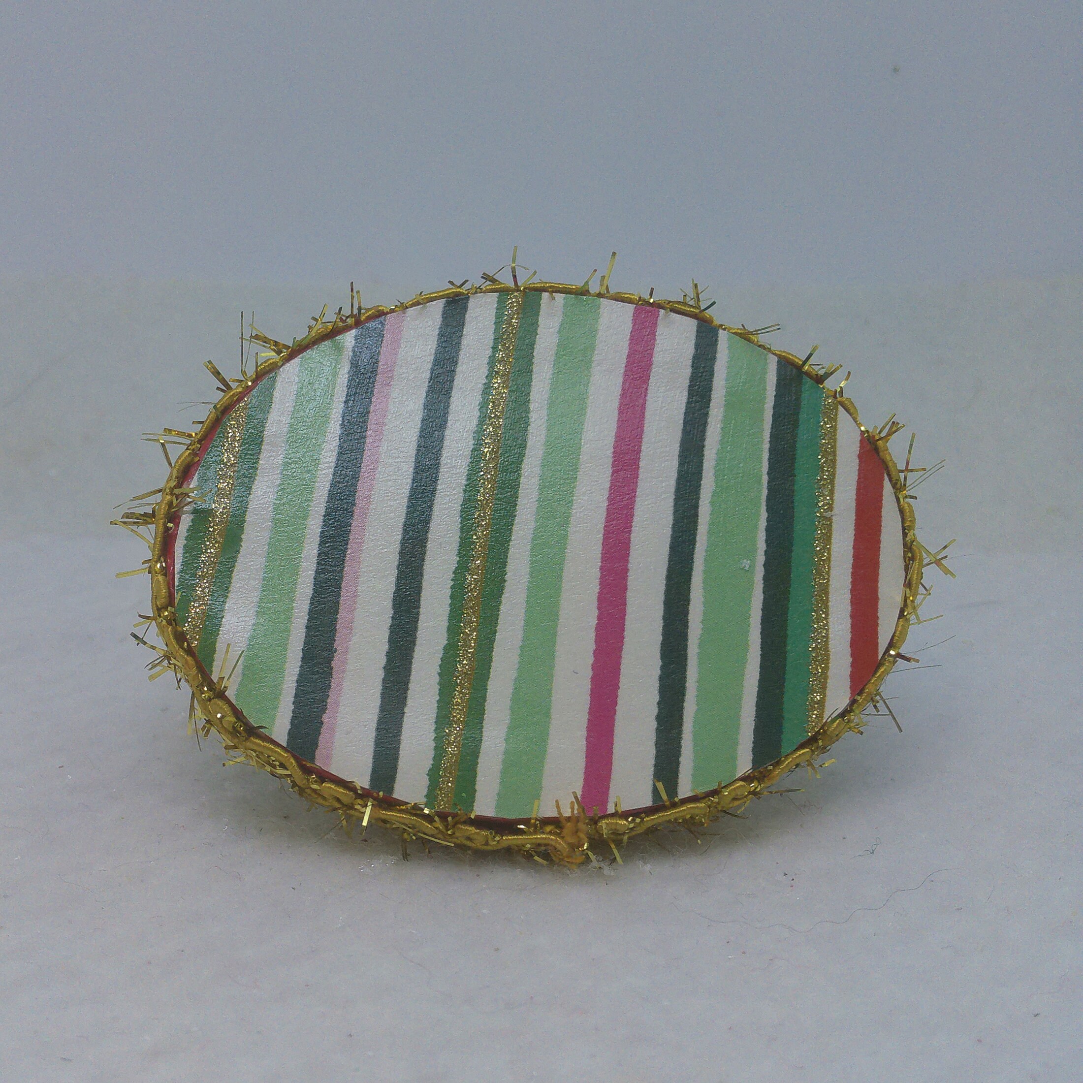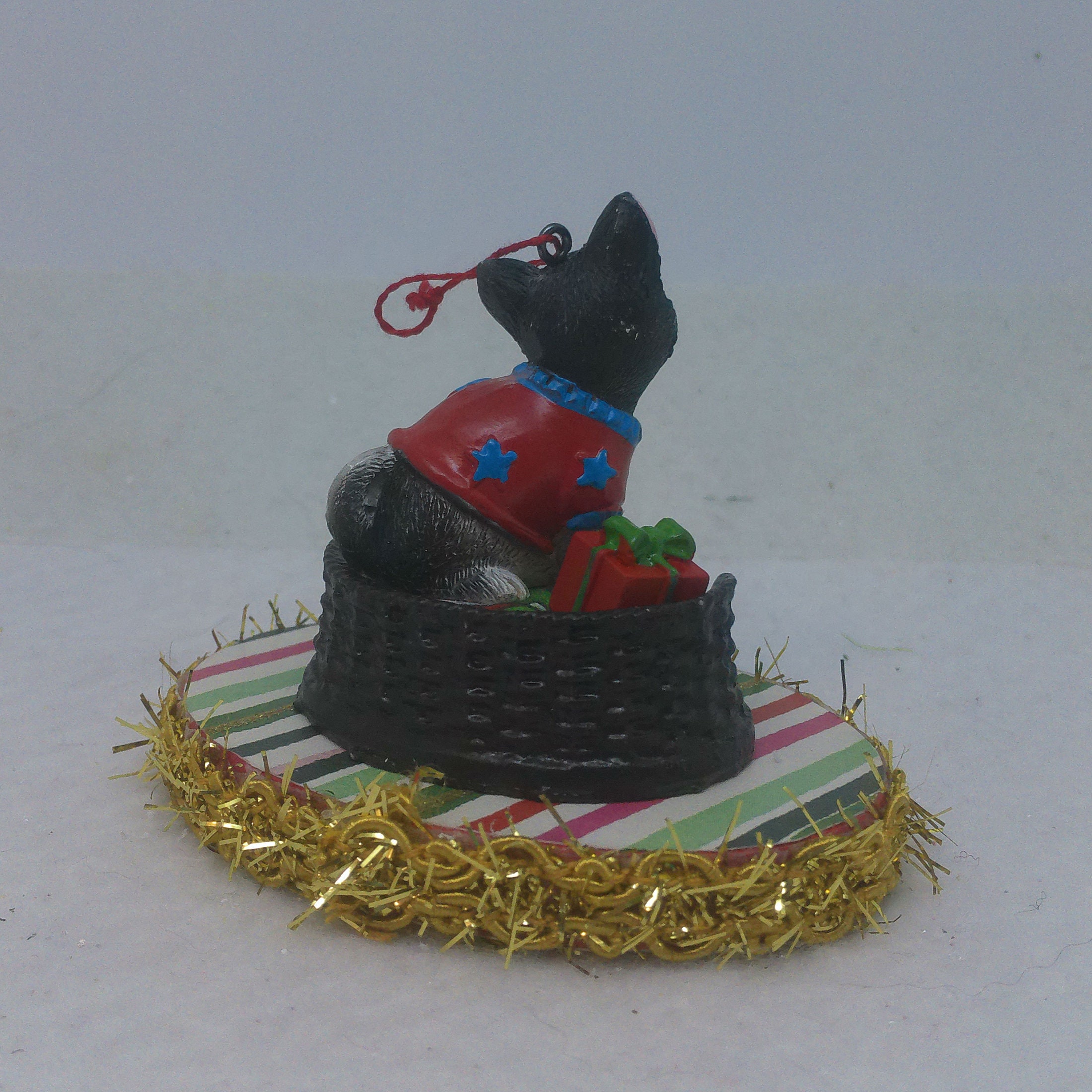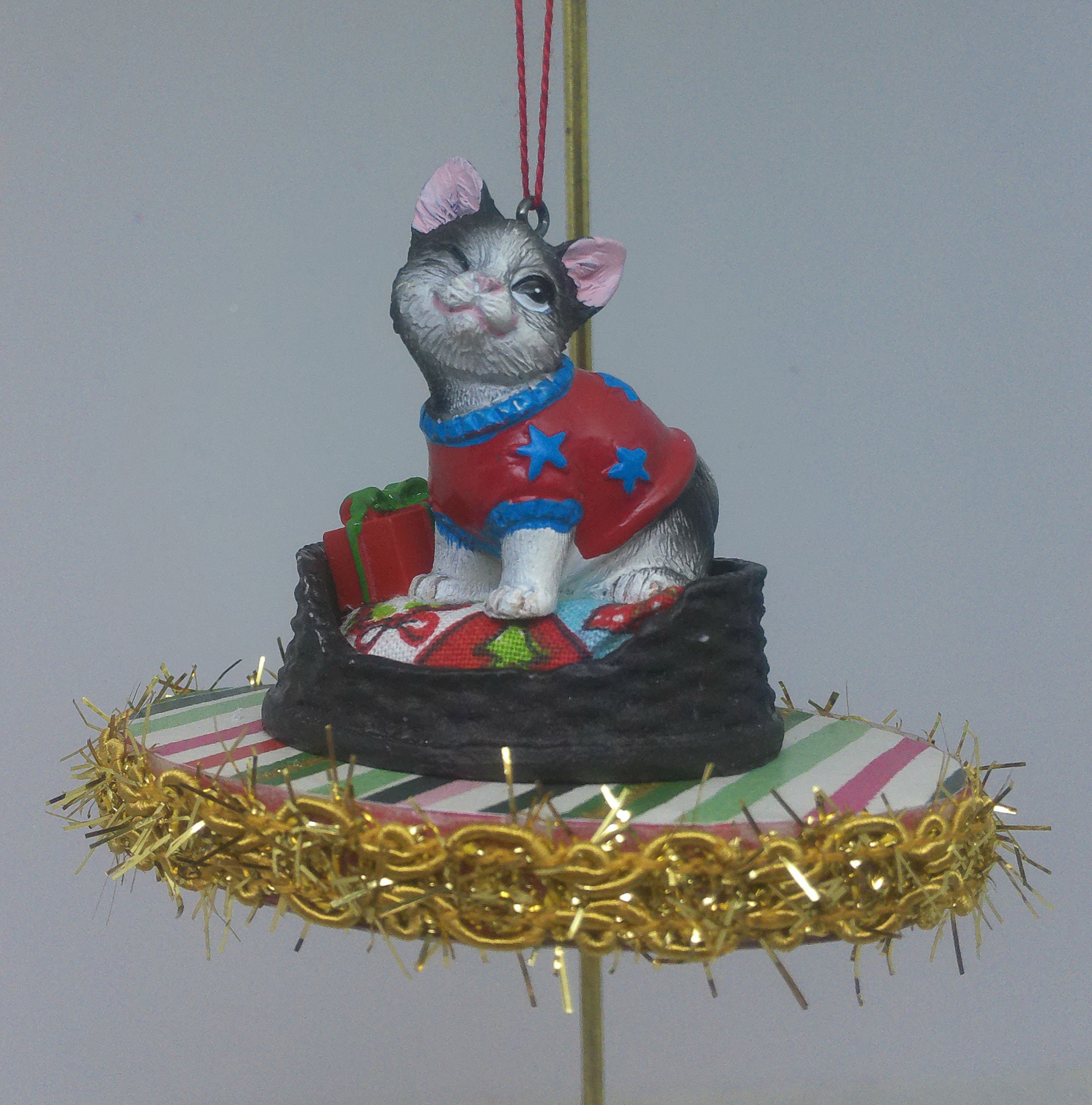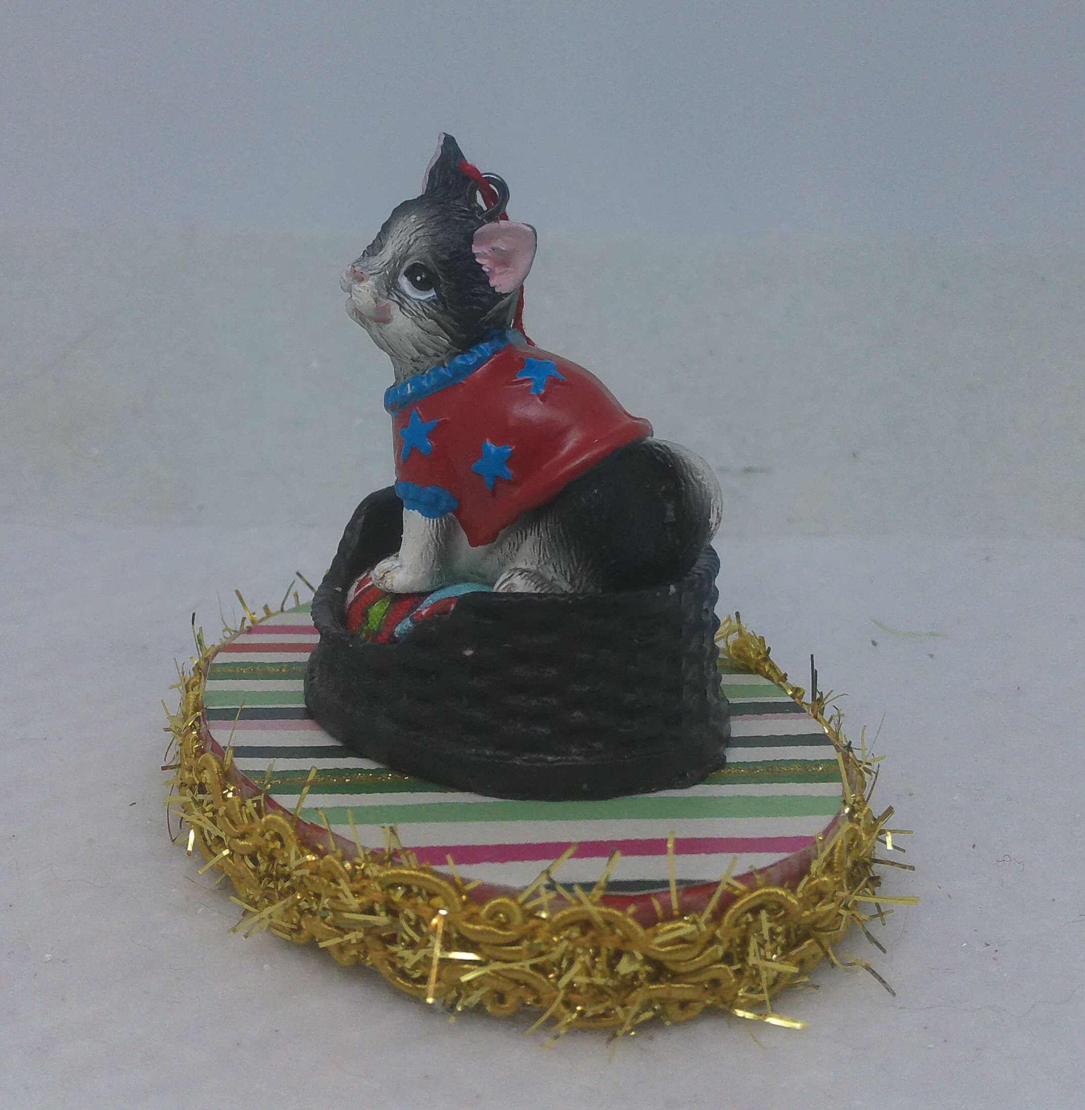 The base of this ornament is wood. I covered the top and bottom with scrapbook paper sealed with decoupage. The sides were painted then covered with decorative trim. The winking, grayish black and white kitten is made of resin. I covered the bed cushion with a holiday themed fabric and added the wrapped present.
