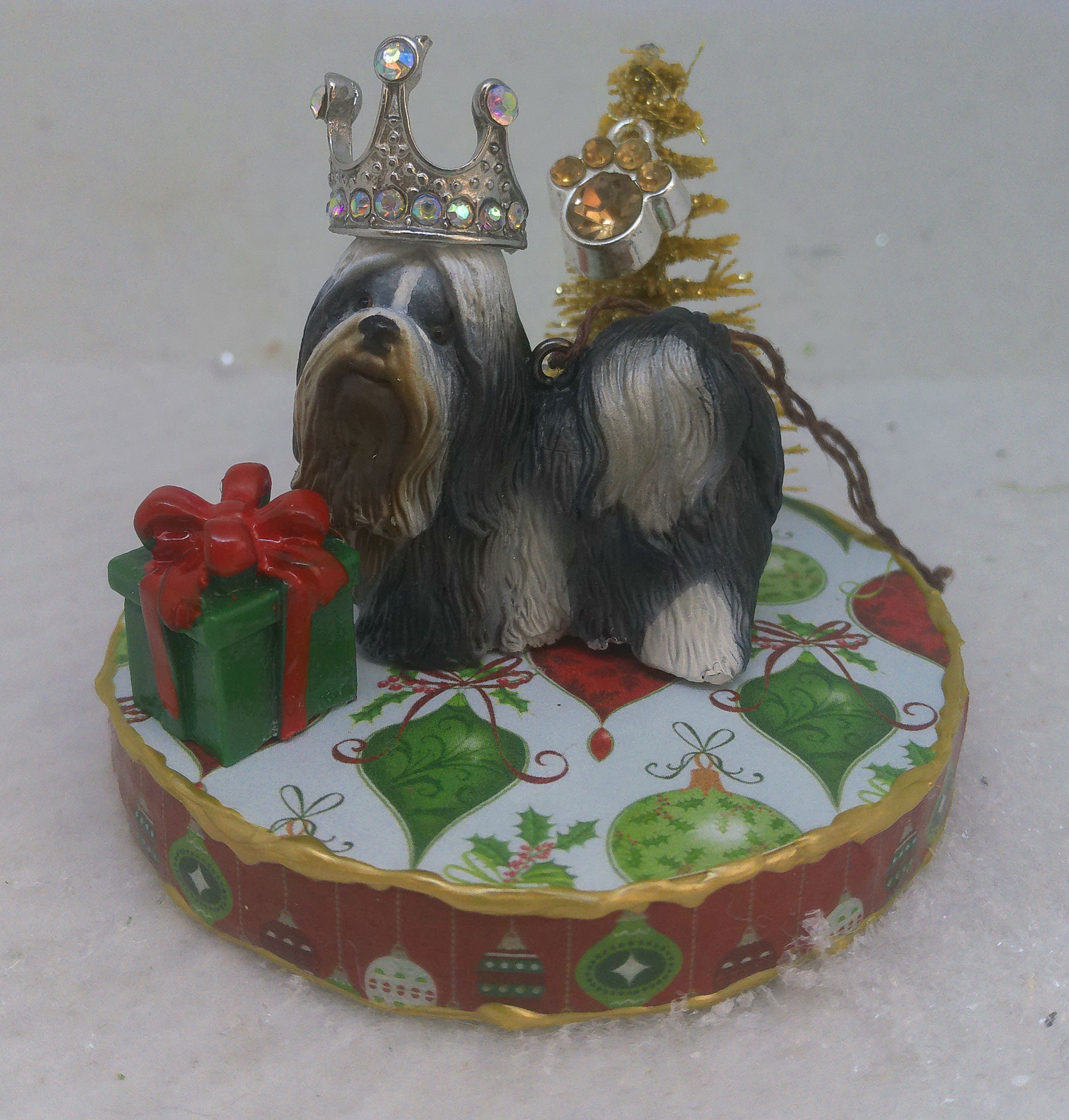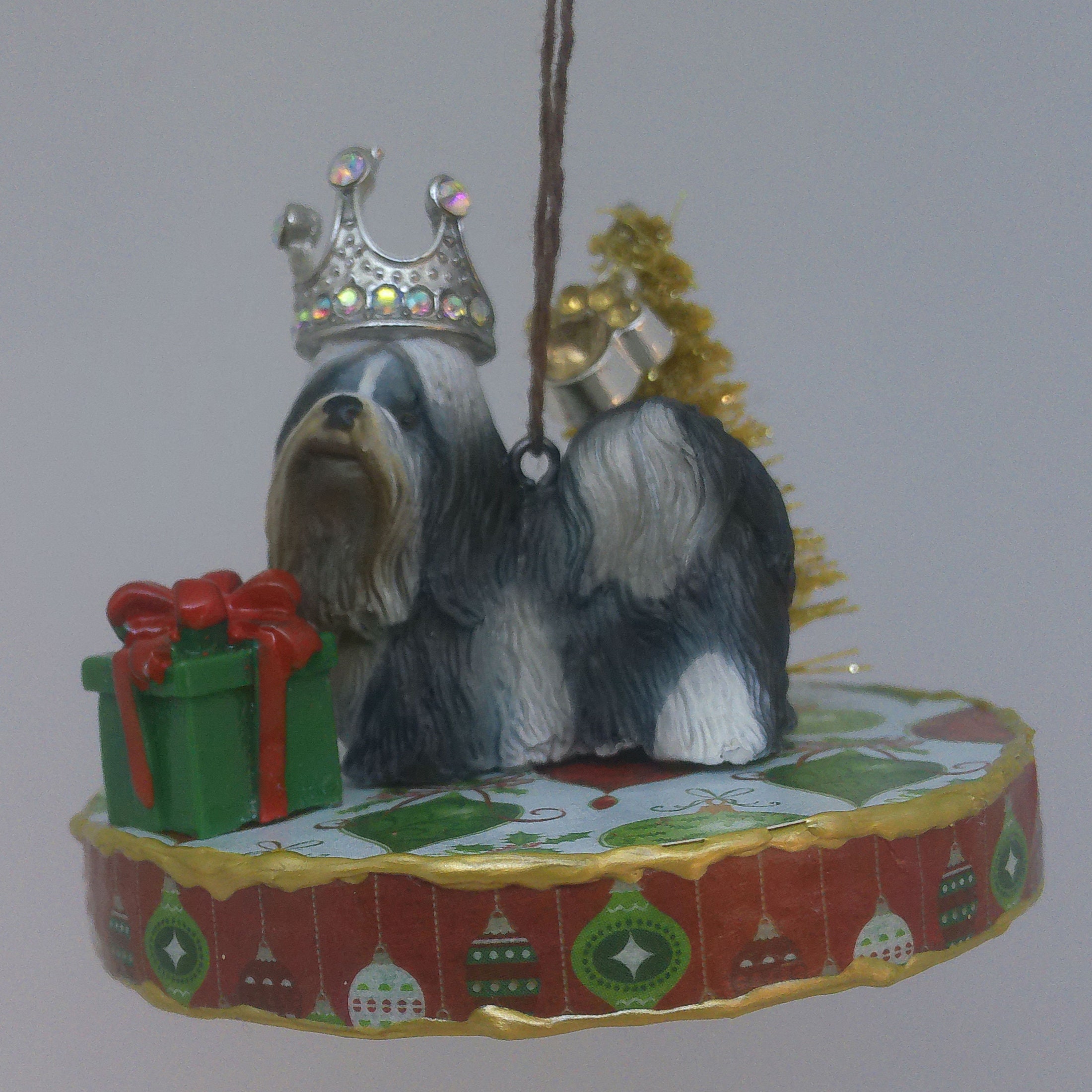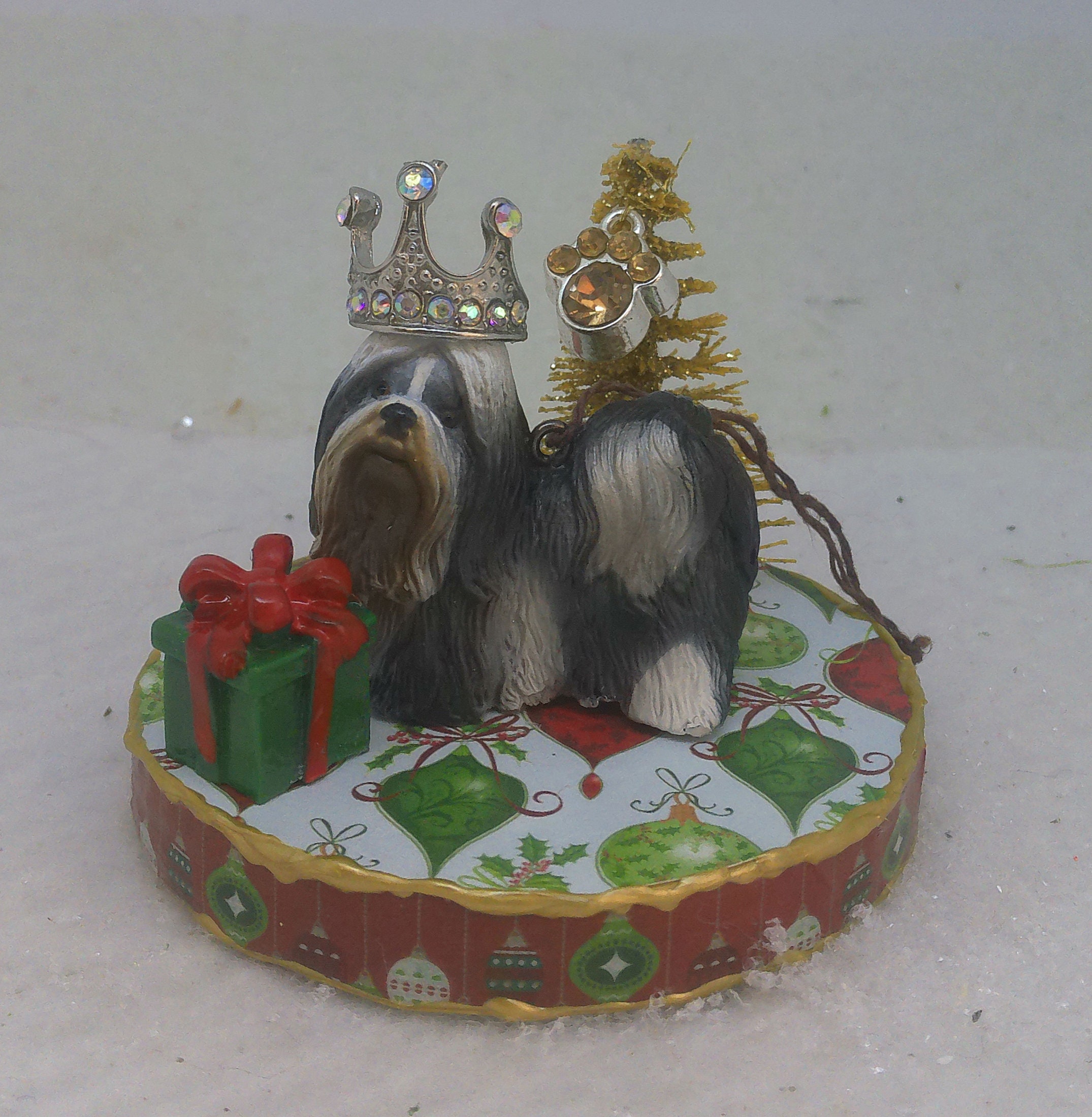 One of a kind, handcrafted Shih Tzu Christmas ornament titled: A Present for the Queen.