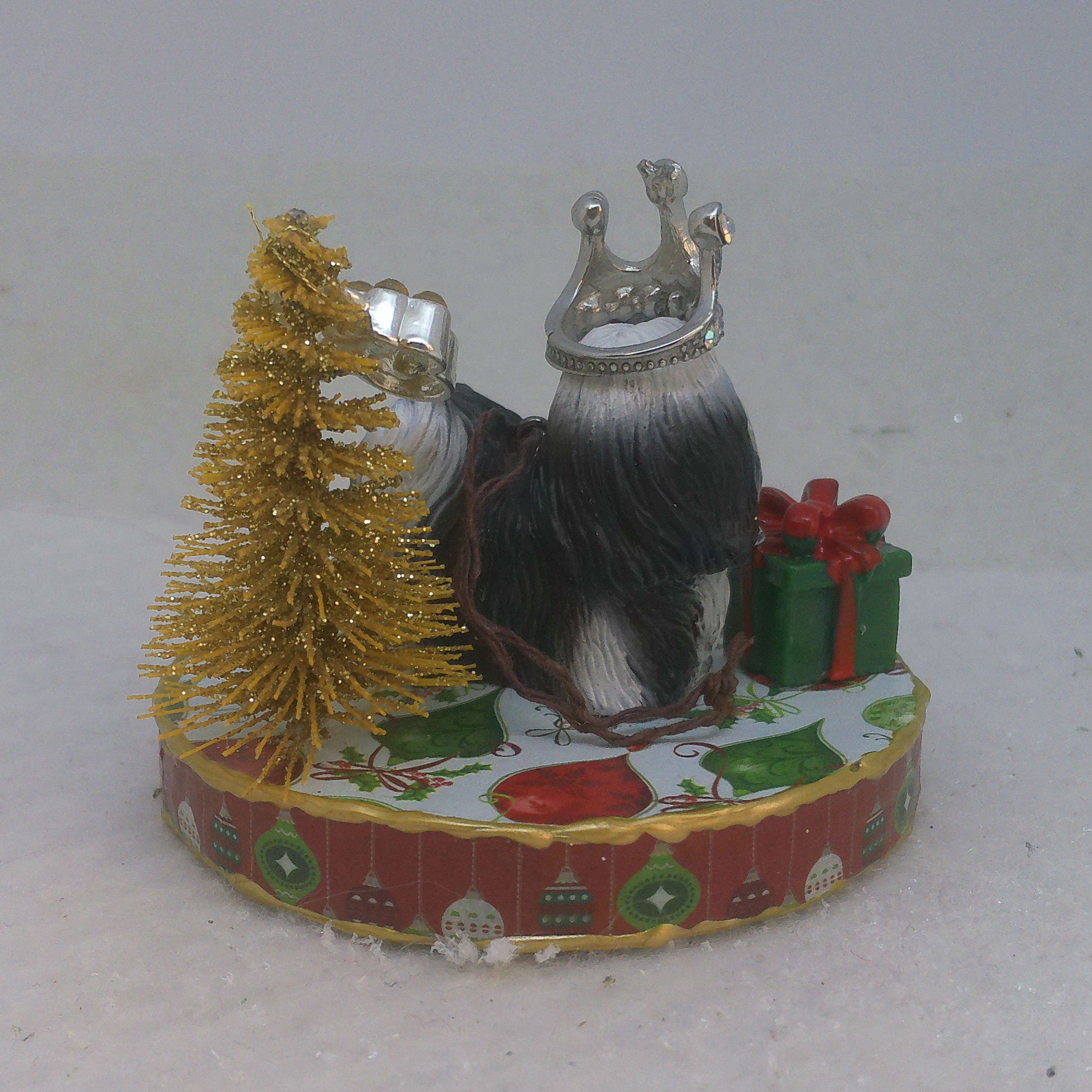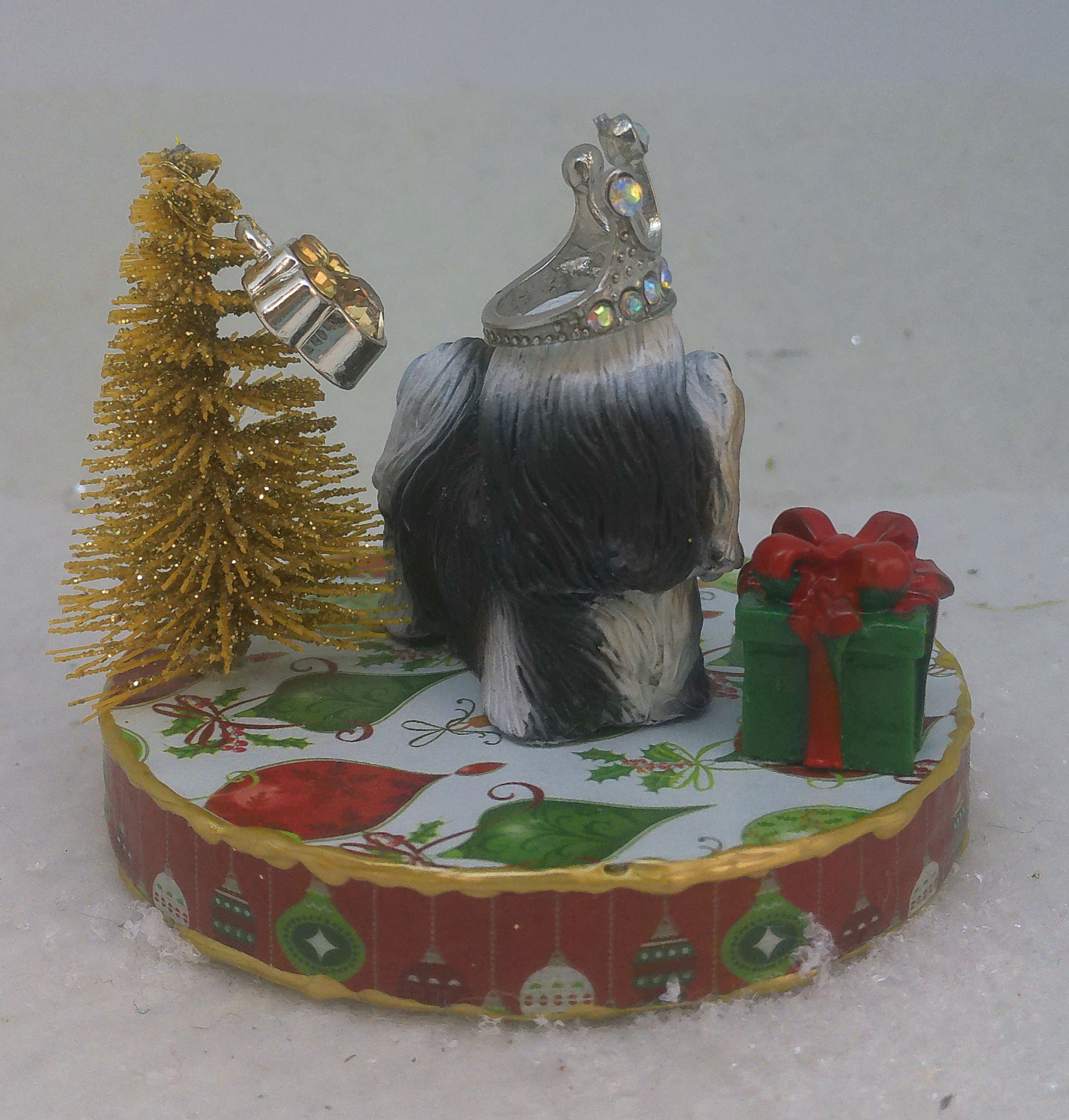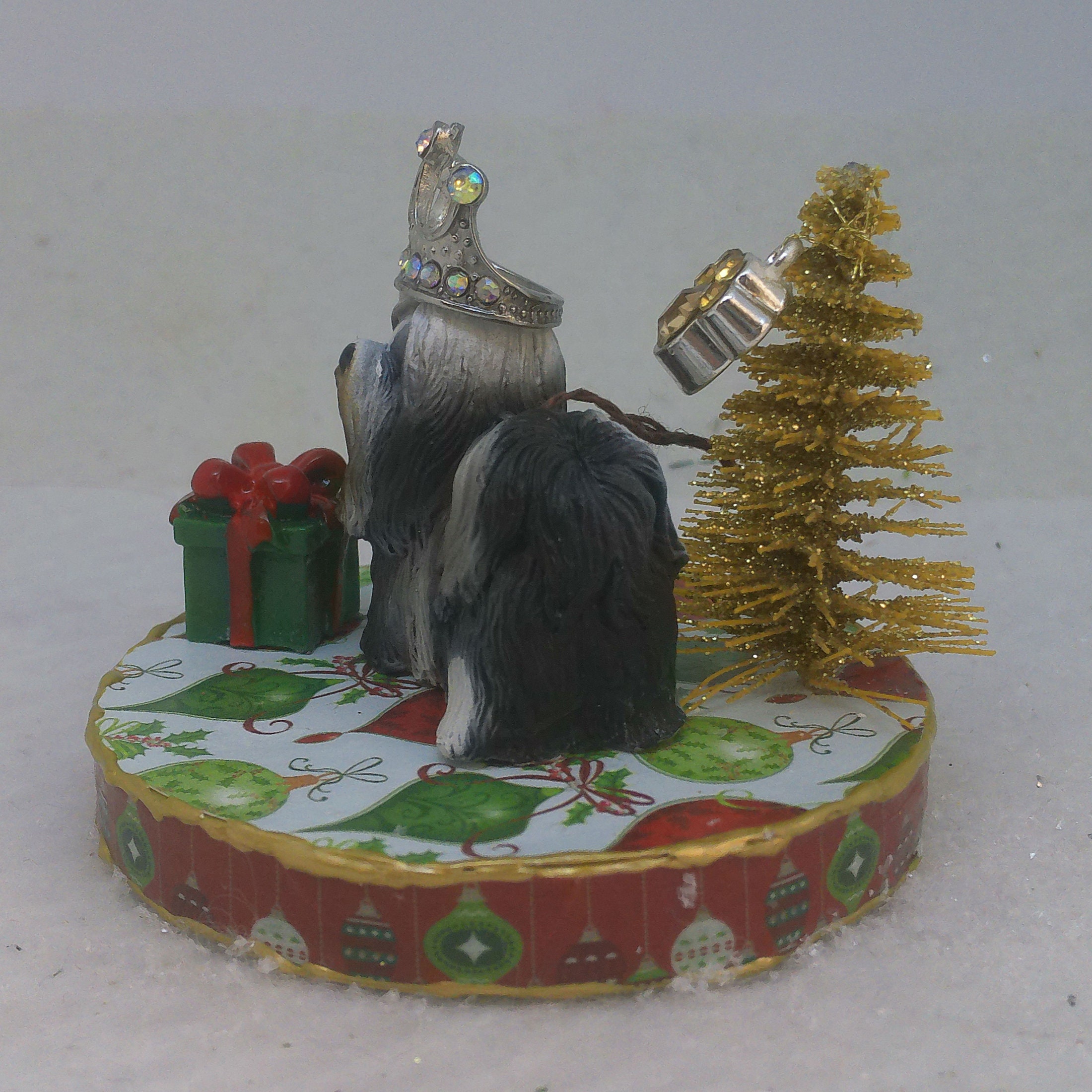 One of a kind, handcrafted Shih Tzu Christmas ornament titled: A Present for the Queen.