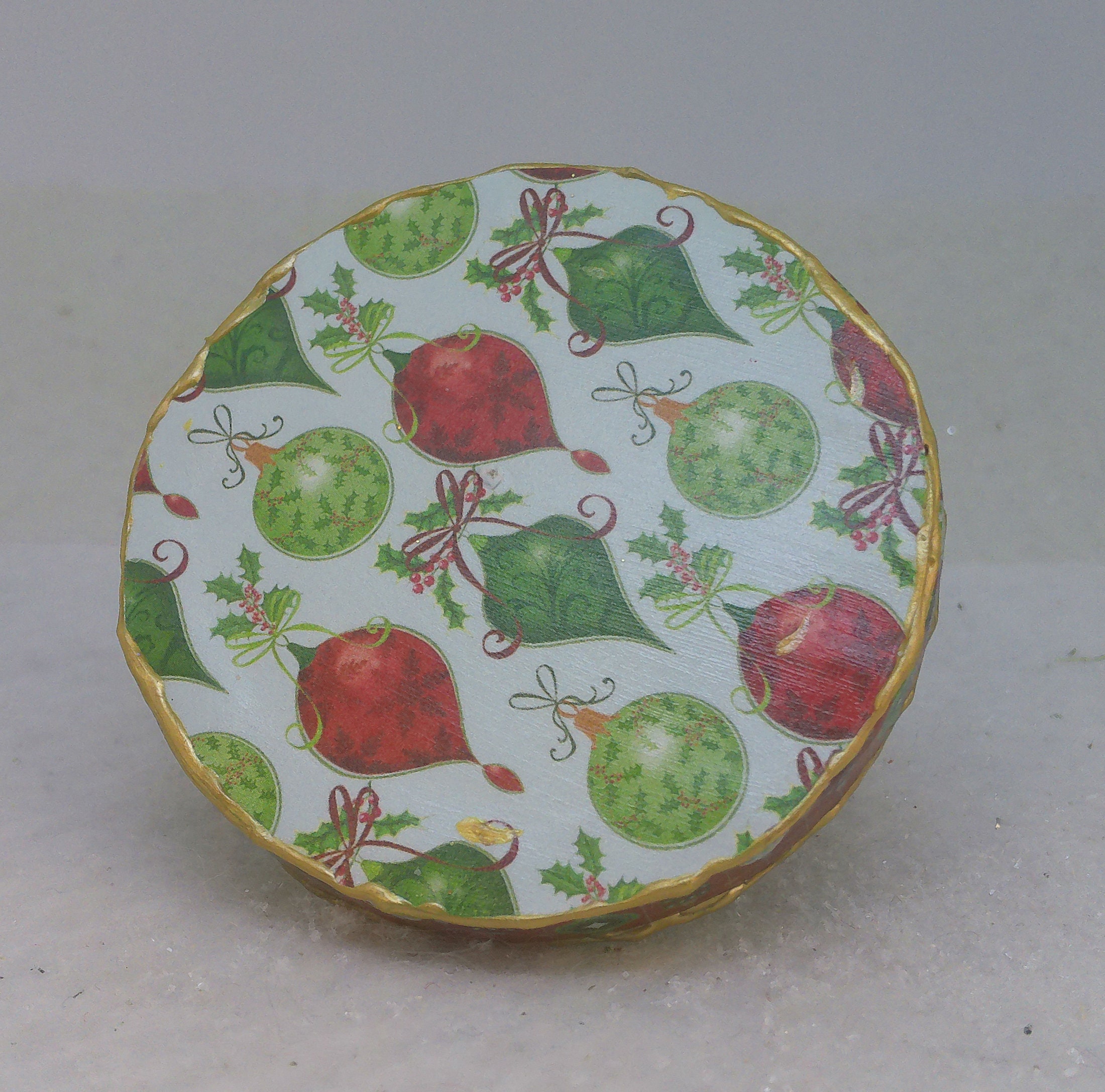 This adorable Shih Tzu is a Breyer realistic toy figurine. I added the crown. The base of this ornament is wood. I covered the top and bottom with scrapbook paper, added washi tape to the sides and sealed everything with decoupage then finished the edges off with Liquid Pearls paint. I used a dog paw charm to decorate the little tree.