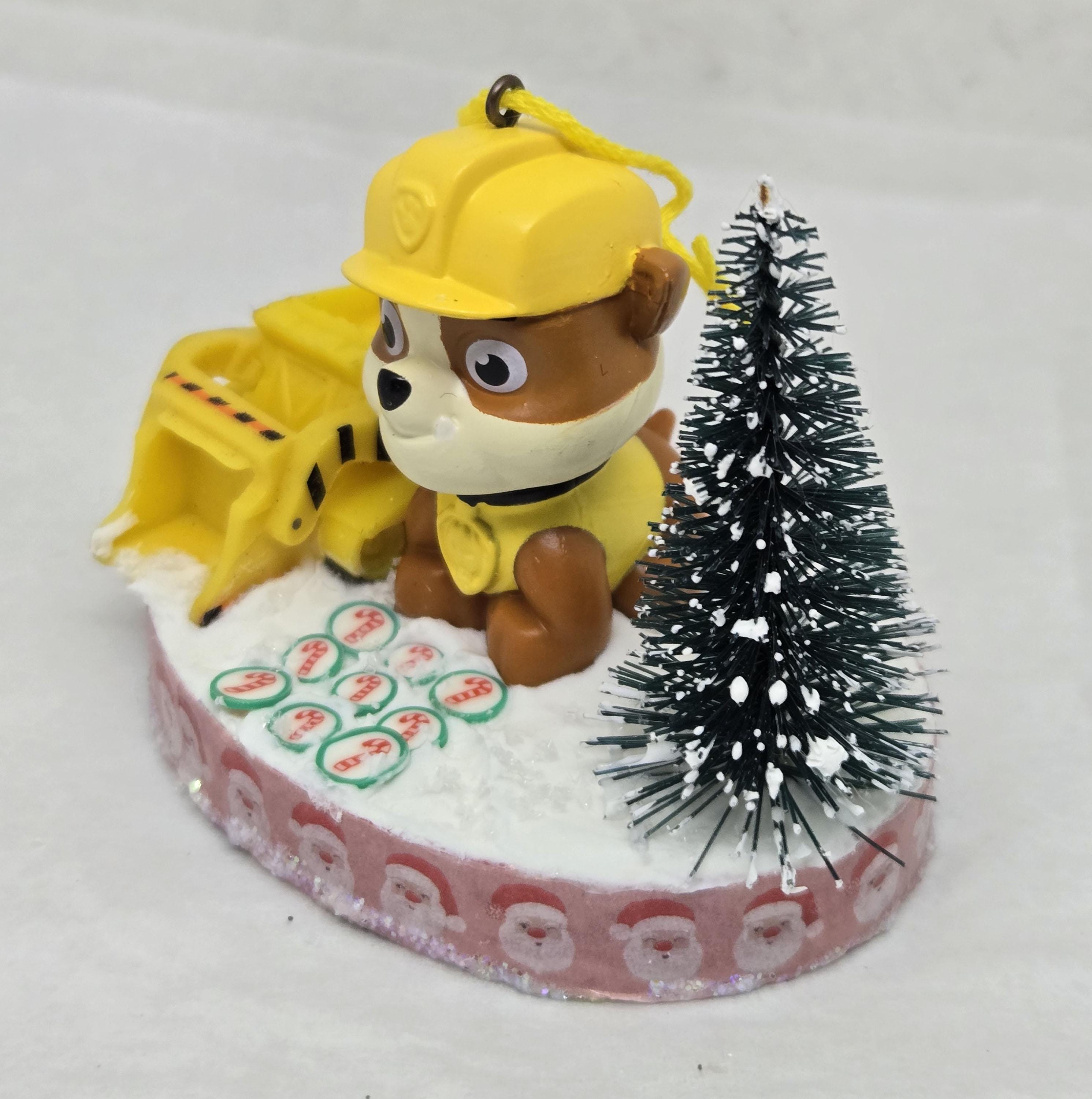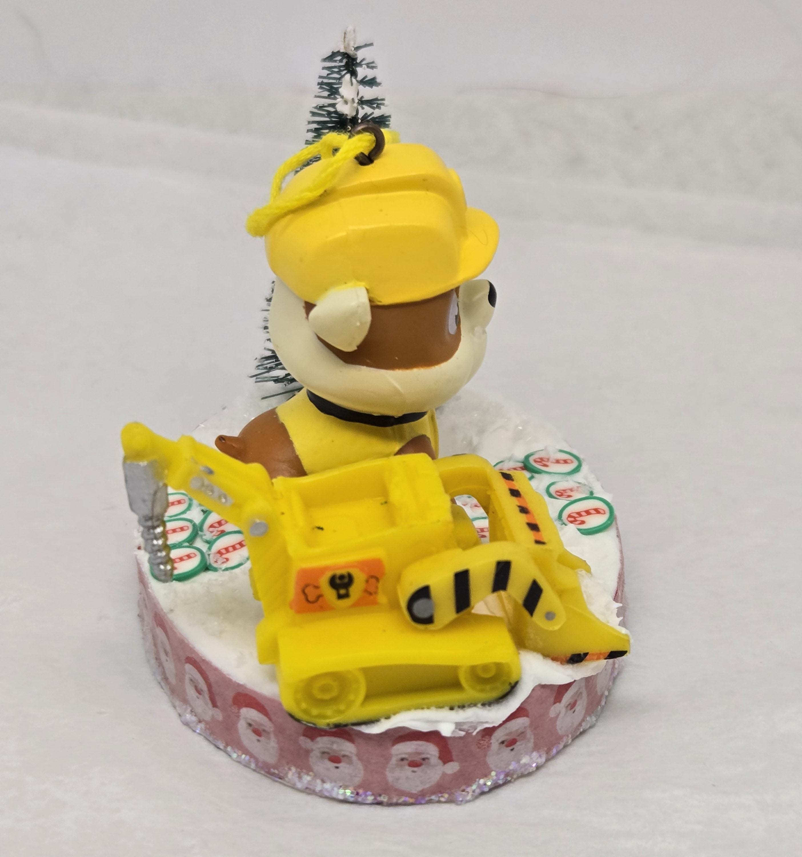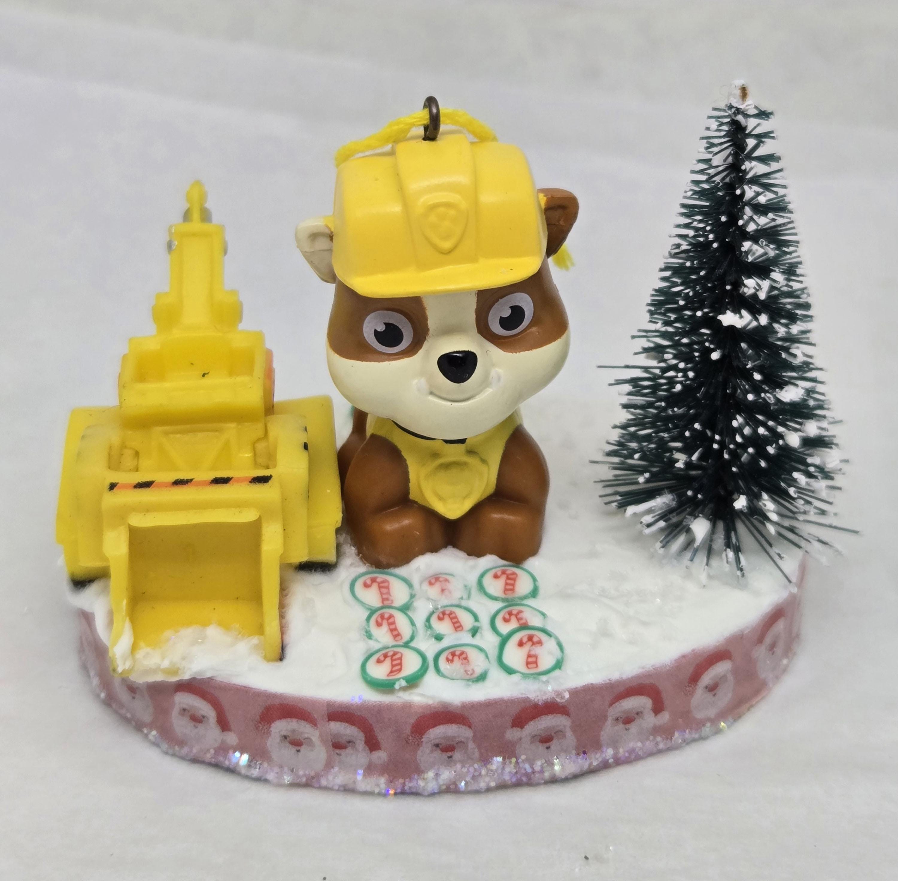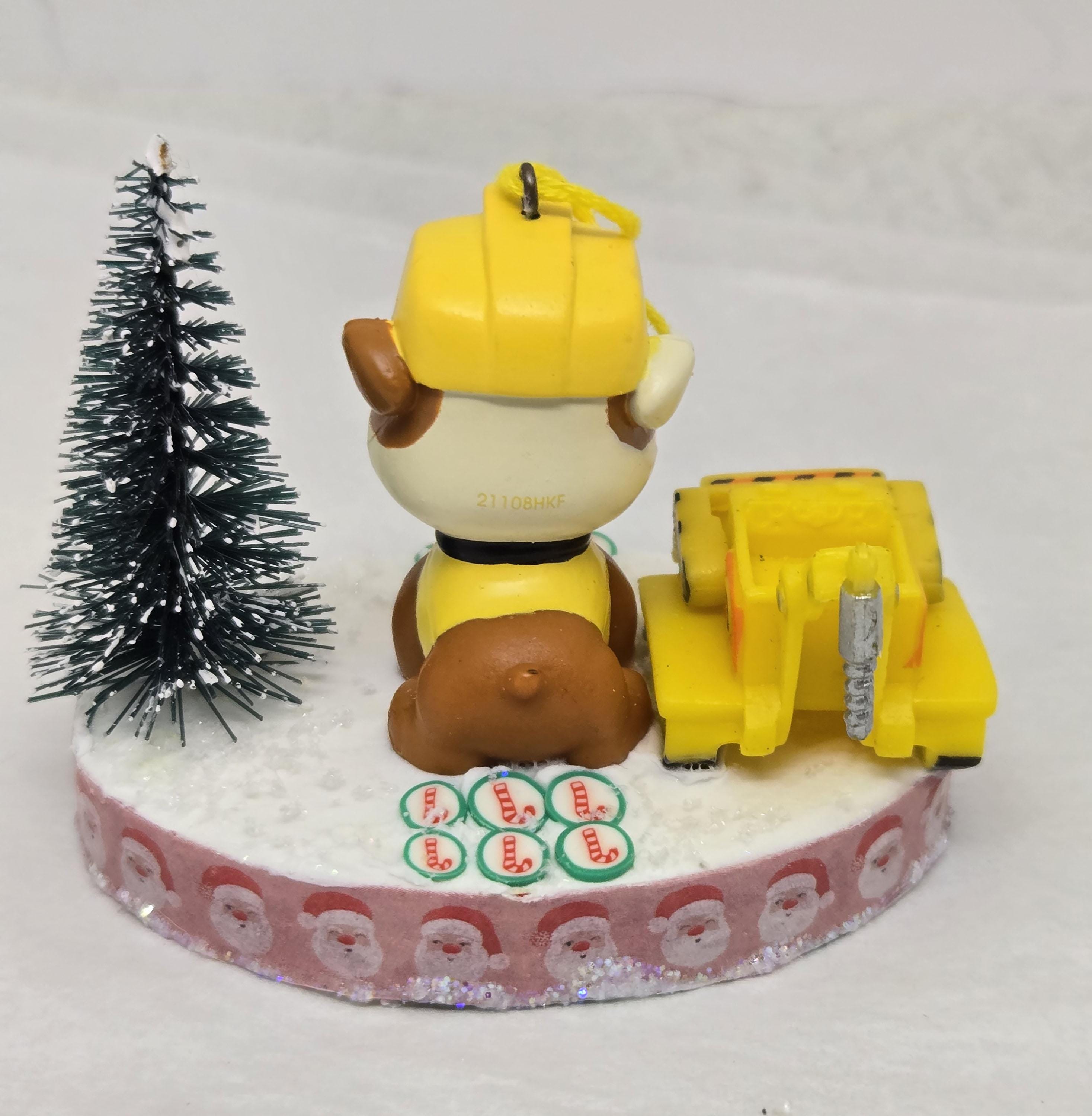 One of a kind, handcrafted Rubble Paw Patrol Christmas Ornament. Rubble used his heavy equipment to clear the candy cane road he's standing on in preparation for the Christmas Parade. Rubble and the front loader are toy figurines. The "road" is paved with clay candy cane discs. The base of this ornament is wood. I covered the bottom with scrapbook paper sealed with decoupage. The sides were painted then covered with washi tape. I also put glitter glue around the bottom edge. The top was painted then covered with artificial snow.