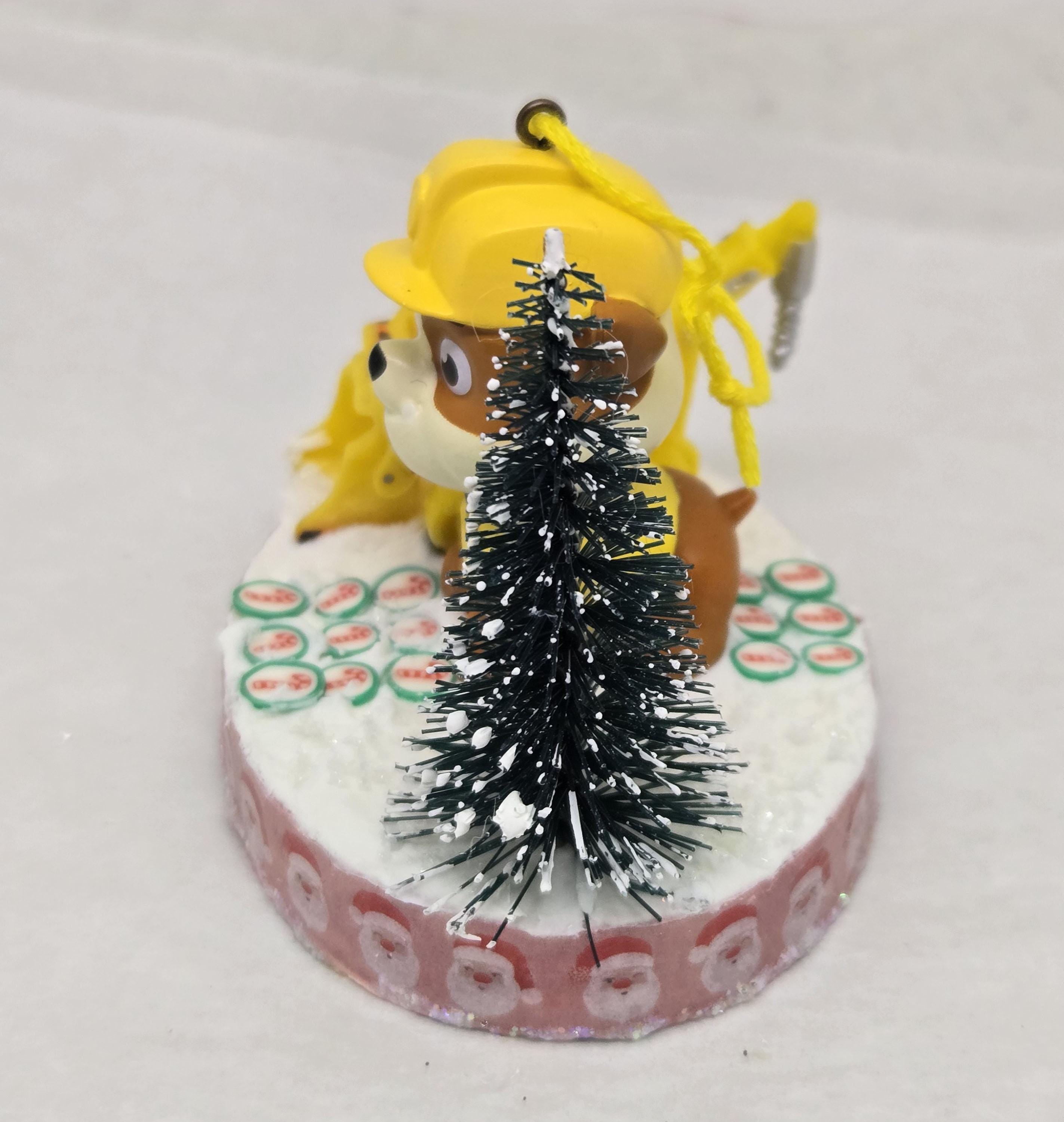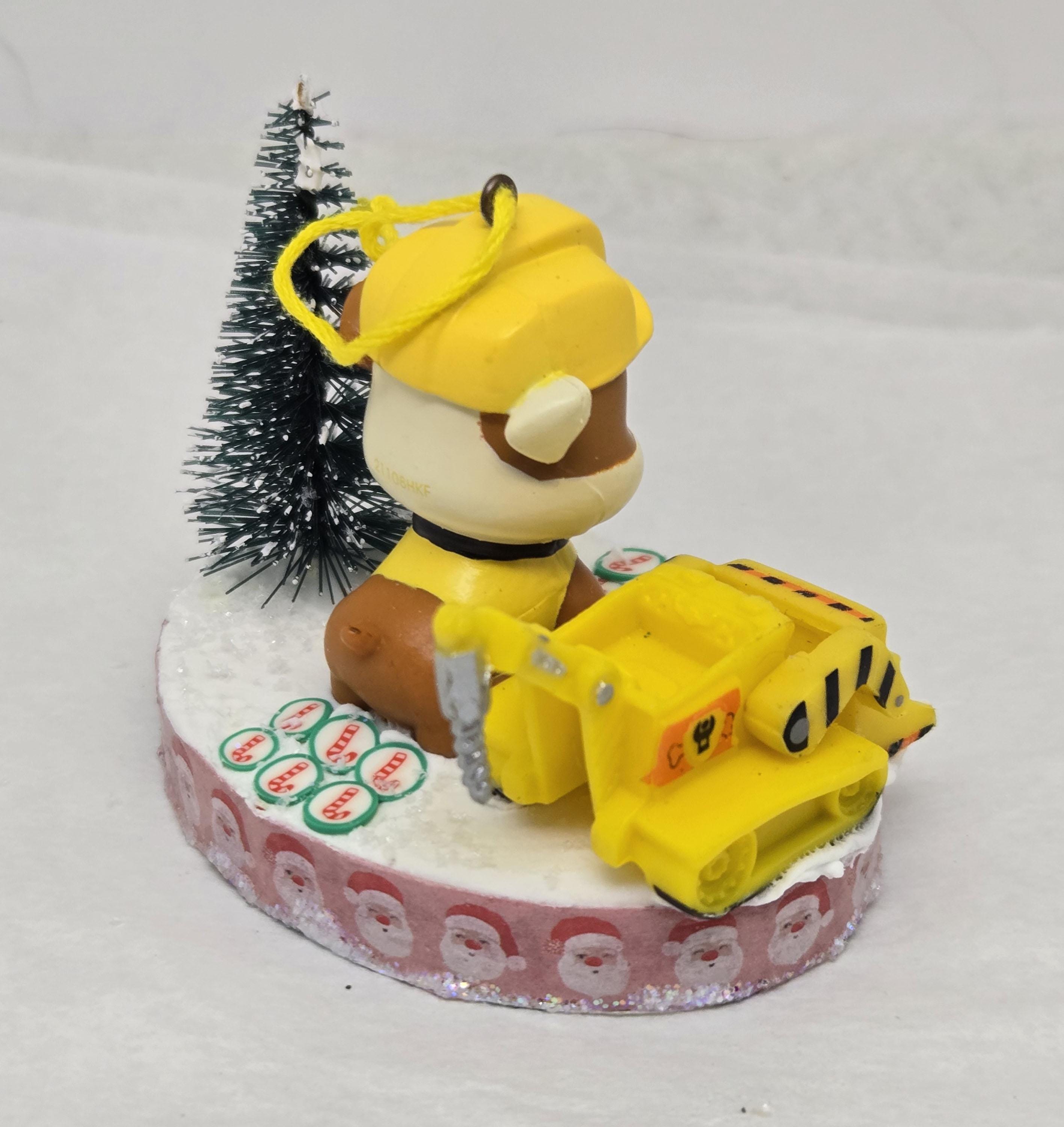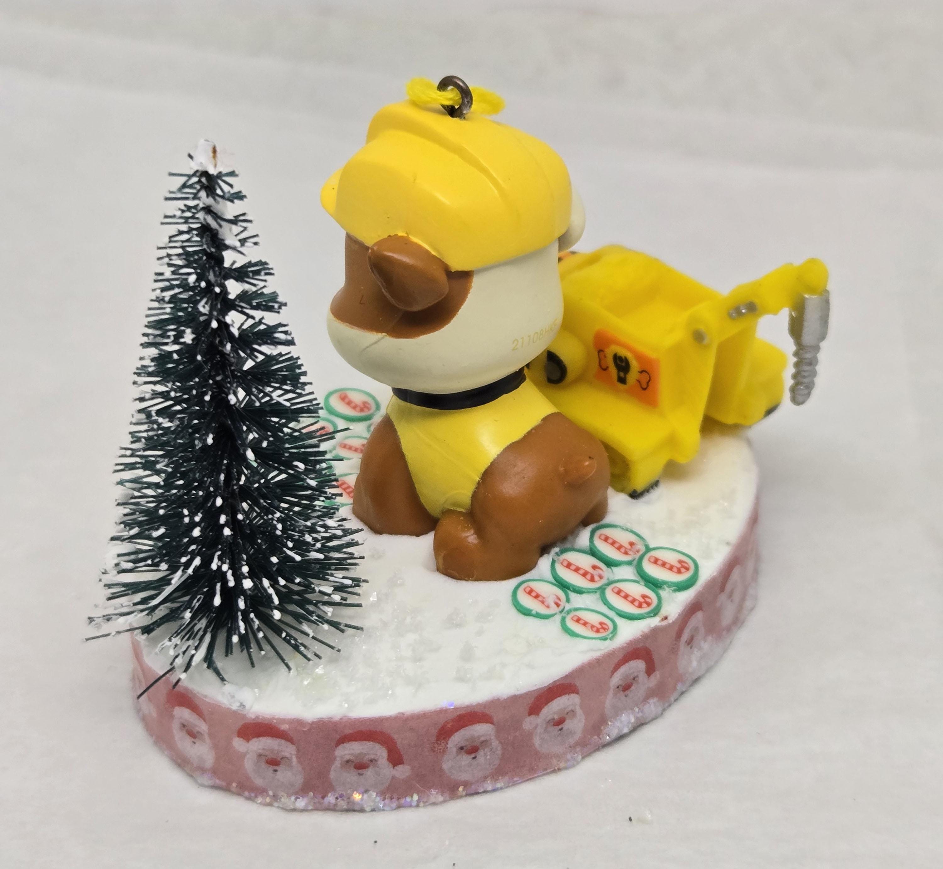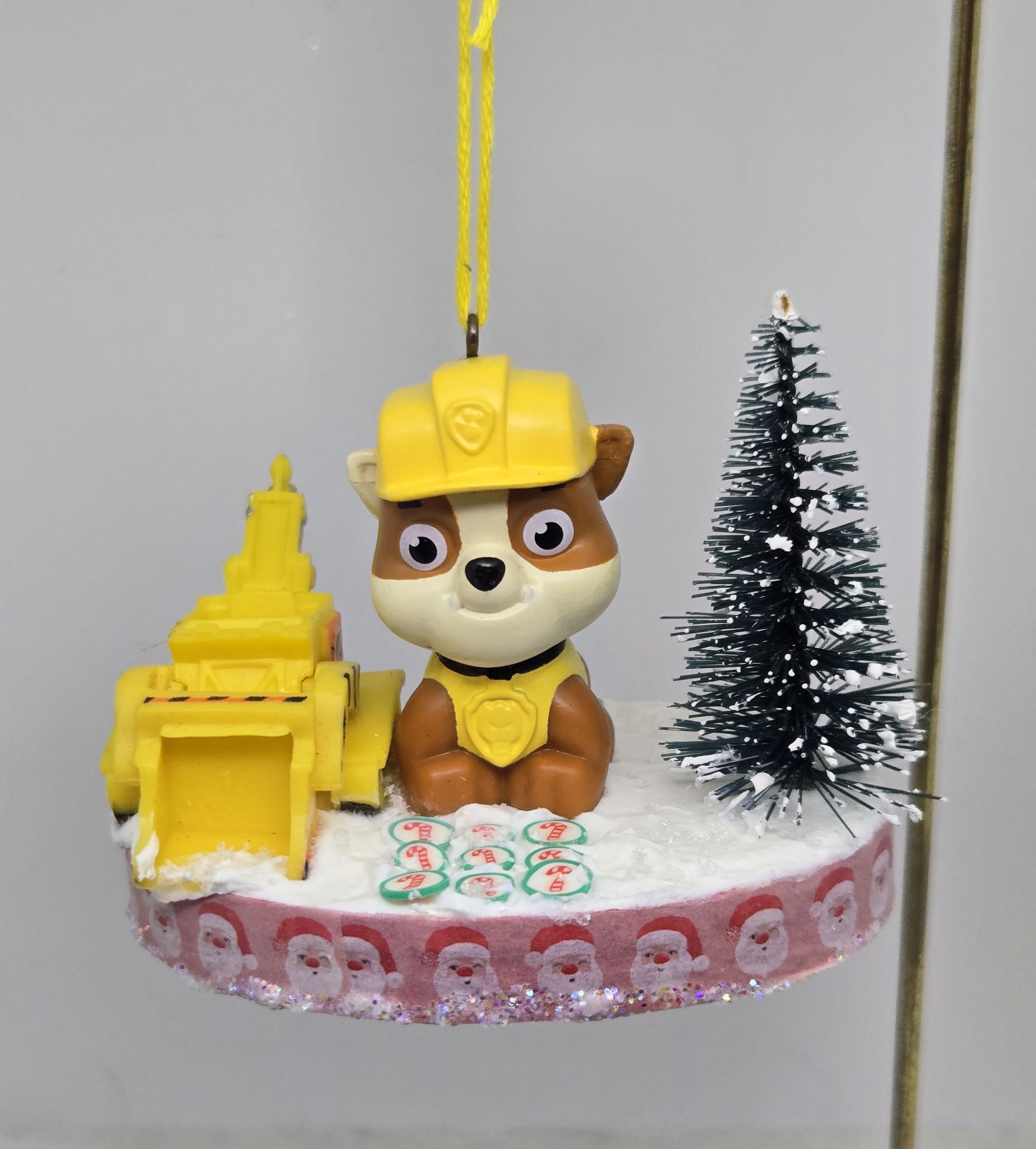 One of a kind, handcrafted Rubble Paw Patrol Christmas Ornament. Rubble used his heavy equipment to clear the candy cane road he's standing on in preparation for the Christmas Parade. Rubble and the front loader are toy figurines. The "road" is paved with clay candy cane discs. The base of this ornament is wood. I covered the bottom with scrapbook paper sealed with decoupage. The sides were painted then covered with washi tape. I also put glitter glue around the bottom edge. The top was painted then covered with artificial snow.