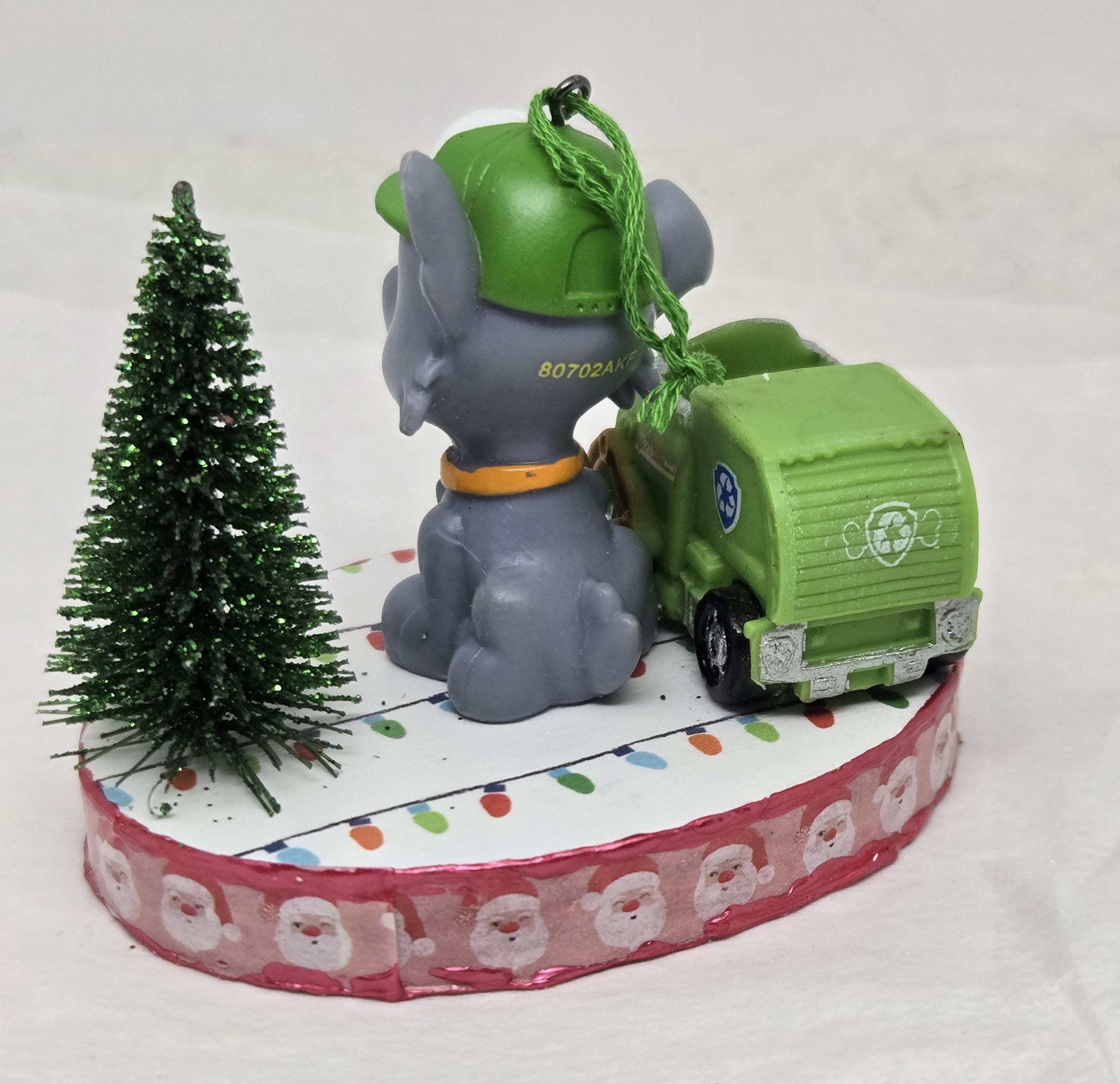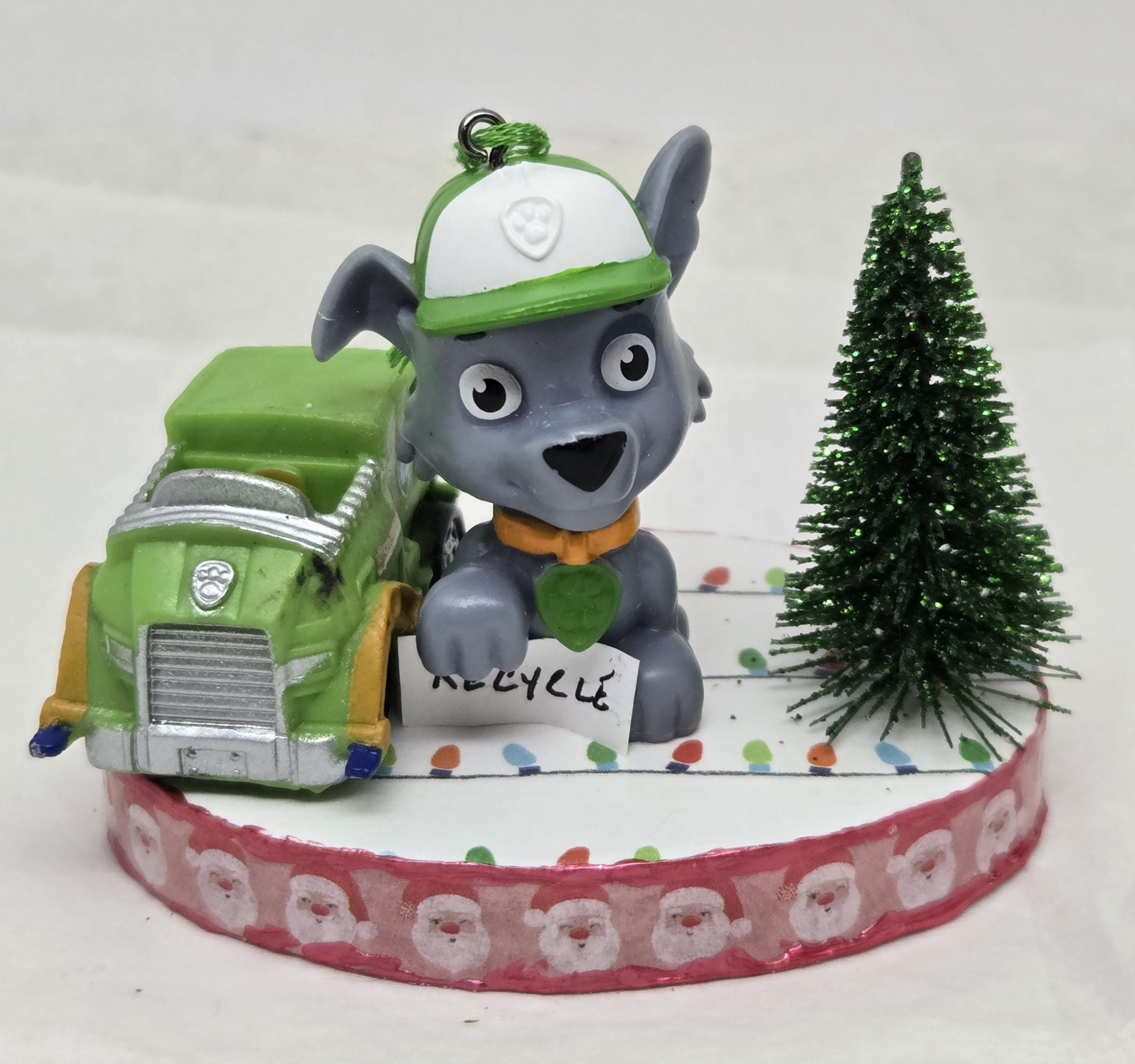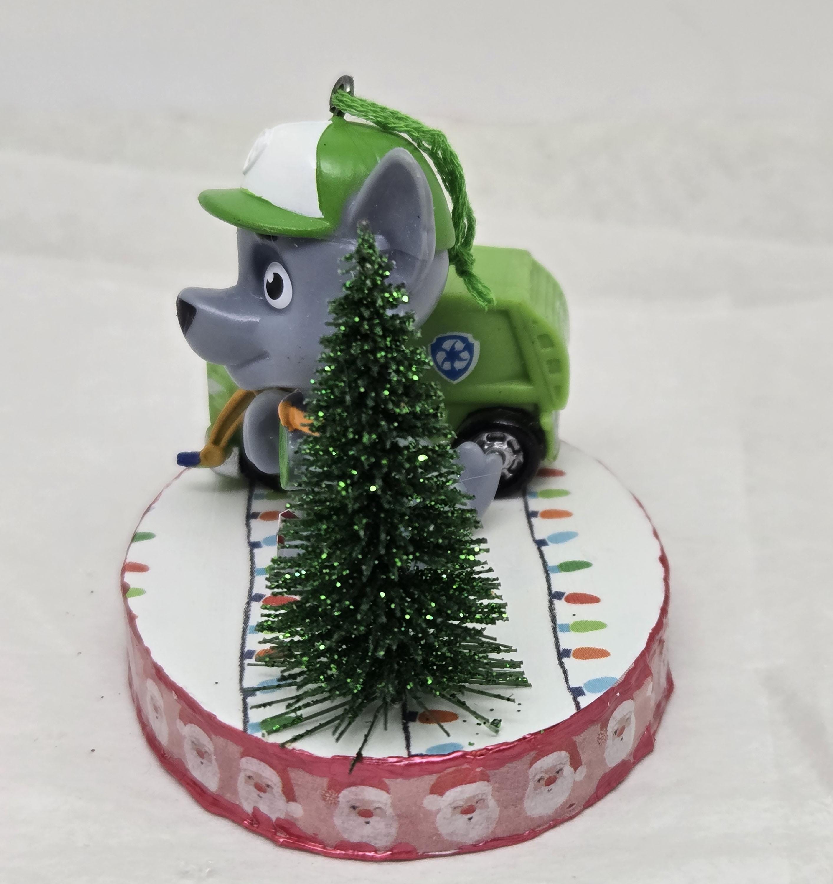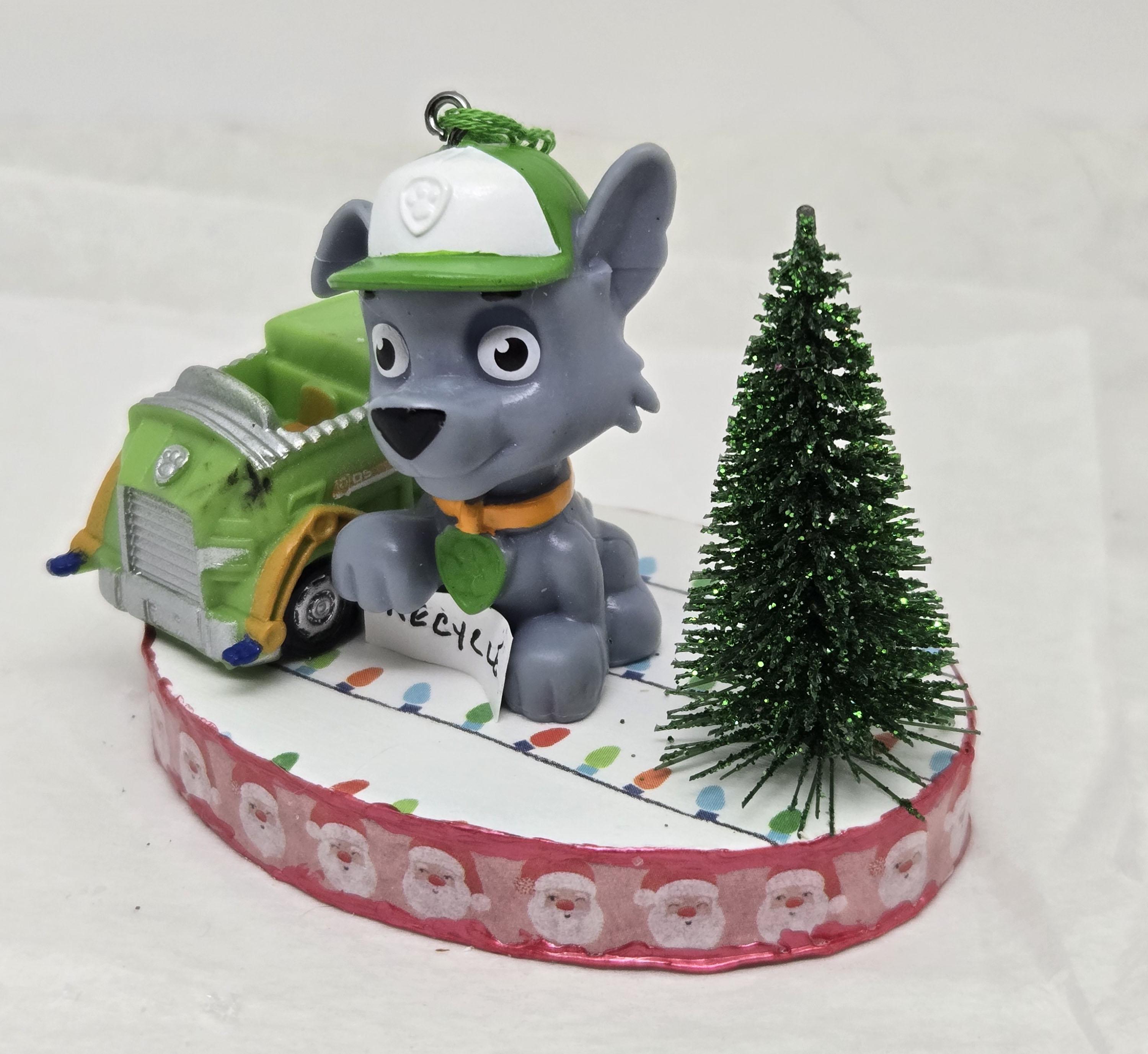 One of a kind, handcrafted Rocky Paw Patrol Christmas Ornament. Rocky got a new recycling truck for Christmas and is taking a moment to remind us all to recycle. Rocky and his recycling truck are toy figurines. The base of this ornament is wood. I covered the top and bottom with scrapbook paper. The sides were painted then covered with washi tape. I finished the edges using Liquid Pearl acrylic paint. Finally, I sealed everything with decoupage.
