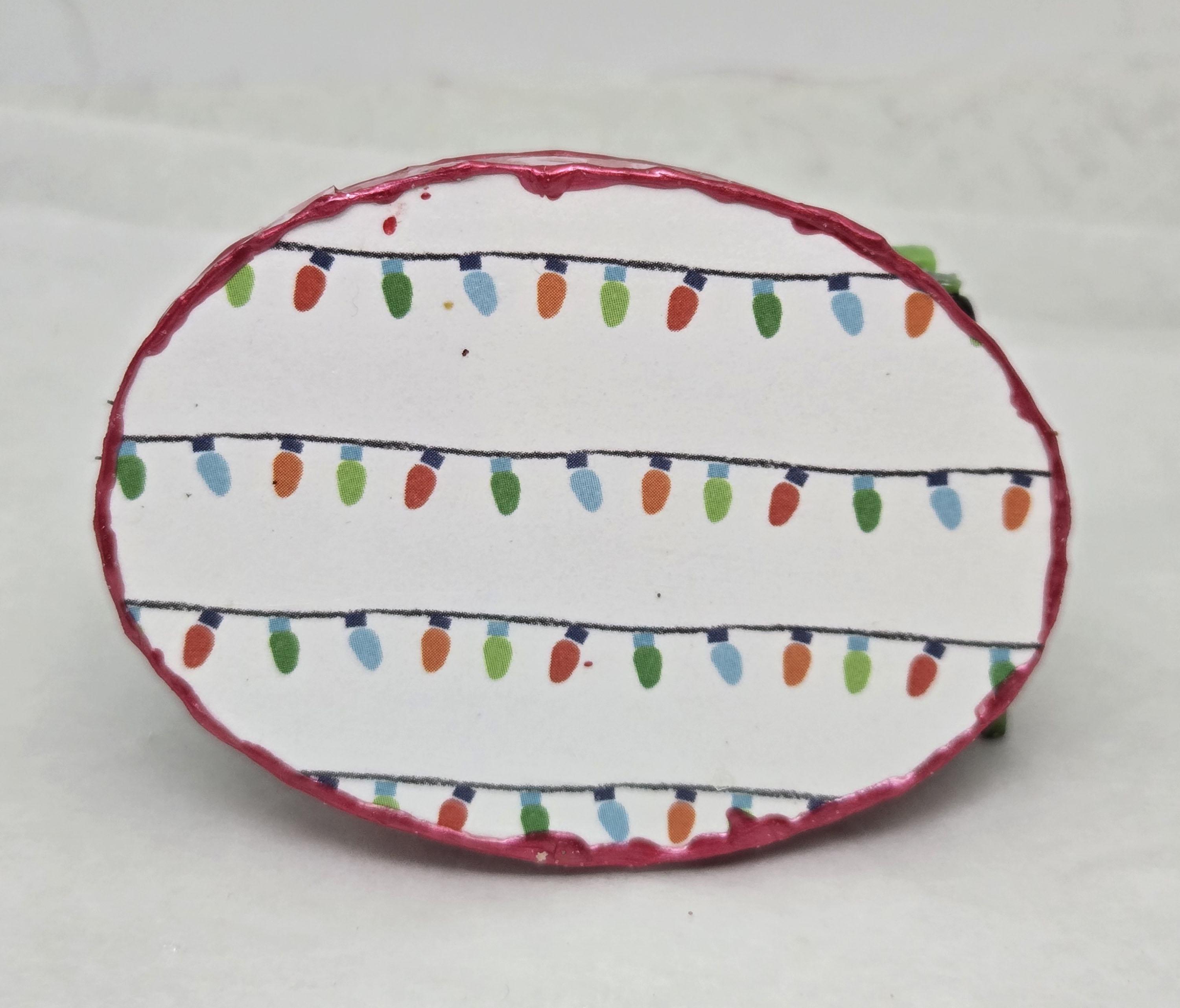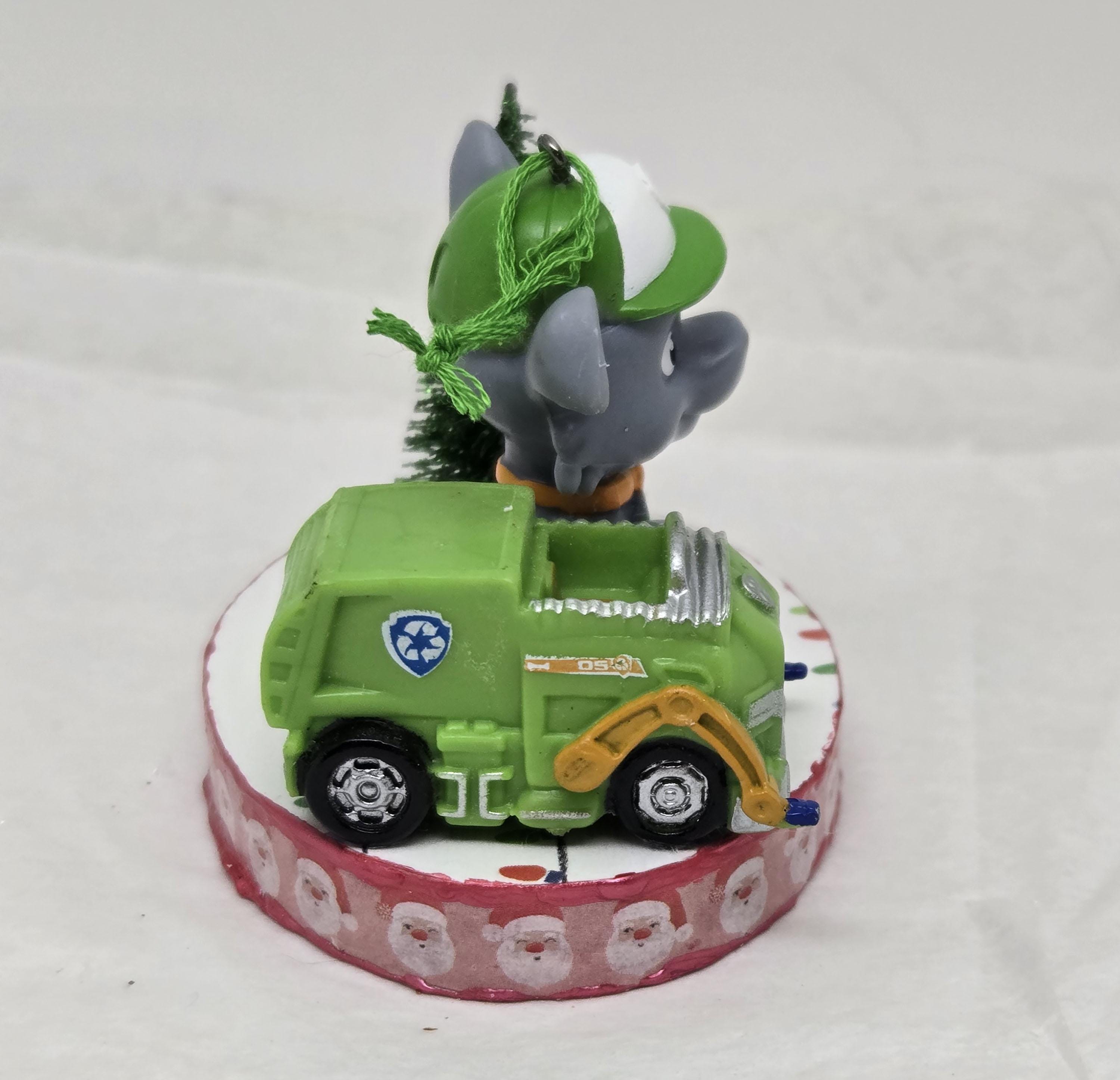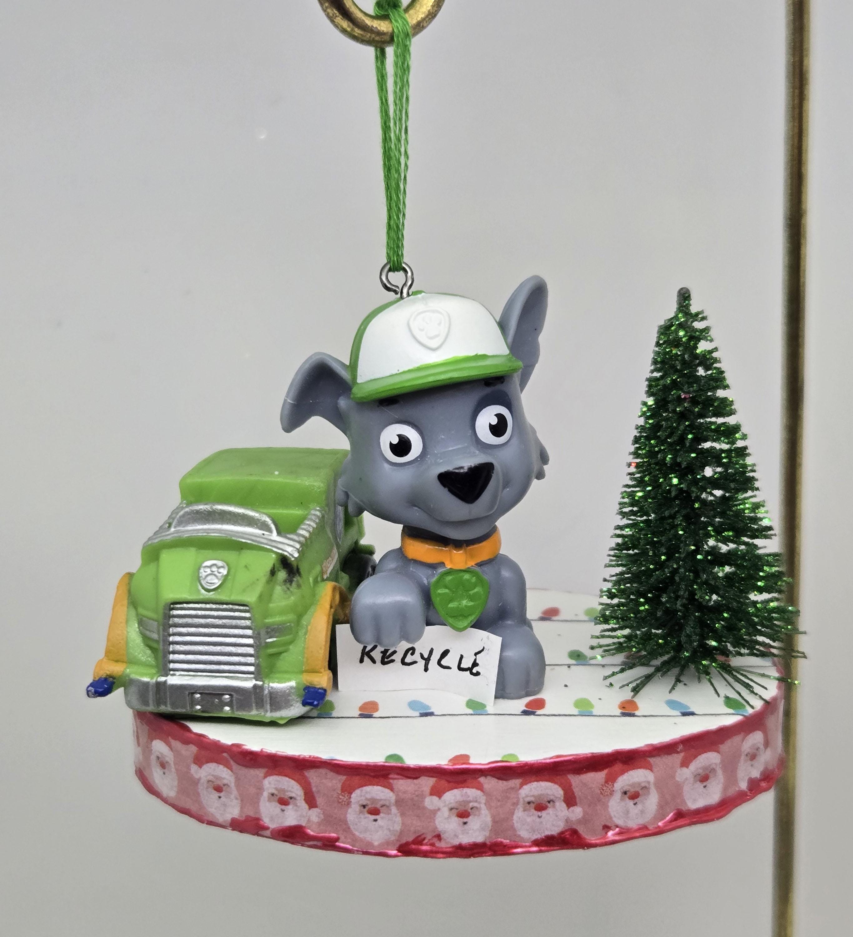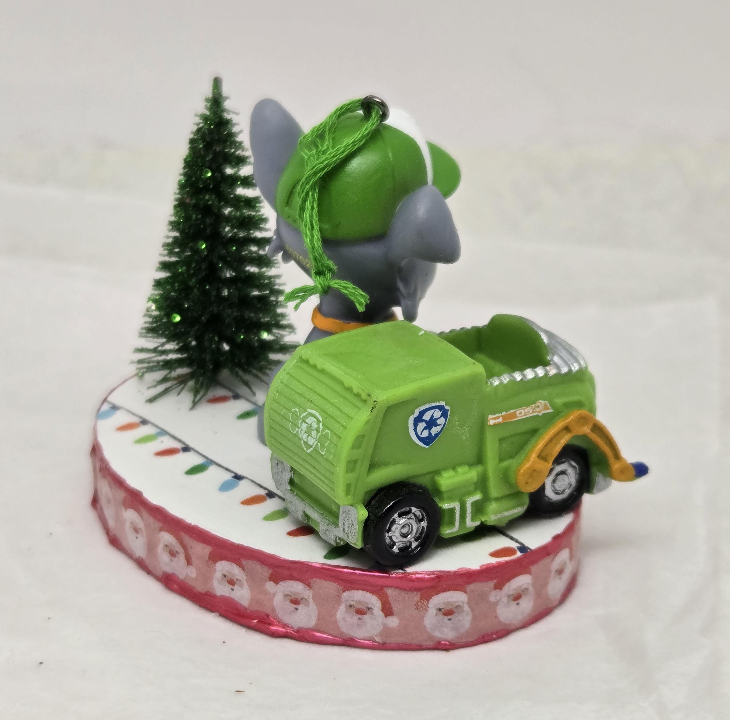 One of a kind, handcrafted Rocky Paw Patrol Christmas Ornament. Rocky got a new recycling truck for Christmas and is taking a moment to remind us all to recycle. Rocky and his recycling truck are toy figurines. The base of this ornament is wood. I covered the top and bottom with scrapbook paper. The sides were painted then covered with washi tape. I finished the edges using Liquid Pearl acrylic paint. Finally, I sealed everything with decoupage.