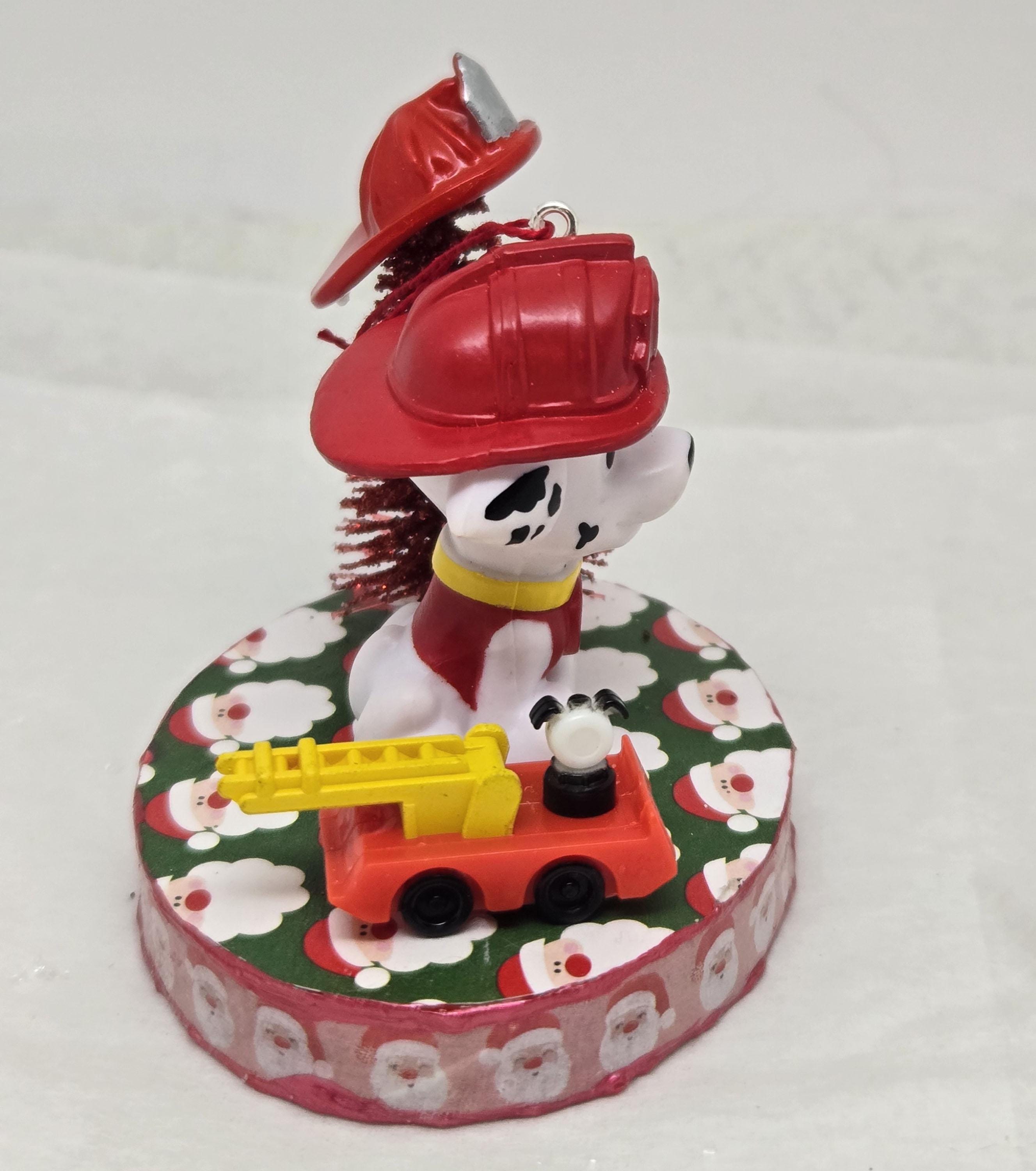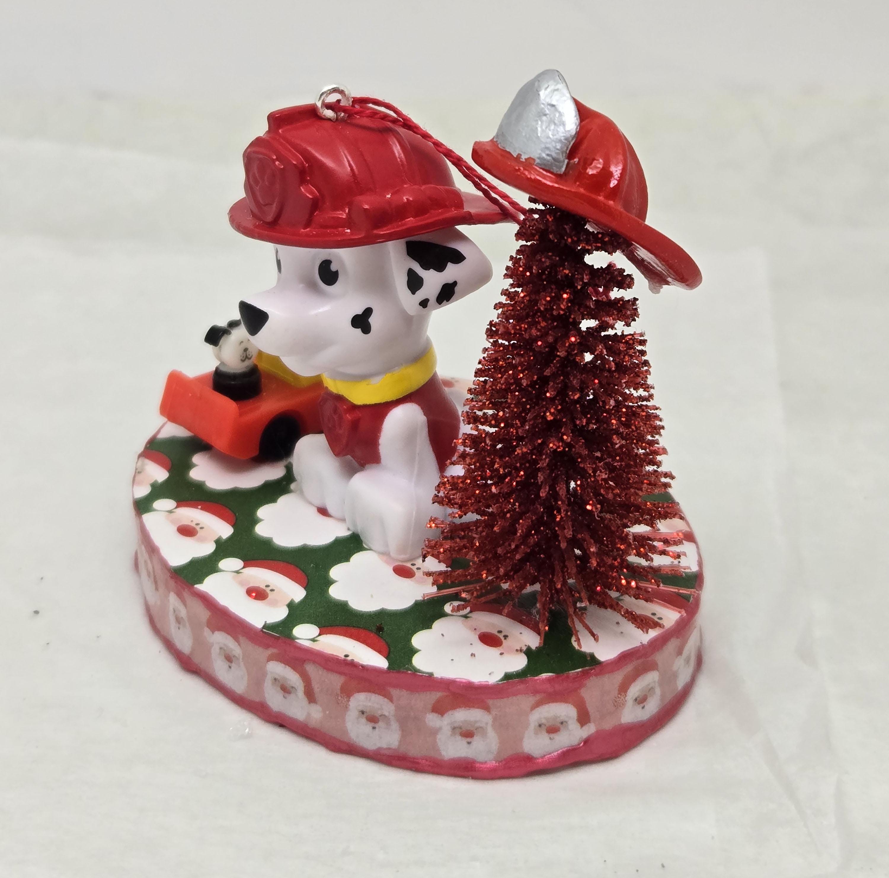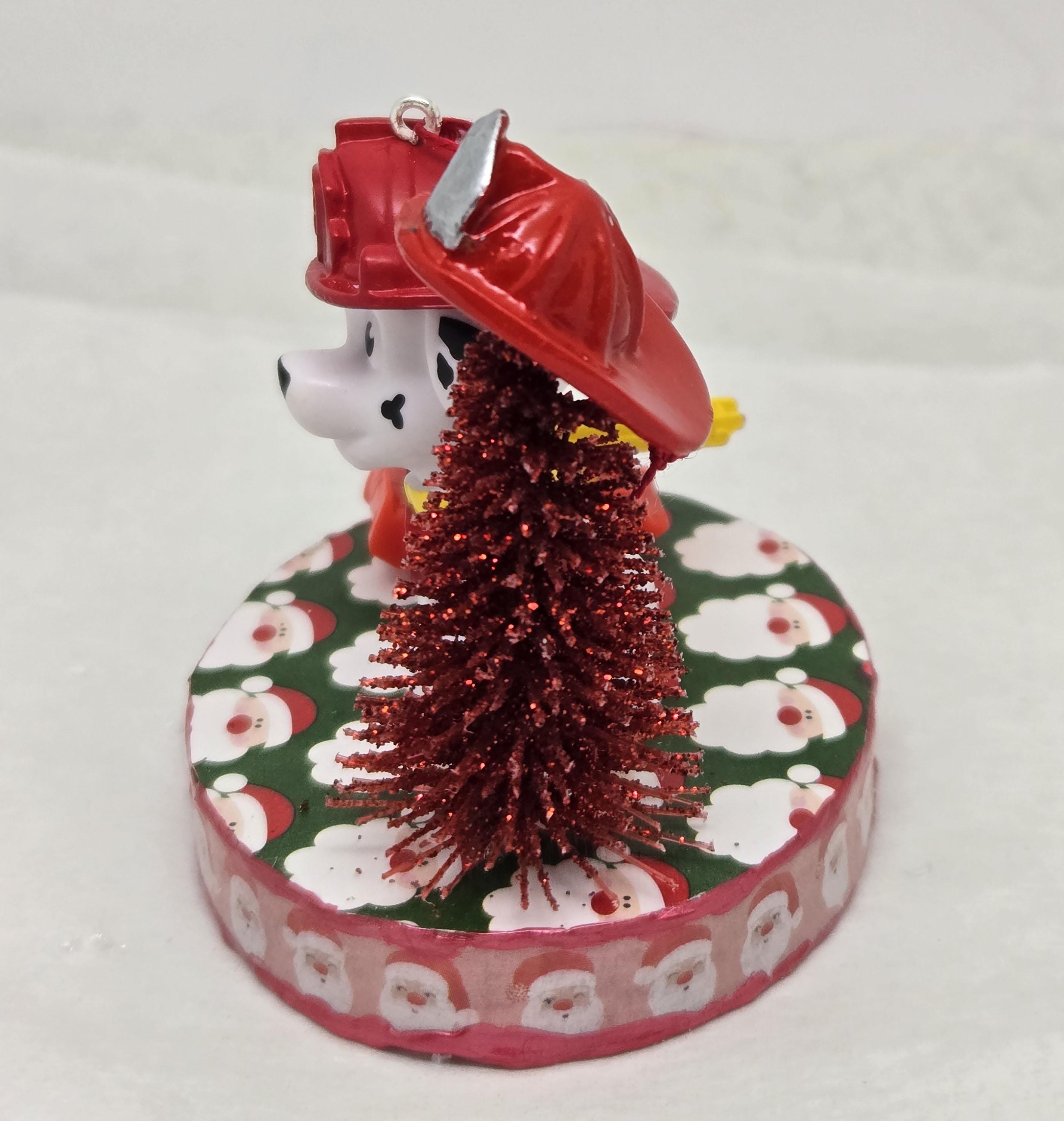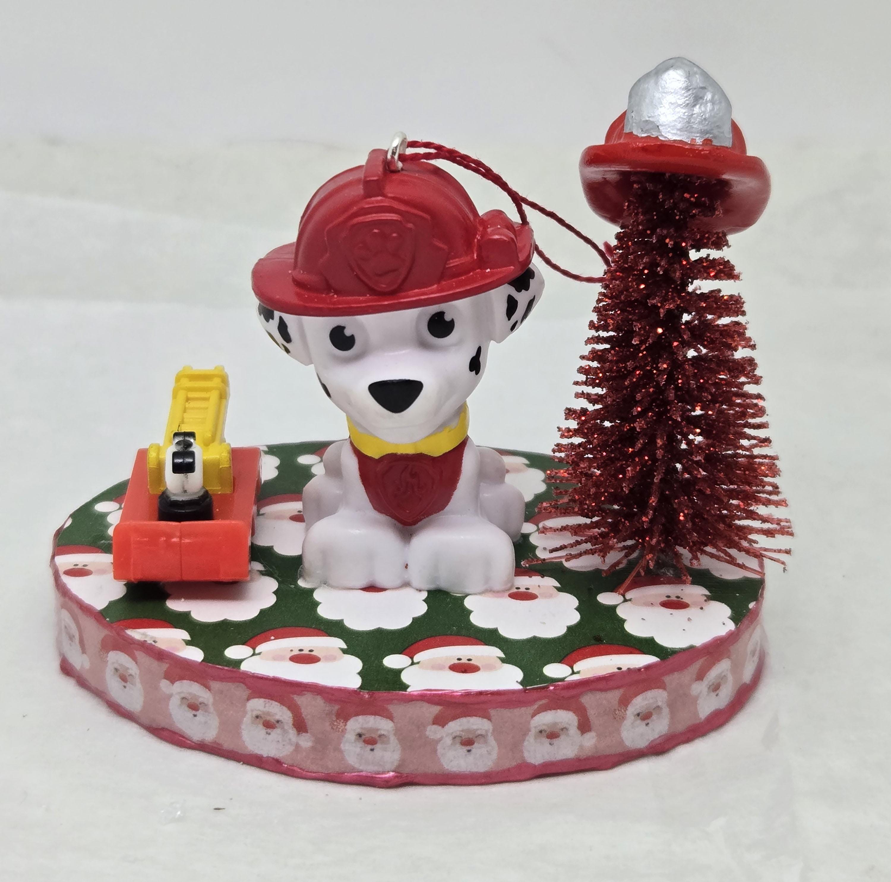 One of a kind, handcrafted Marshall Paw Patrol Christmas Ornament. Marshall decorated his Christmas Tree with a dollhouse miniature fire fighter's helmet. He loves the toy ladder truck Santa gave him! Marshall is a toy figurine I repurposed for this ornament. The base is wood. I covered the top and bottom with scrapbook paper. The sides were painted then covered with washi tape. I trimmed the edges with Liquid Pearl acrylic paint then sealed everything with decoupage.