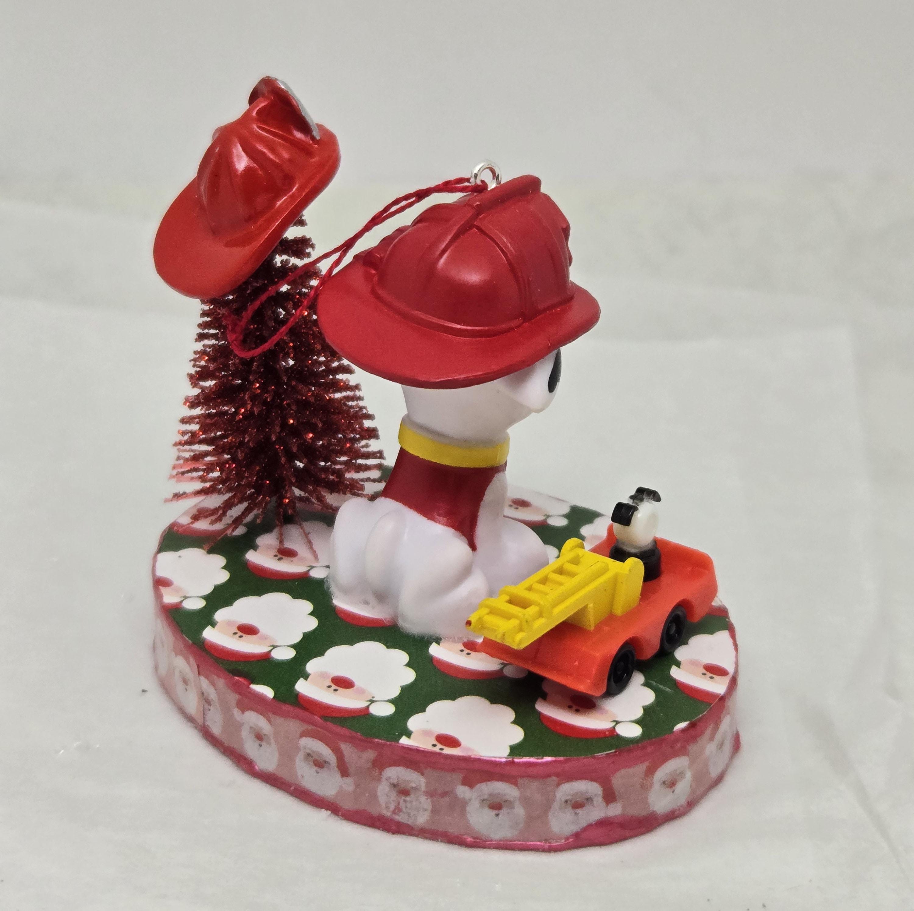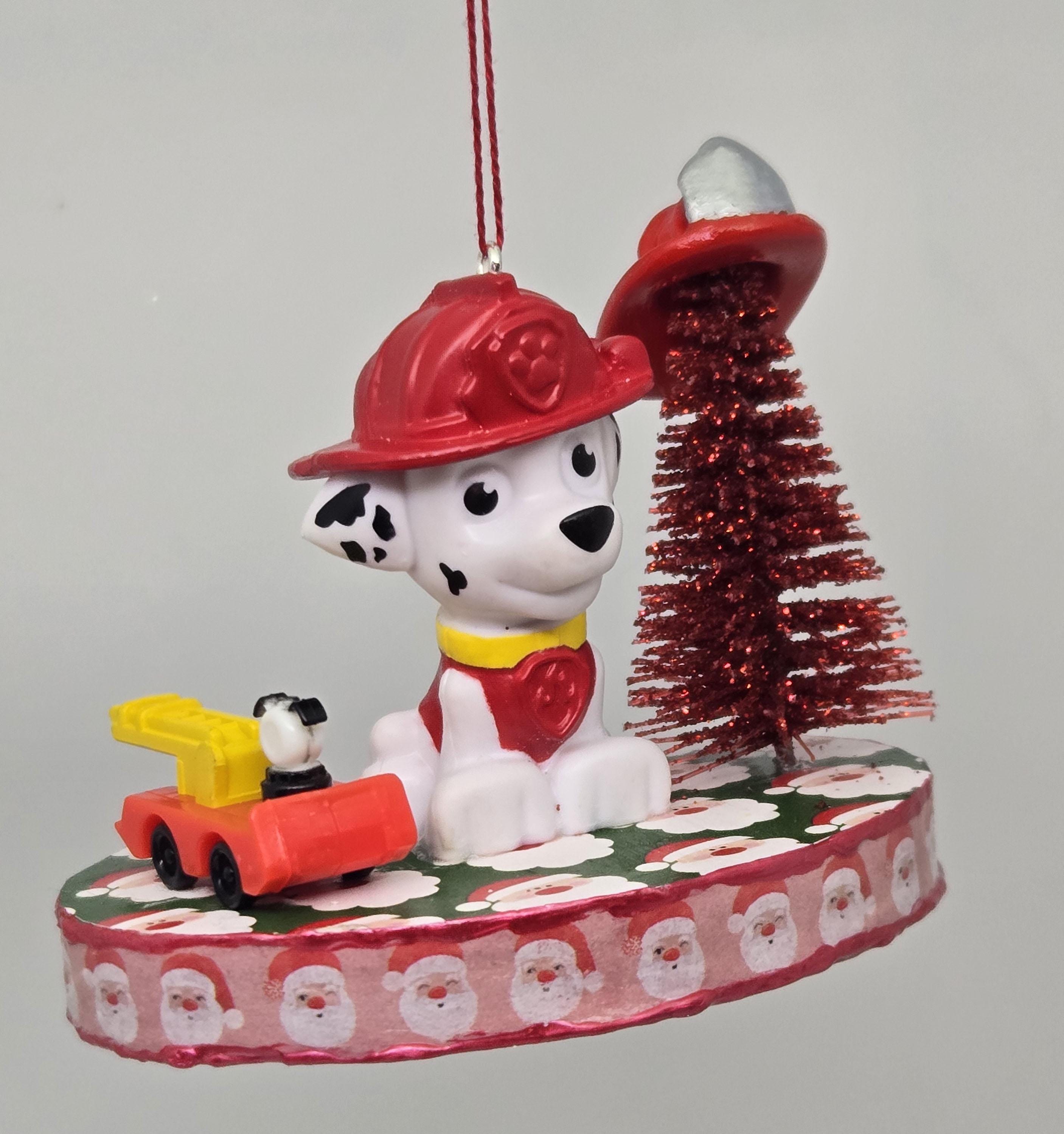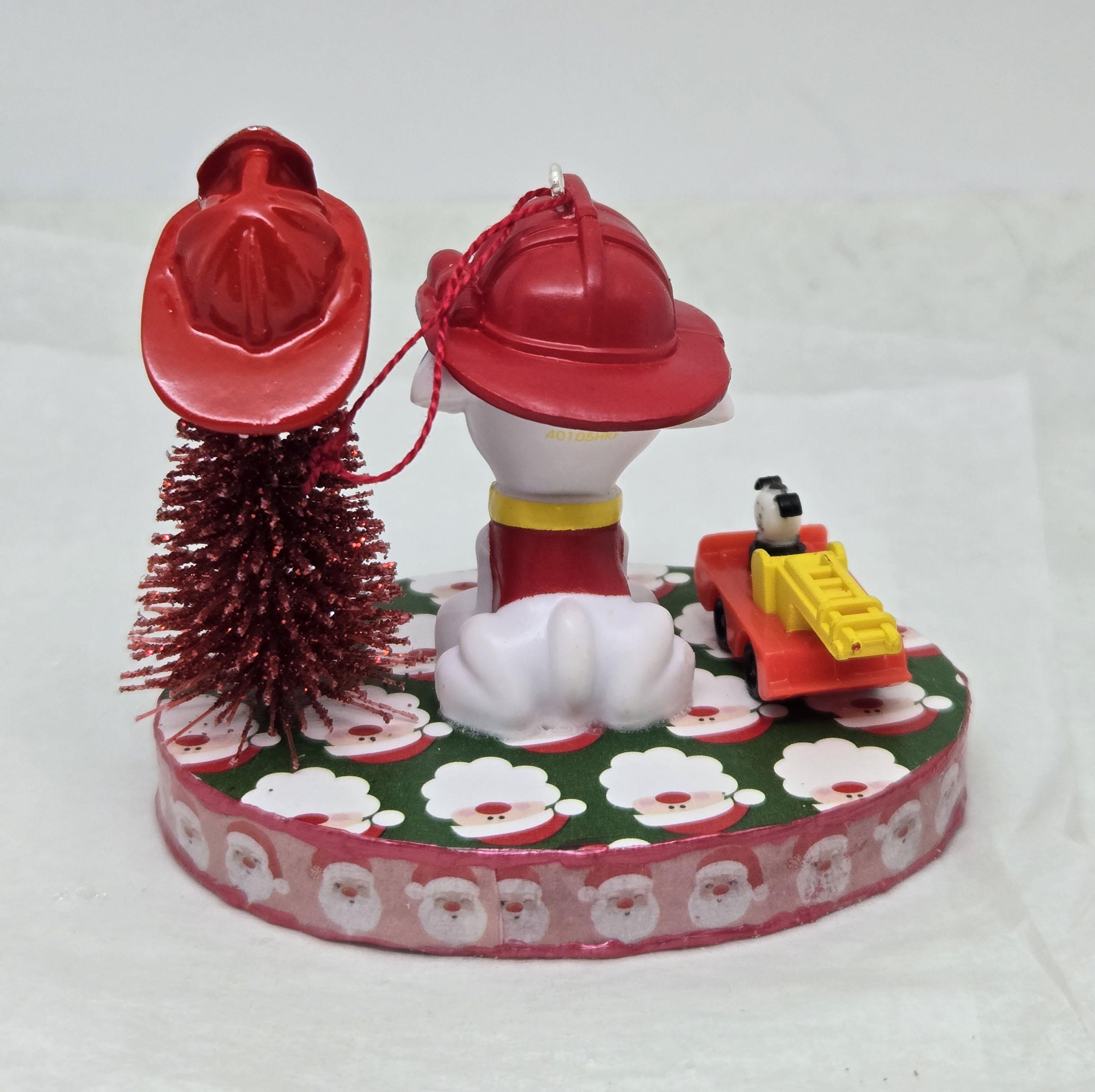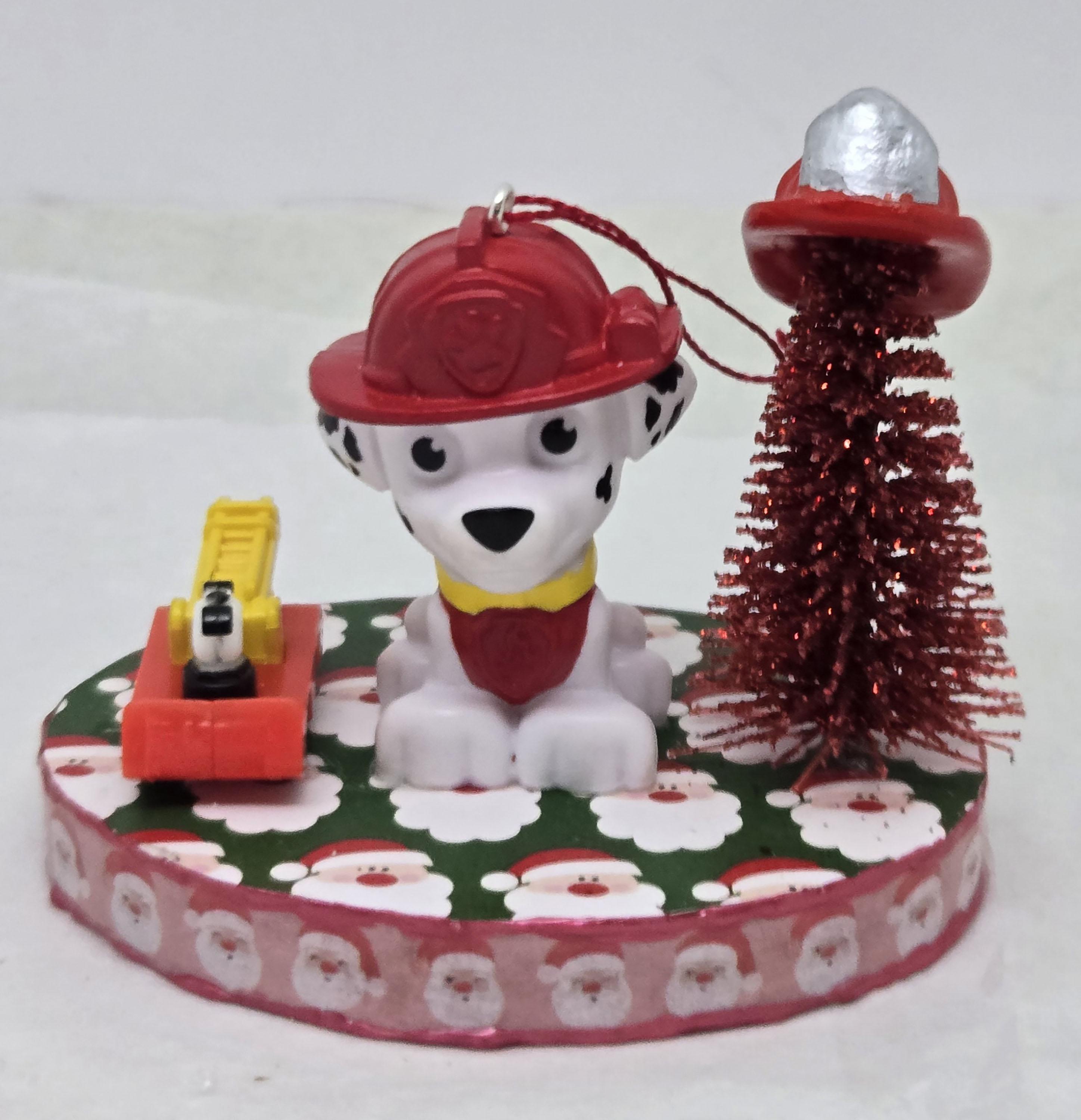 One of a kind, handcrafted Marshall Paw Patrol Christmas Ornament. Marshall decorated his Christmas Tree with a dollhouse miniature fire fighter's helmet. He loves the toy ladder truck Santa gave him! Marshall is a toy figurine I repurposed for this ornament. The base is wood. I covered the top and bottom with scrapbook paper. The sides were painted then covered with washi tape. I trimmed the edges with Liquid Pearl acrylic paint then sealed everything with decoupage.