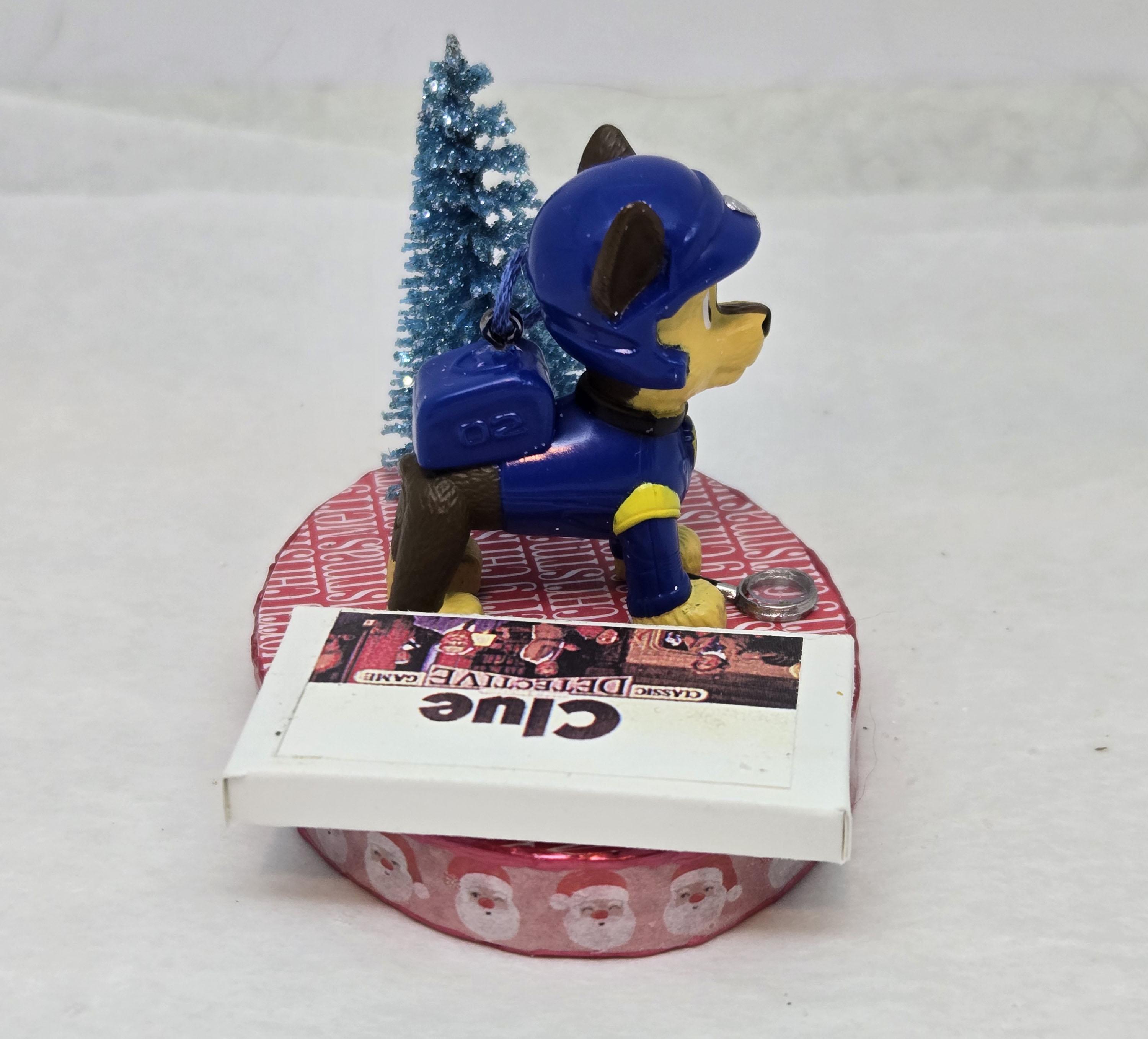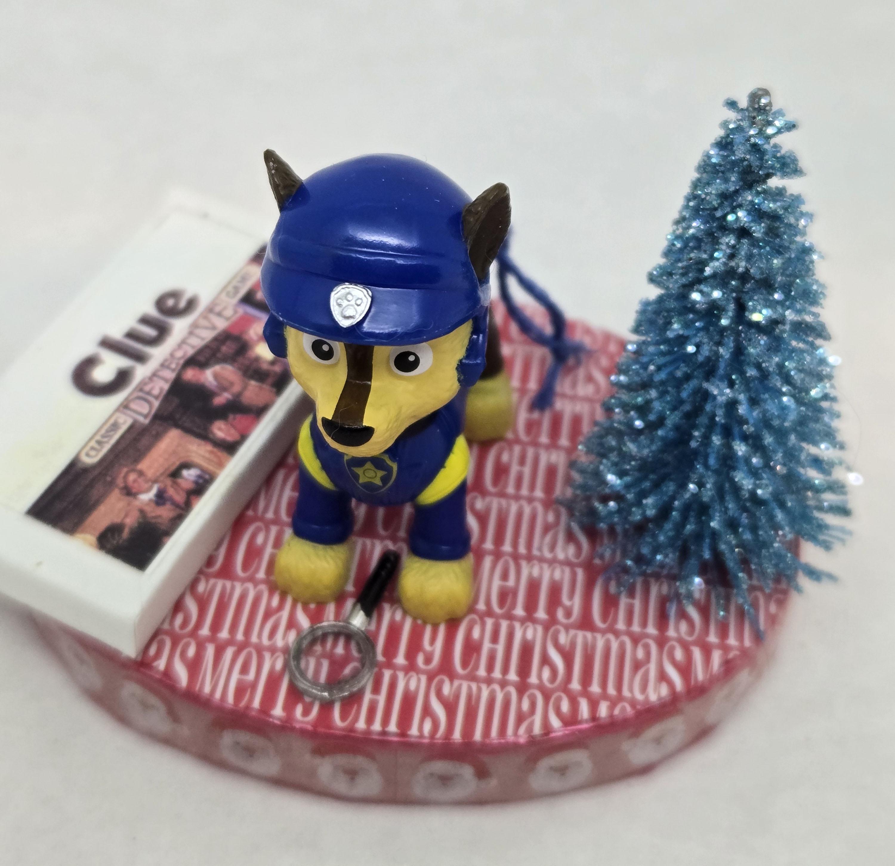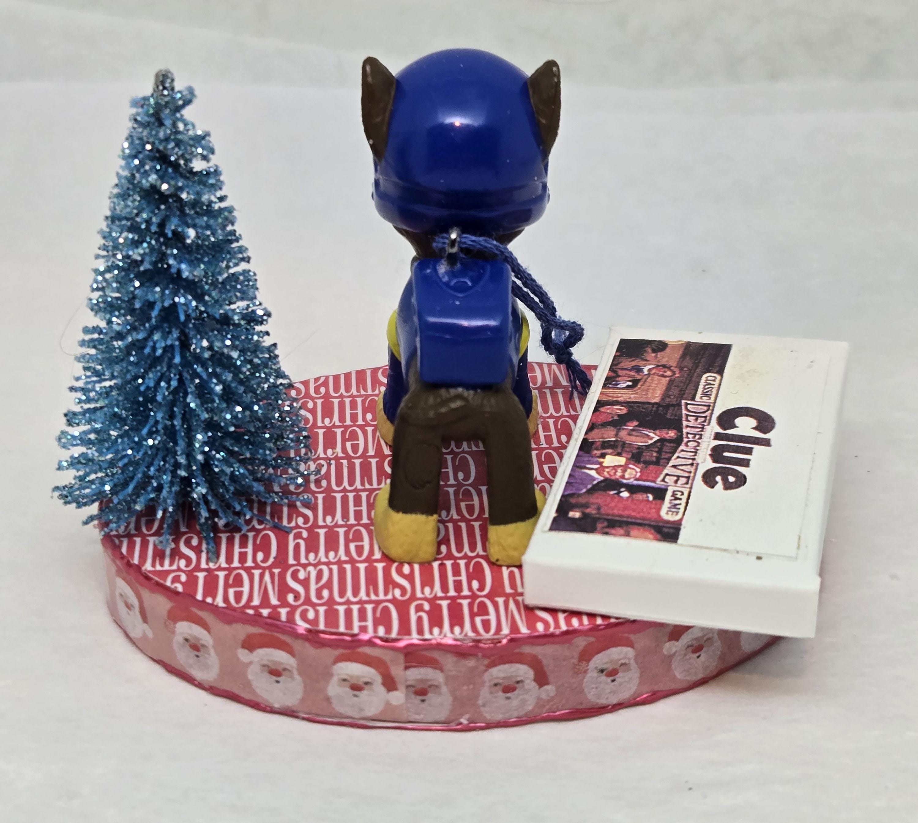 One of a kind, handcrafted Chase Paw Patrol Christmas Ornament titled: Chase Searches For a Clue. Chase is a toy figurine. The Clue Game and magnifying glass are dollhouse miniature accessories. The base of this ornament is wood. I covered the top and bottom with scrapbook paper. The sides were painted then covered with washi tape. I finished the edges off using Liquid Pearls acrylic paint. Lastly, I sealed the entire base with decoupage.