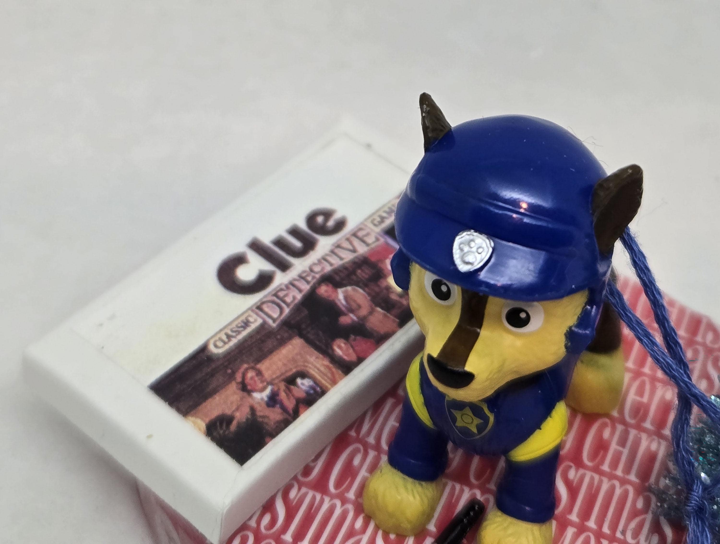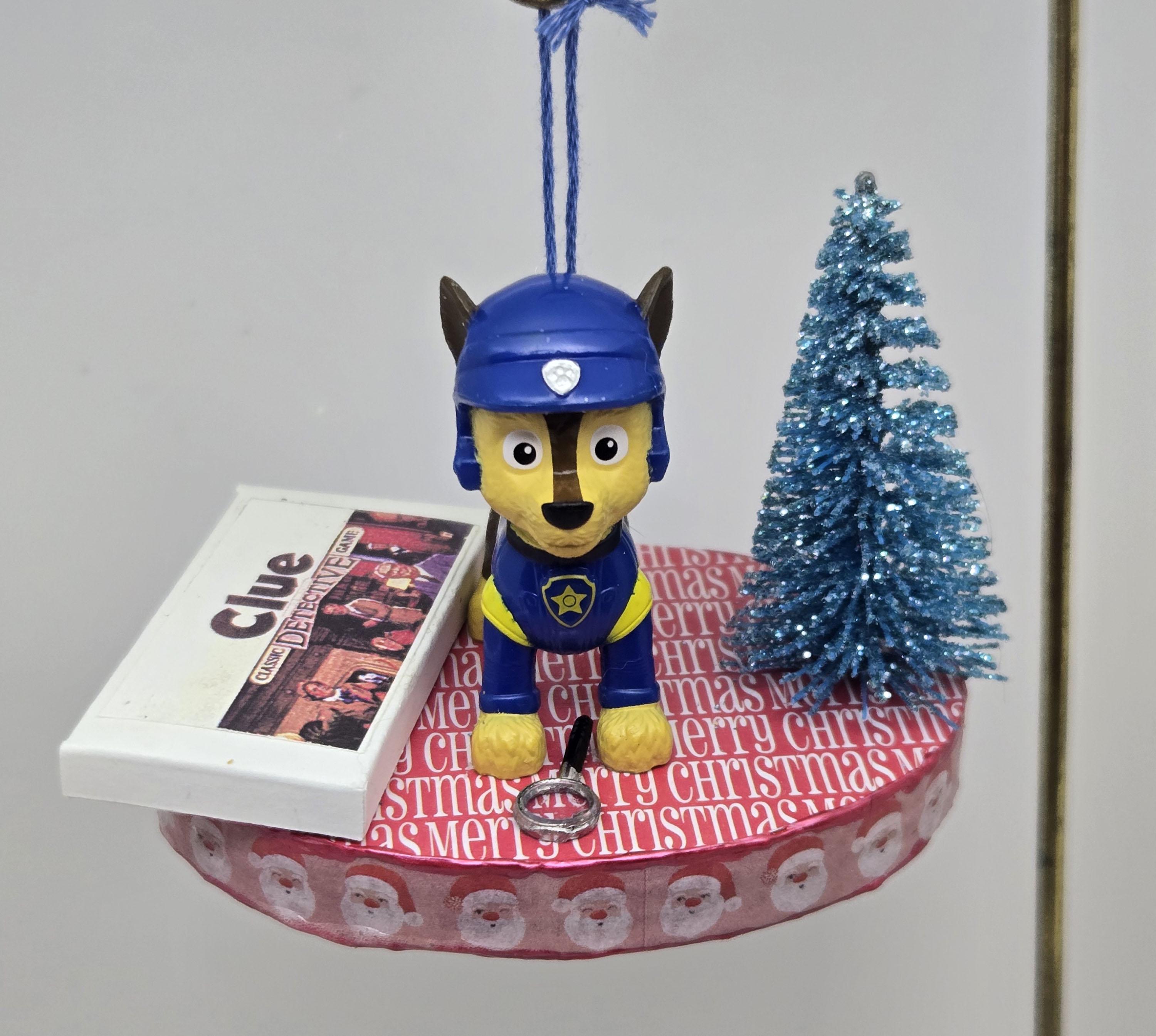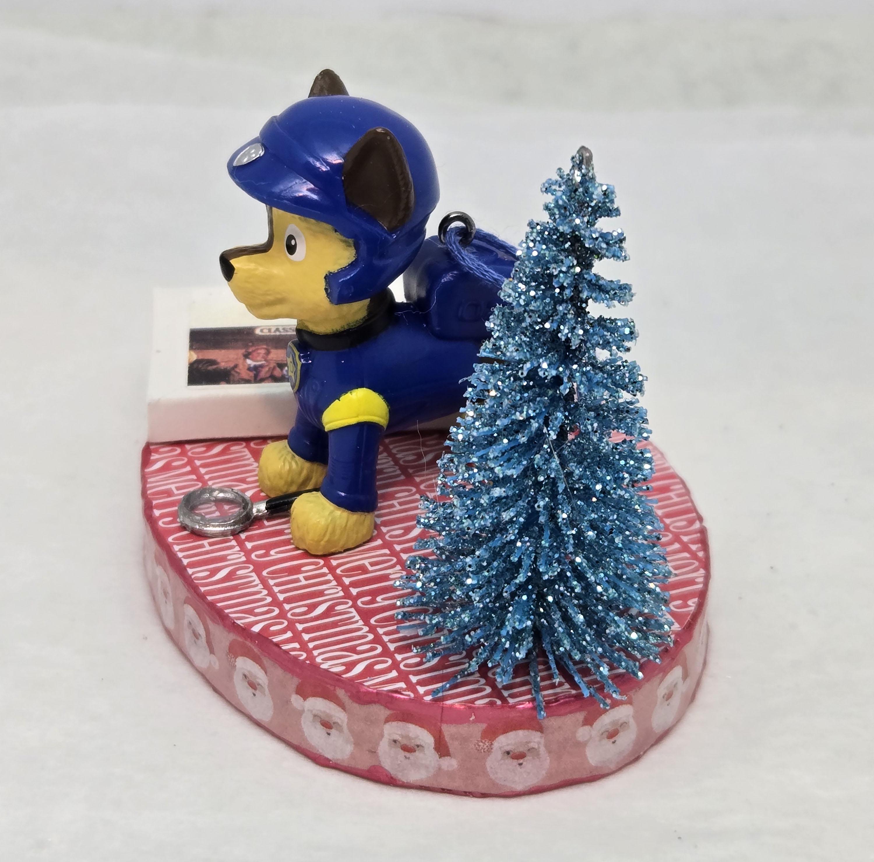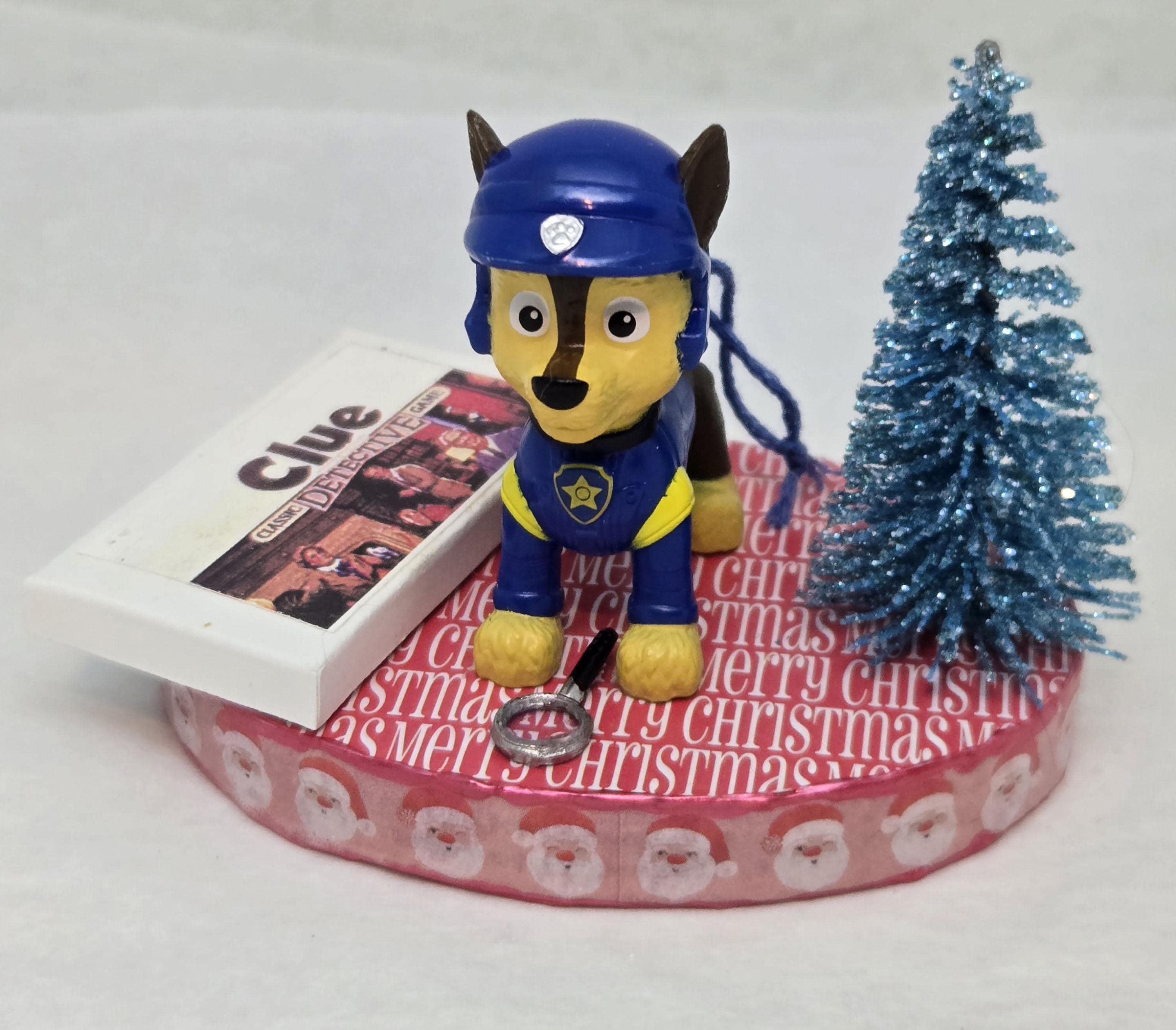 One of a kind, handcrafted Chase Paw Patrol Christmas Ornament titled: Chase Searches For a Clue. Chase is a toy figurine. The Clue Game and magnifying glass are dollhouse miniature accessories. The base of this ornament is wood. I covered the top and bottom with scrapbook paper. The sides were painted then covered with washi tape. I finished the edges off using Liquid Pearls acrylic paint. Lastly, I sealed the entire base with decoupage.