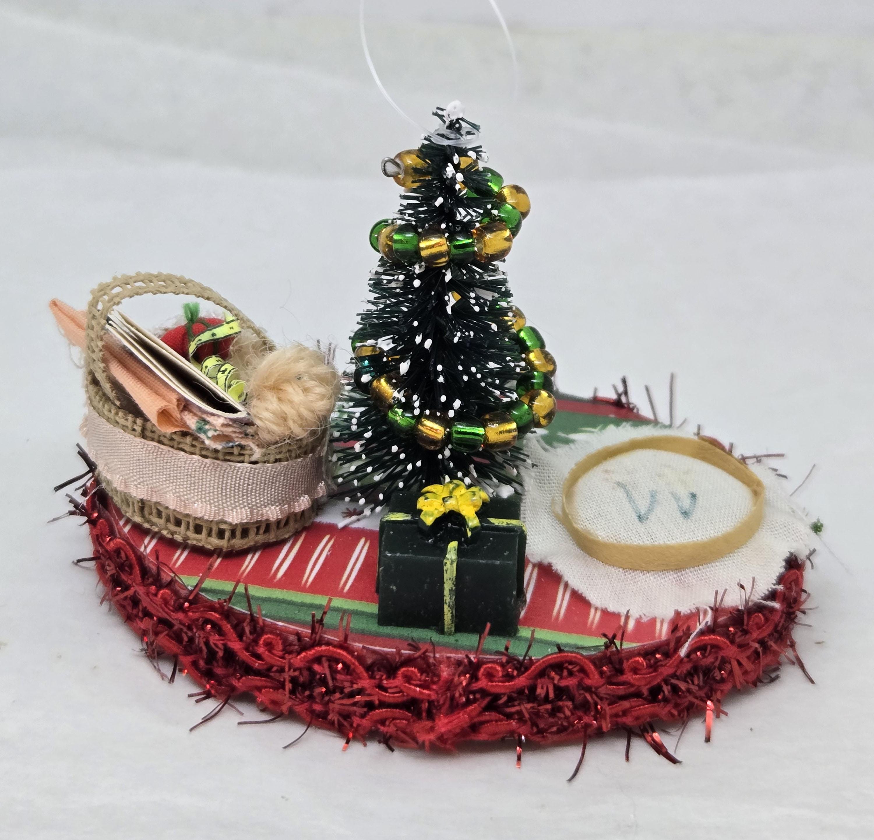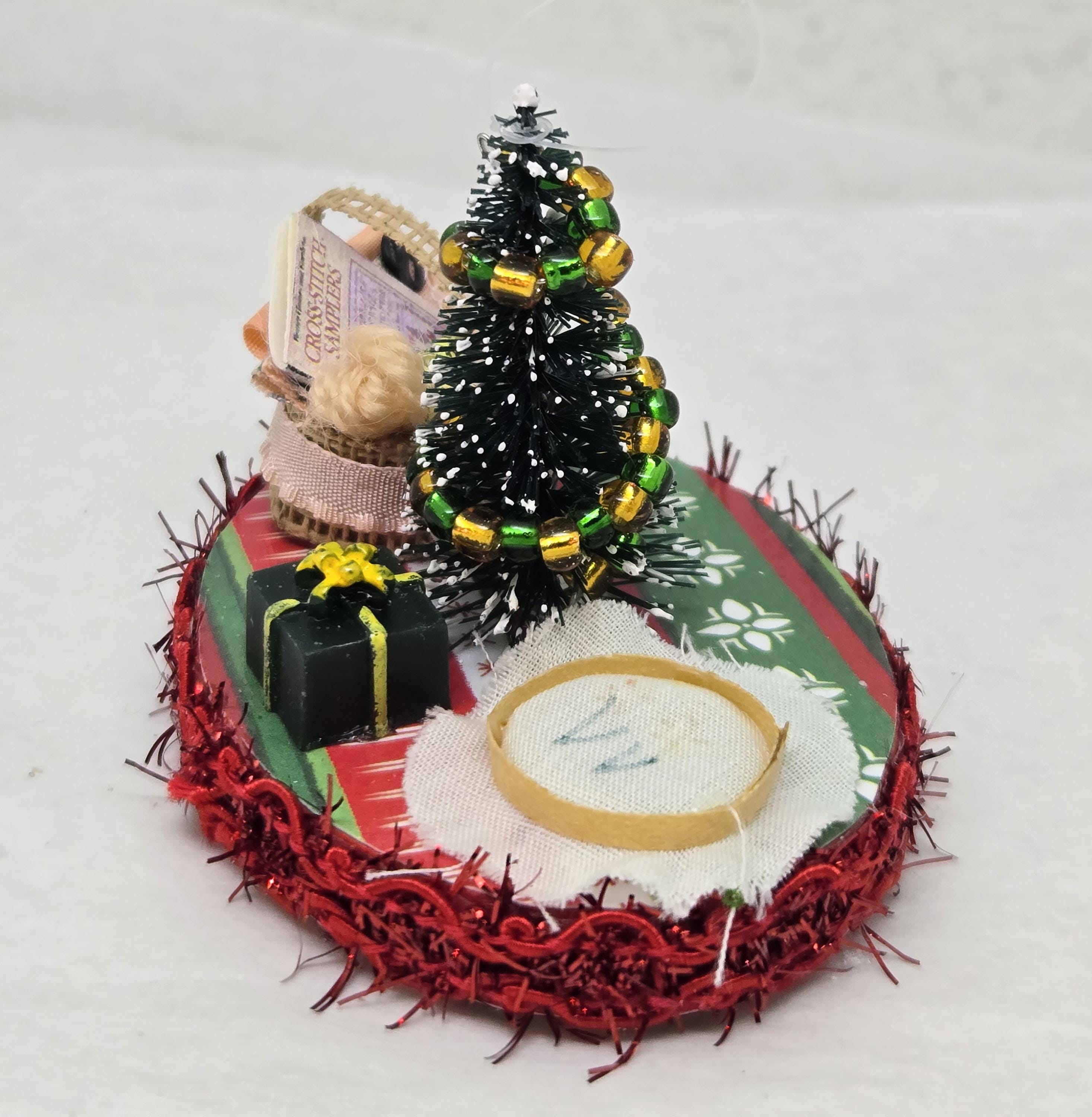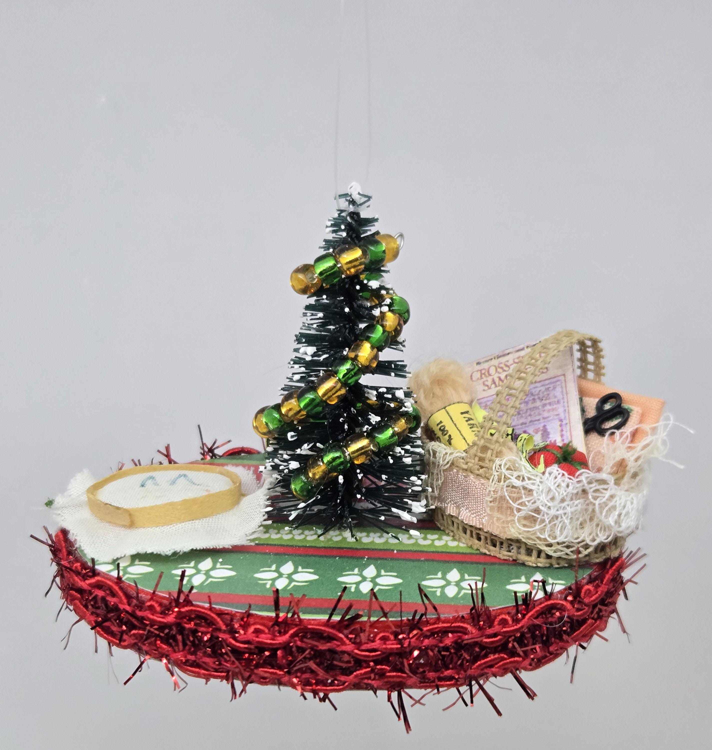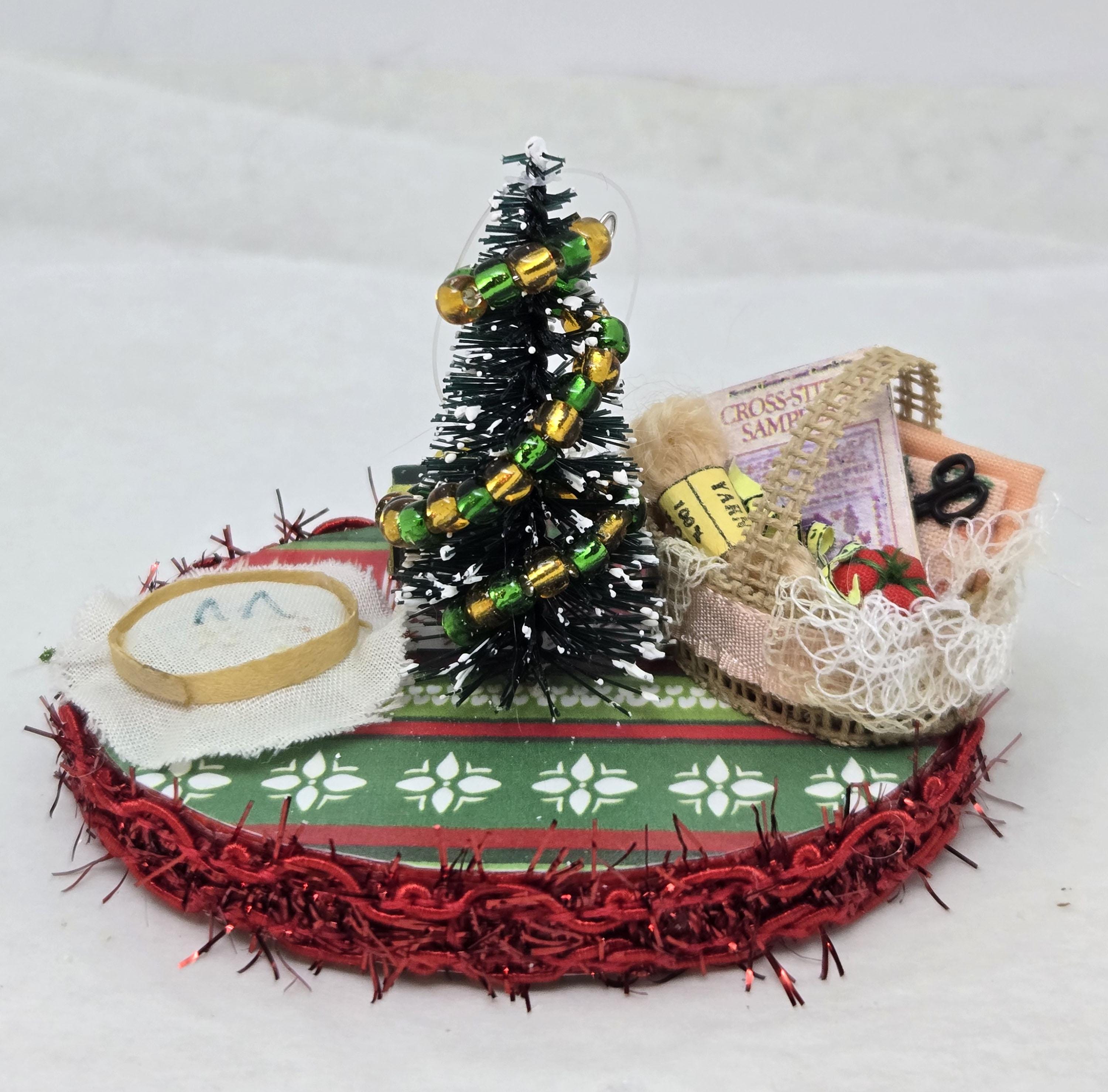 One of a kind, handcrafted Cross-Stitch Themed Christmas Ornament titled: What to Give a Cross-Stitch enthusiast for Christmas. Under the miniature tree that is decorated with beads I strung on wire you'll find an embroidery hoop holding fabric with a floral pattern awaiting cross-stitching. There is also a basket filled with cross-stitch samplers, yarn, fabric, pin cushion, scissors and a tape measure. The base of the ornament is wood. I covered this with scrapbook paper sealed with decoupage. The sides were painted then I added decorative trim.