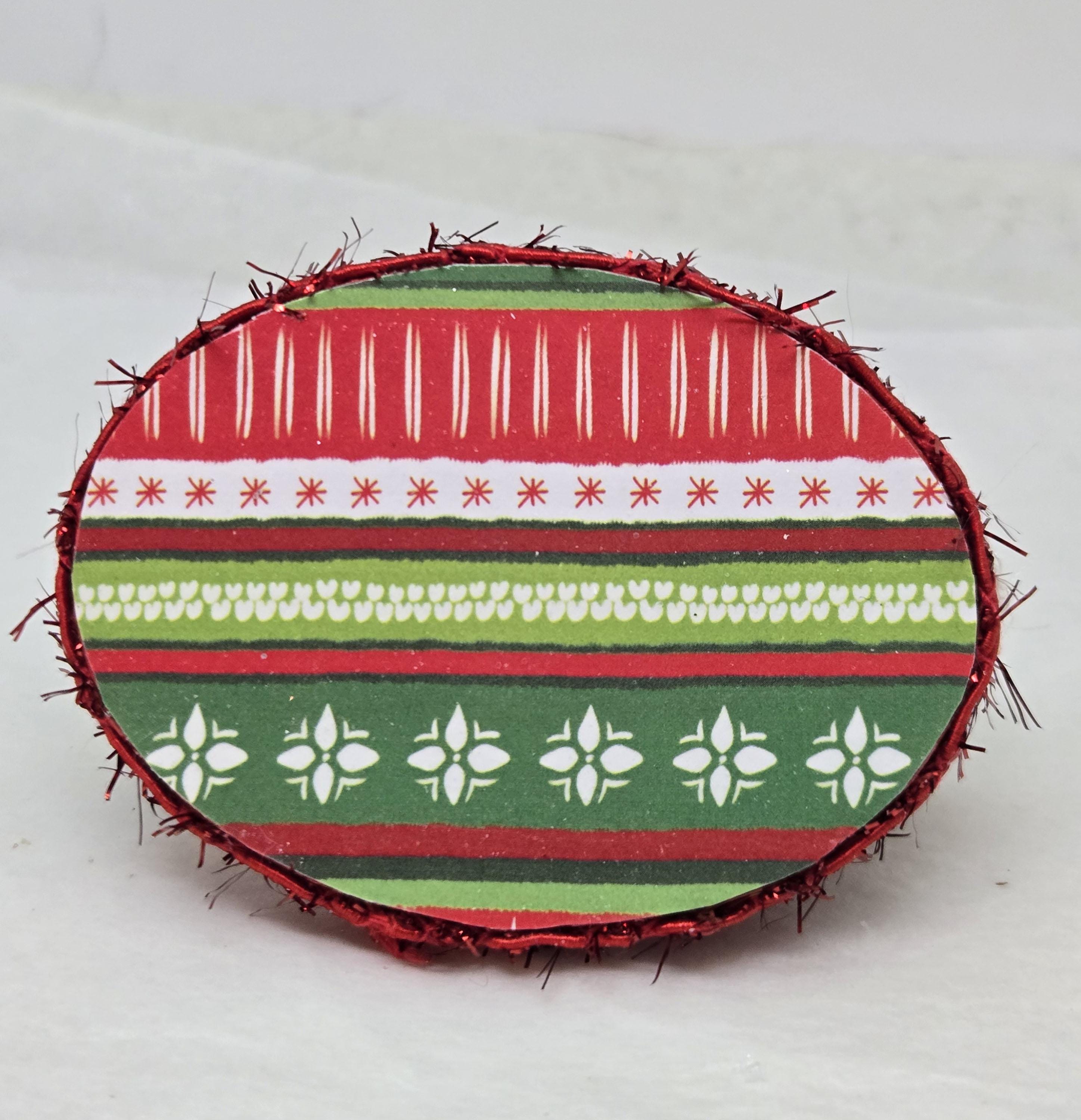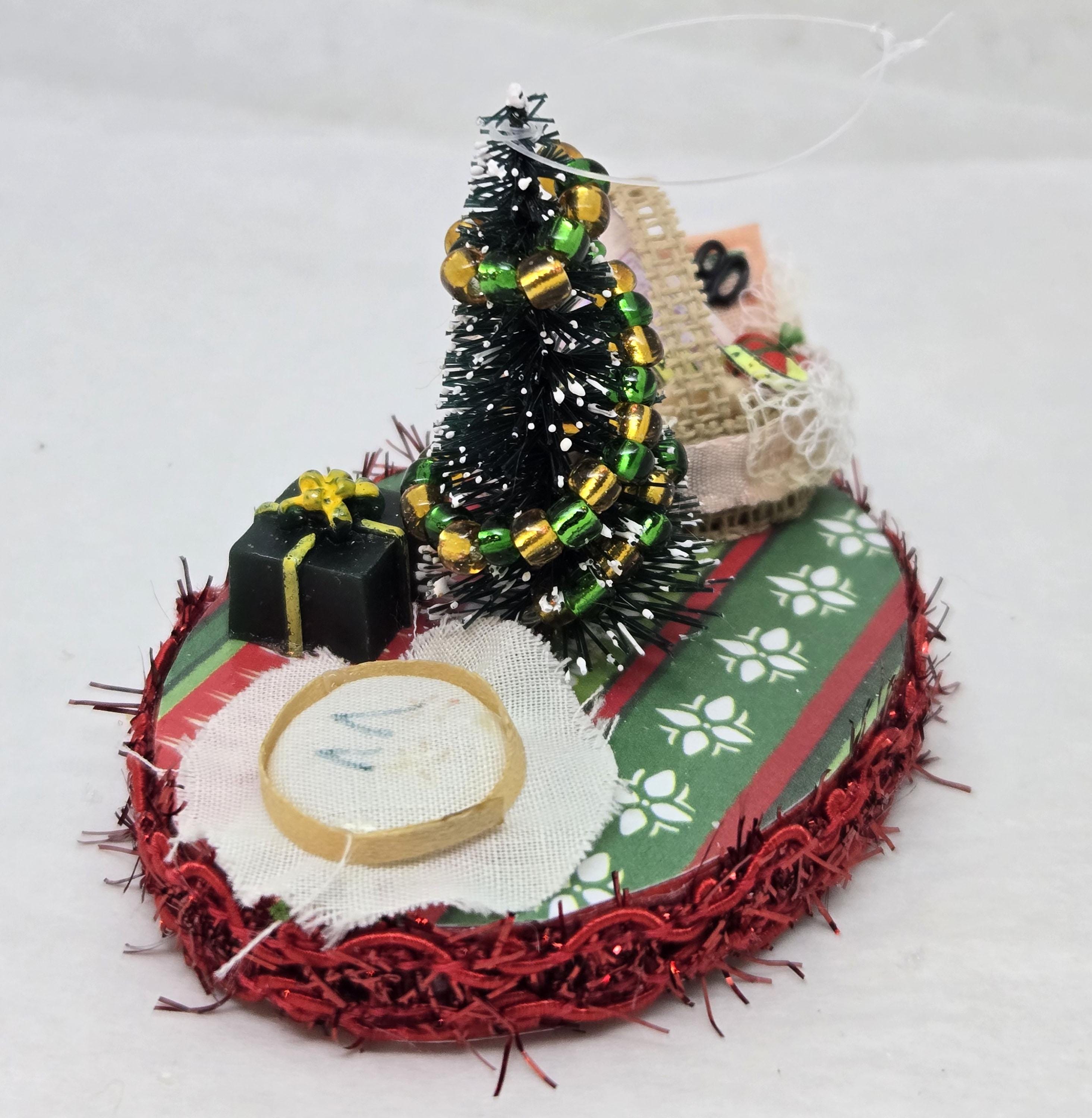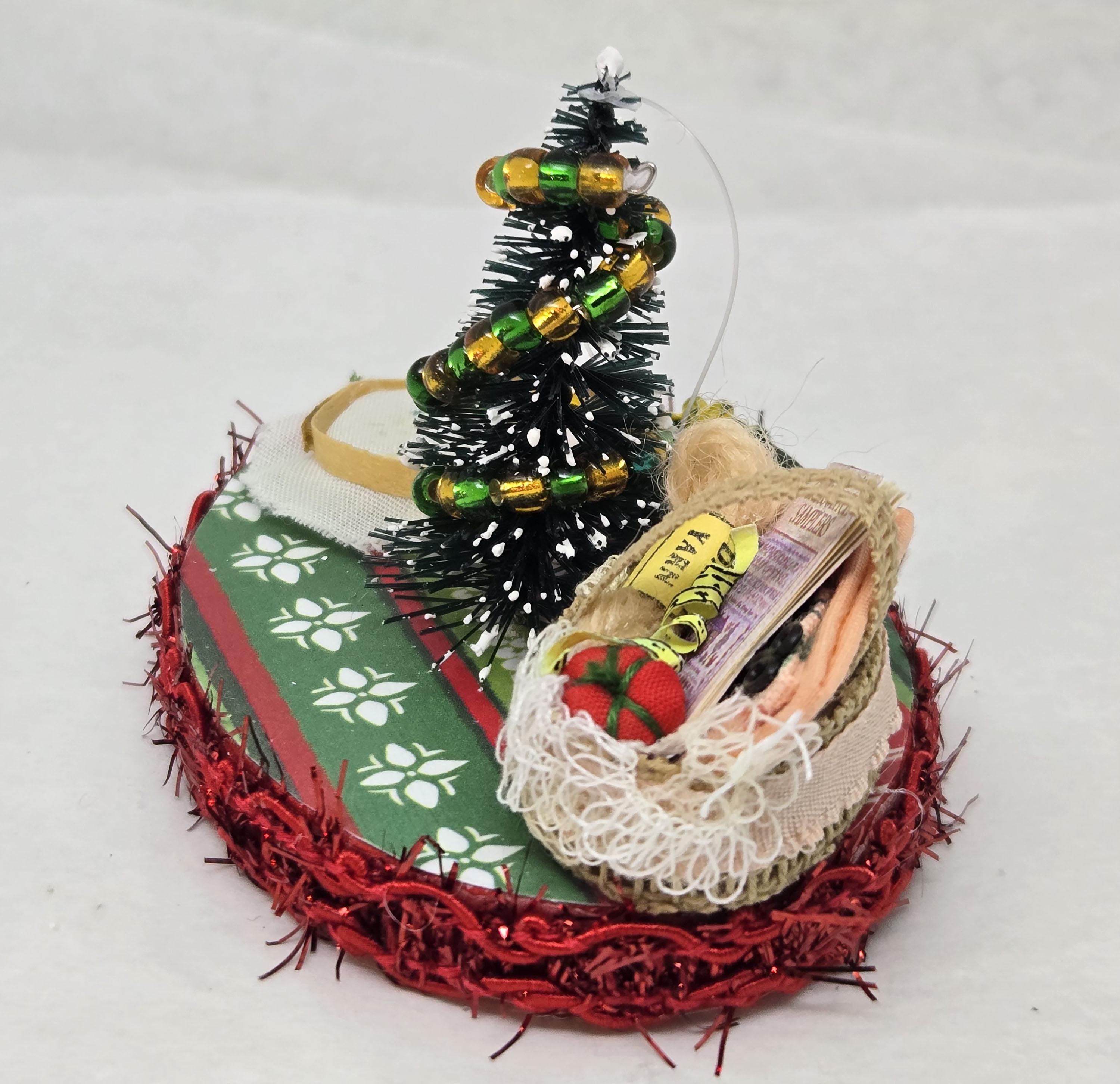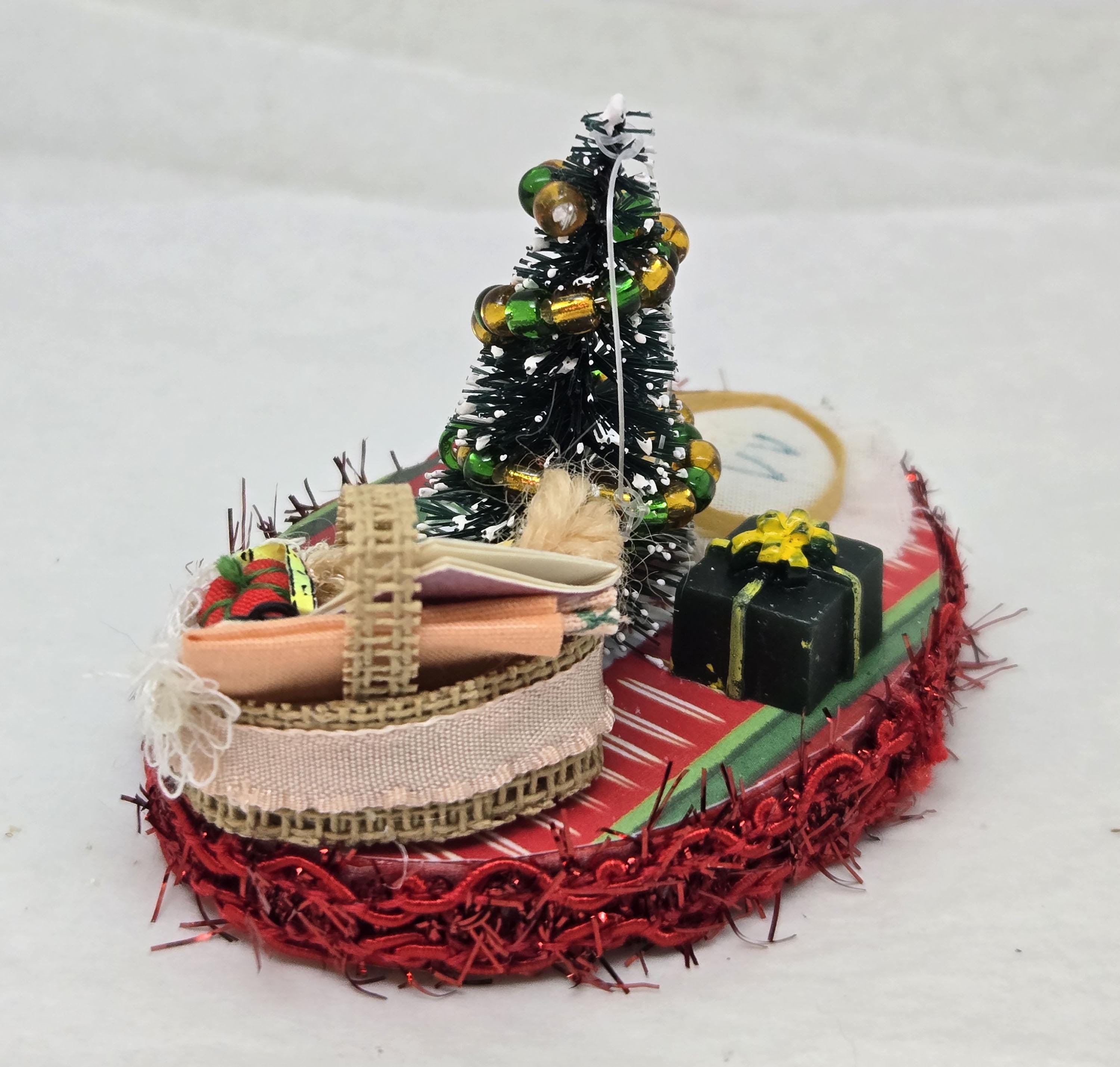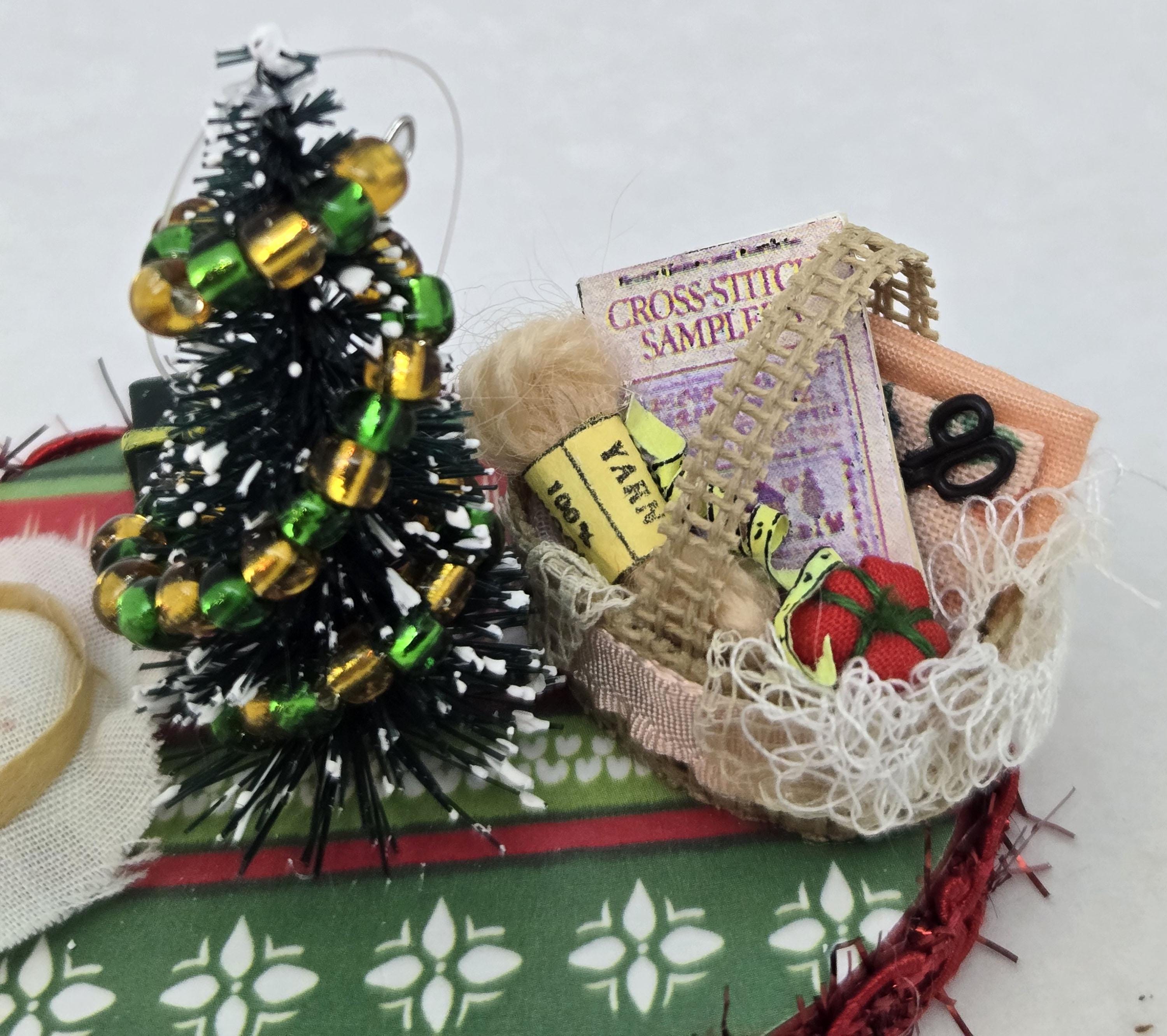 One of a kind, handcrafted Cross-Stitch Themed Christmas Ornament titled: What to Give a Cross-Stitch enthusiast for Christmas. Under the miniature tree that is decorated with beads I strung on wire you'll find an embroidery hoop holding fabric with a floral pattern awaiting cross-stitching. There is also a basket filled with cross-stitch samplers, yarn, fabric, pin cushion, scissors and a tape measure. The base of the ornament is wood. I covered this with scrapbook paper sealed with decoupage. The sides were painted then I added decorative trim.