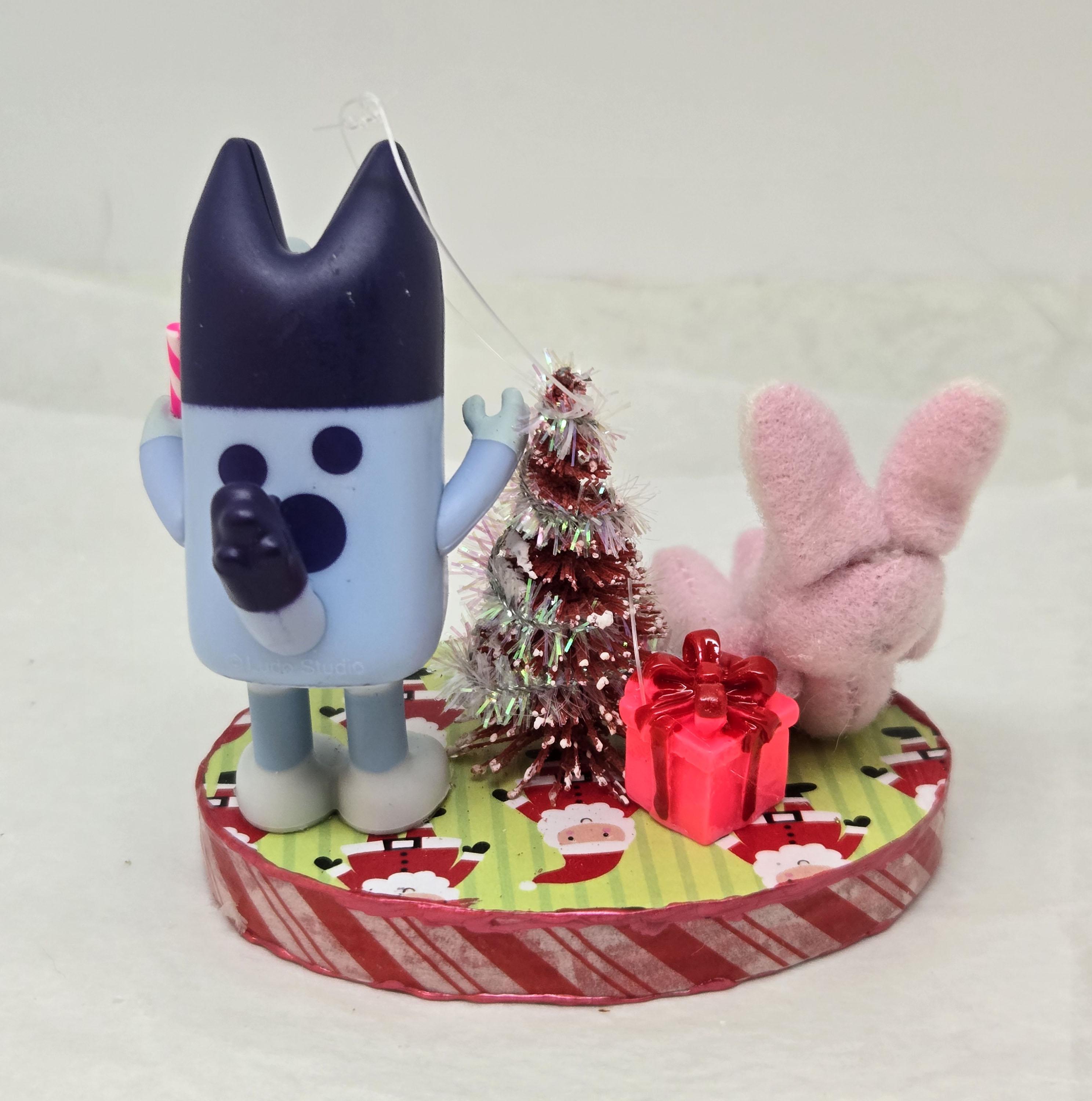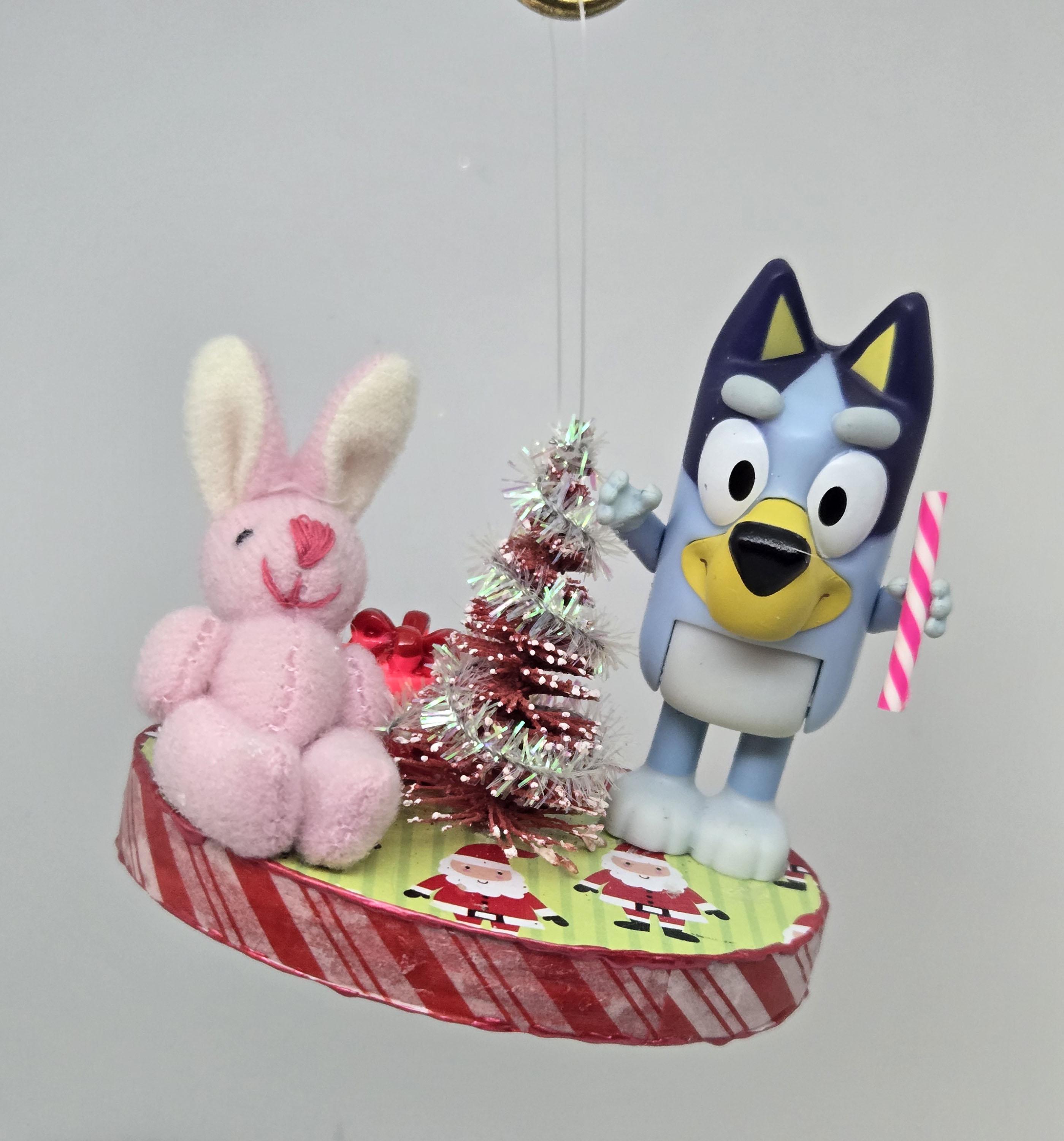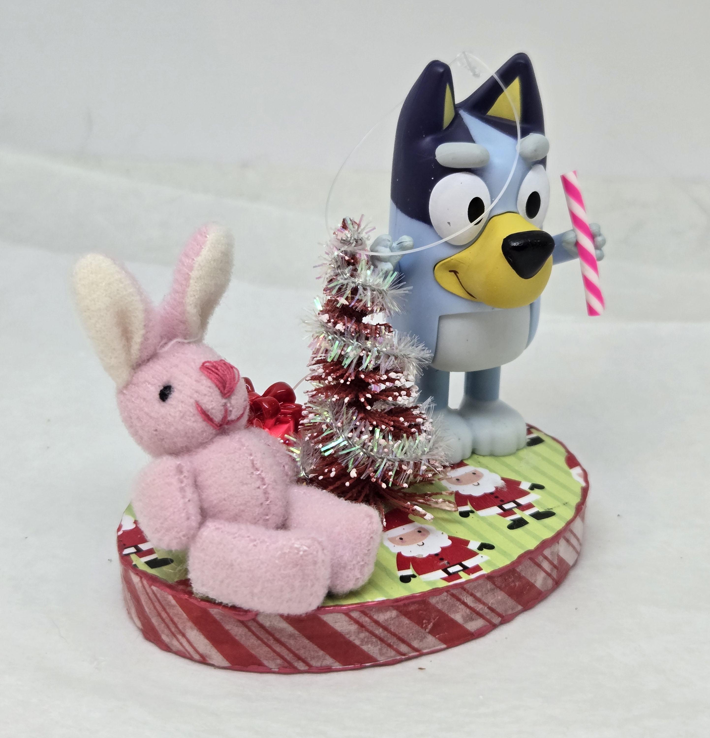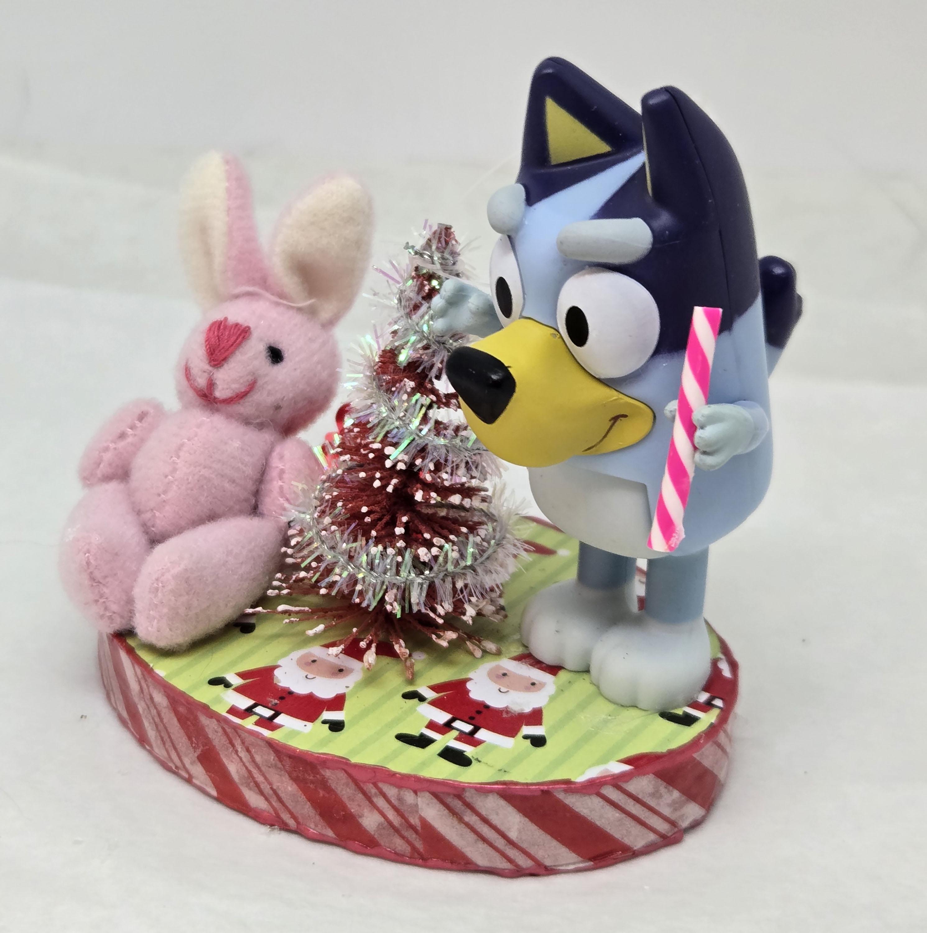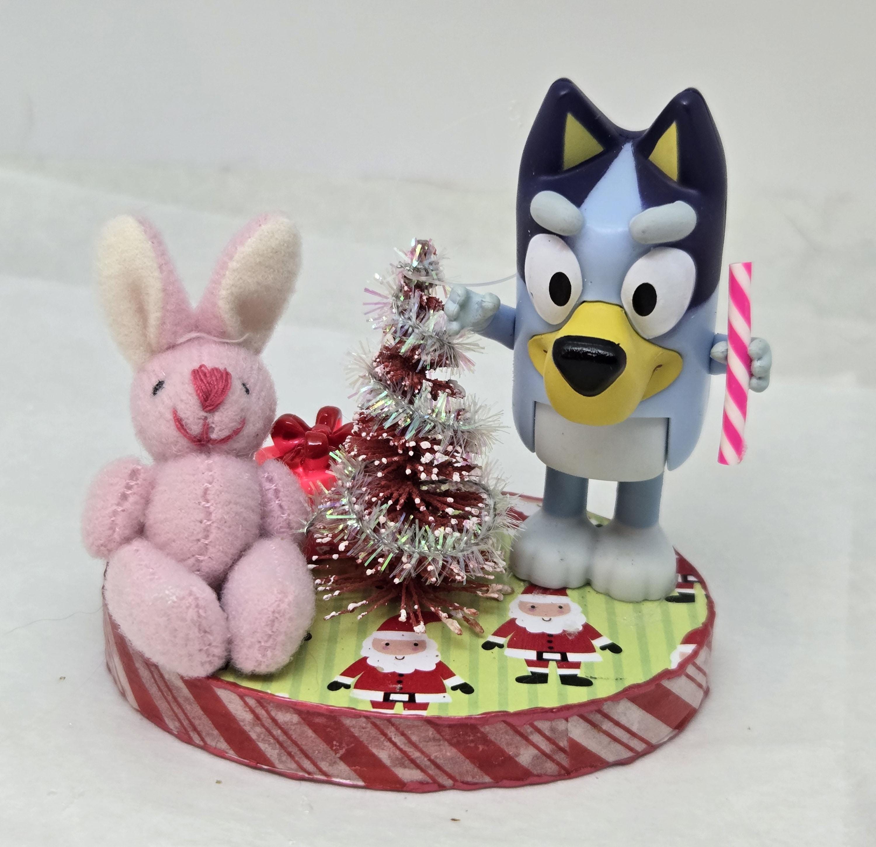 One of a kind, handcrafted Bluey Christmas Ornament titled: Bluey and the Stuffed Rabbit. Bluey is a toy figurine. She's holding a clay candy cane. The mini tree is decorated with a tinsel pipe cleaner. The rabbit is a dollhouse miniature toy made of stuffed fabric. The base is wood. I covered this with scrapbook paper. The sides were painted then covered with washi tape. I painted the edges with Liquid Pearl acrylic paint. Finally, I sealed the entire base with decoupage.