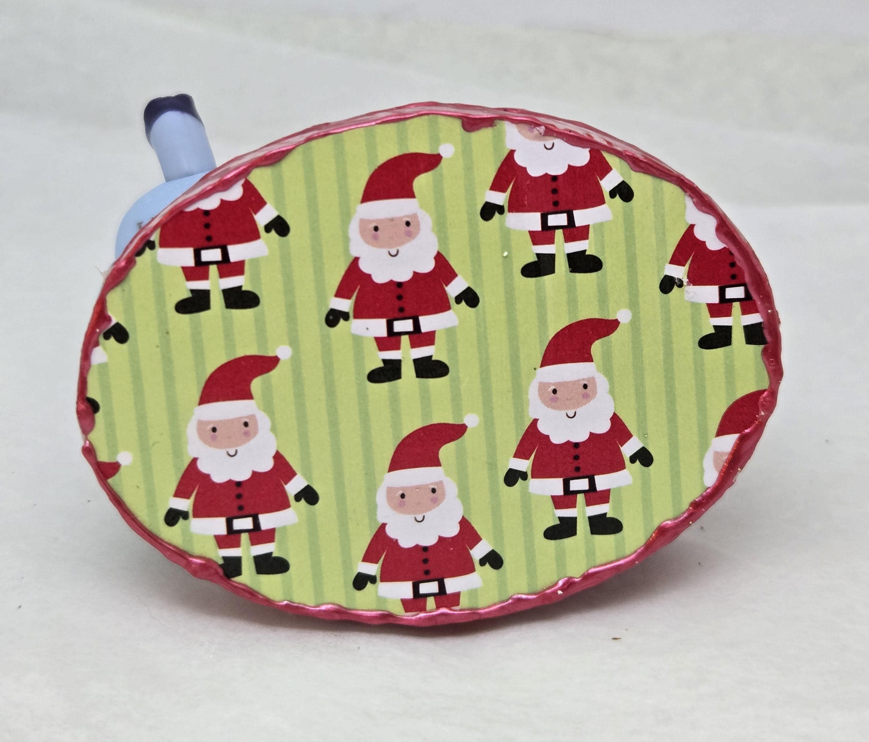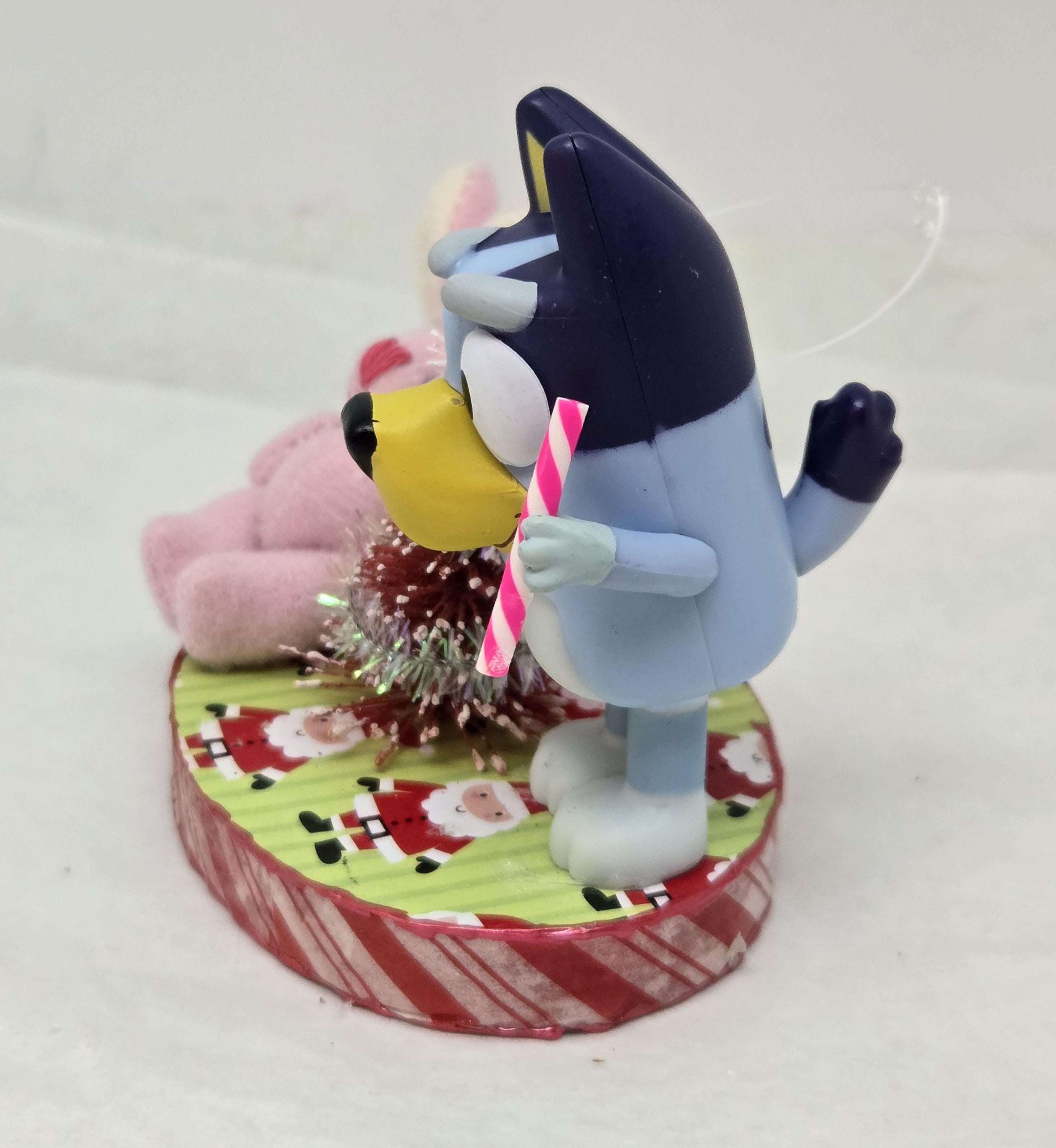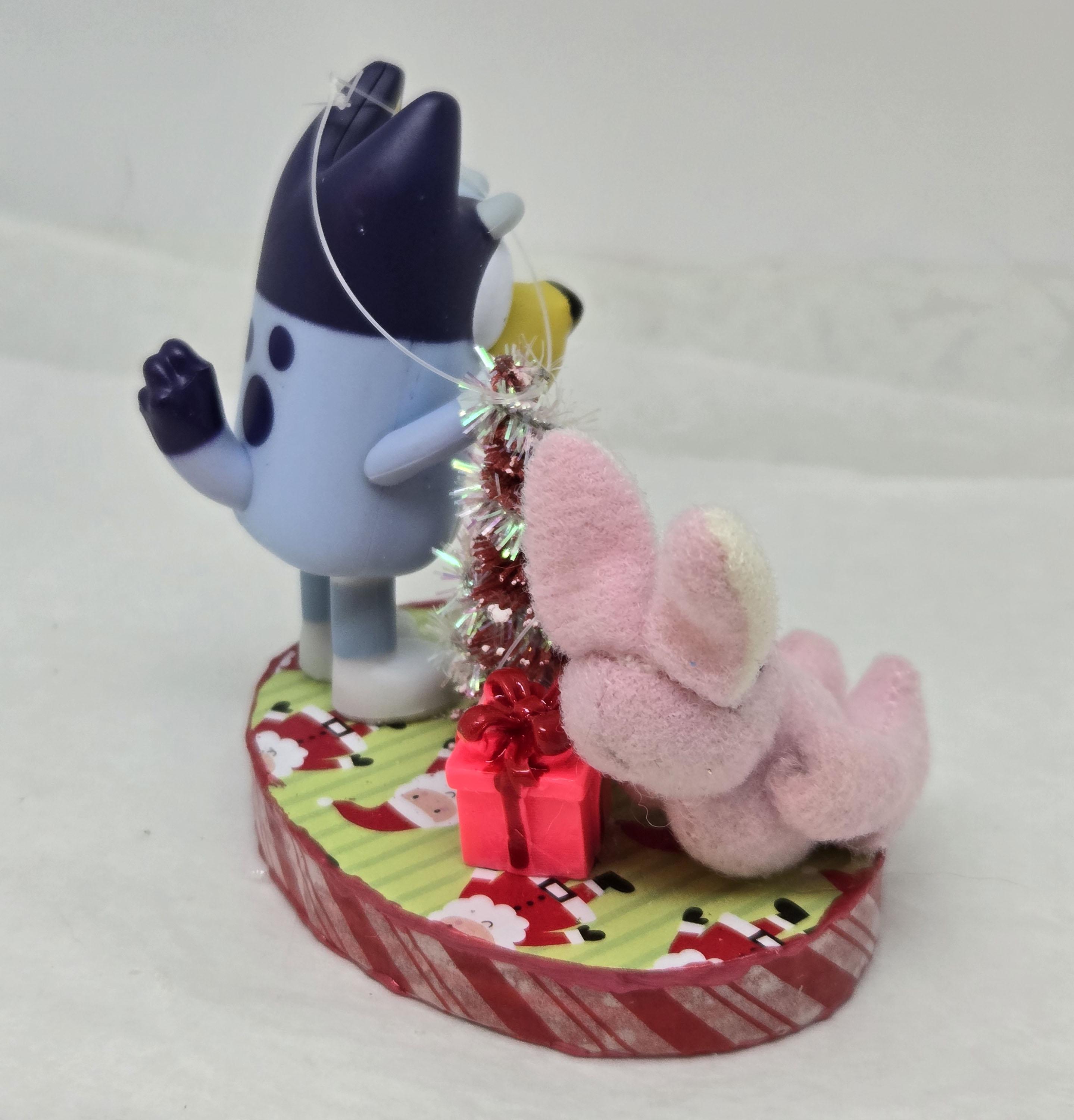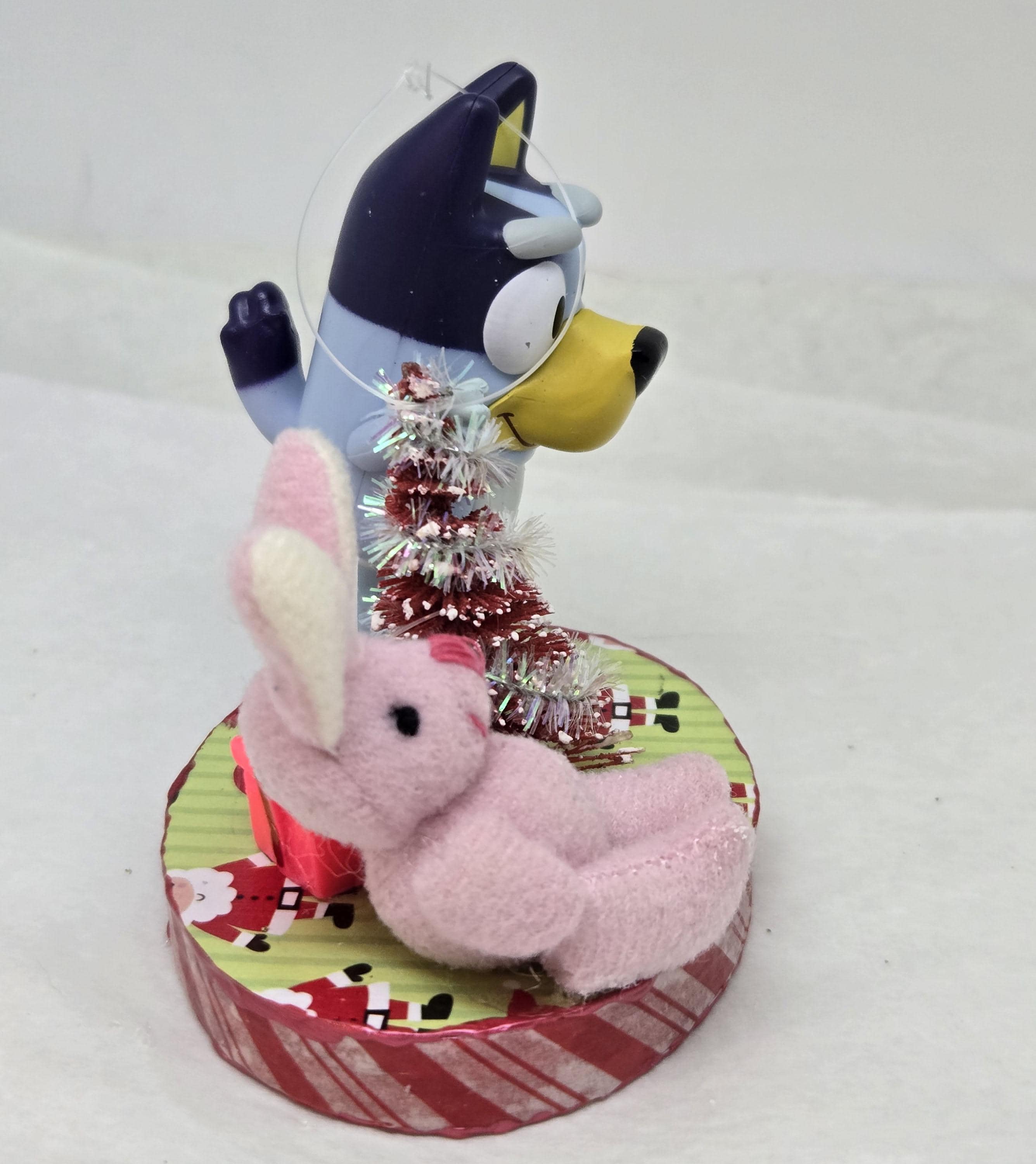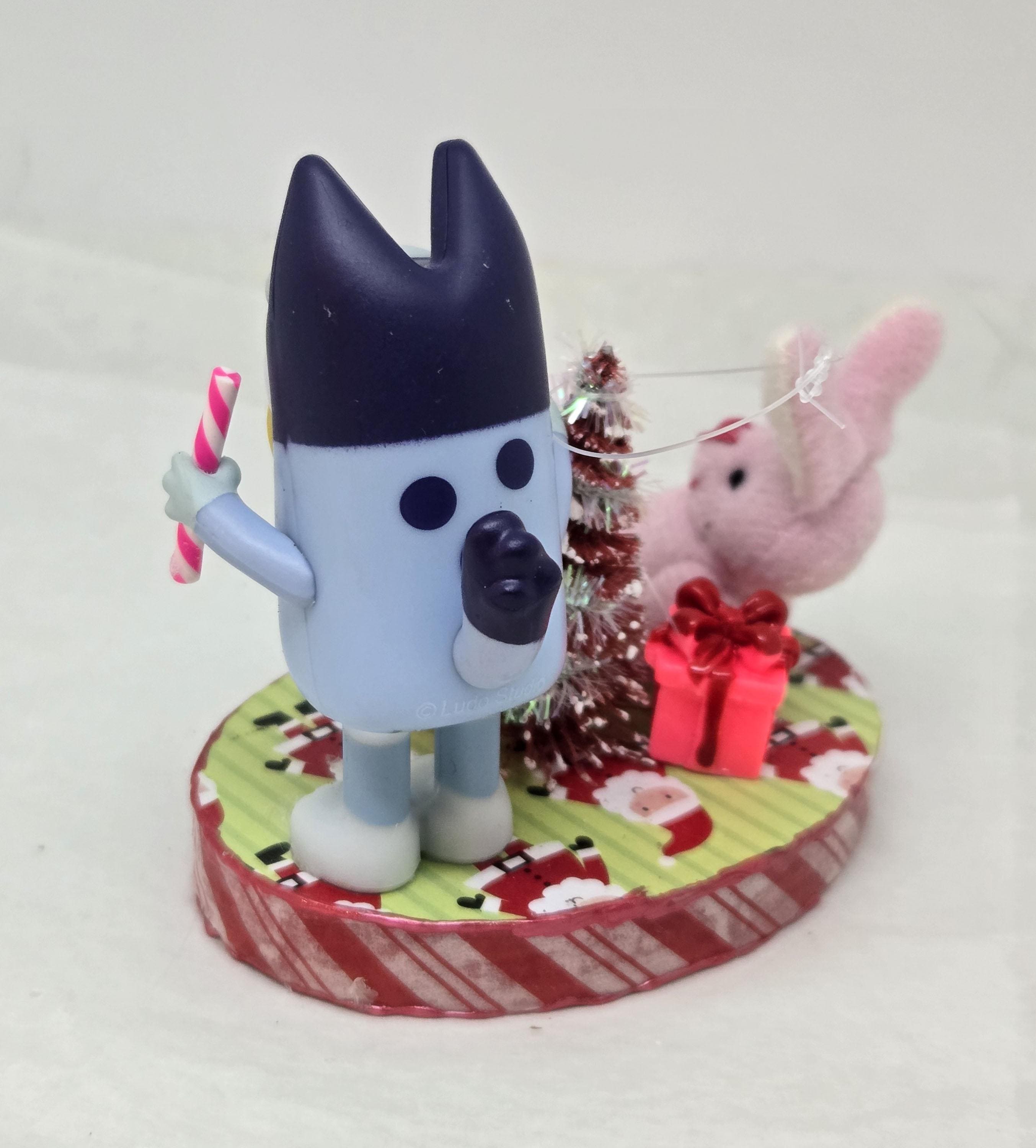 One of a kind, handcrafted Bluey Christmas Ornament titled: Bluey and the Stuffed Rabbit. Bluey is a toy figurine. She's holding a clay candy cane. The mini tree is decorated with a tinsel pipe cleaner. The rabbit is a dollhouse miniature toy made of stuffed fabric. The base is wood. I covered this with scrapbook paper. The sides were painted then covered with washi tape. I painted the edges with Liquid Pearl acrylic paint. Finally, I sealed the entire base with decoupage.