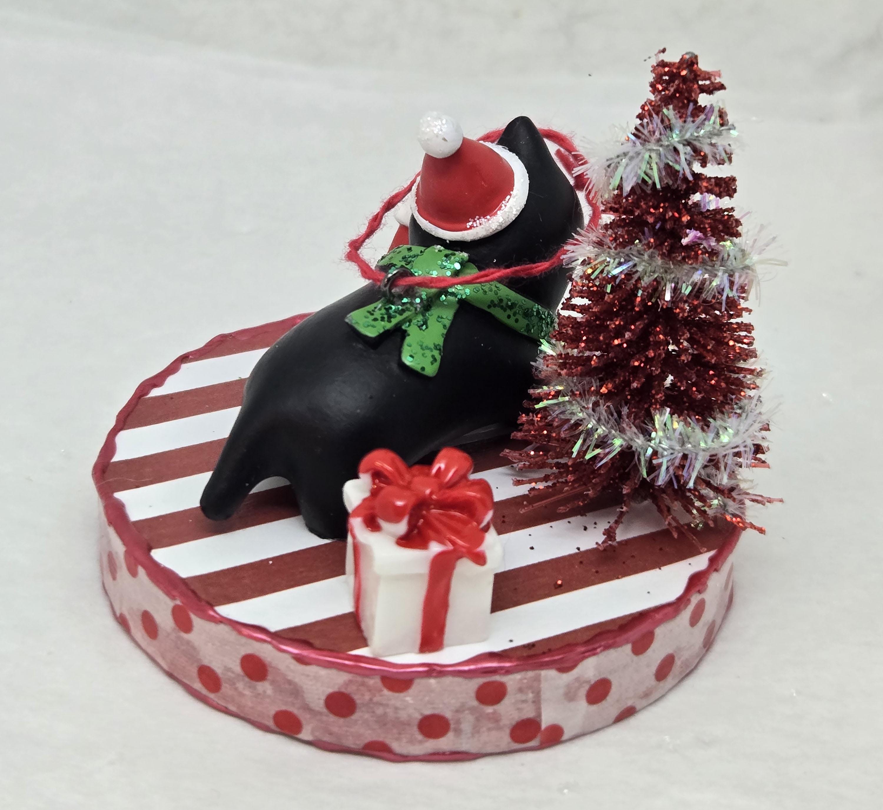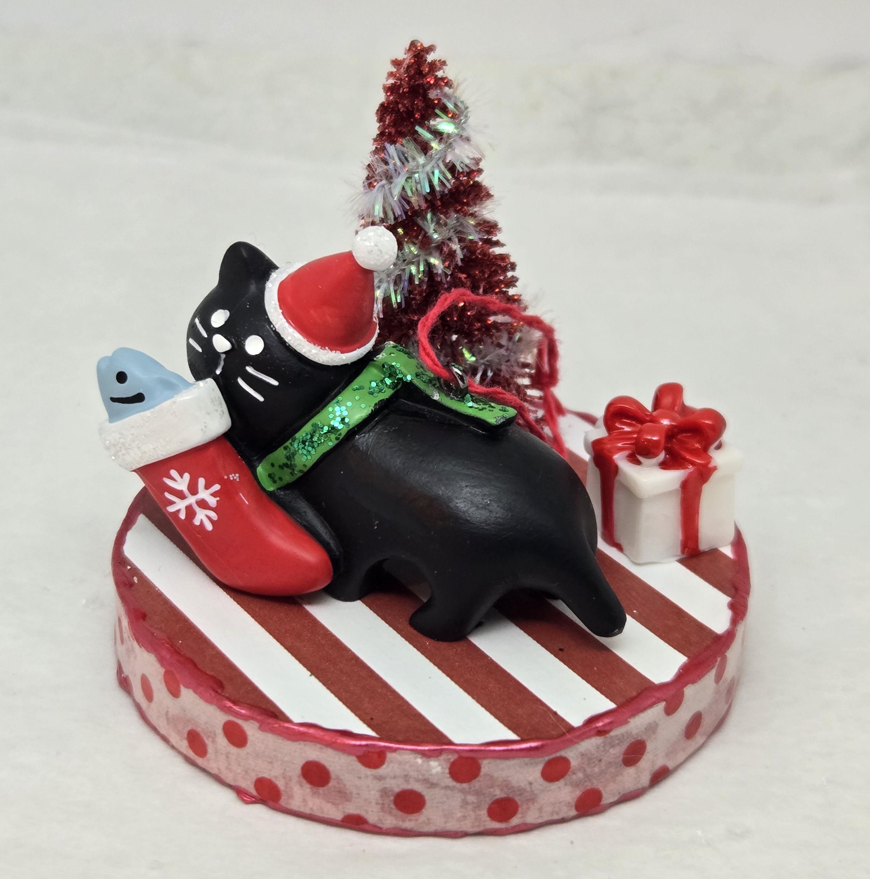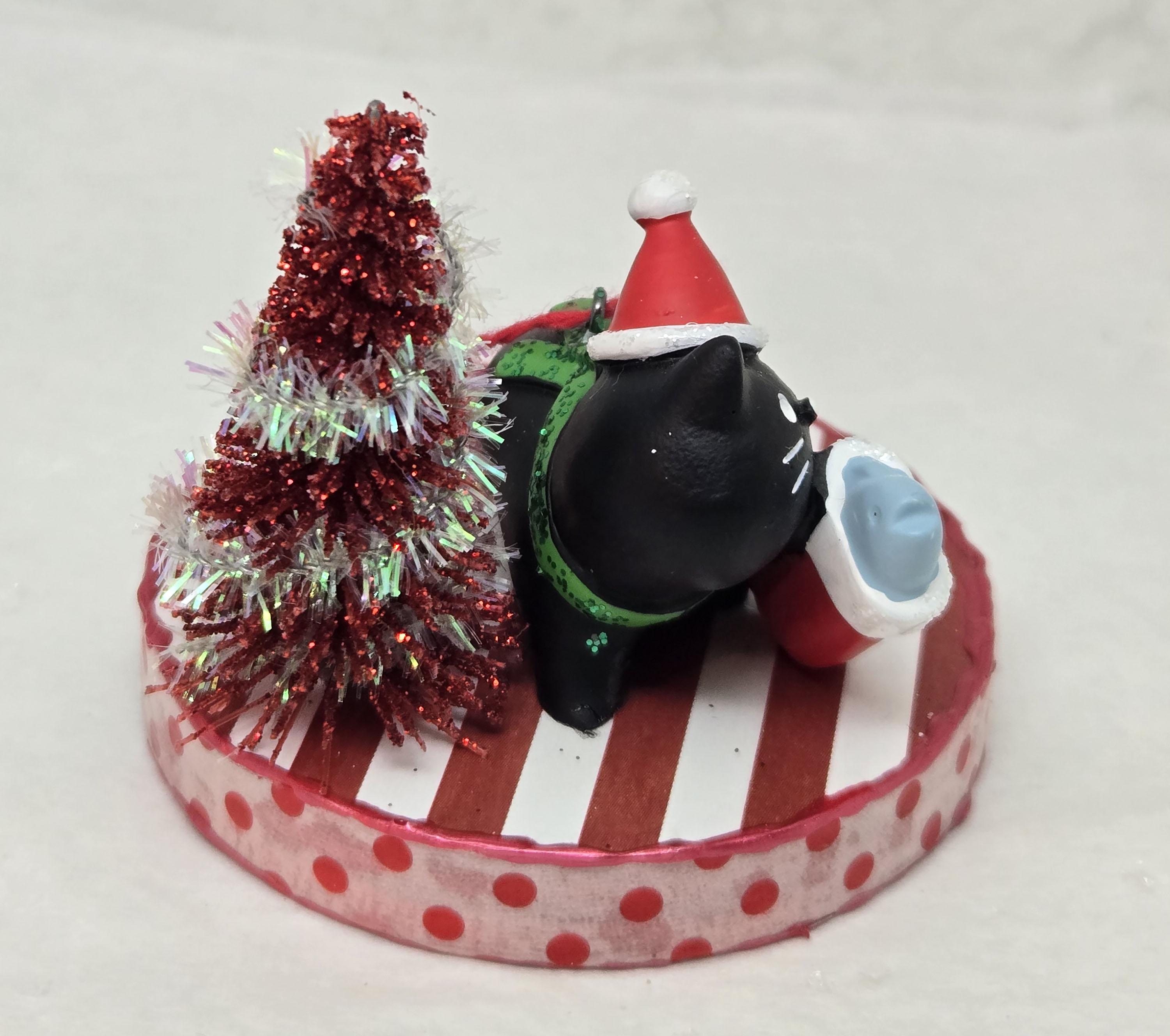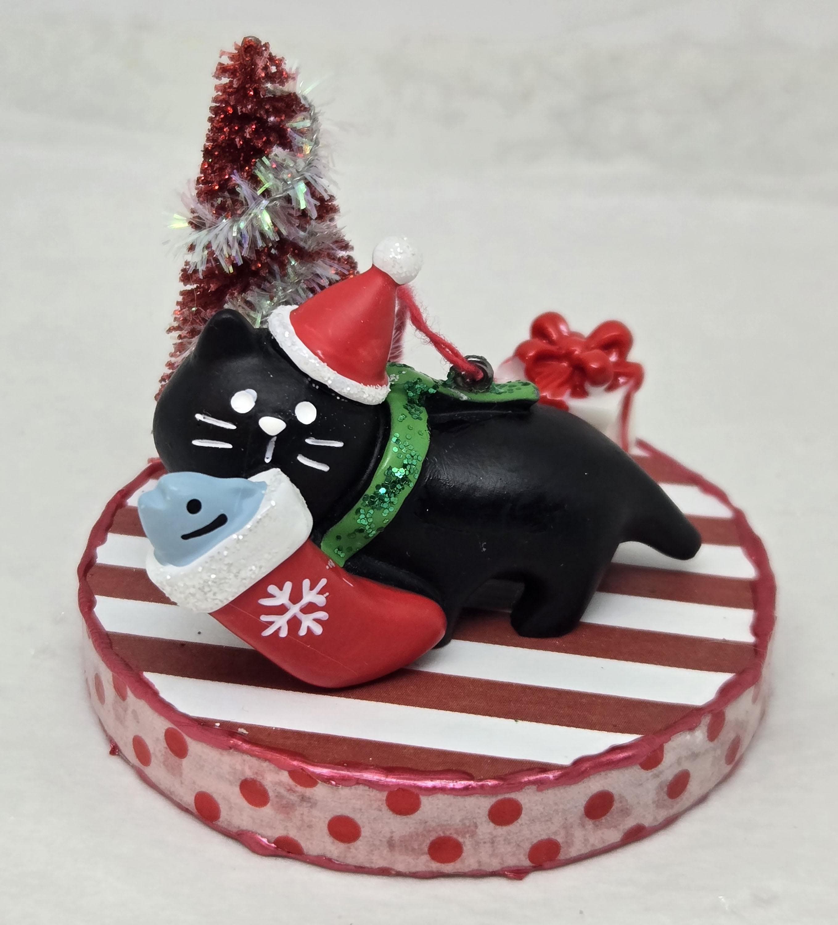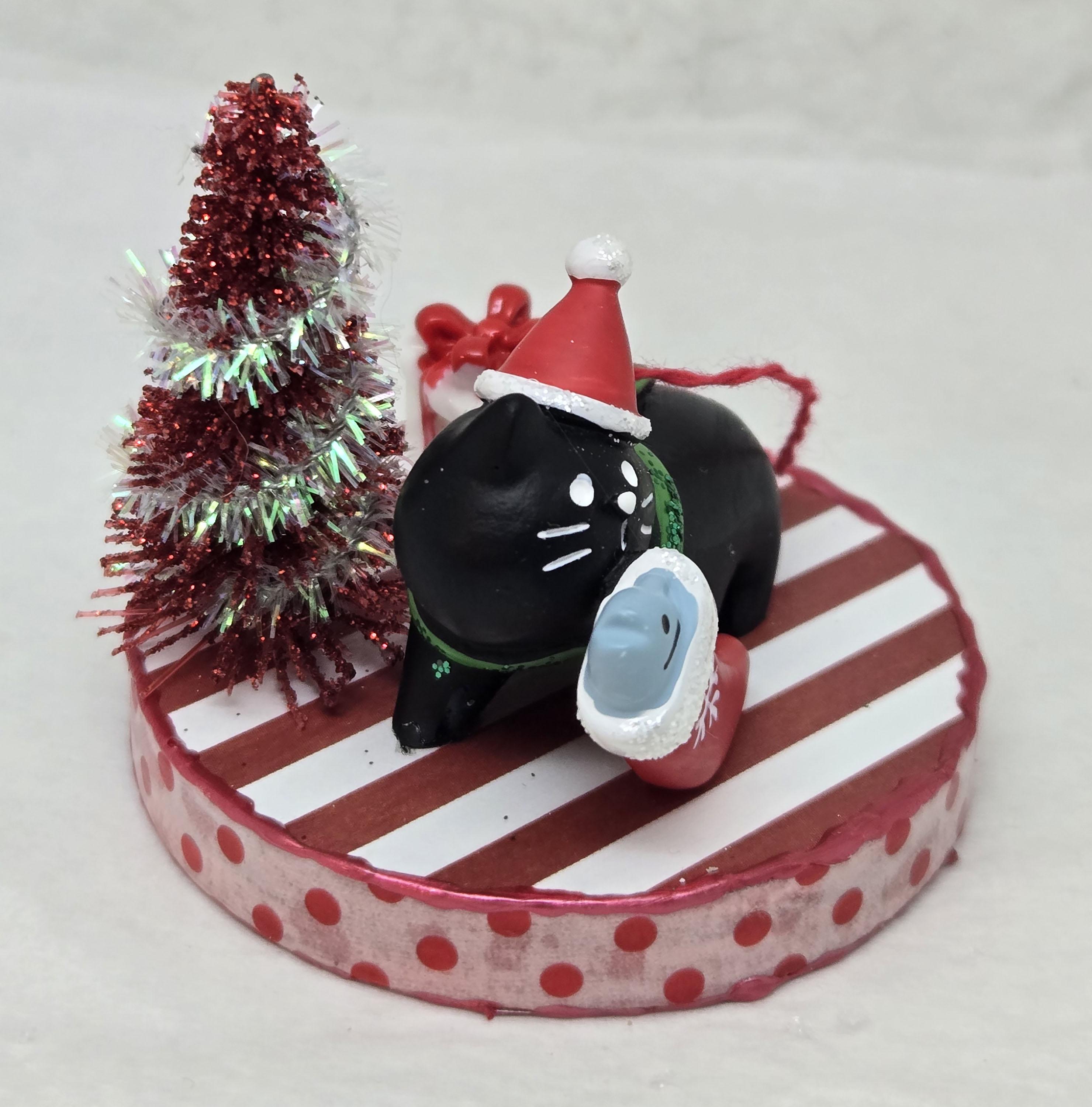 One of a kind, Handcrafted Black Cartoon Cat Christmas Ornament. Winkie has already grabbed her stocking and is heading off to enjoy it! Winkie is a cartoon cat figurine. I added glitter glue to her santa hat pompom and trim as well as the top of the stocking and her scarf. The mini tree is decorated with a tinsel pipe cleaner. The base of the ornament is wood. I covered the top and bottom with scrapbook paper. The sides were painted then covered with washi tape. I painted the edges with Liquid Pearl acrylic. Lastly, I sealed the entire base with decoupage.