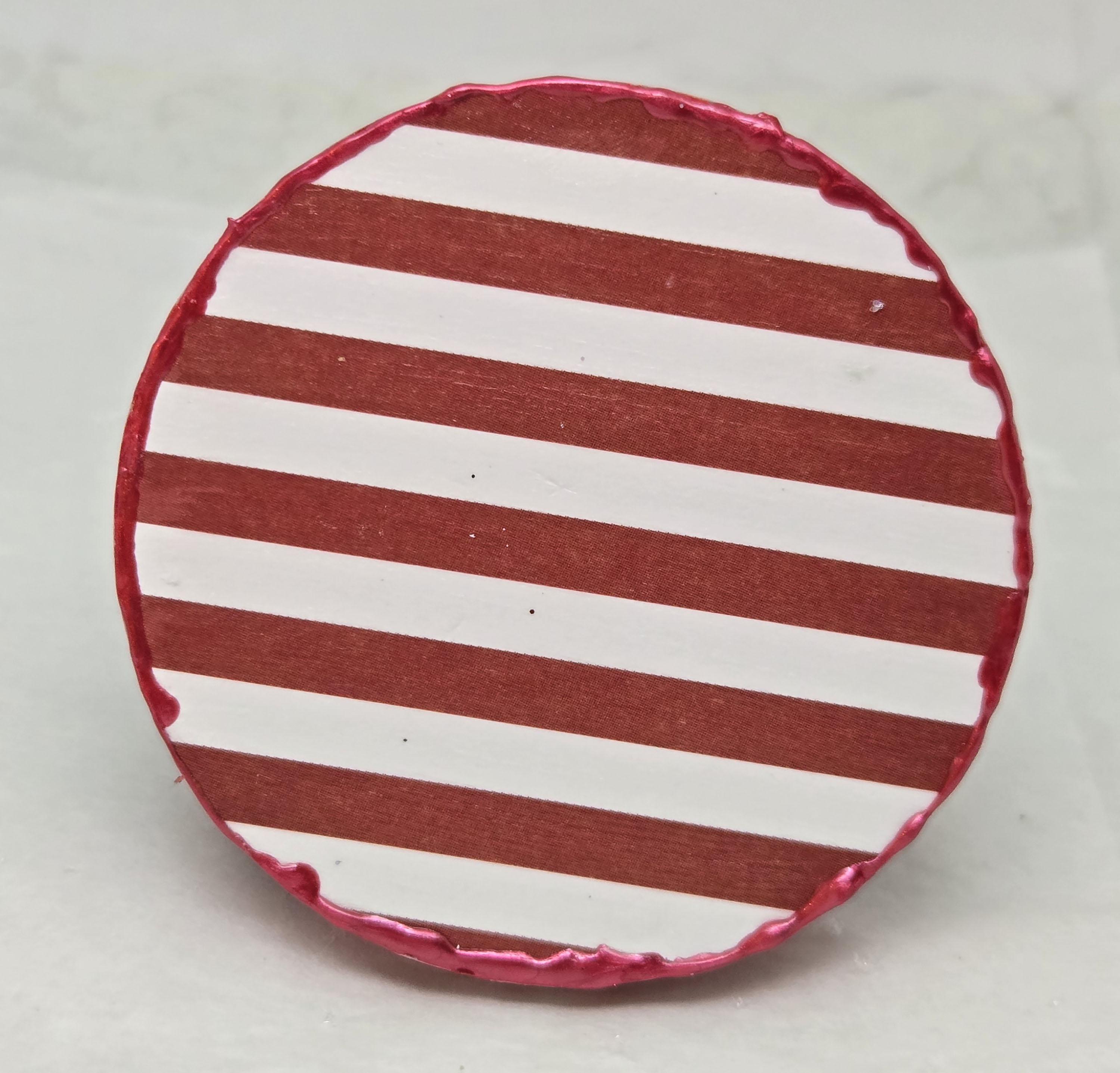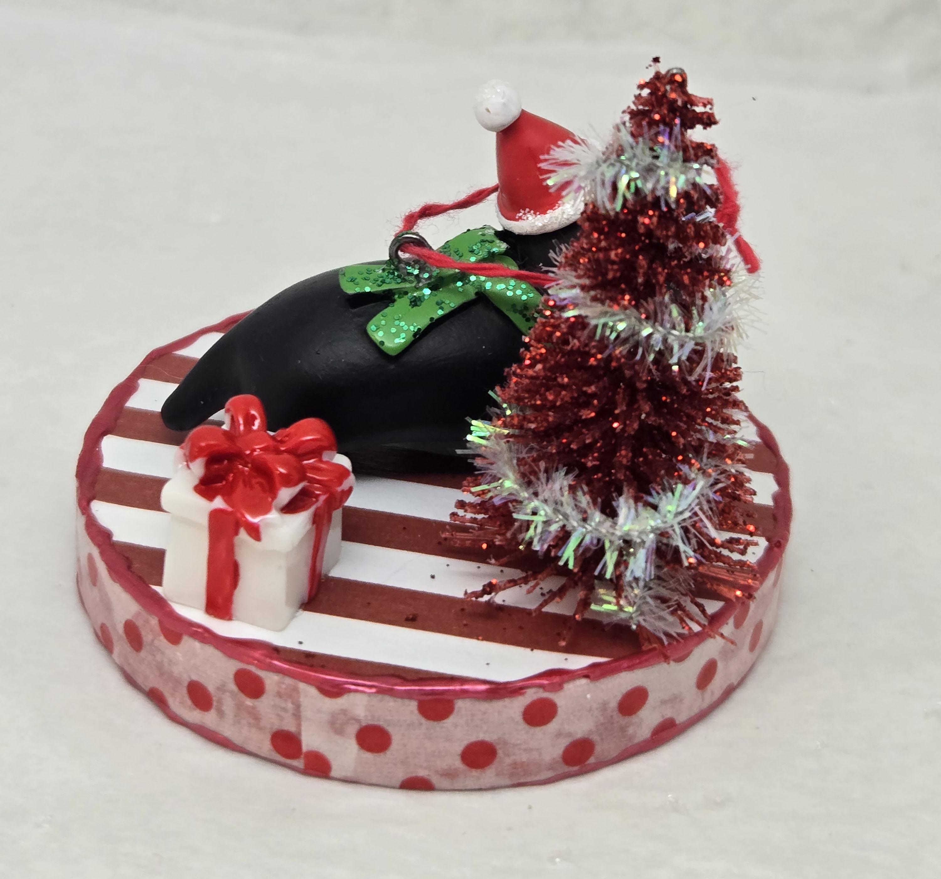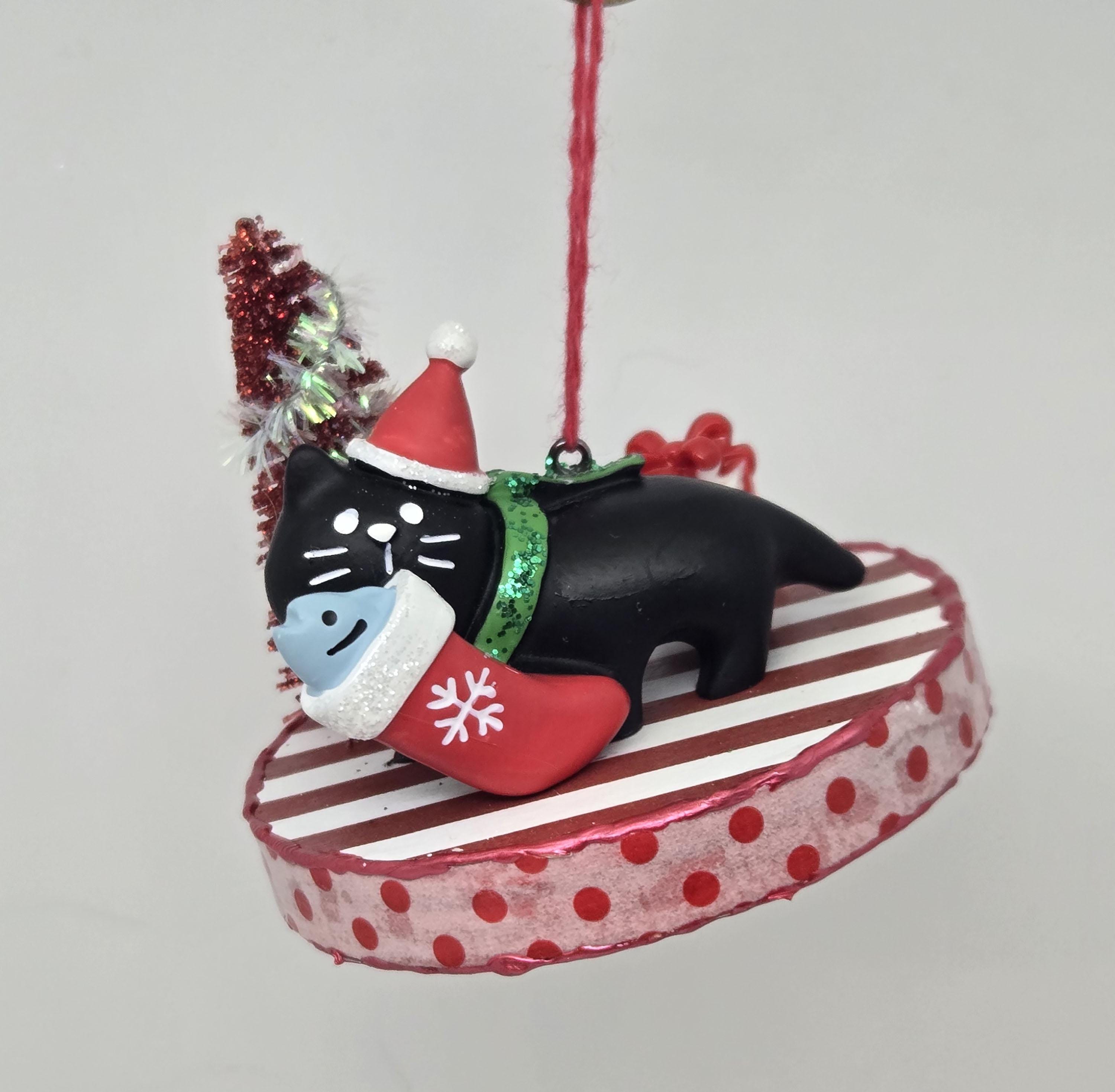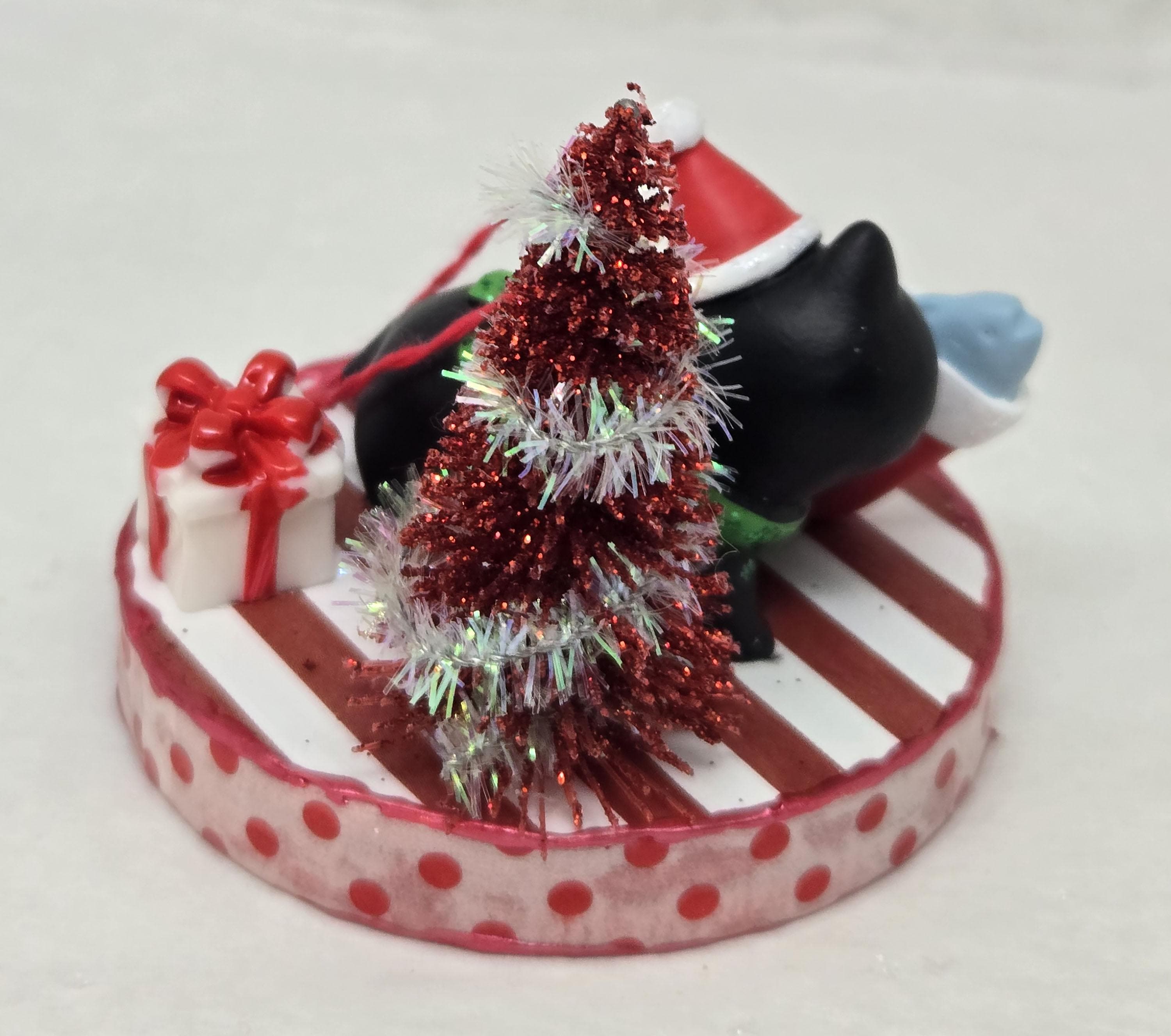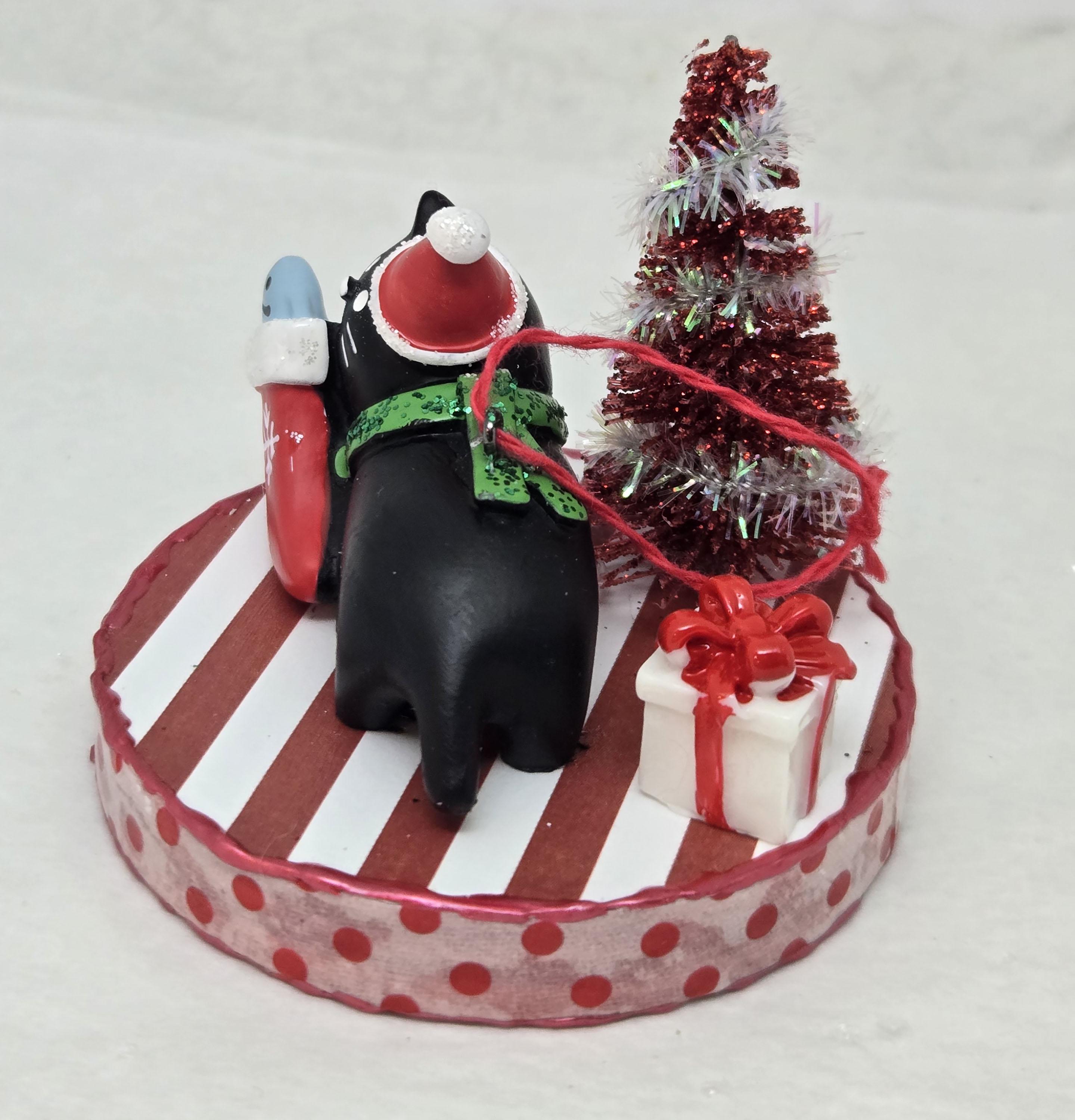 One of a kind, Handcrafted Black Cartoon Cat Christmas Ornament. Winkie has already grabbed her stocking and is heading off to enjoy it! Winkie is a cartoon cat figurine. I added glitter glue to her santa hat pompom and trim as well as the top of the stocking and her scarf. The mini tree is decorated with a tinsel pipe cleaner. The base of the ornament is wood. I covered the top and bottom with scrapbook paper. The sides were painted then covered with washi tape. I painted the edges with Liquid Pearl acrylic. Lastly, I sealed the entire base with decoupage.