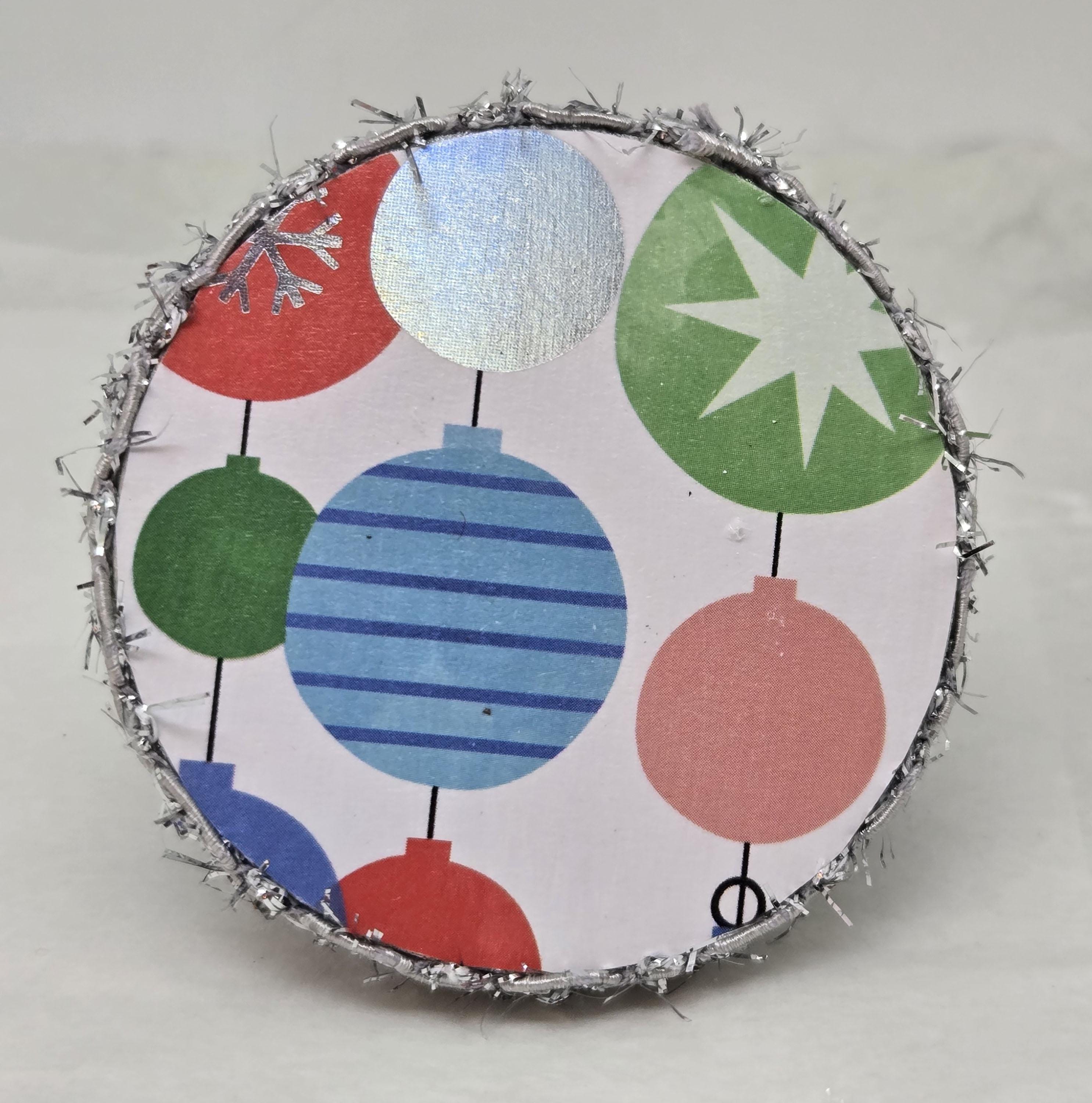 This Hello Kitty is a toy figurine that I repurposed into this ornament. I added glitter paint to KItty's bow, cuffs and the upper and lower bands on the drum and glitter glue to the center band of the drum. The base of this ornament is wood. I covered the top and bottom with scrapbook paper that I sealed with decoupage. I painted the sides then covered them with decorative trim.