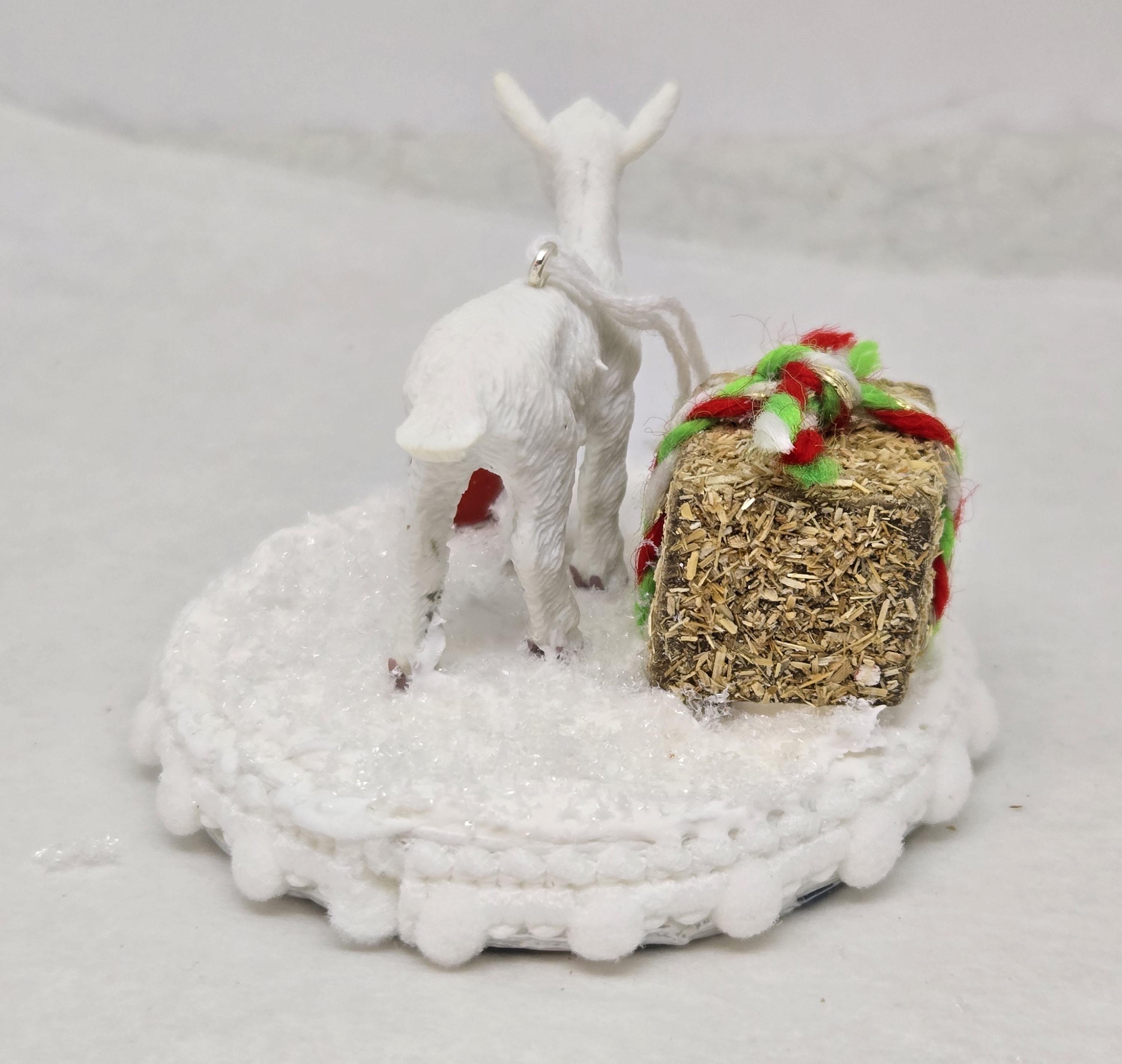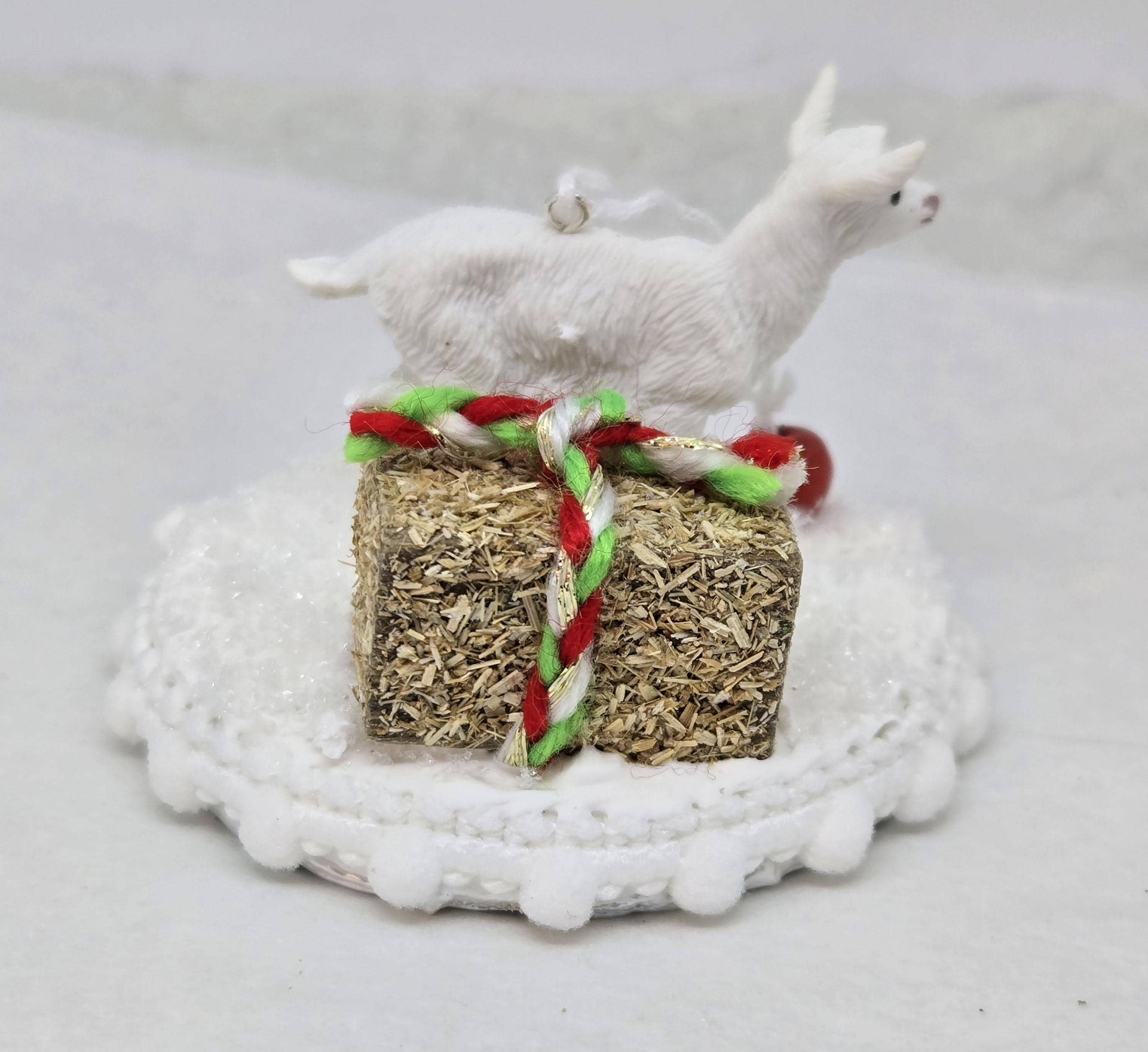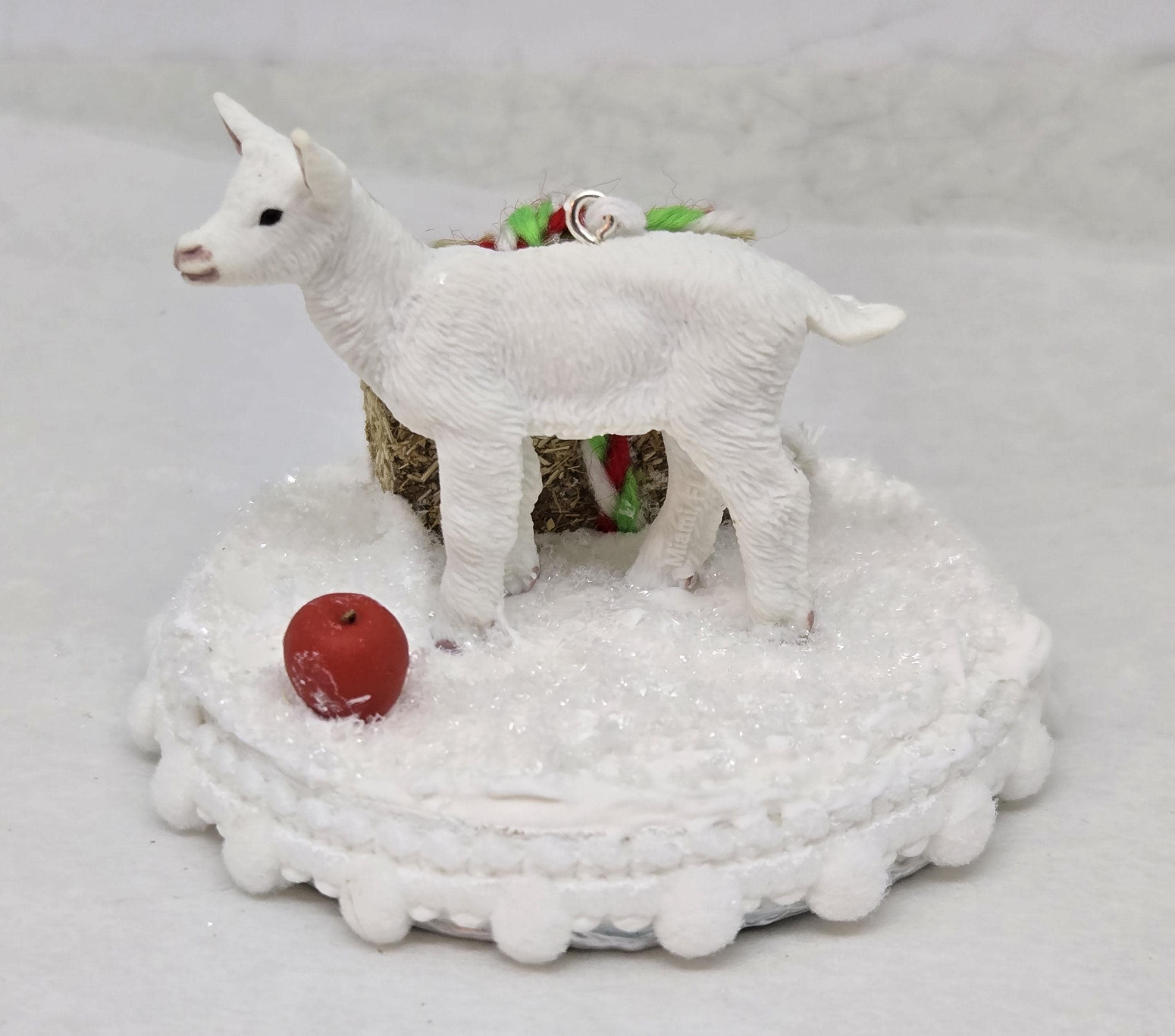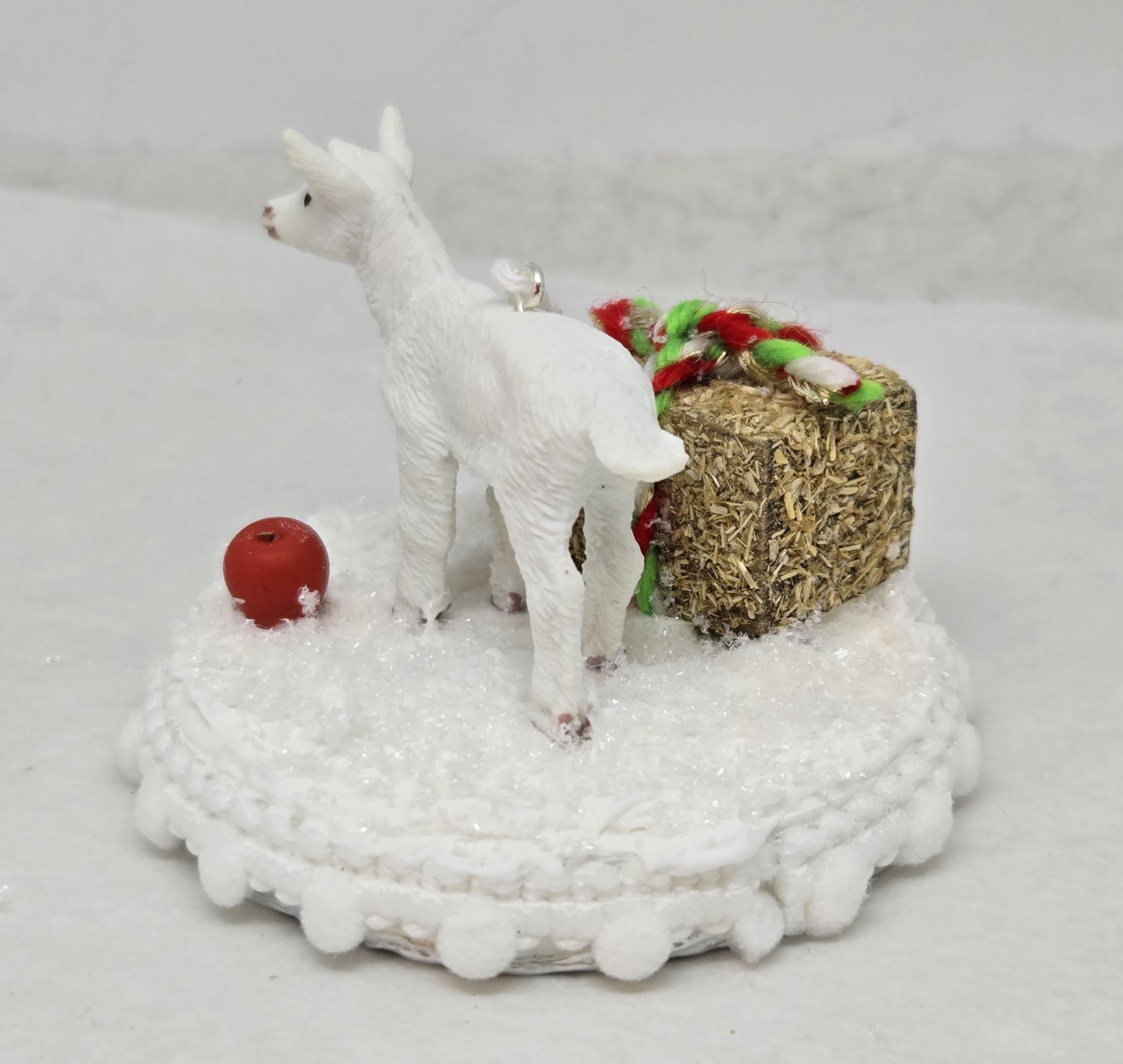 One of a kind, handcrafted Baby Goat/Kid Christmas Ornament. I crafted this little ornament using a Safari Ltd, realistic kid figurine and dollhouse miniature hay bale and apple. The base of the ornament is wood. I covered the bottom with scrapbook paper sealed with decoupage. The top and sides were painted. I covered the sides with decorative trim and the top with artificial snow.