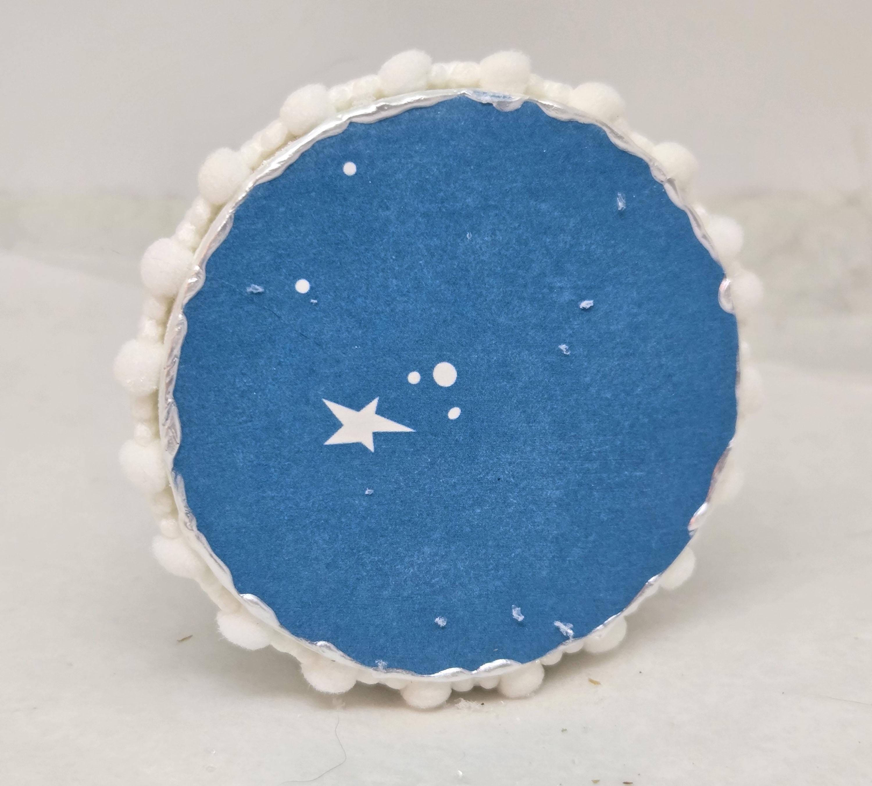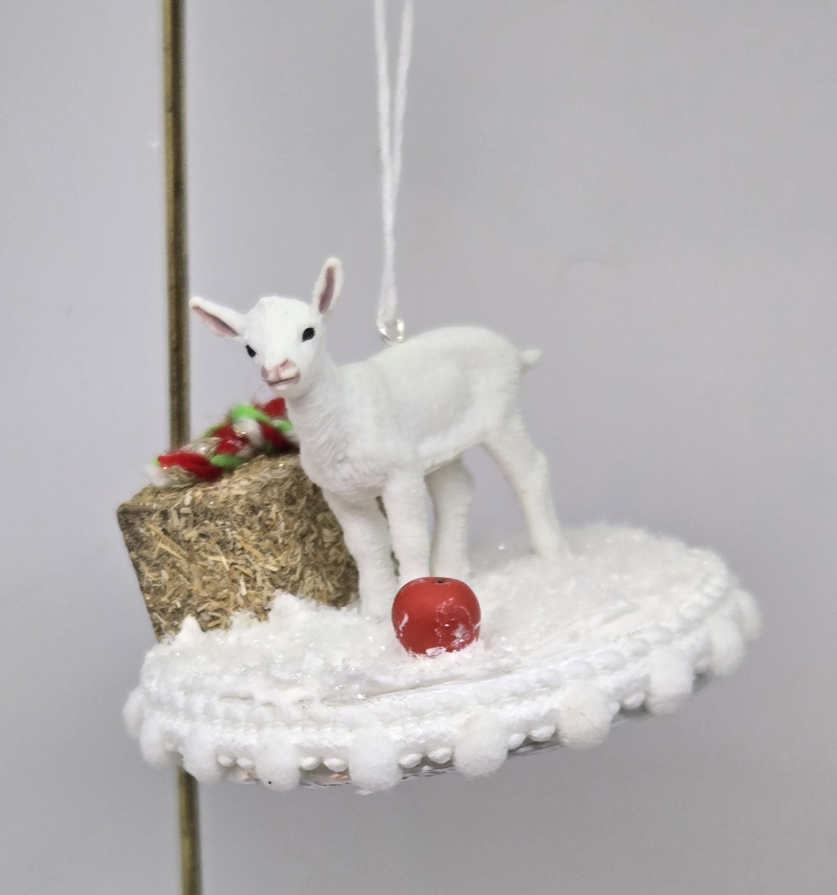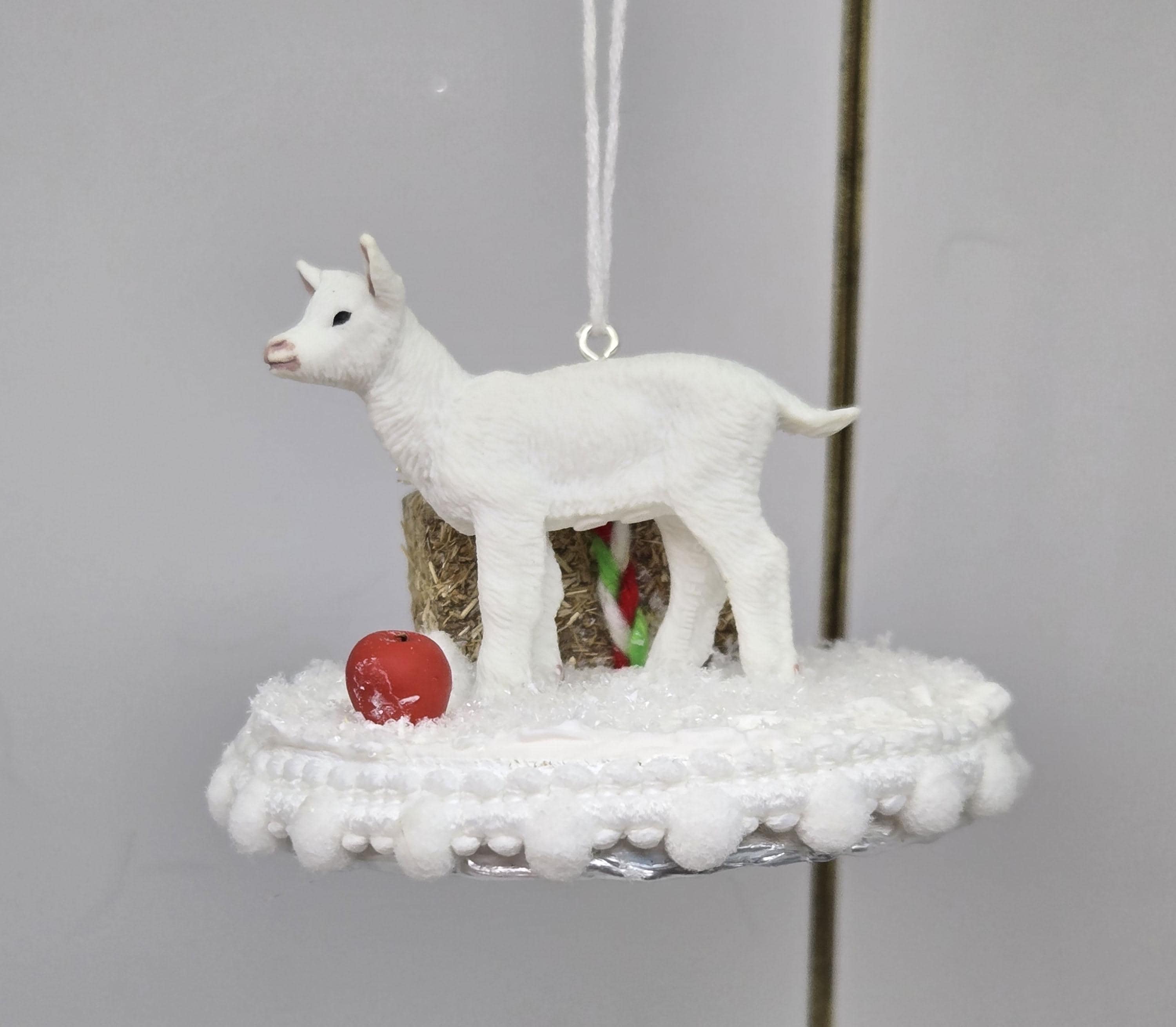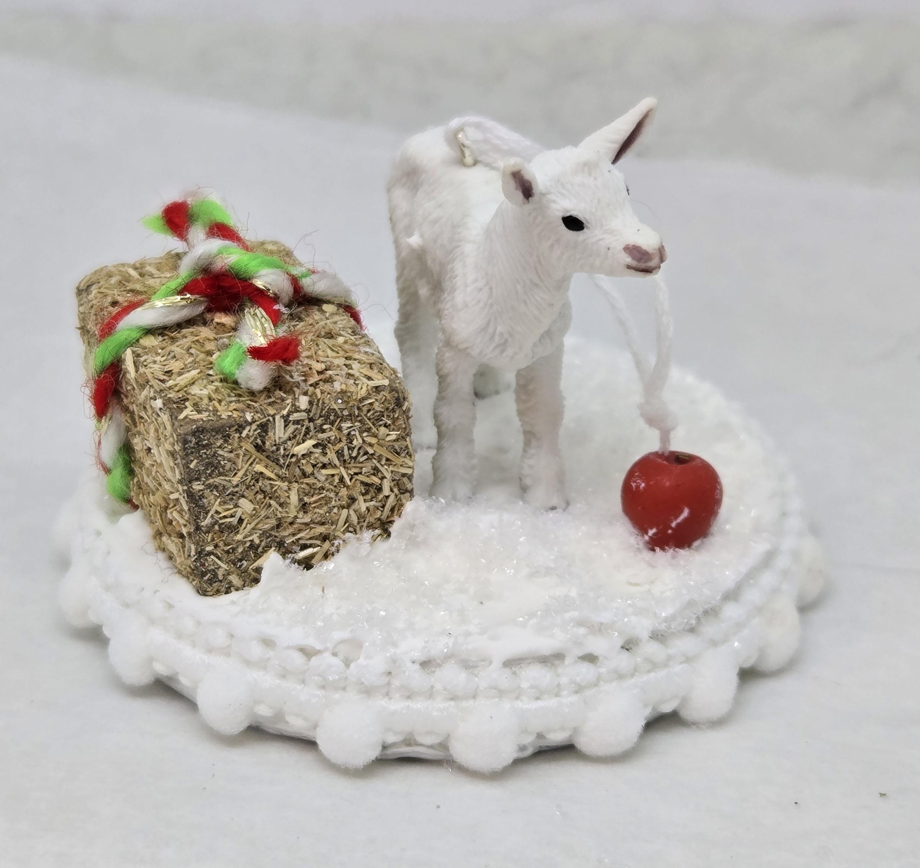 One of a kind, handcrafted Baby Goat/Kid Christmas Ornament. I crafted this little ornament using a Safari Ltd, realistic kid figurine and dollhouse miniature hay bale and apple. The base of the ornament is wood. I covered the bottom with scrapbook paper sealed with decoupage. The top and sides were painted. I covered the sides with decorative trim and the top with artificial snow.
