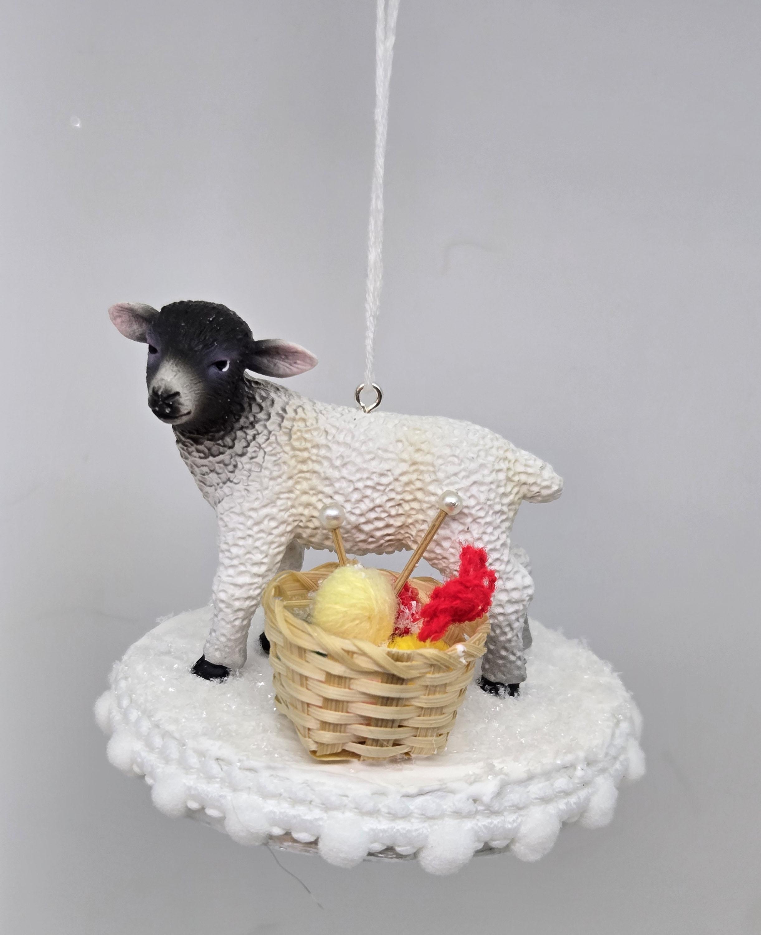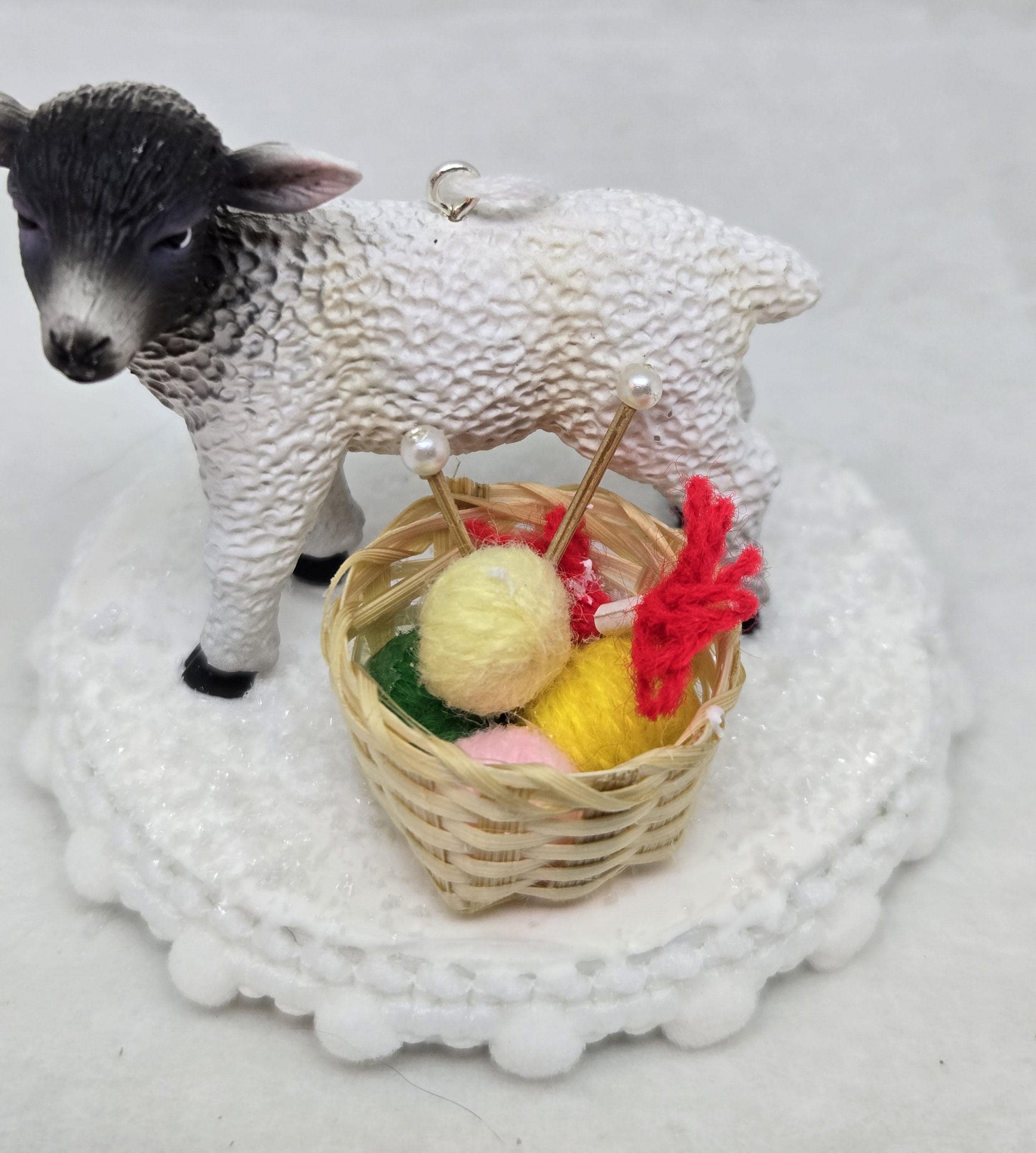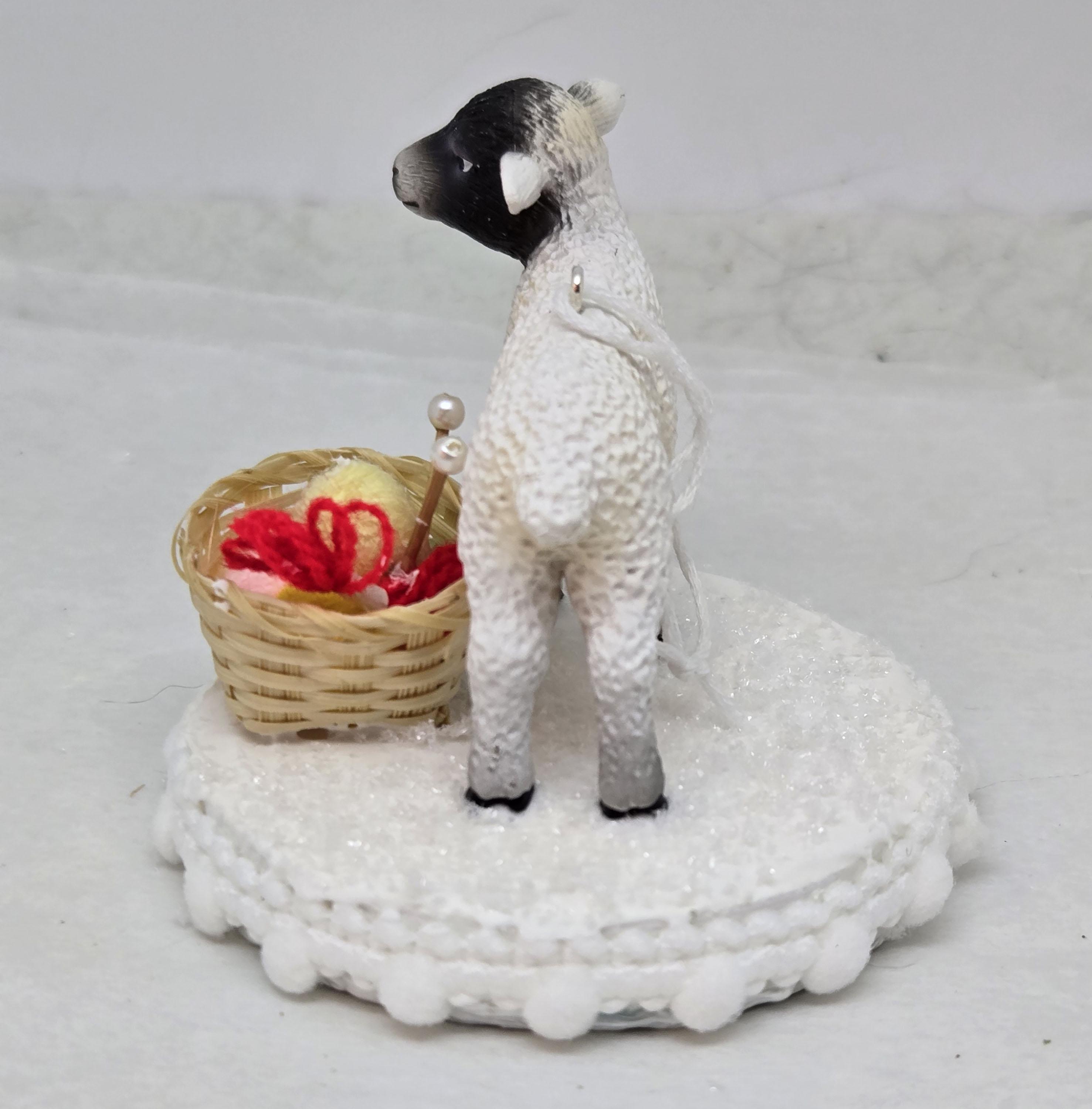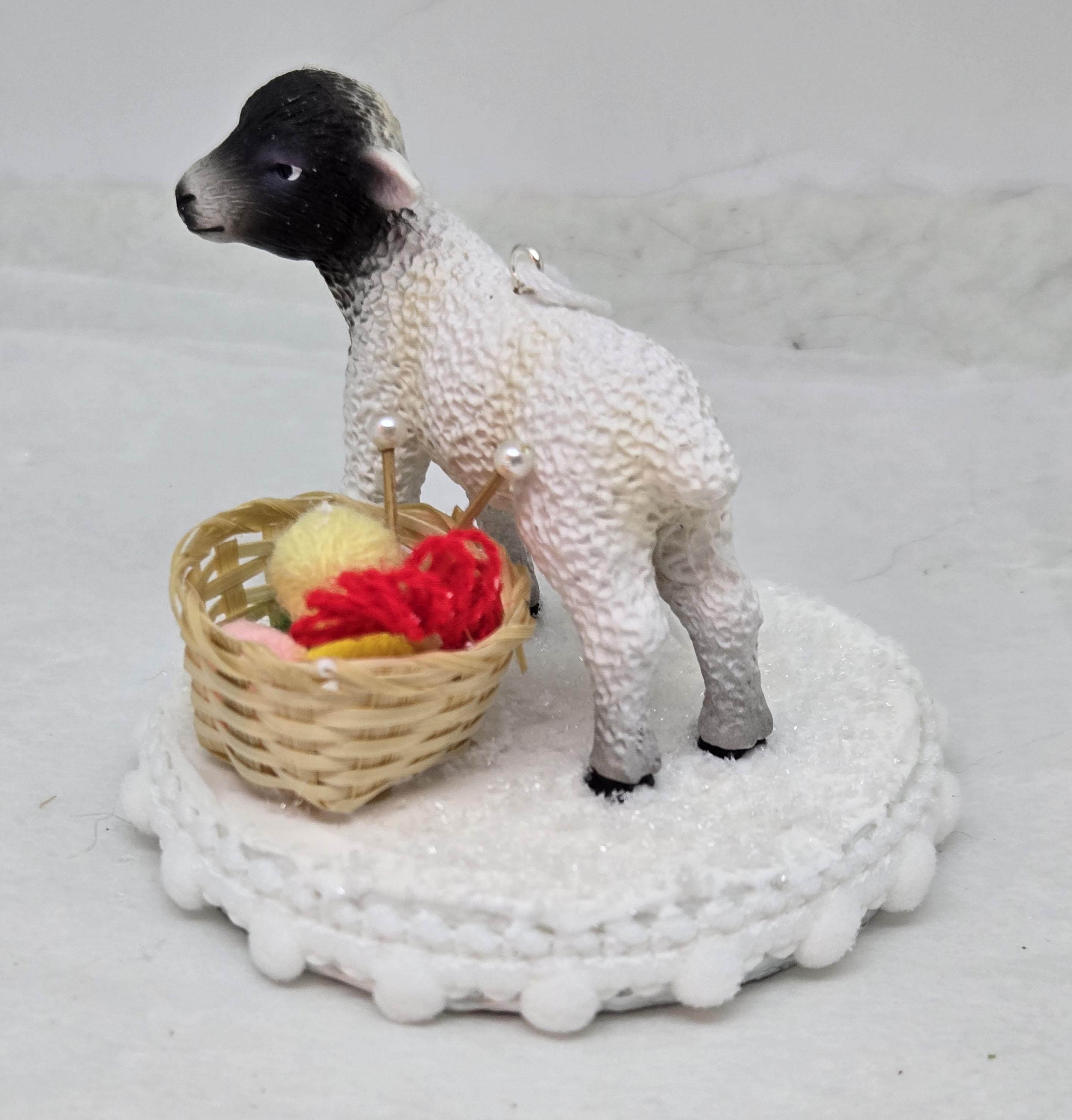 One of a kind, handcrafted Lamb or Knitting Ornament titled: Farm to Knitting Basket. I crafted this cute ornament using a PAPO, realistic lamb toy figurine and a dollhouse miniature basket filled with knitting or crocheting supplies. The base of the ornament is wood. I covered the bottom with scrapbook paper sealed with decoupage. The sides and top were painted. I used decorative trim to cover the sides and artificial snow on the top.