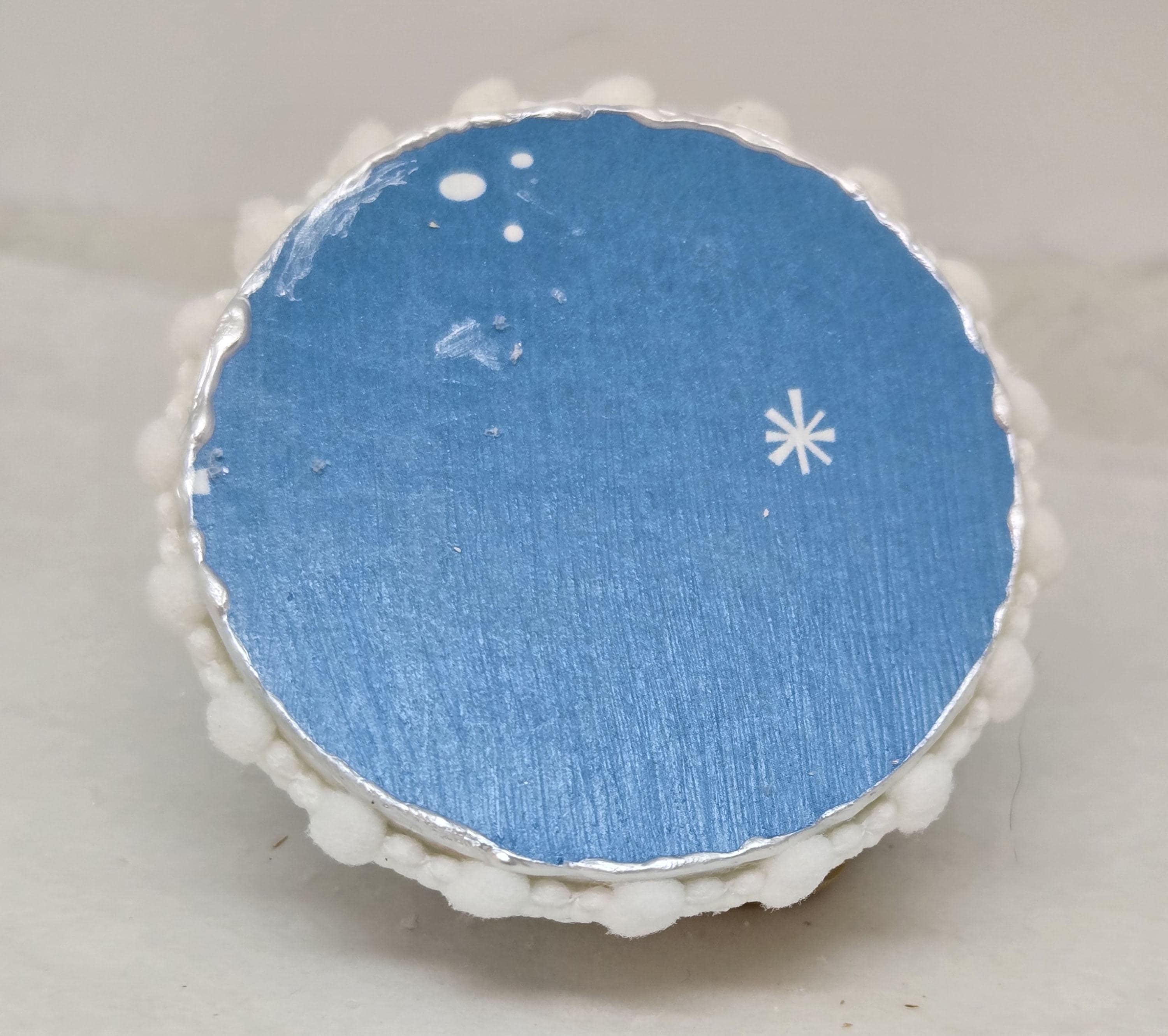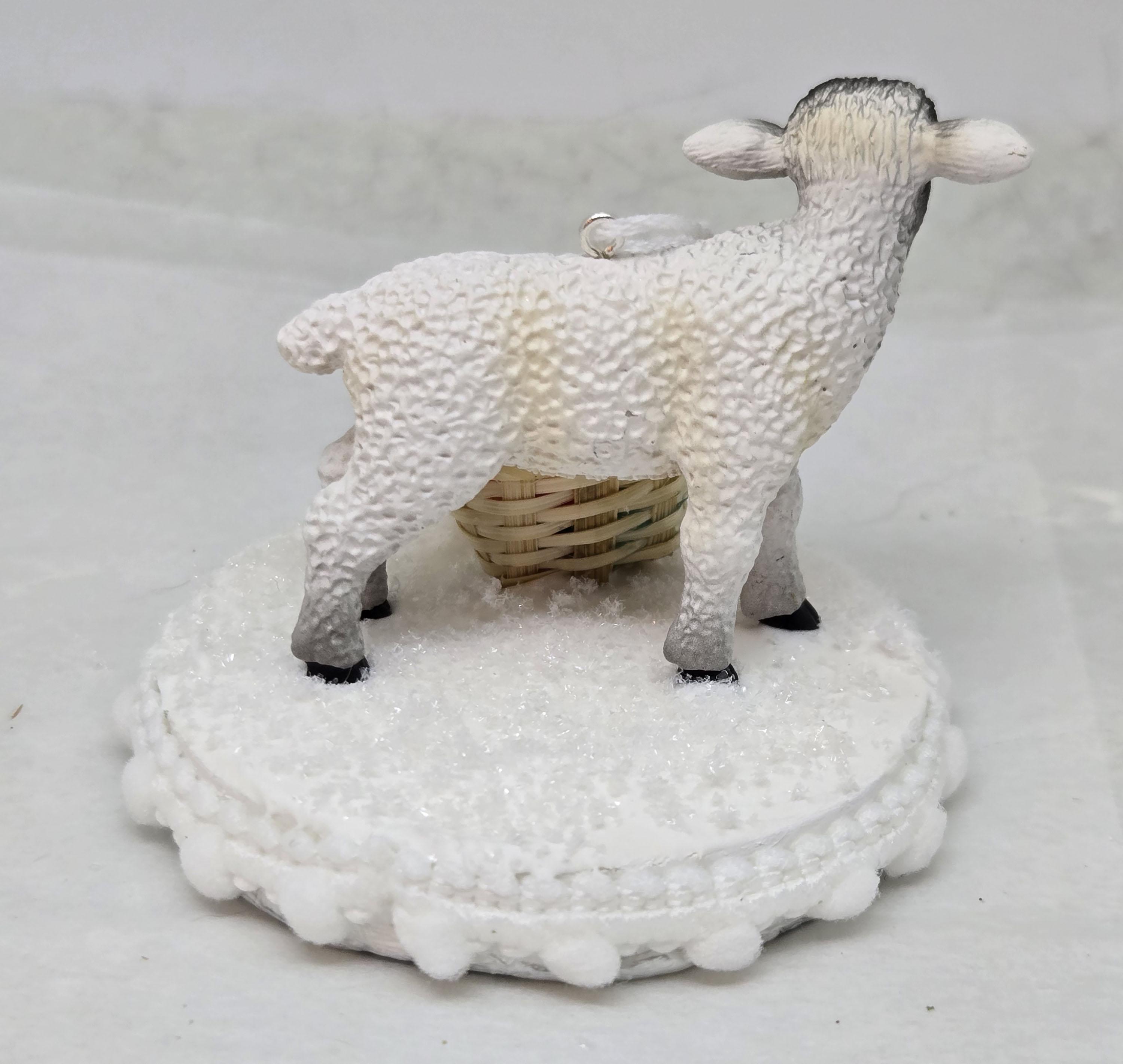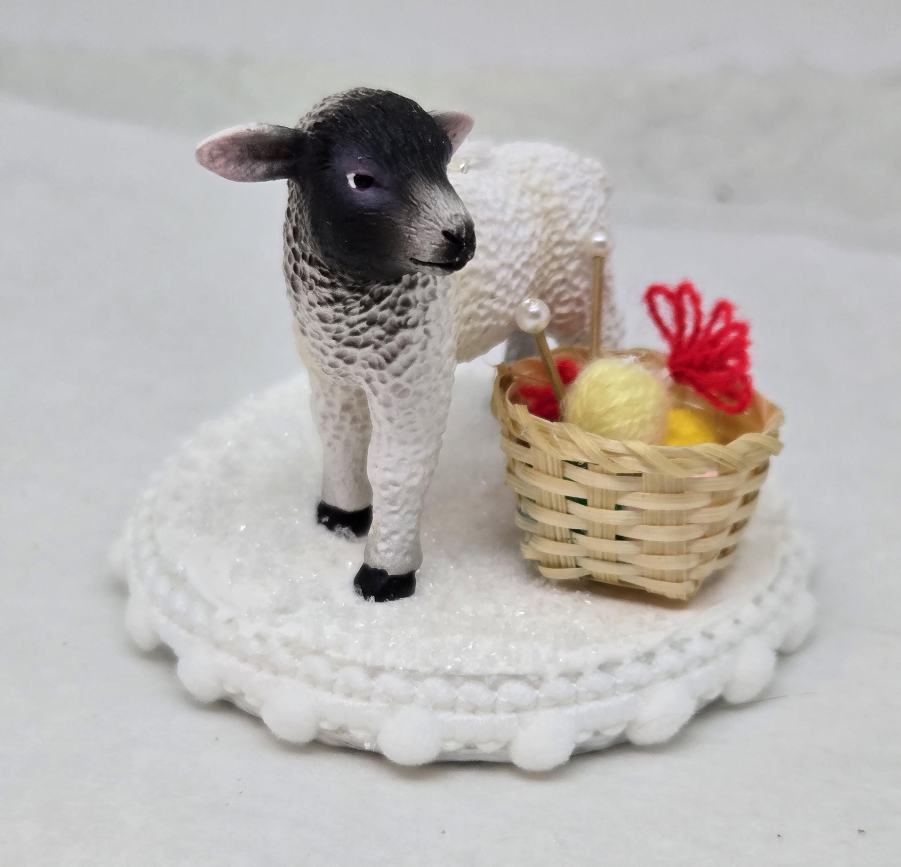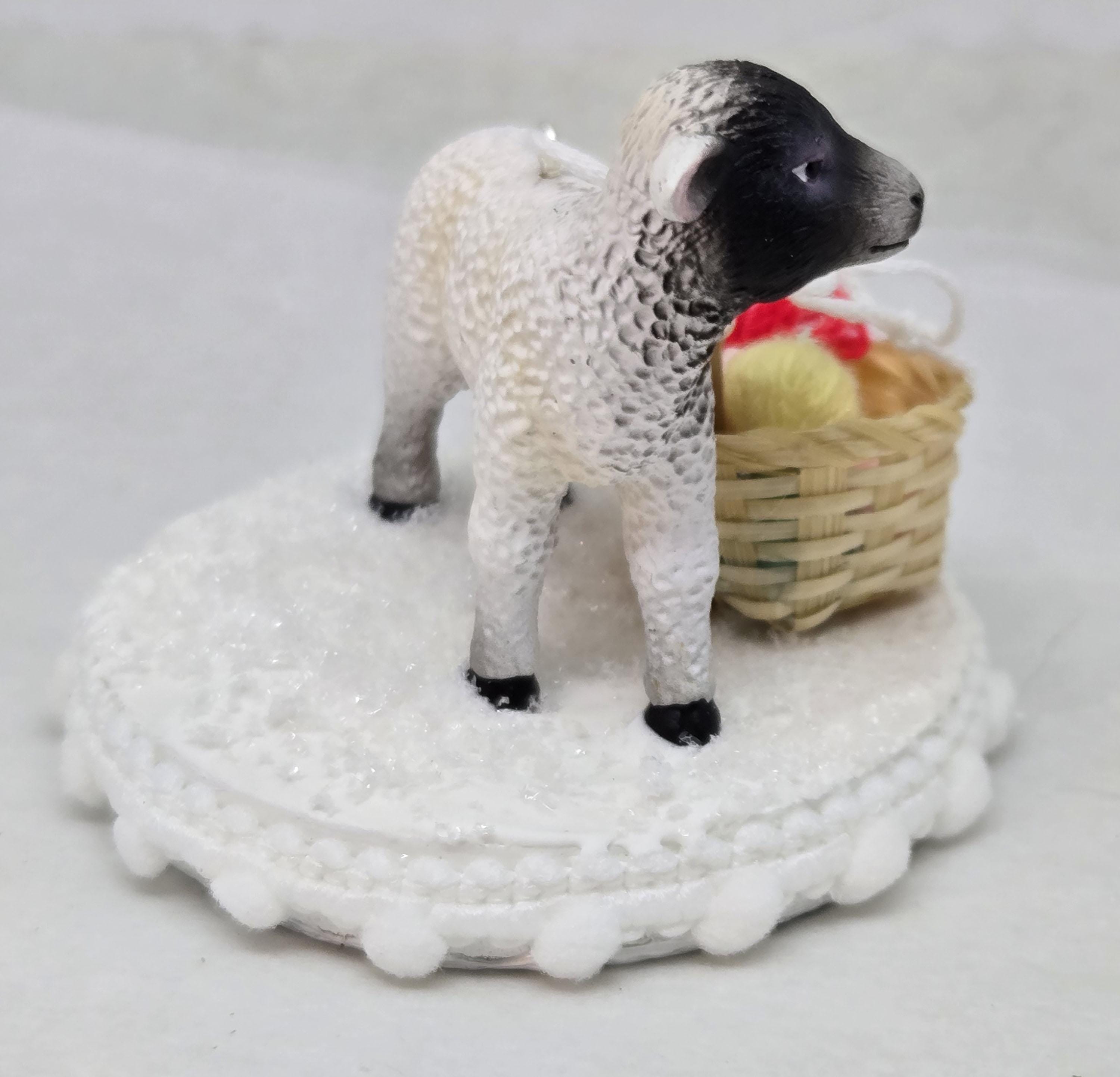 One of a kind, handcrafted Lamb or Knitting Ornament titled: Farm to Knitting Basket. I crafted this cute ornament using a PAPO, realistic lamb toy figurine and a dollhouse miniature basket filled with knitting or crocheting supplies. The base of the ornament is wood. I covered the bottom with scrapbook paper sealed with decoupage. The sides and top were painted. I used decorative trim to cover the sides and artificial snow on the top.