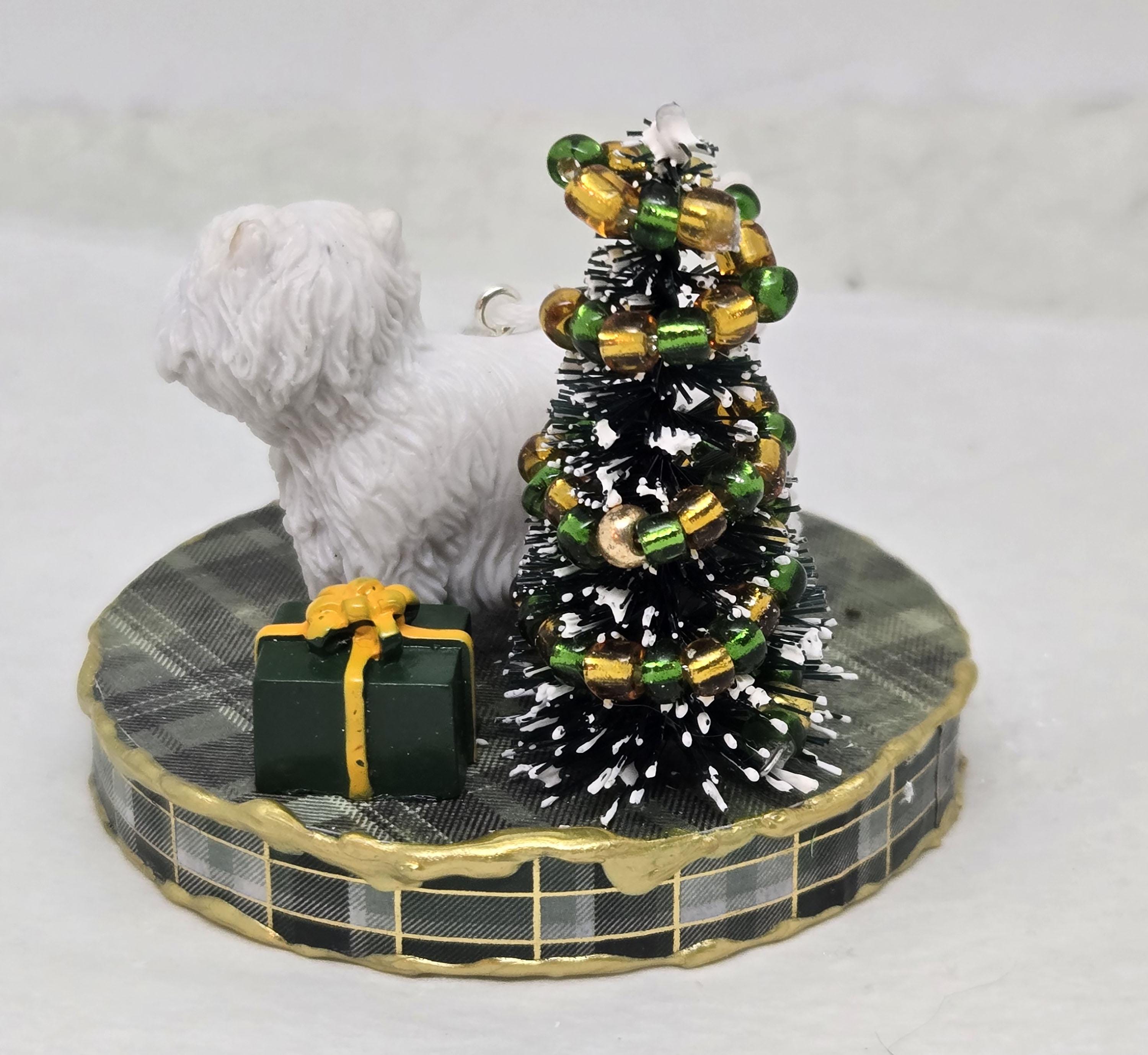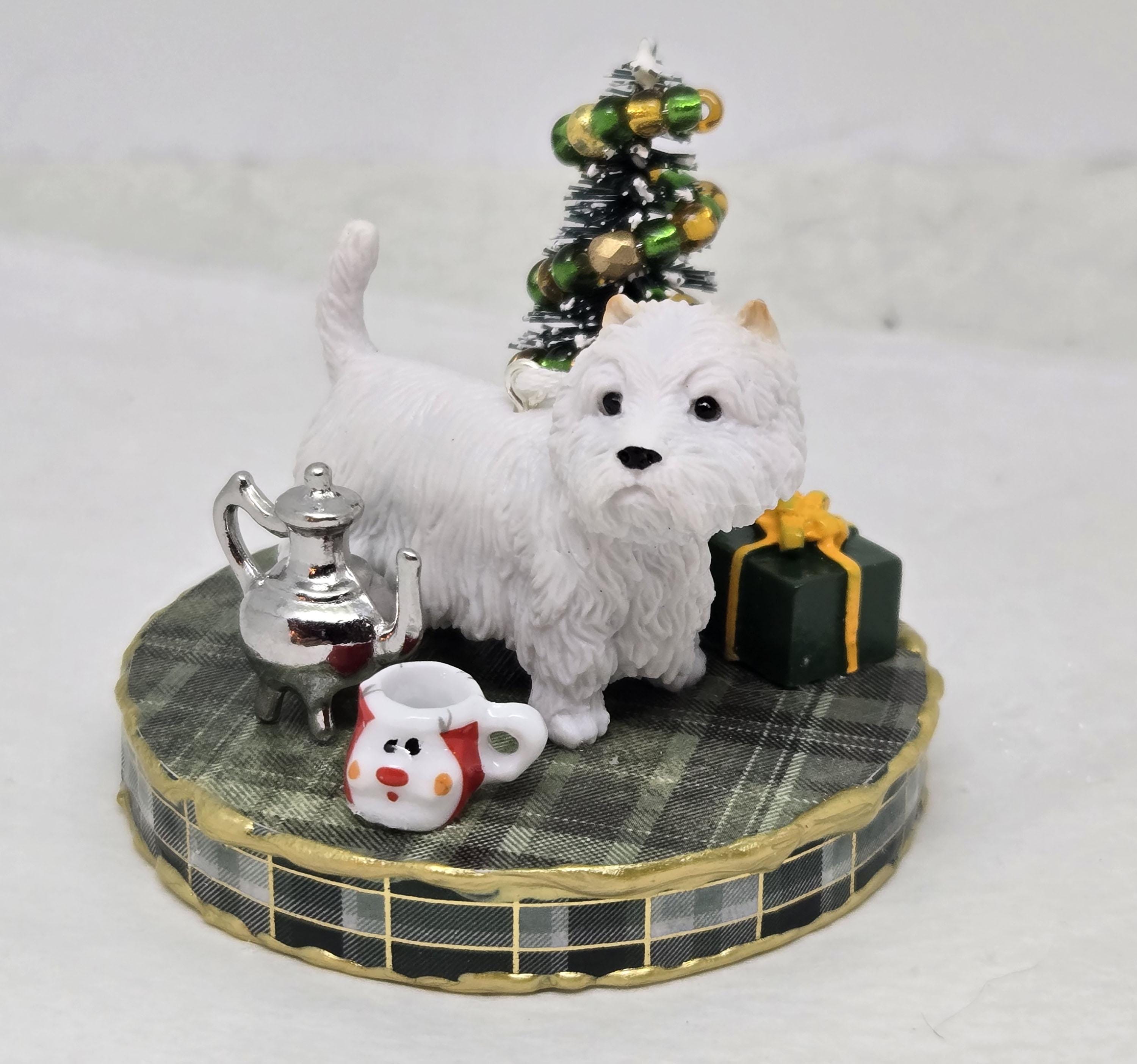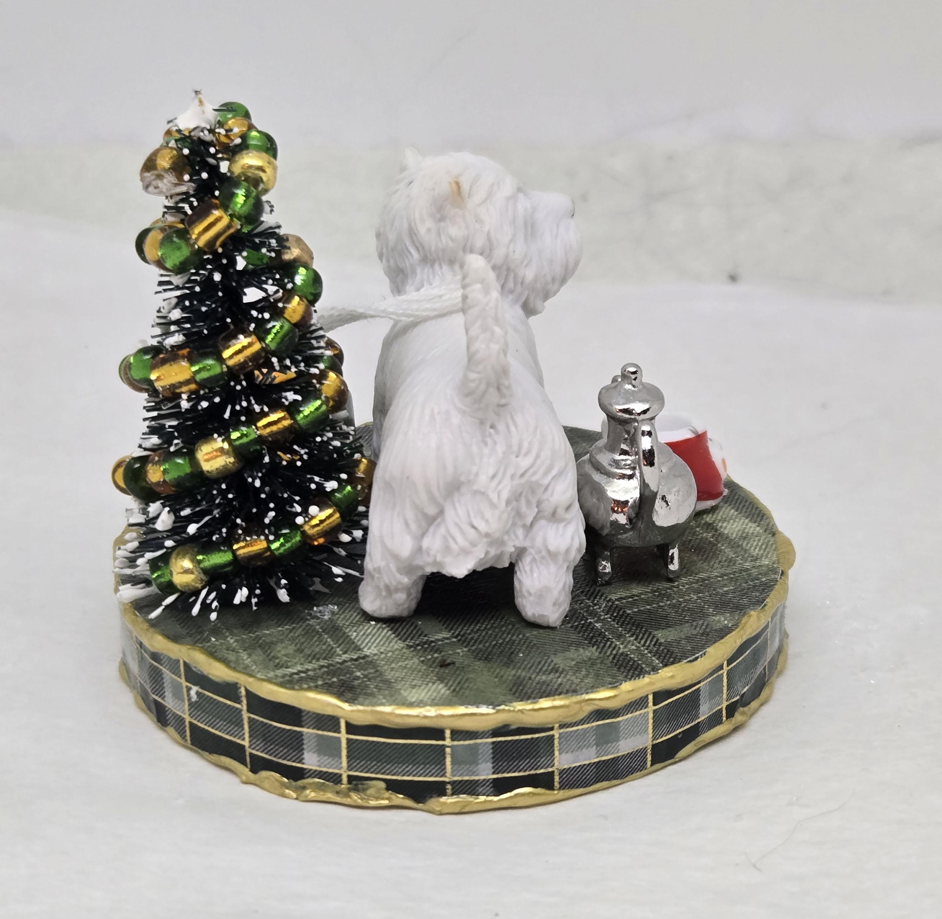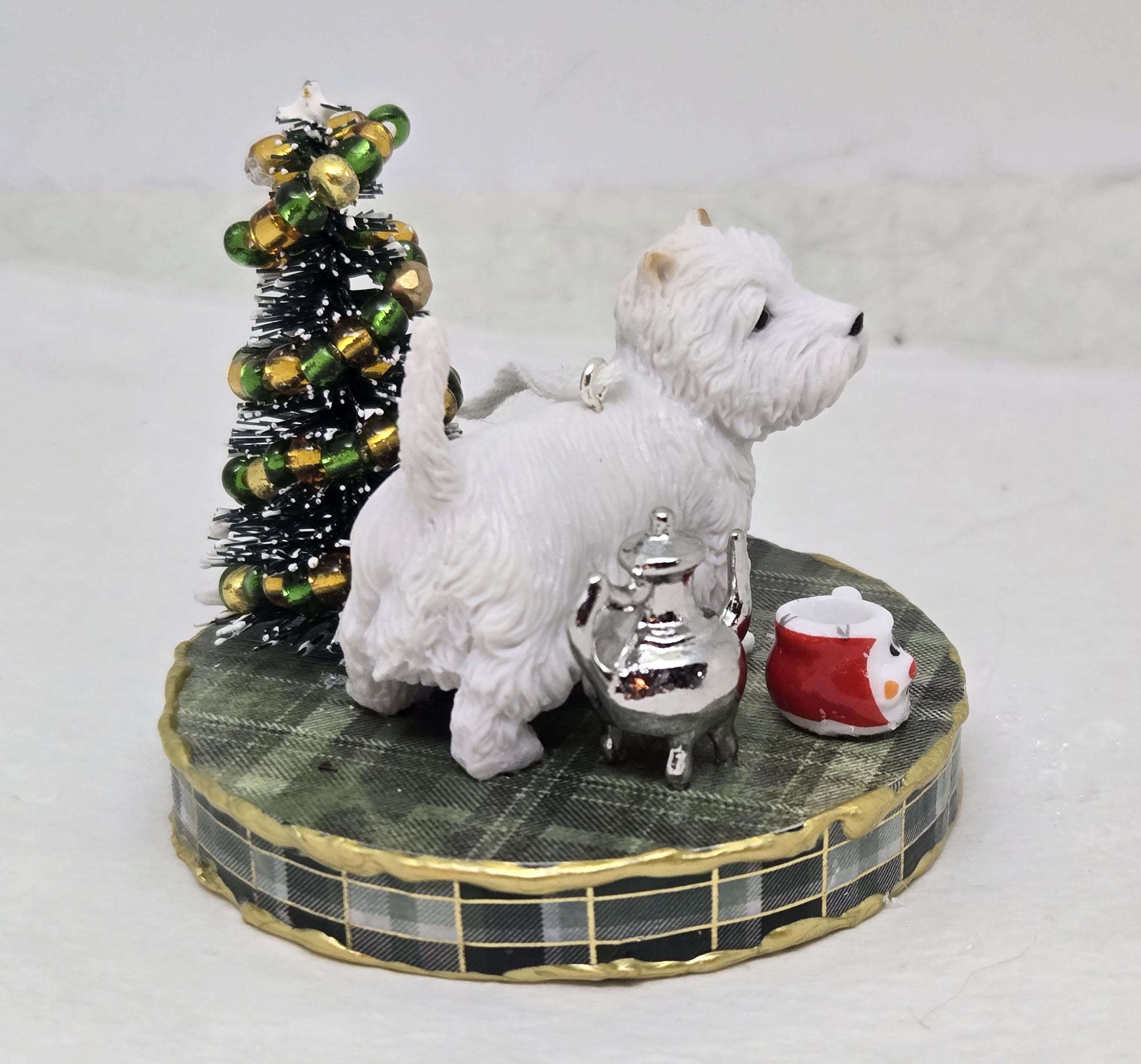 One of a kind, handcrafted West Highland Terrier Christmas Ornament titled: Having a Spot of Tea Beside the Christmas Tree. Westie is a CollectA, realistic toy figurine. The present, teapot and mug are dollhouse miniature accessories. The mini tree is decorated with beads I strung on wire. The base of the ornament is wood. I covered the top and bottom with scrapbook paper. The sides were painted then covered with washi tape. I used Liquid Pearl acrylic paint around the edges. The entire base was sealed with decoupage.