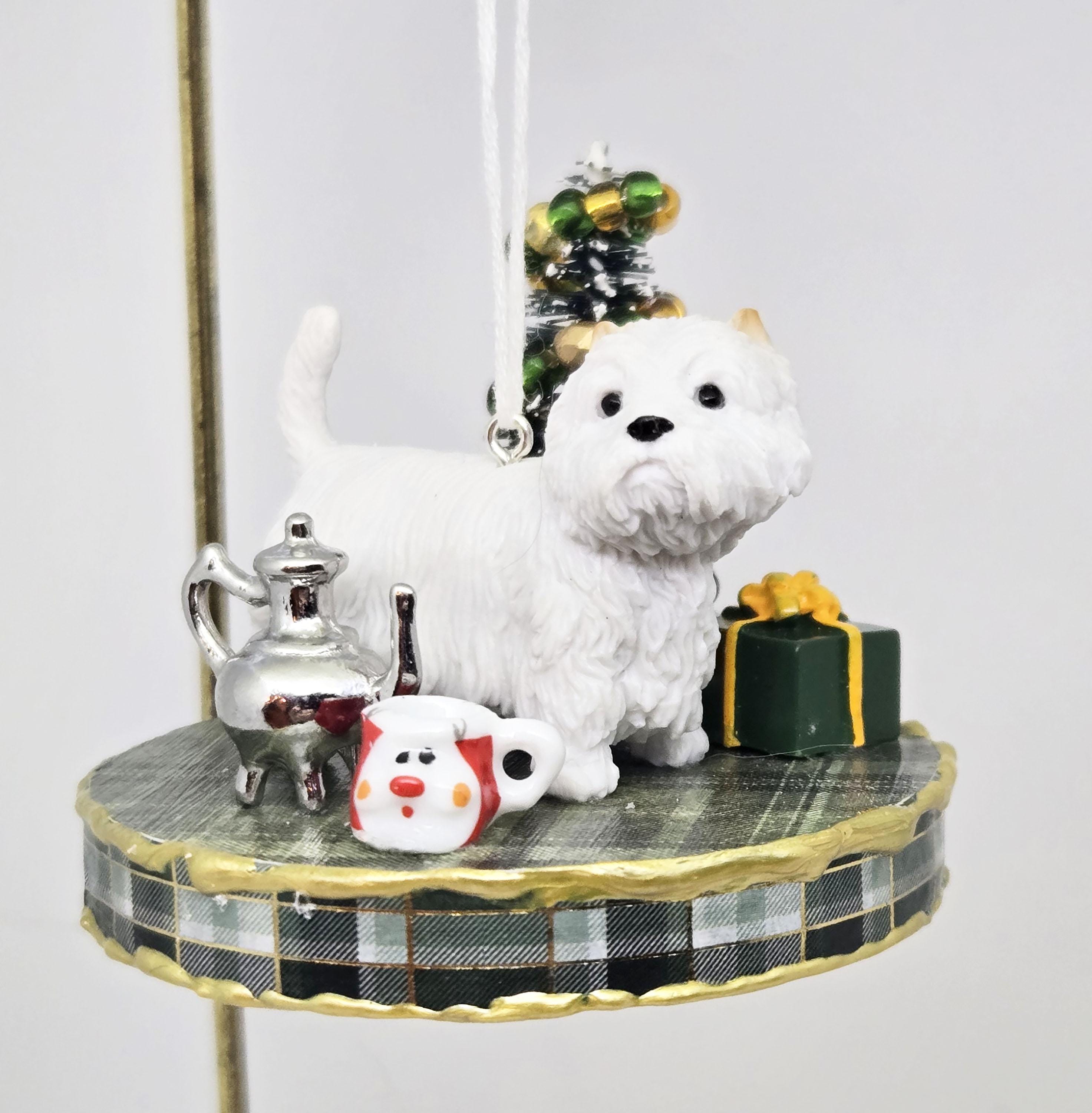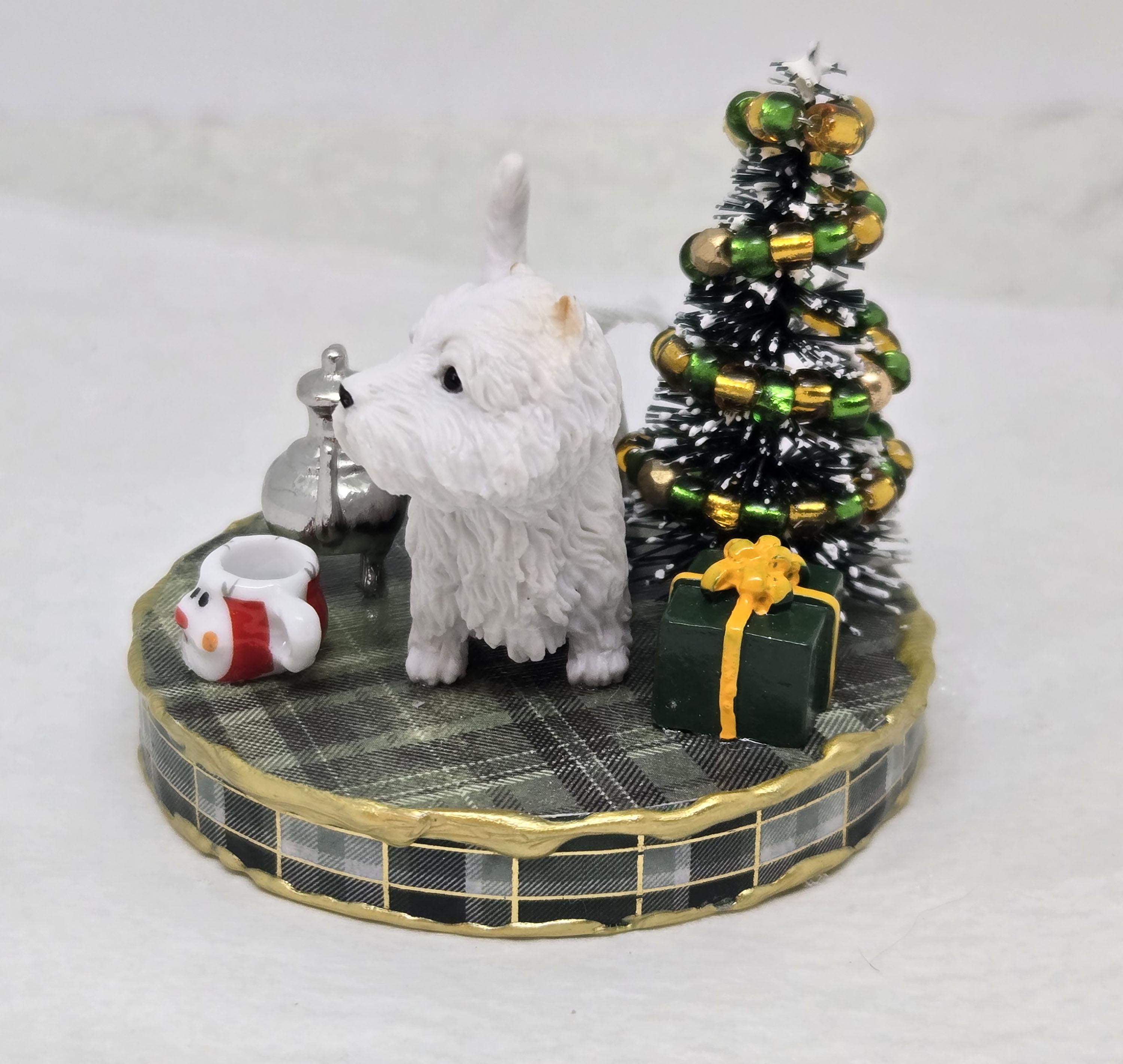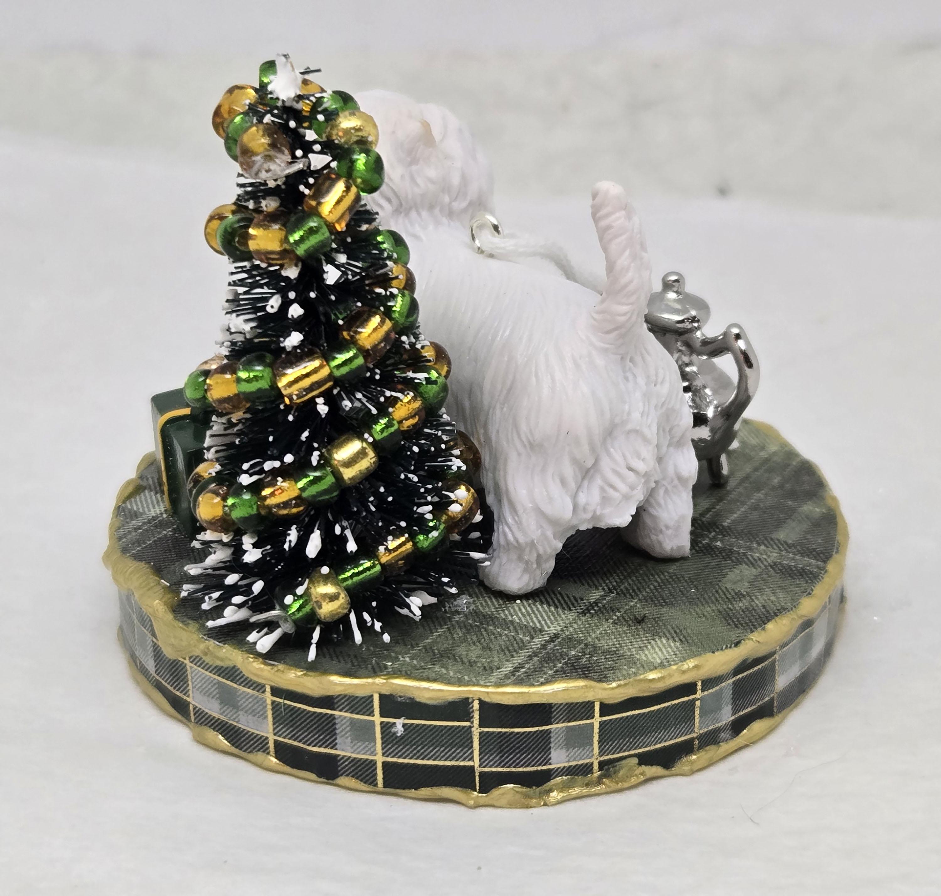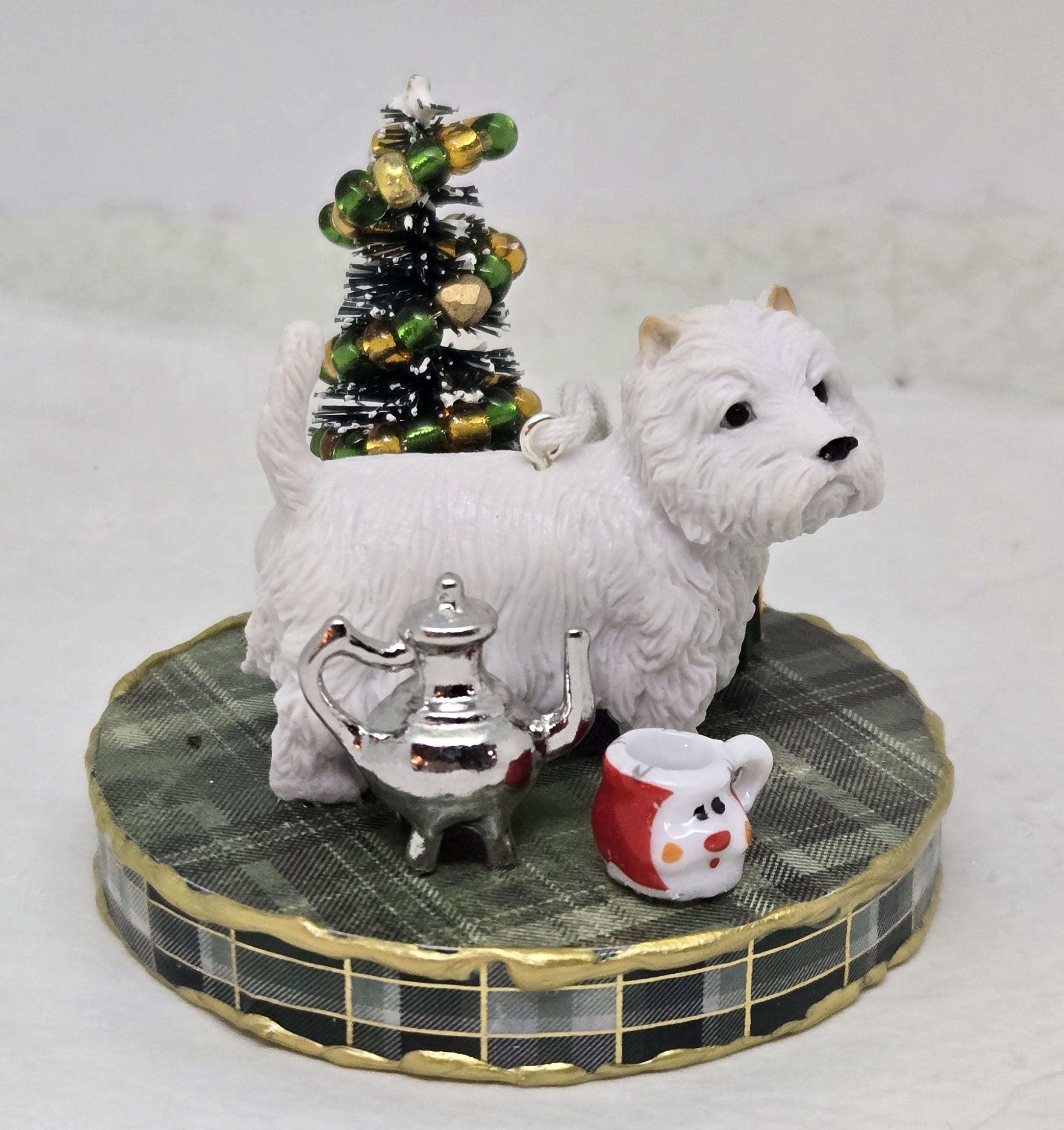 One of a kind, handcrafted West Highland Terrier Christmas Ornament titled: Having a Spot of Tea Beside the Christmas Tree. Westie is a CollectA, realistic toy figurine. The present, teapot and mug are dollhouse miniature accessories. The mini tree is decorated with beads I strung on wire. The base of the ornament is wood. I covered the top and bottom with scrapbook paper. The sides were painted then covered with washi tape. I used Liquid Pearl acrylic paint around the edges. The entire base was sealed with decoupage.