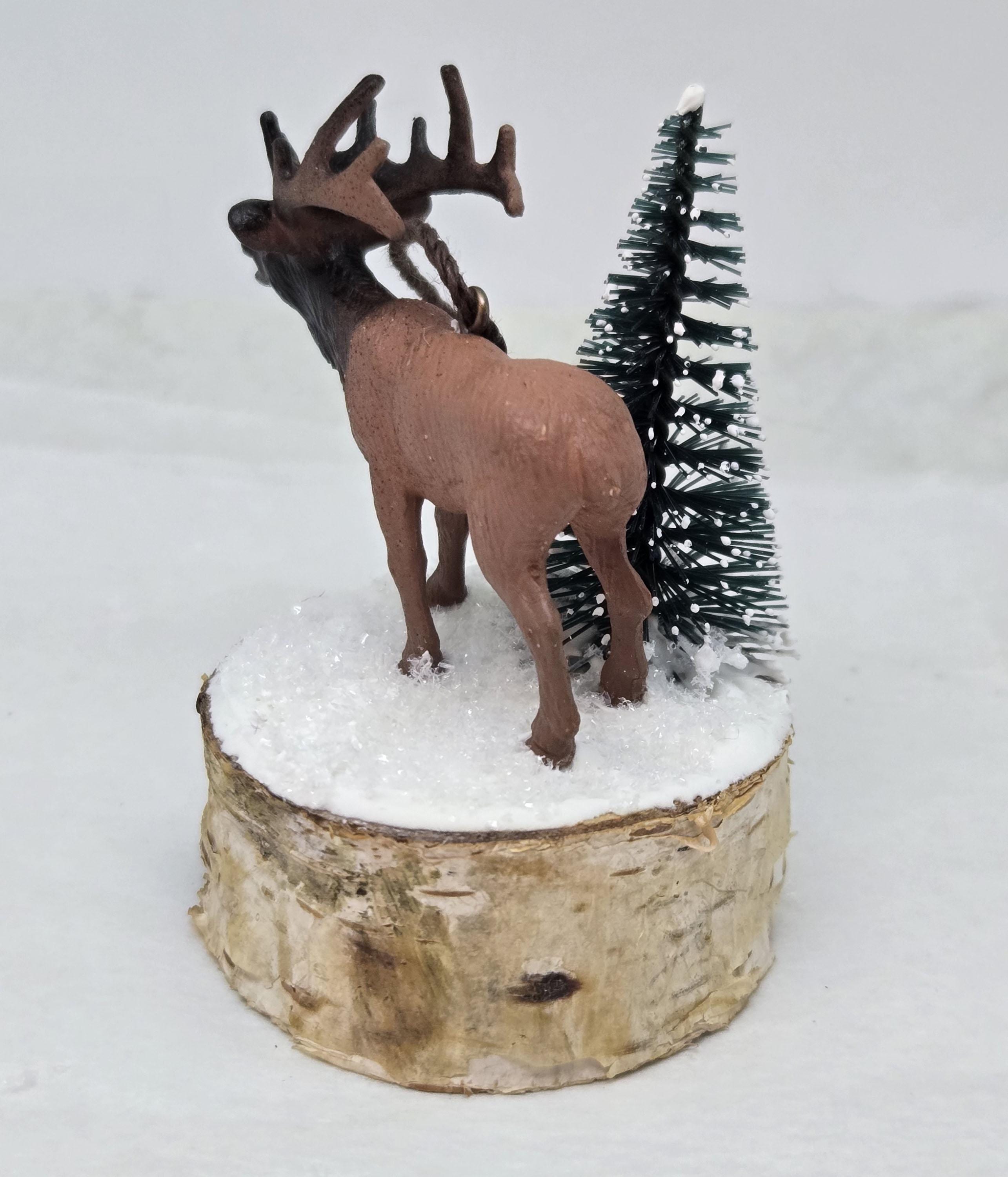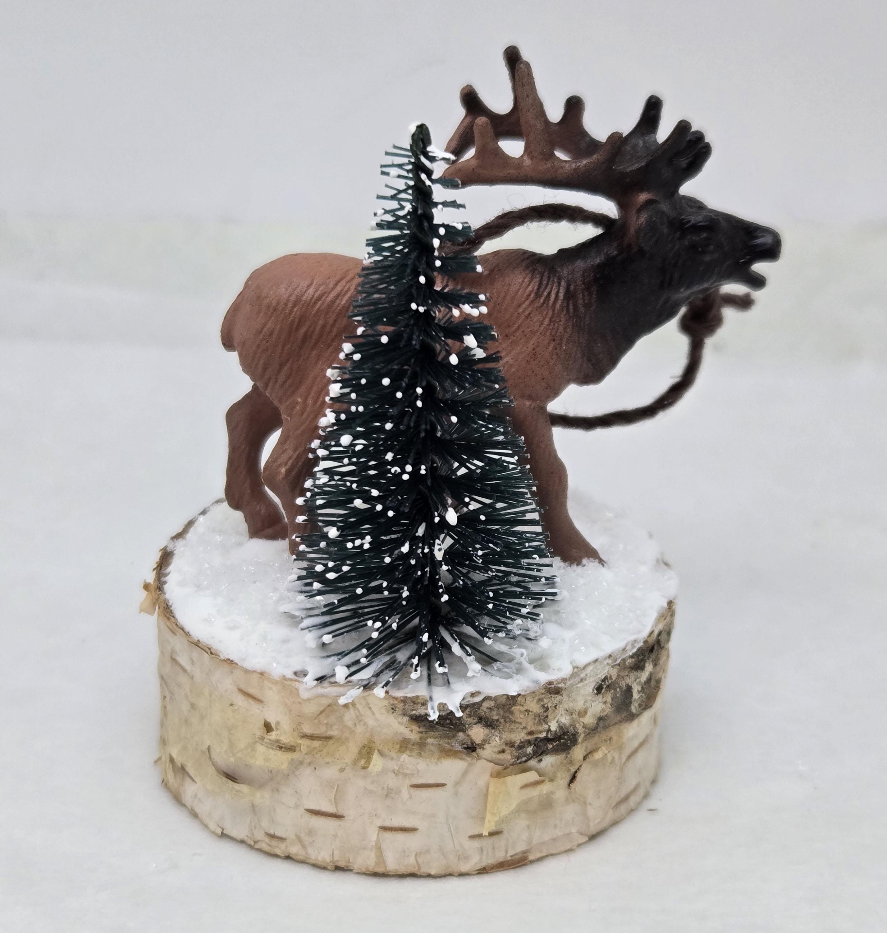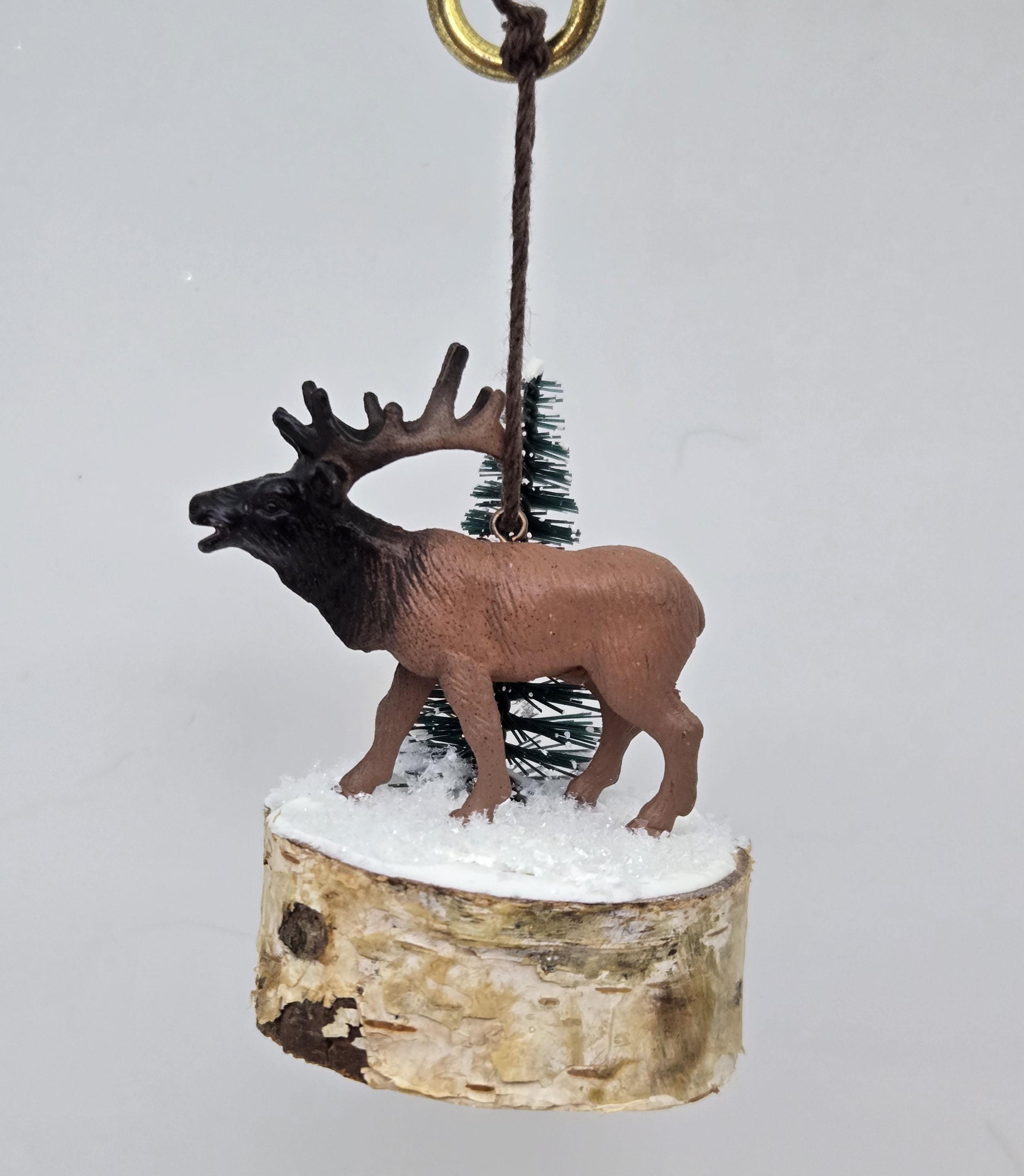 One of a kind, handcrafted Elk Ornament titled: Bull Elk Bugles in a Snowy Forest. The miniature Bull Elk is a toy figurine. The base is a slice of birch limb. I sealed the top, painted it and covered it with artificial snow.