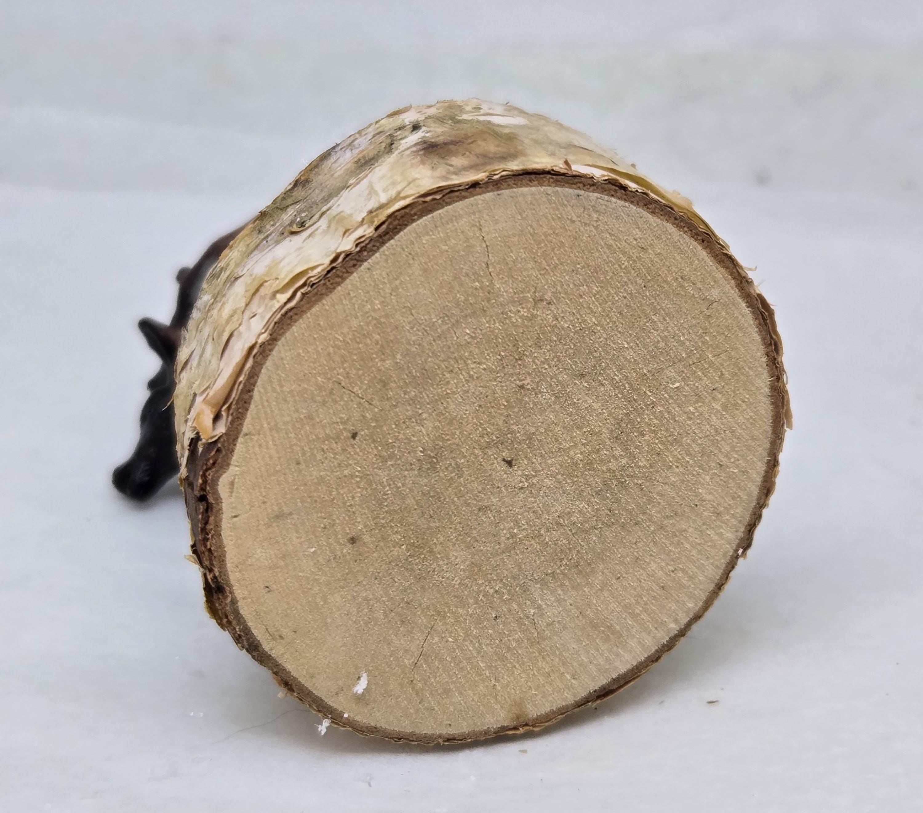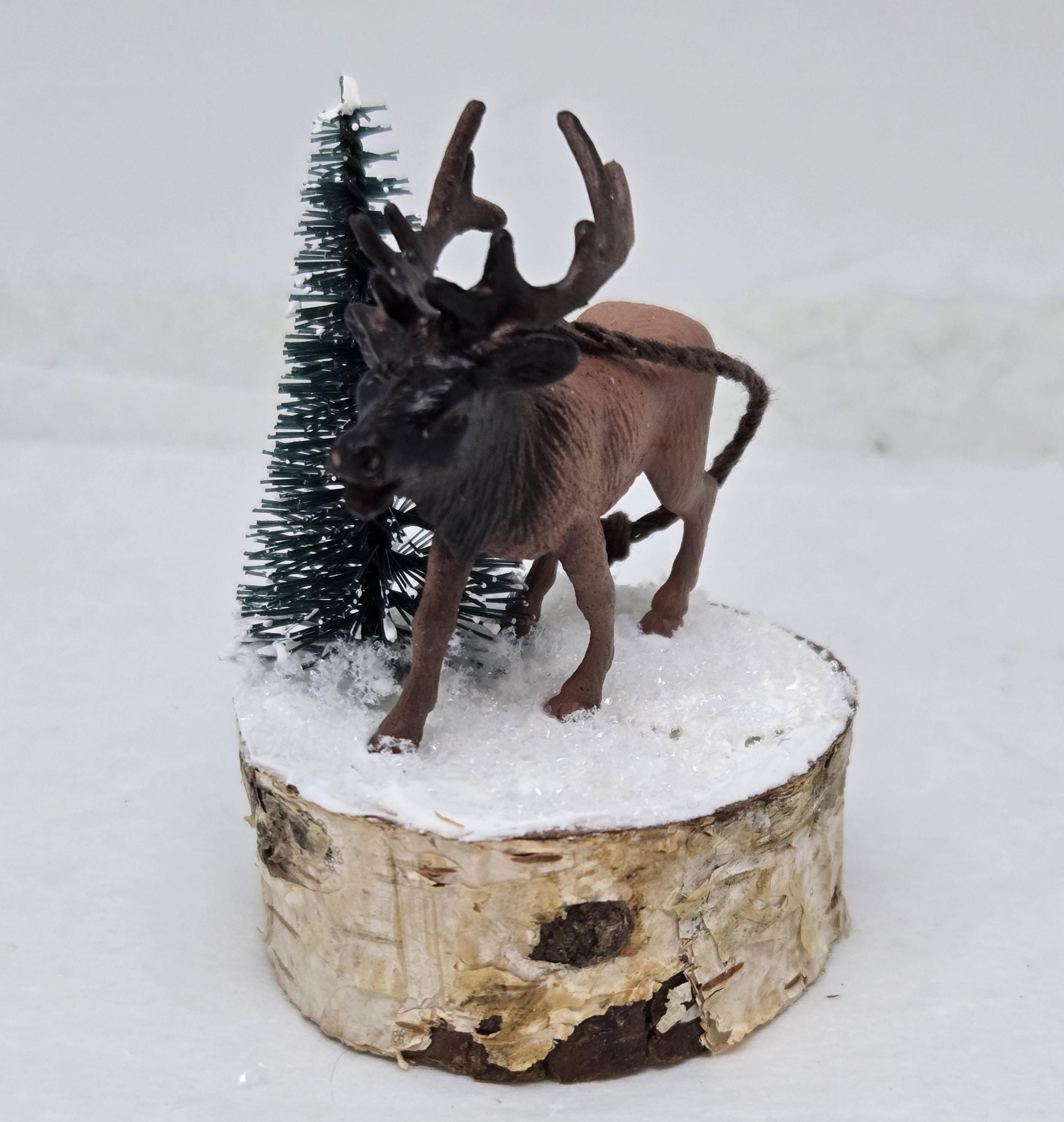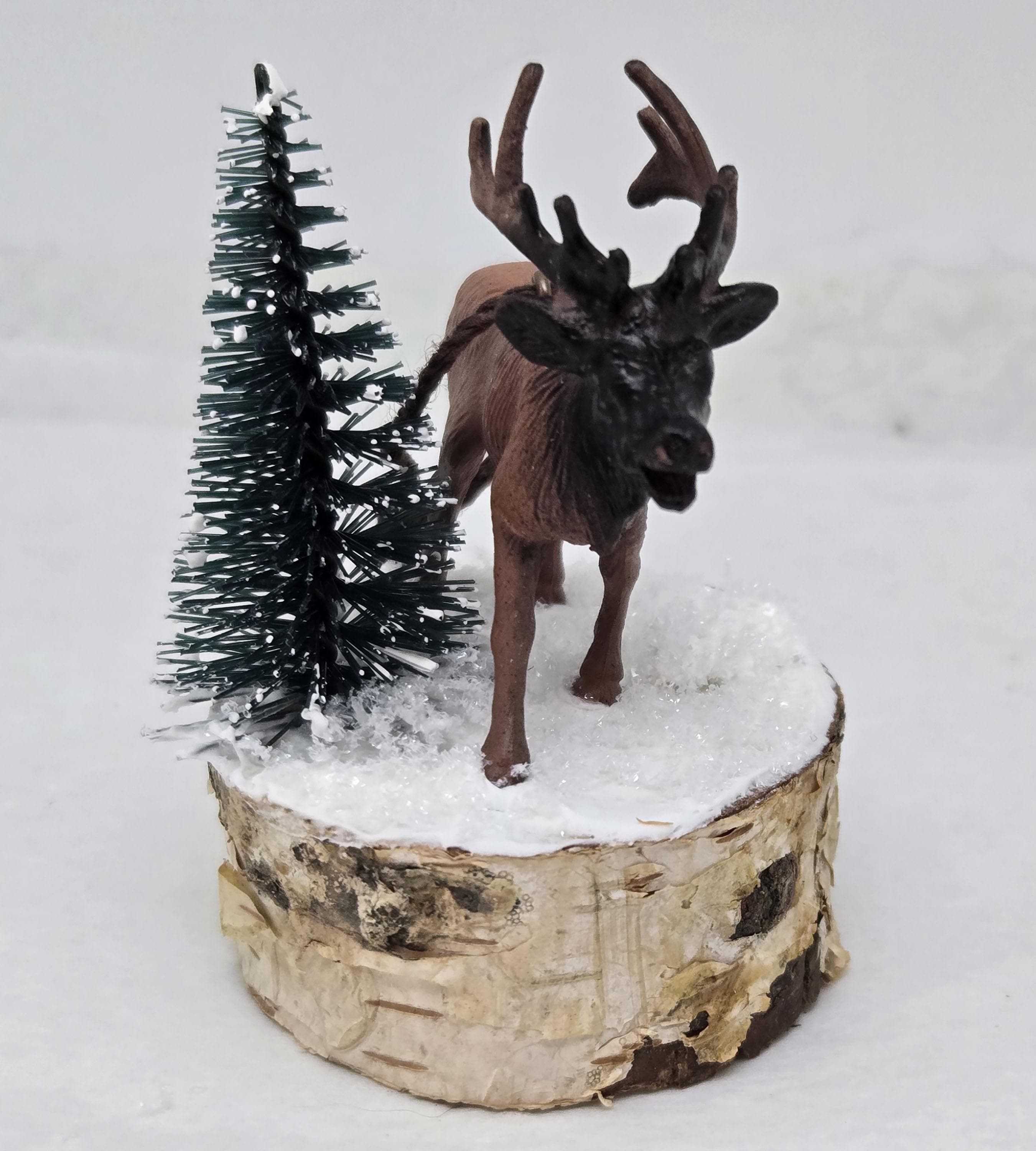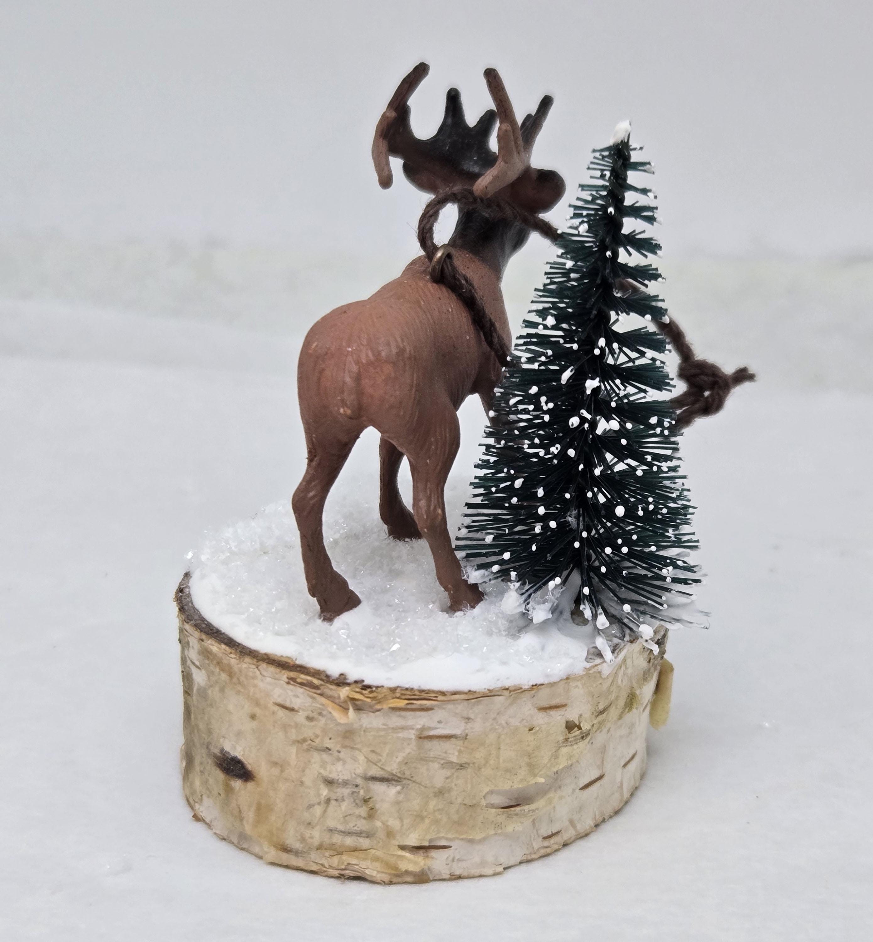 One of a kind, handcrafted Elk Ornament titled: Bull Elk Bugles in a Snowy Forest. The miniature Bull Elk is a toy figurine. The base is a slice of birch limb. I sealed the top, painted it and covered it with artificial snow.
