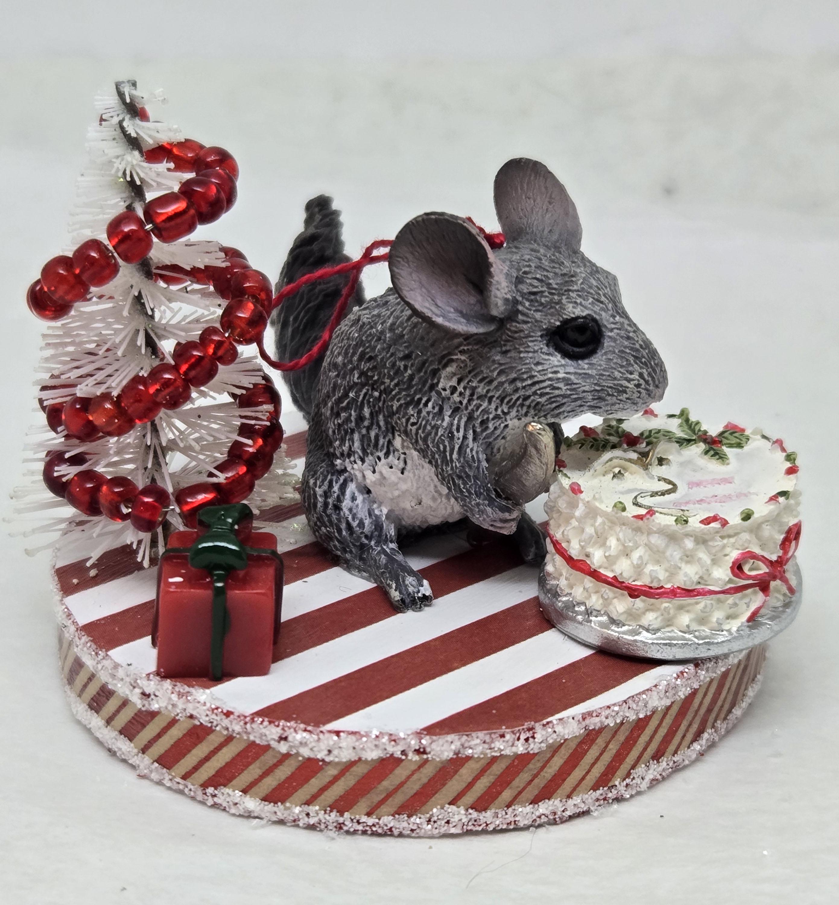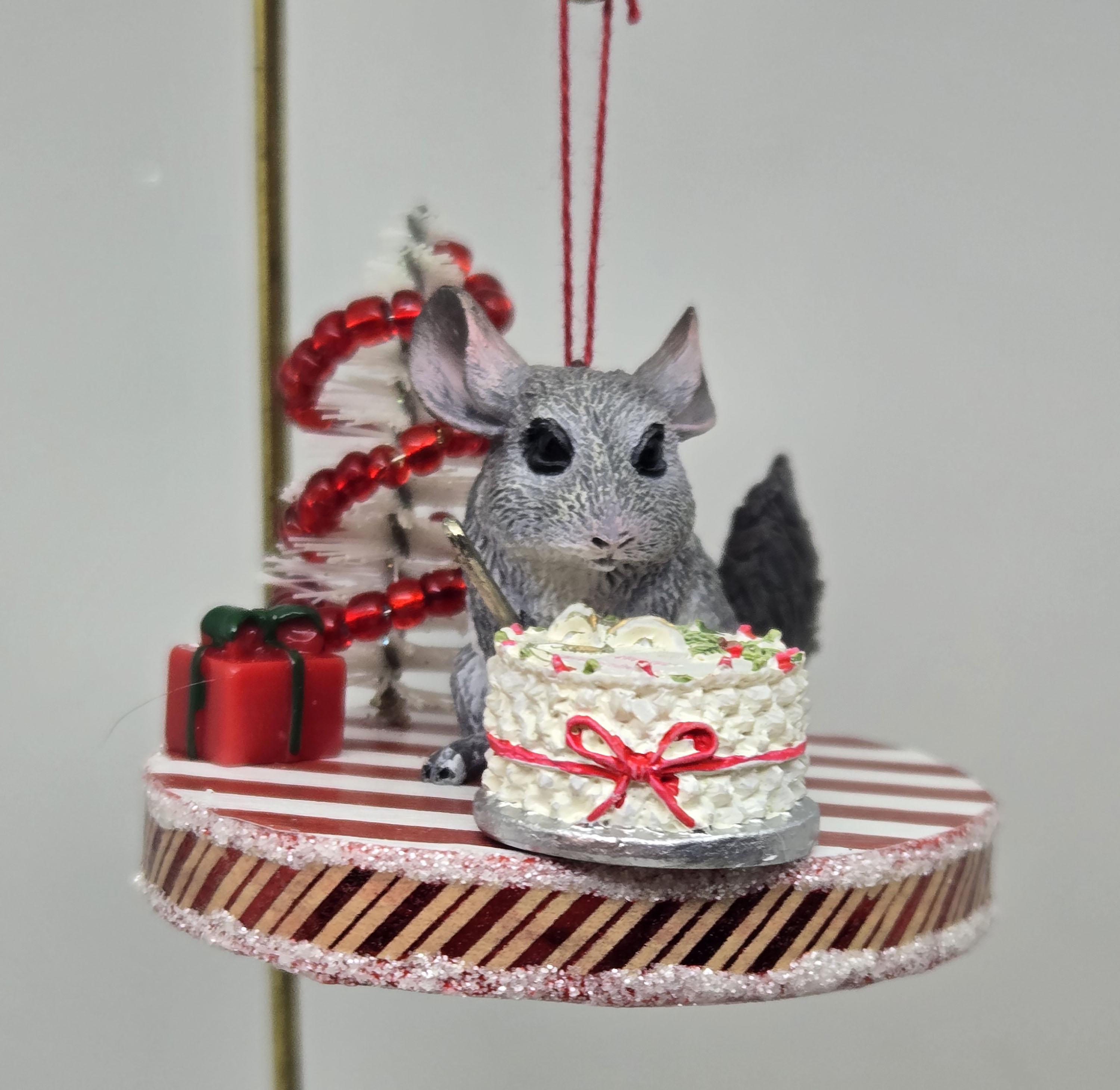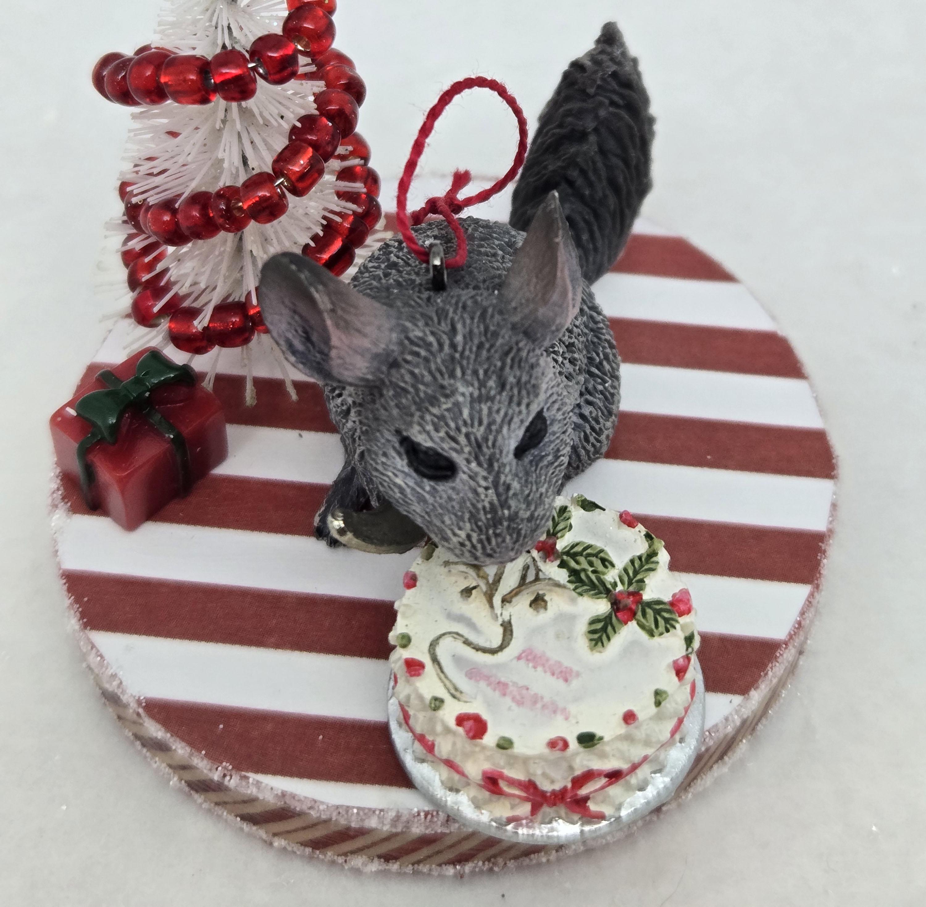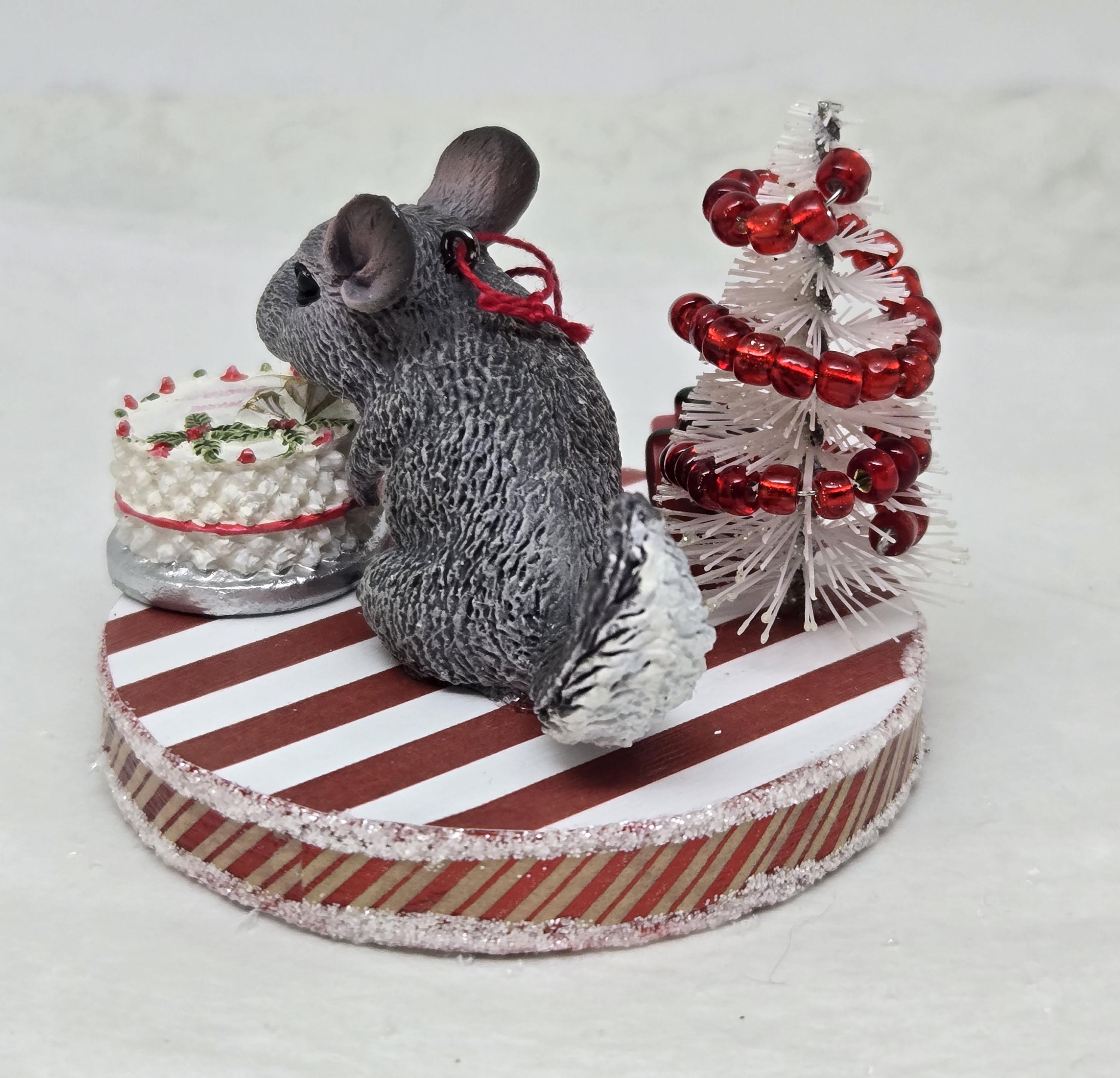 One of a kind, handcrafted Chinchilla Christmas Ornament. Chili is ready to cut the Christmas Cake she spent the day baking and decorating. Chili is a CollectA, realistic toy figurine. The cake, knife she's holding and present are dollhouse miniature accessories. The tree is decorated with beads I strung on wire. The base of the ornament is wood. I covered the top and bottom with scrapbook paper. The sides were painted then covered with washi tape and glitter glue. The entire base was sealed with decoupage.
