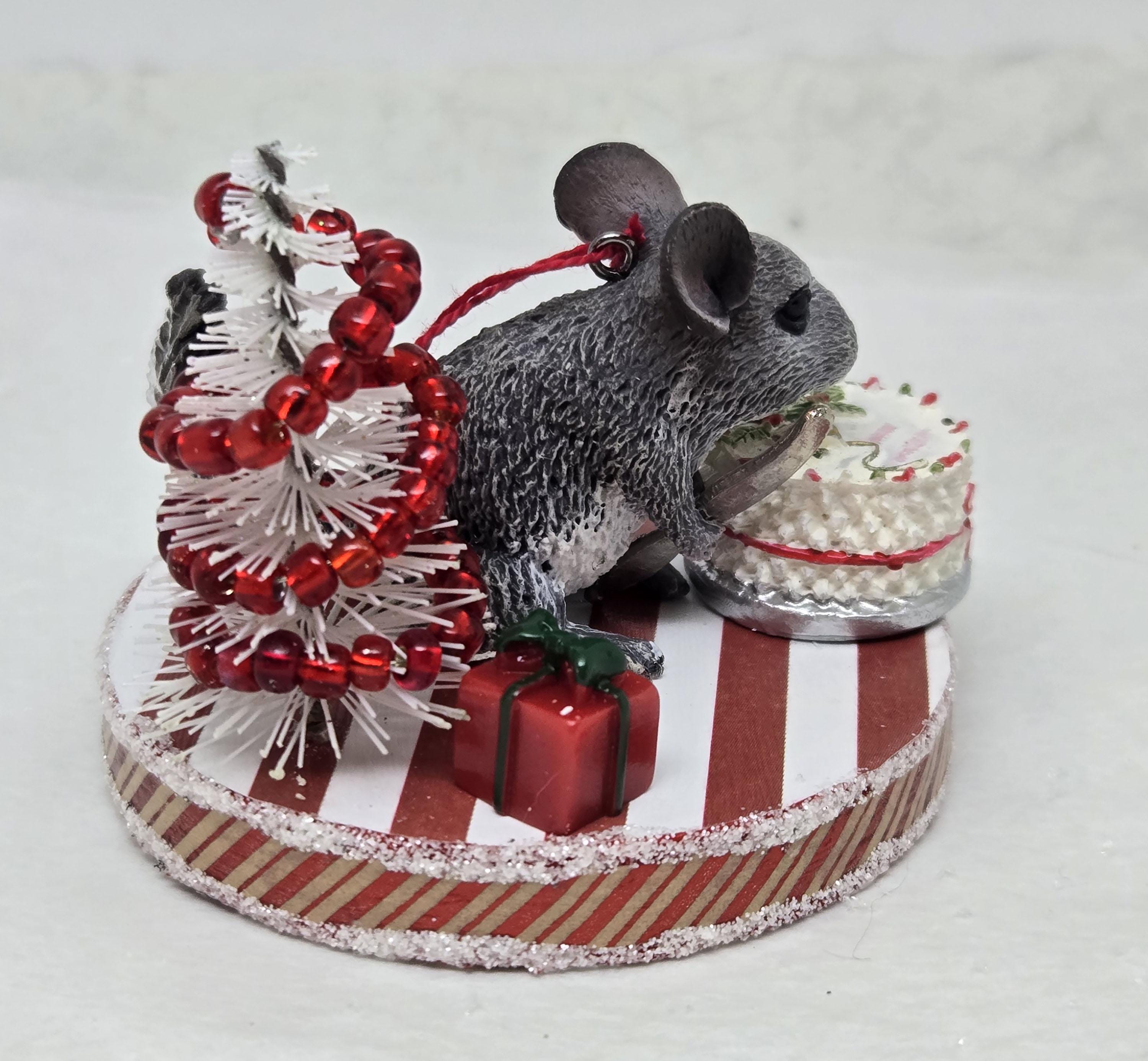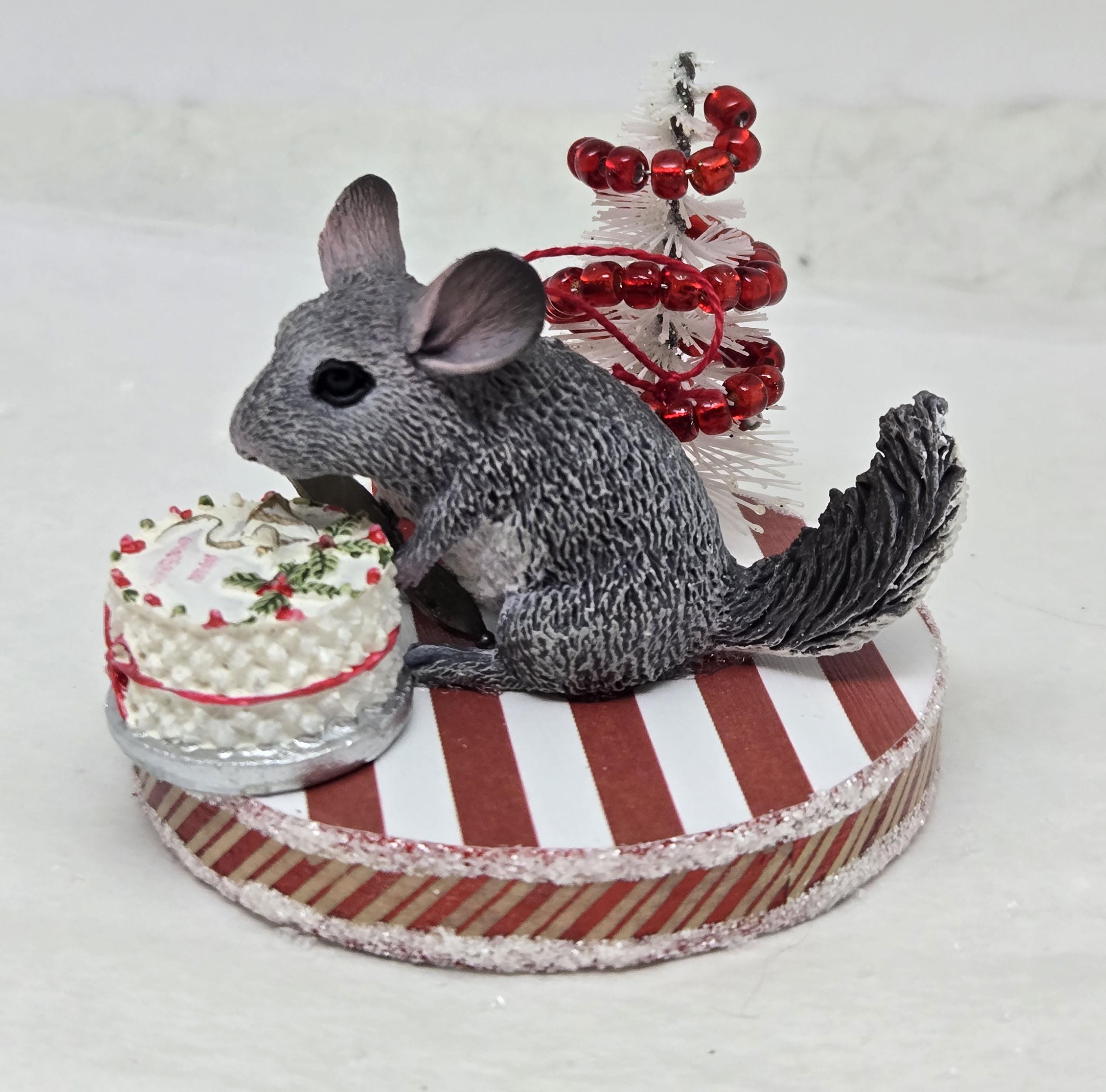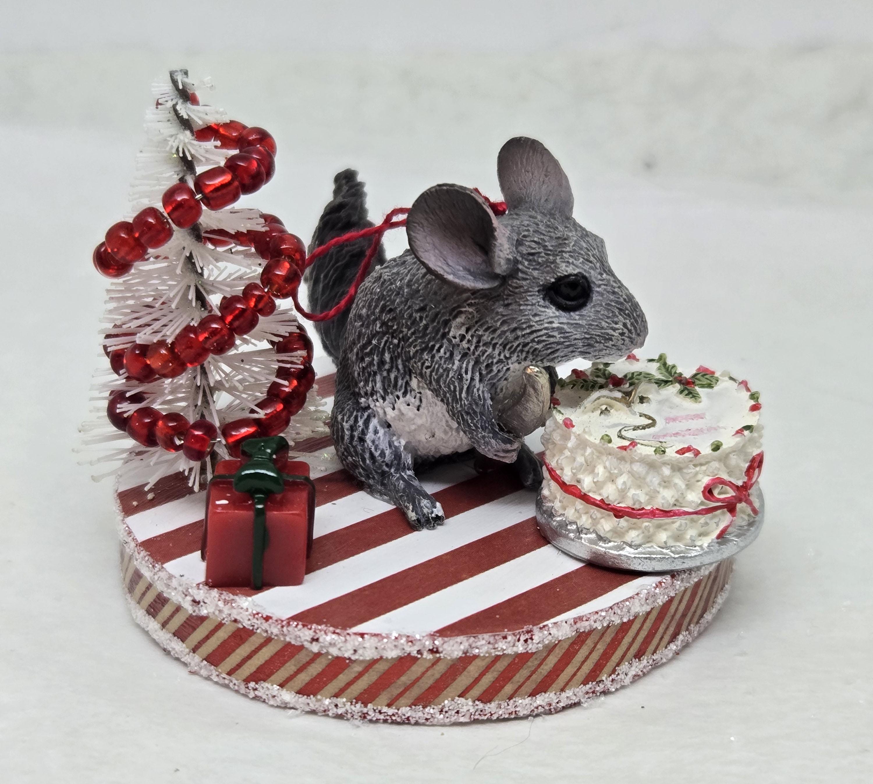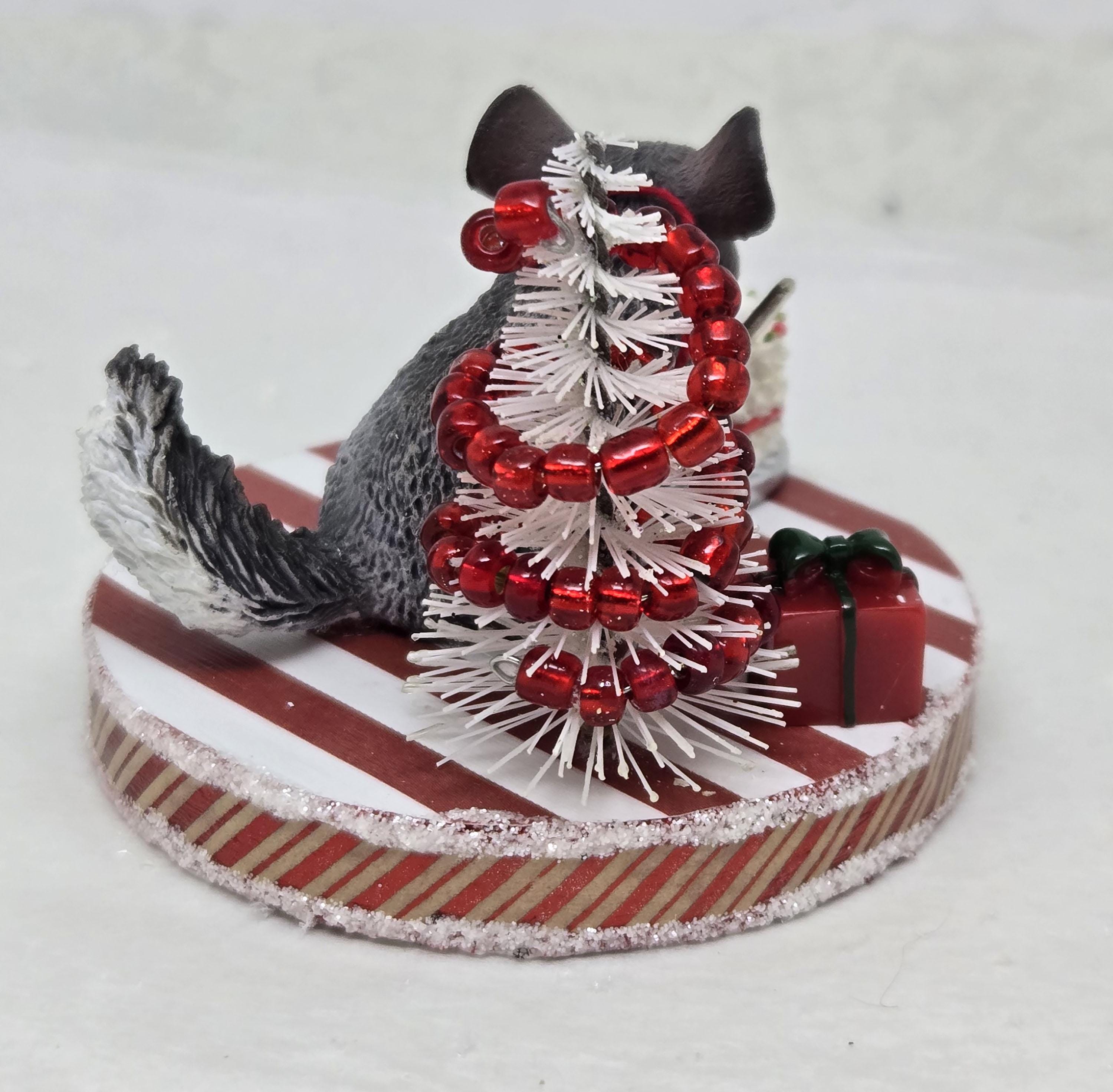 One of a kind, handcrafted Chinchilla Christmas Ornament. Chili is ready to cut the Christmas Cake she spent the day baking and decorating. Chili is a CollectA, realistic toy figurine. The cake, knife she's holding and present are dollhouse miniature accessories. The tree is decorated with beads I strung on wire. The base of the ornament is wood. I covered the top and bottom with scrapbook paper. The sides were painted then covered with washi tape and glitter glue. The entire base was sealed with decoupage.