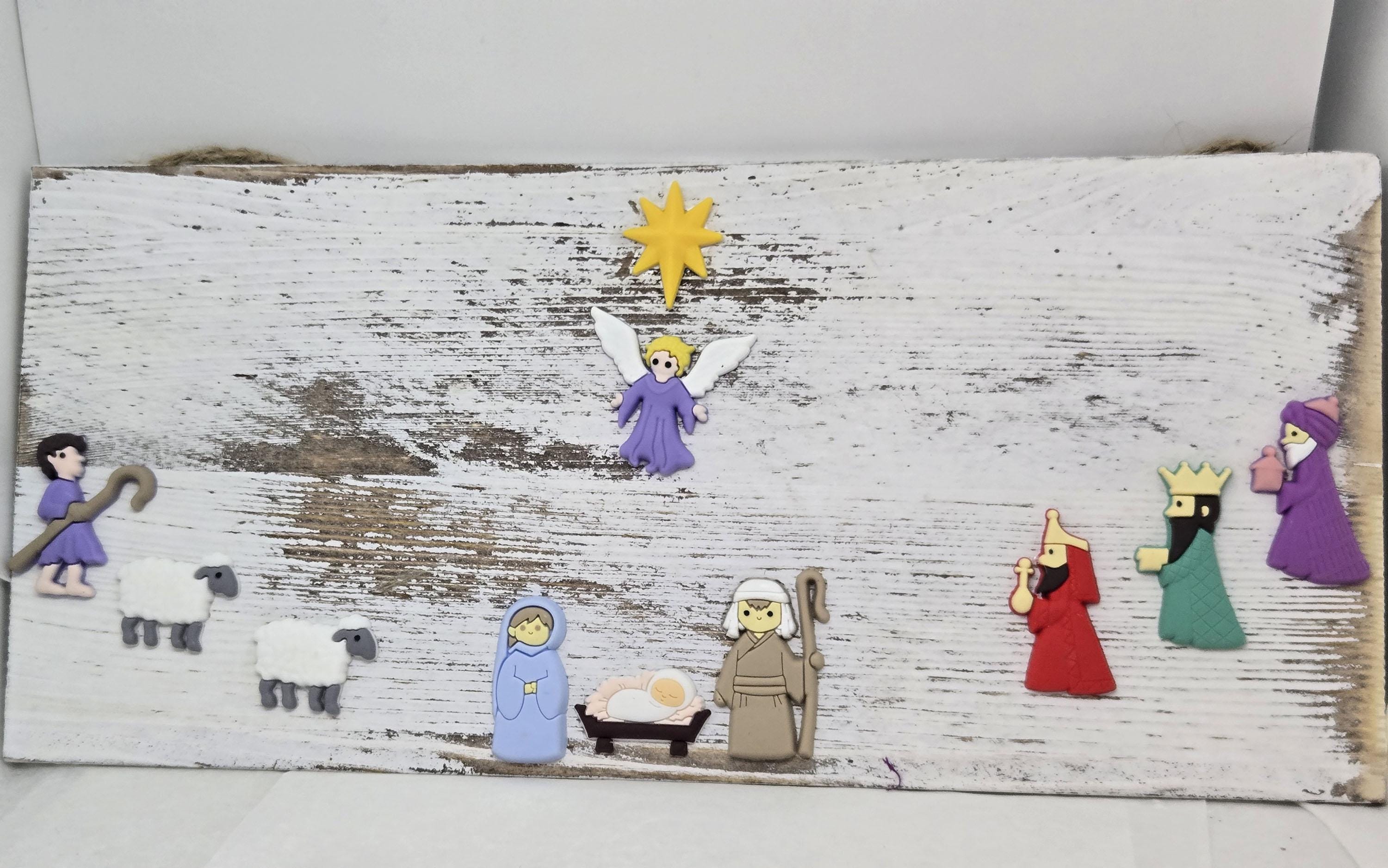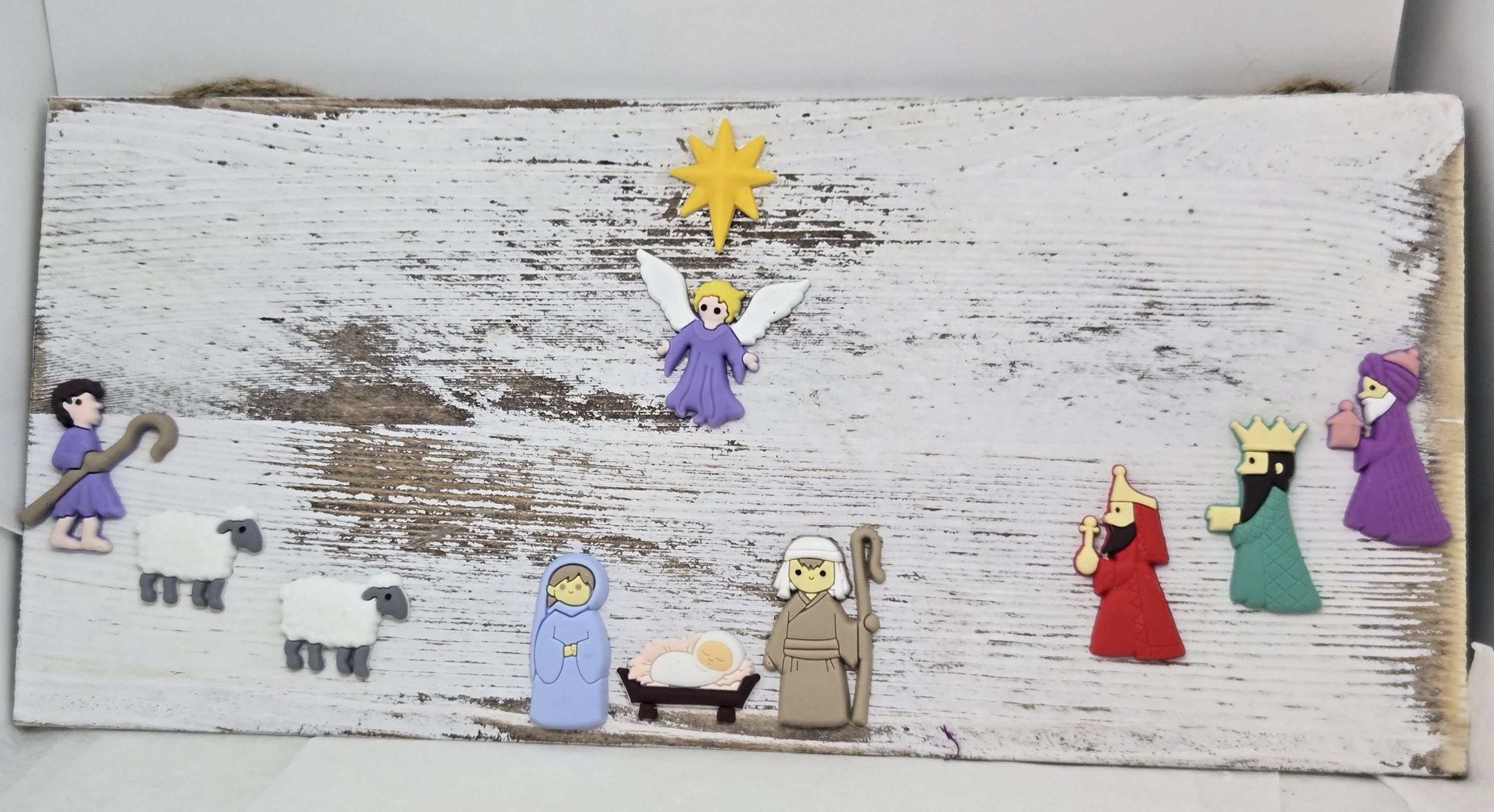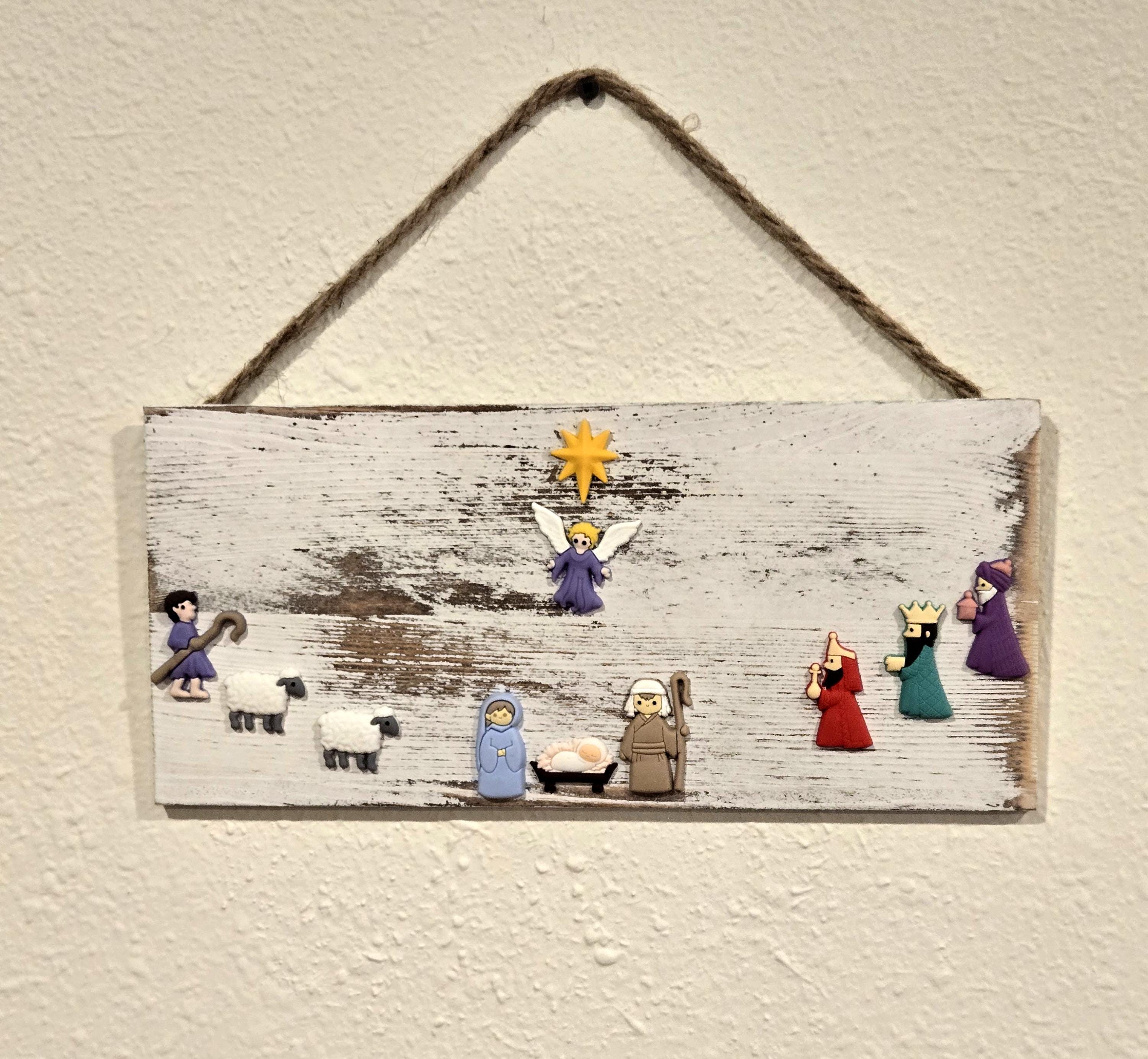 Hand crafted Colorful Nativity Scene Wall Plaque. The plaque measure 12 inches by 5 1/2 inches. It's a whitewashed pallet plank. I glued on the plastic figurines. I like this for it's simplicity and colorfulness.