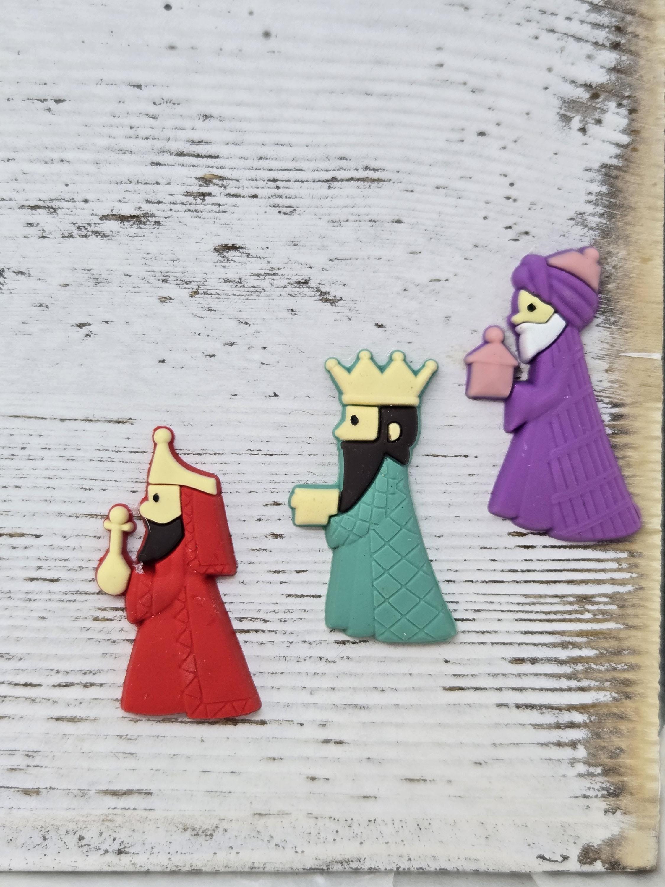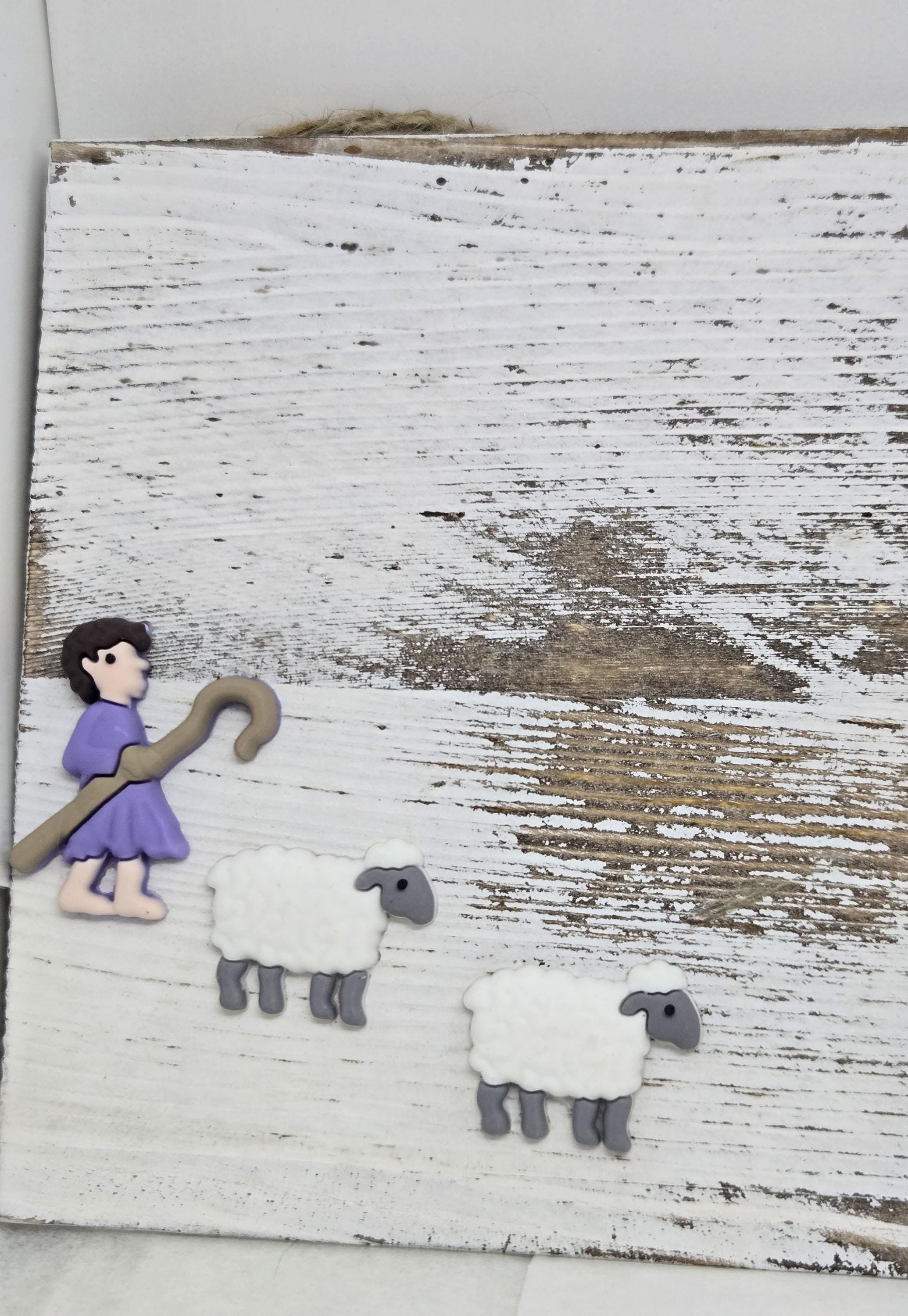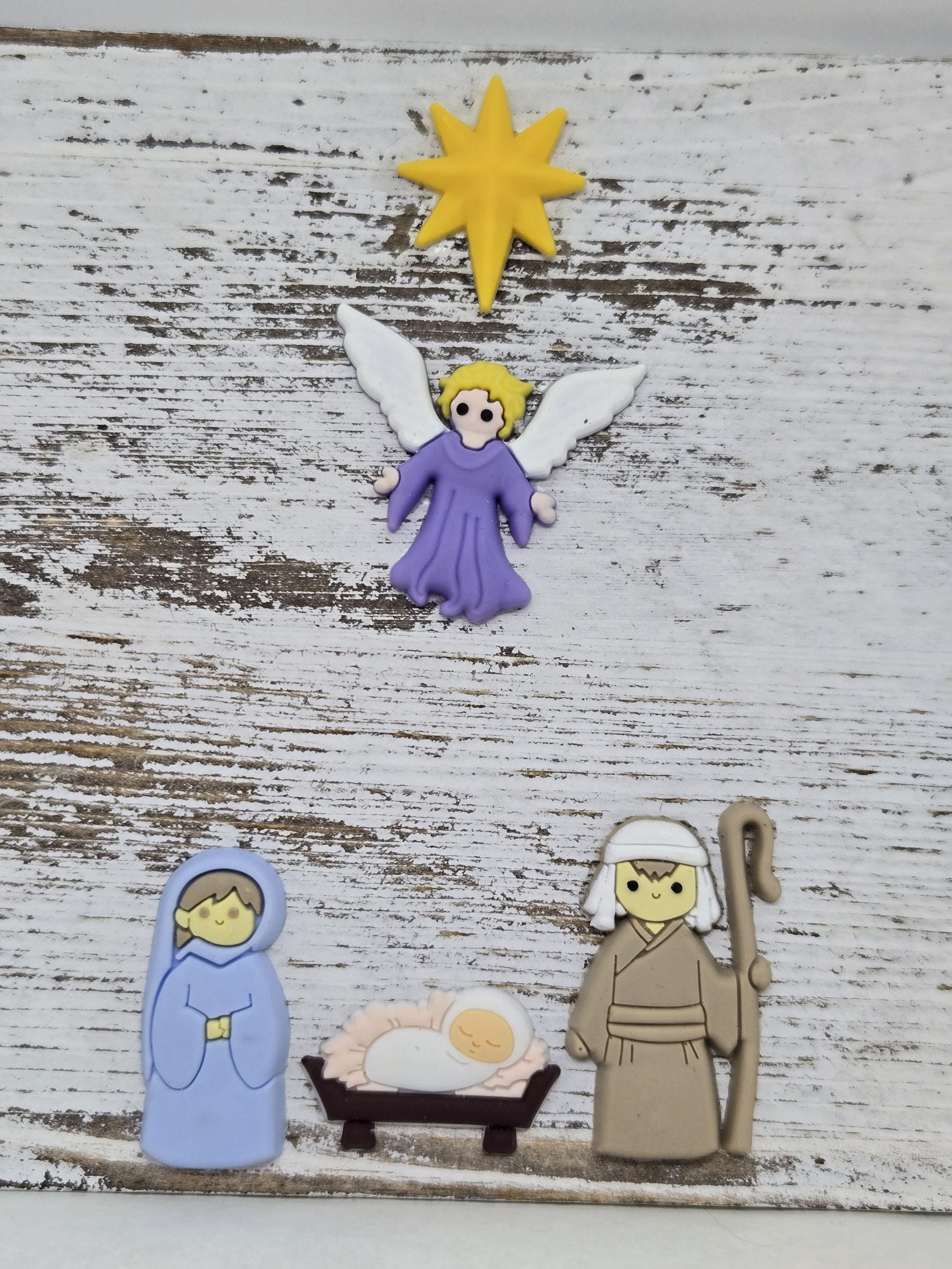 Hand crafted Colorful Nativity Scene Wall Plaque. The plaque measure 12 inches by 5 1/2 inches. It's a whitewashed pallet plank. I glued on the plastic figurines. I like this for it's simplicity and colorfulness.
