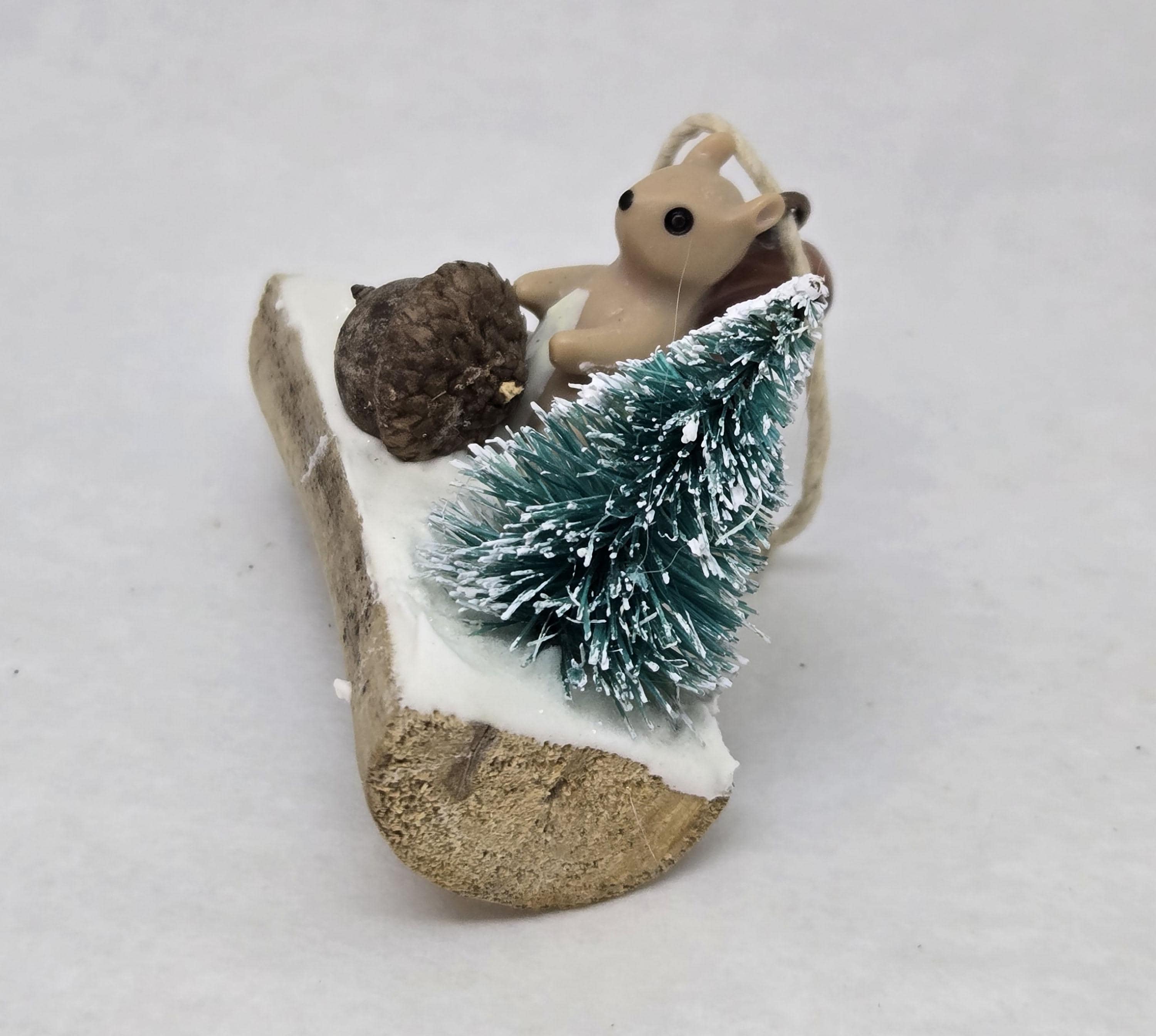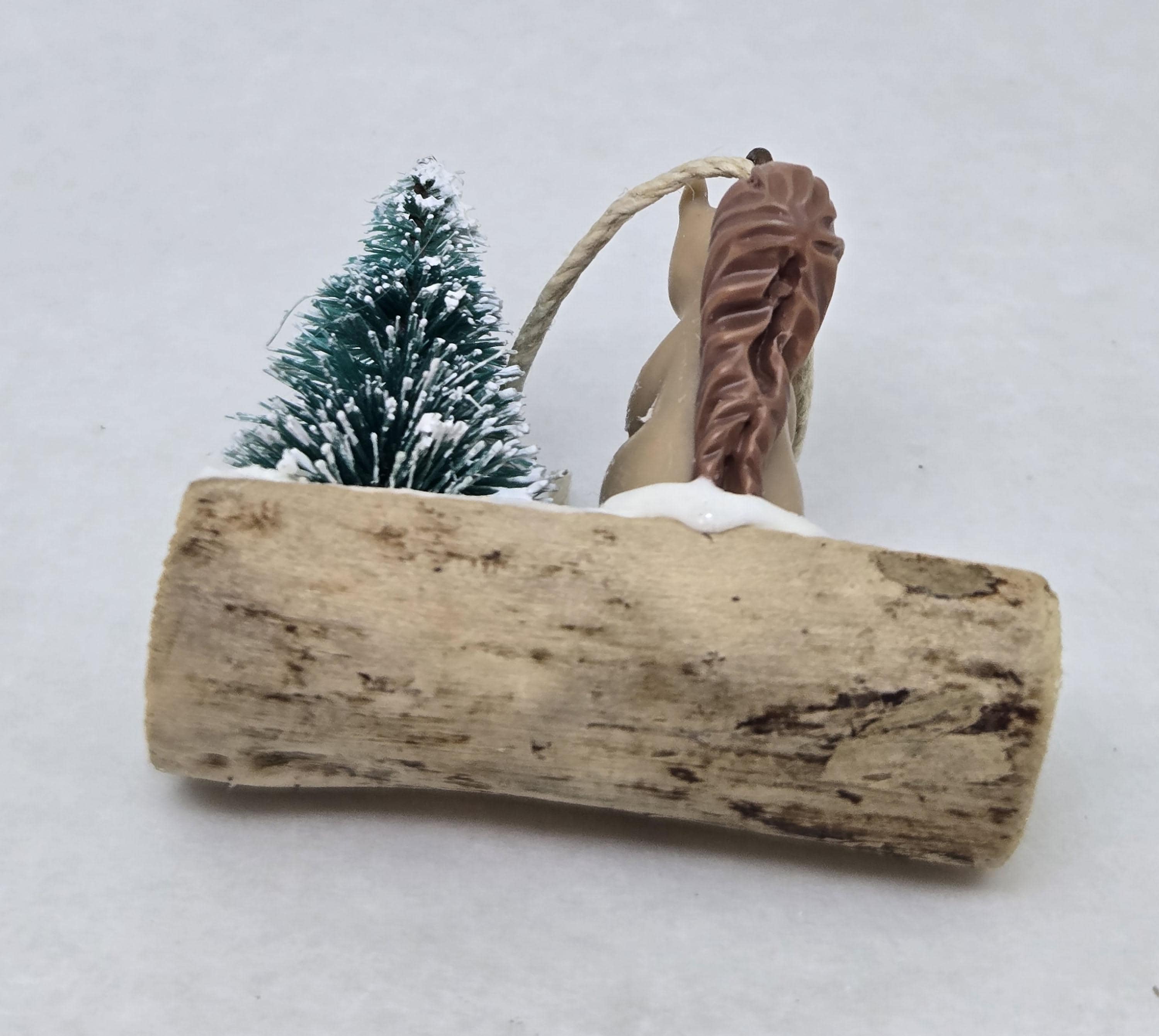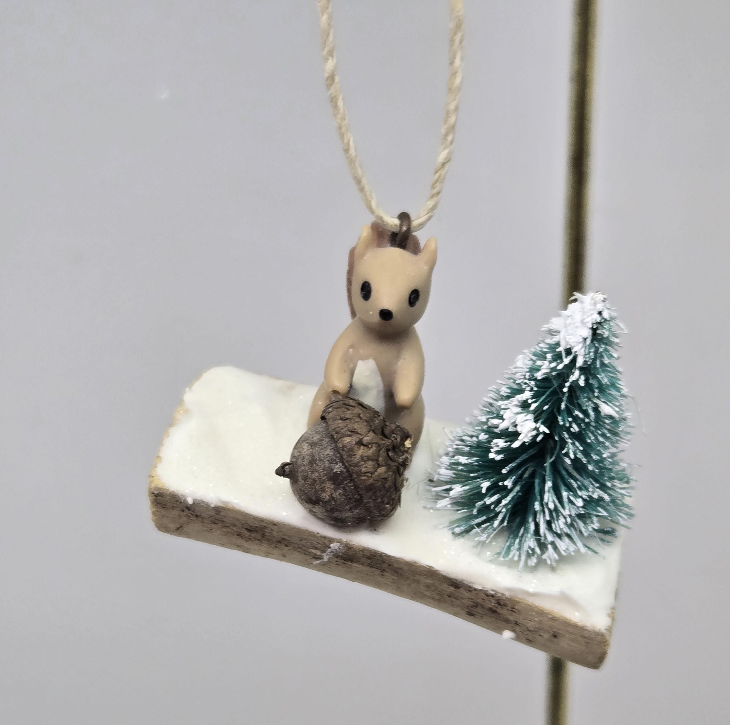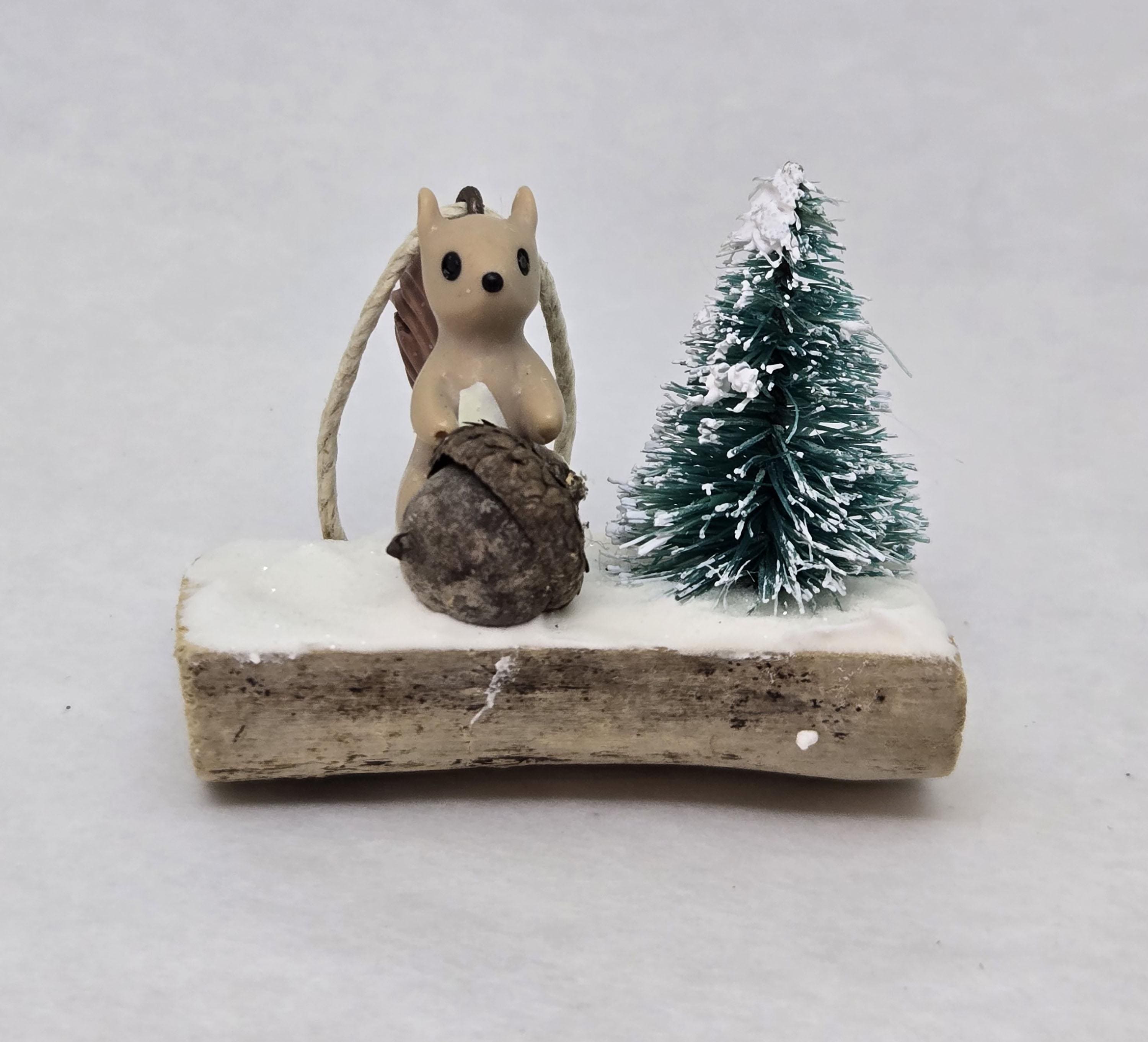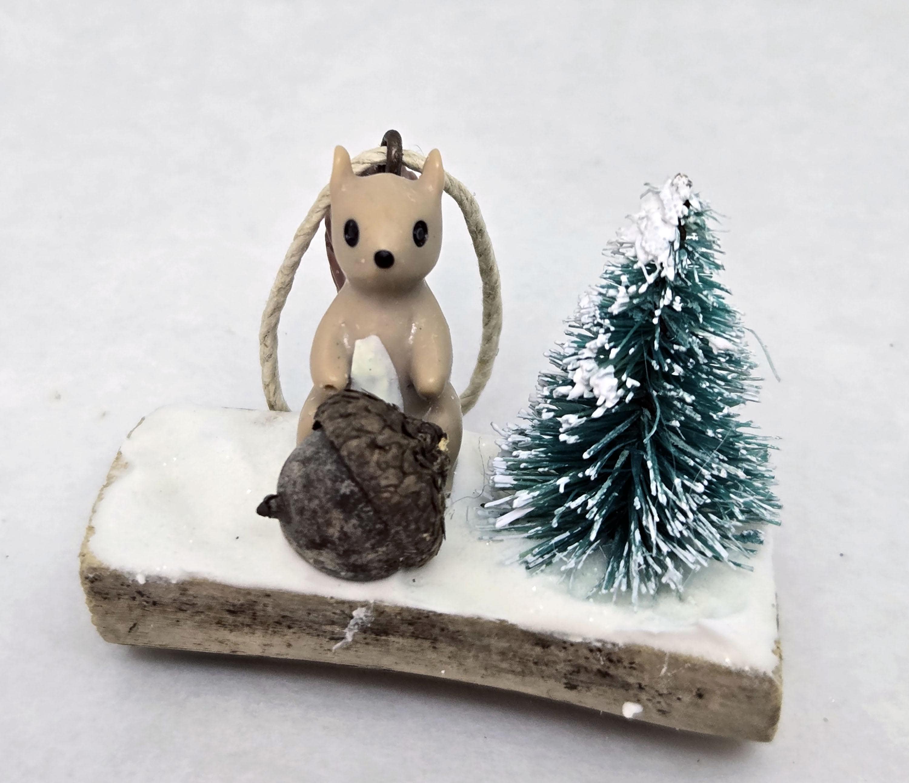 One of a kind, handcrafted miniature Squirrel ornament titled: Bushy Got a Big Acorn for Christmas. This is the perfect size for a small tree. I think these mini ornaments are also fun to hang on a gift bag or wrapped present. The base is a piece of tree limb. The squirrel is plastic. The acorn is real. I covered the top of the limb with artificial snow.