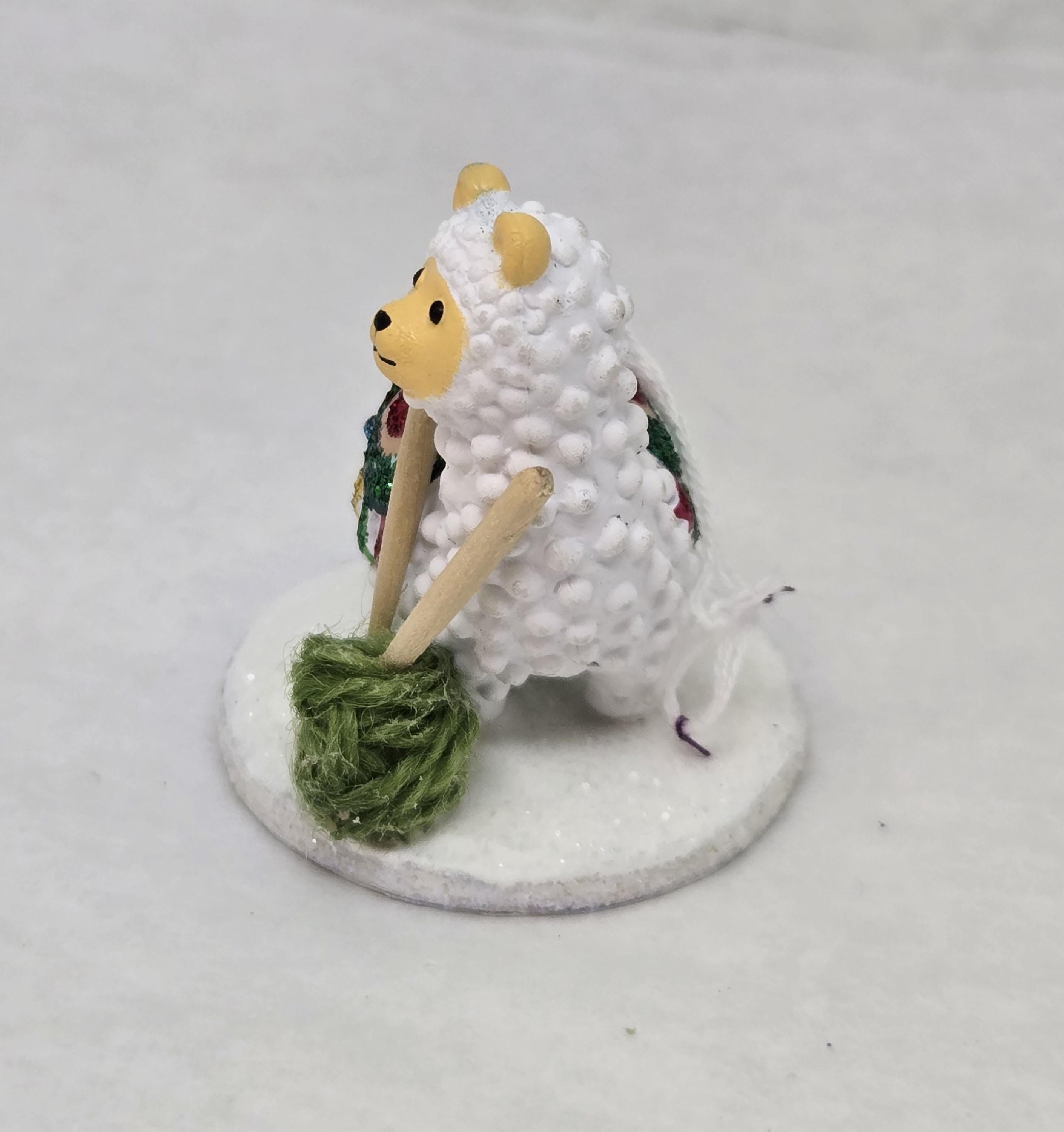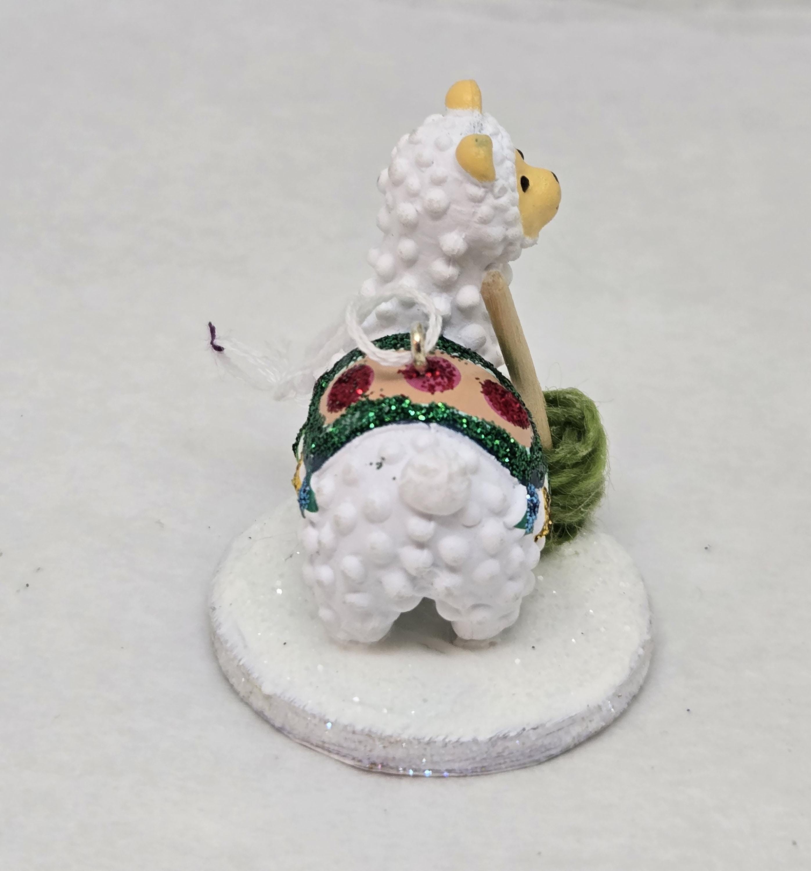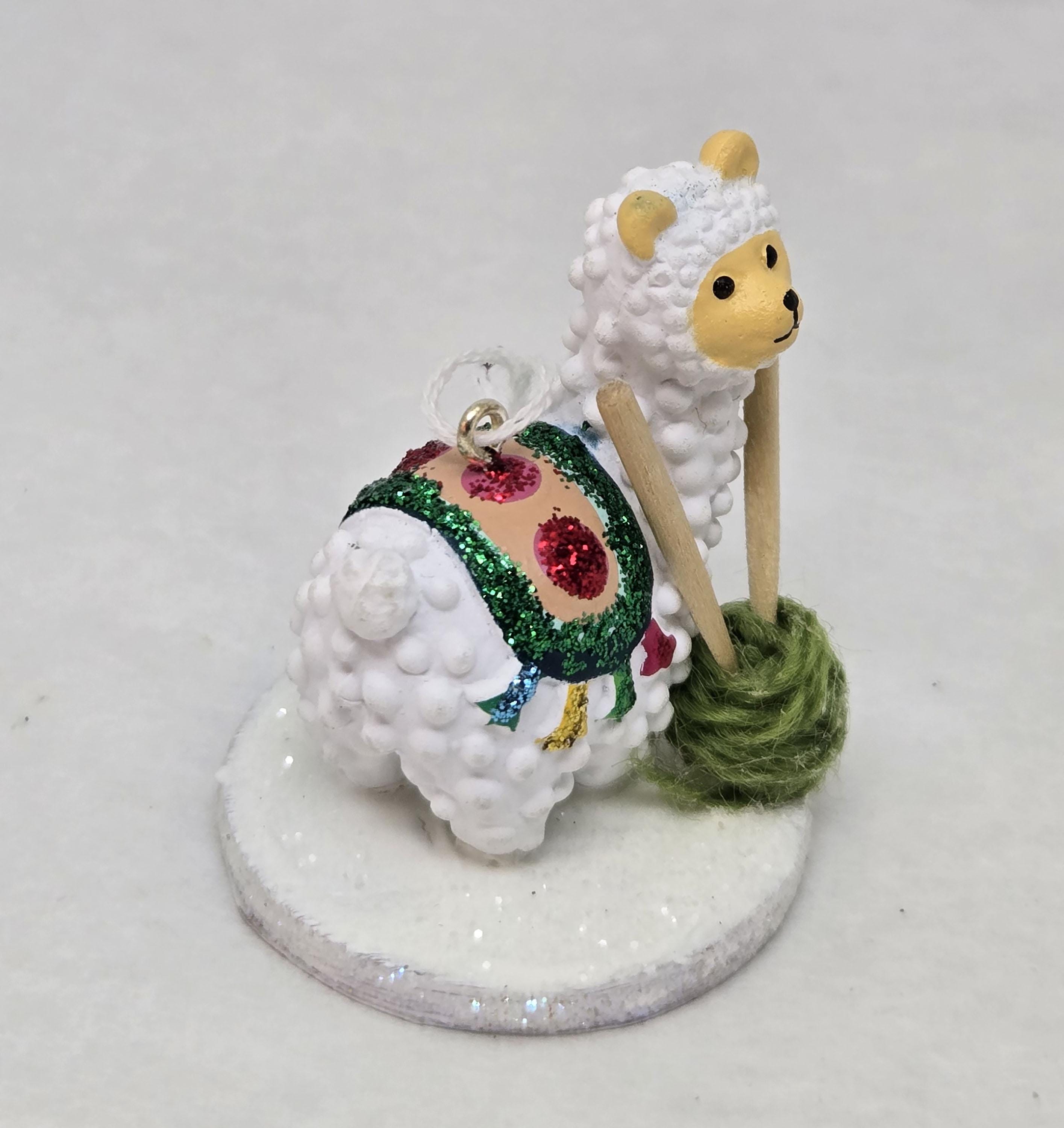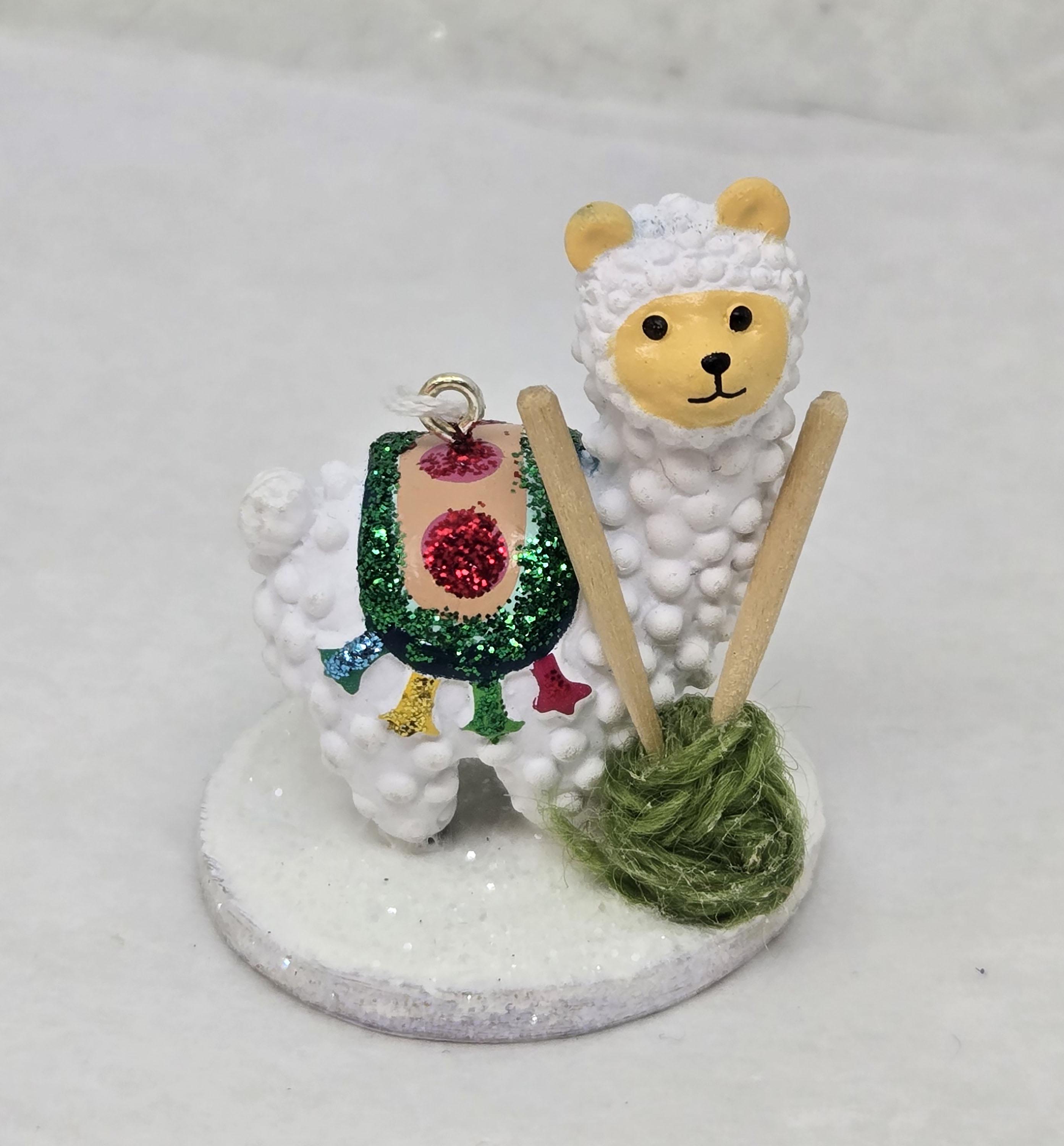 One of a kind, handcrafted adorable Alpaca Knitting Ornament. This ornament is the perfect size for a small Christmas Tree. I think these miniatures are also fun to hang on a gift bag or wrapped present. The alpaca is plastic. The knitting accessory is made with yarn and toothpicks. The base of the ornament is a wood disc. The bottom is covered with scrapbook paper sealed with decoupage. The sides are covered with decorative tape and the top with artificial snow.