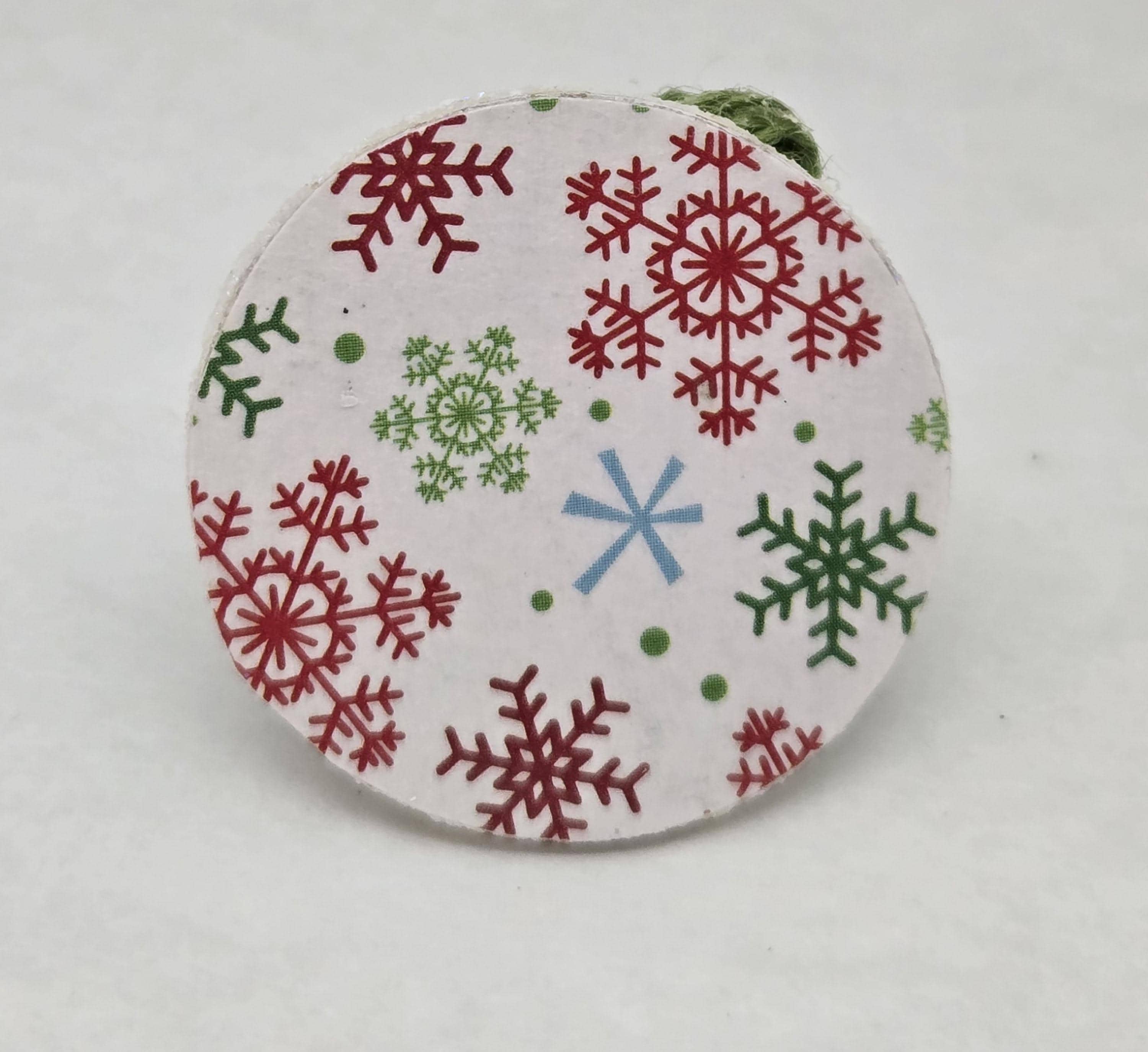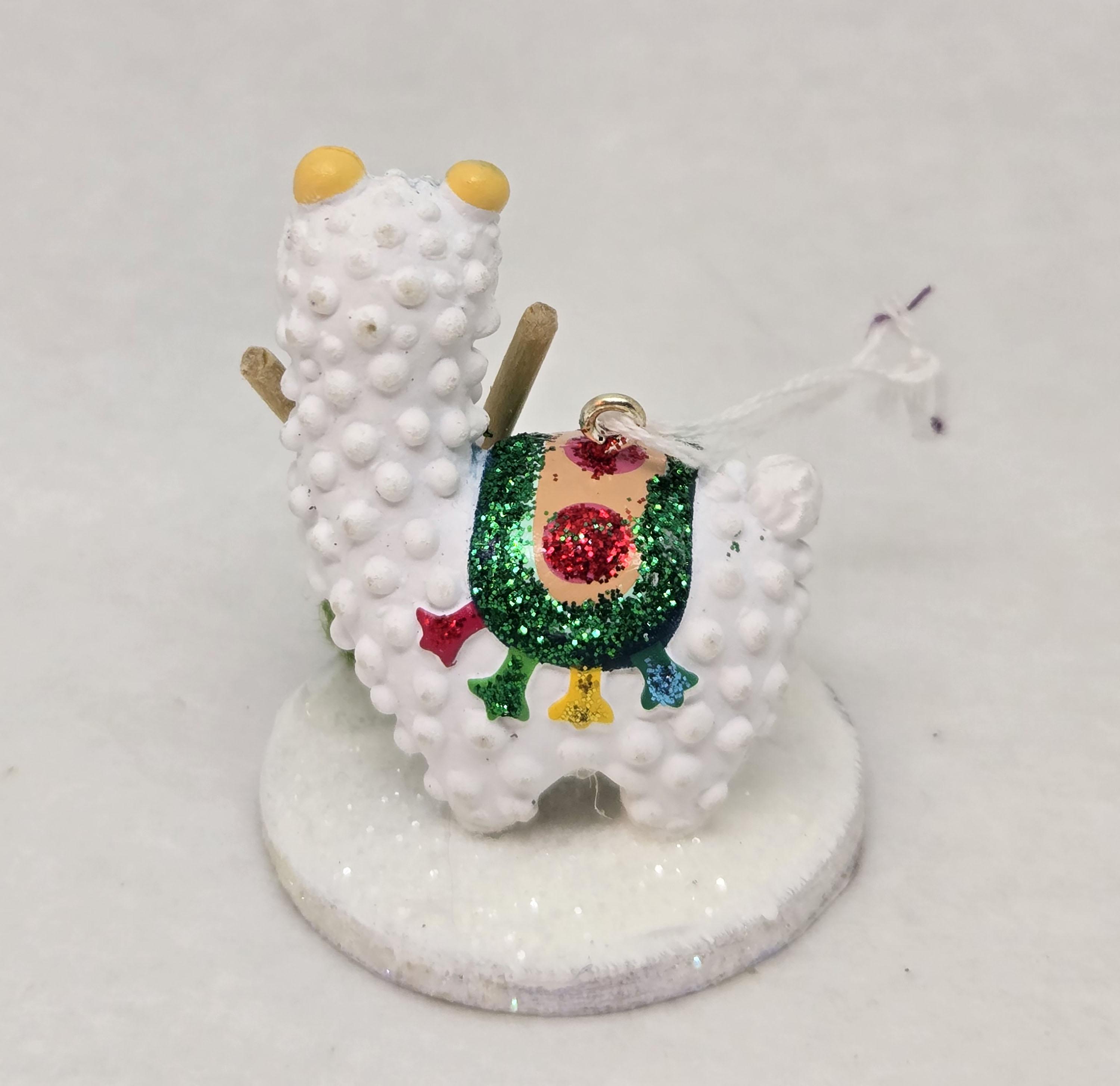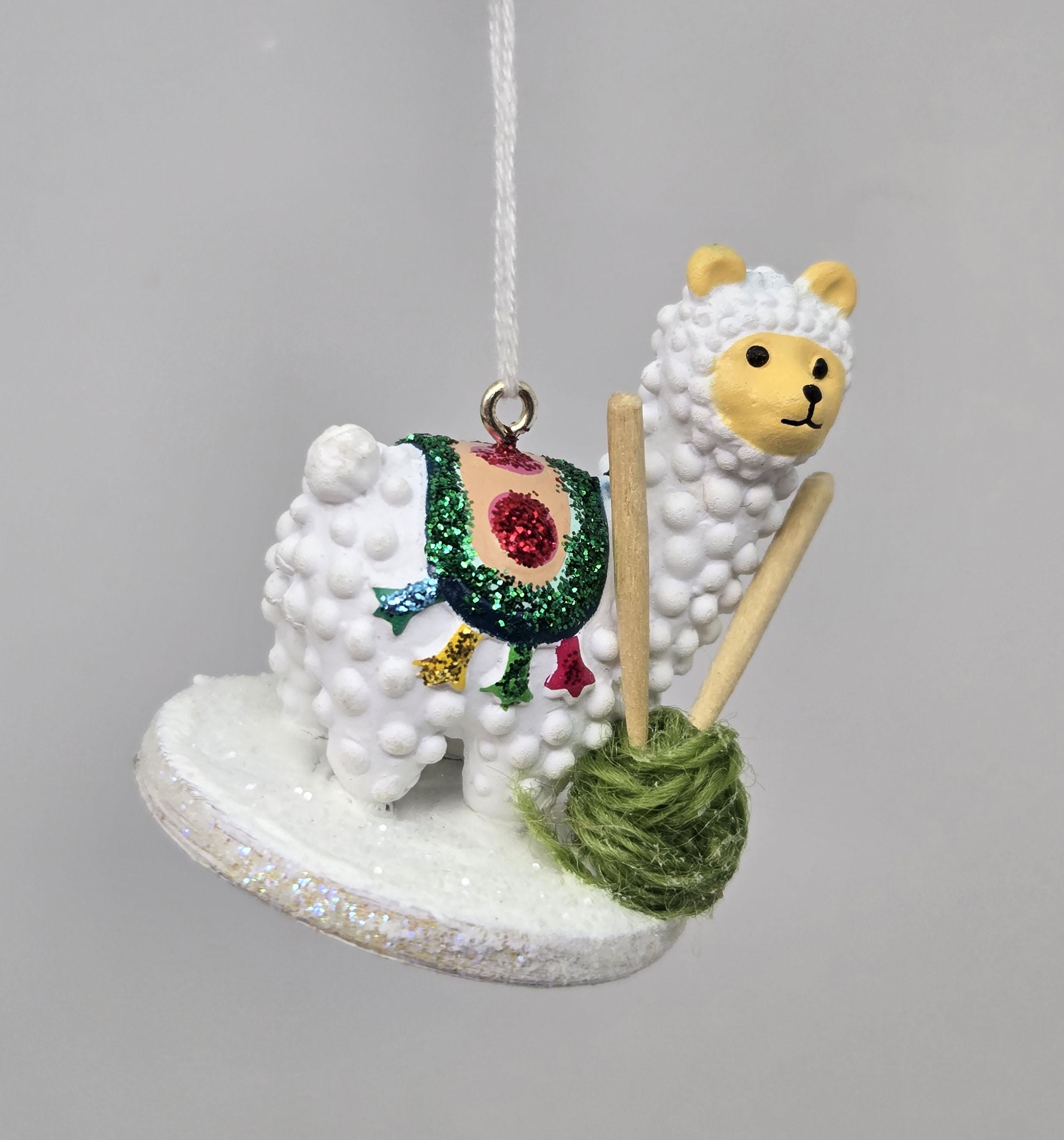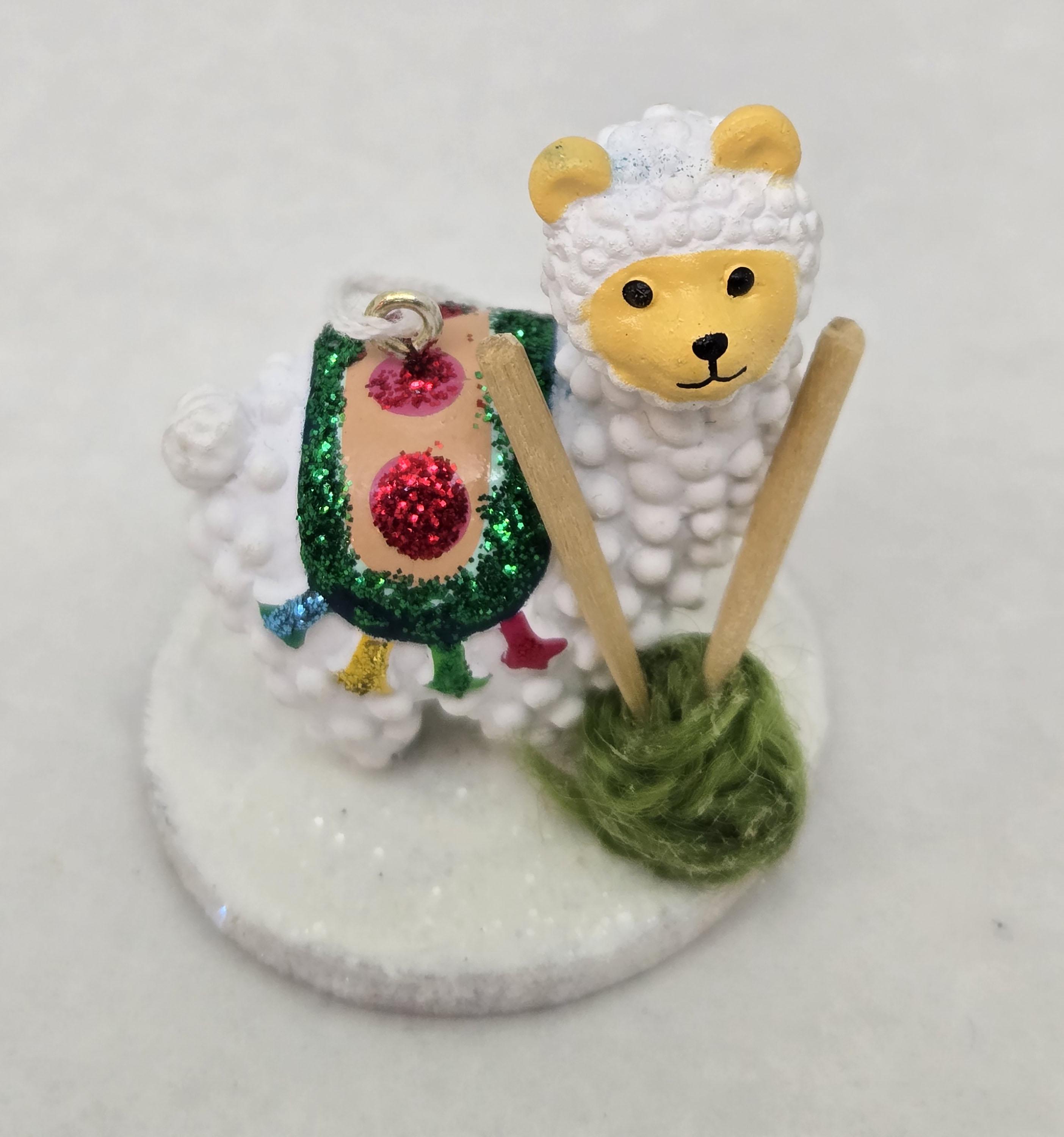 One of a kind, handcrafted adorable Alpaca Knitting Ornament. This ornament is the perfect size for a small Christmas Tree. I think these miniatures are also fun to hang on a gift bag or wrapped present. The alpaca is plastic. The knitting accessory is made with yarn and toothpicks. The base of the ornament is a wood disc. The bottom is covered with scrapbook paper sealed with decoupage. The sides are covered with decorative tape and the top with artificial snow.