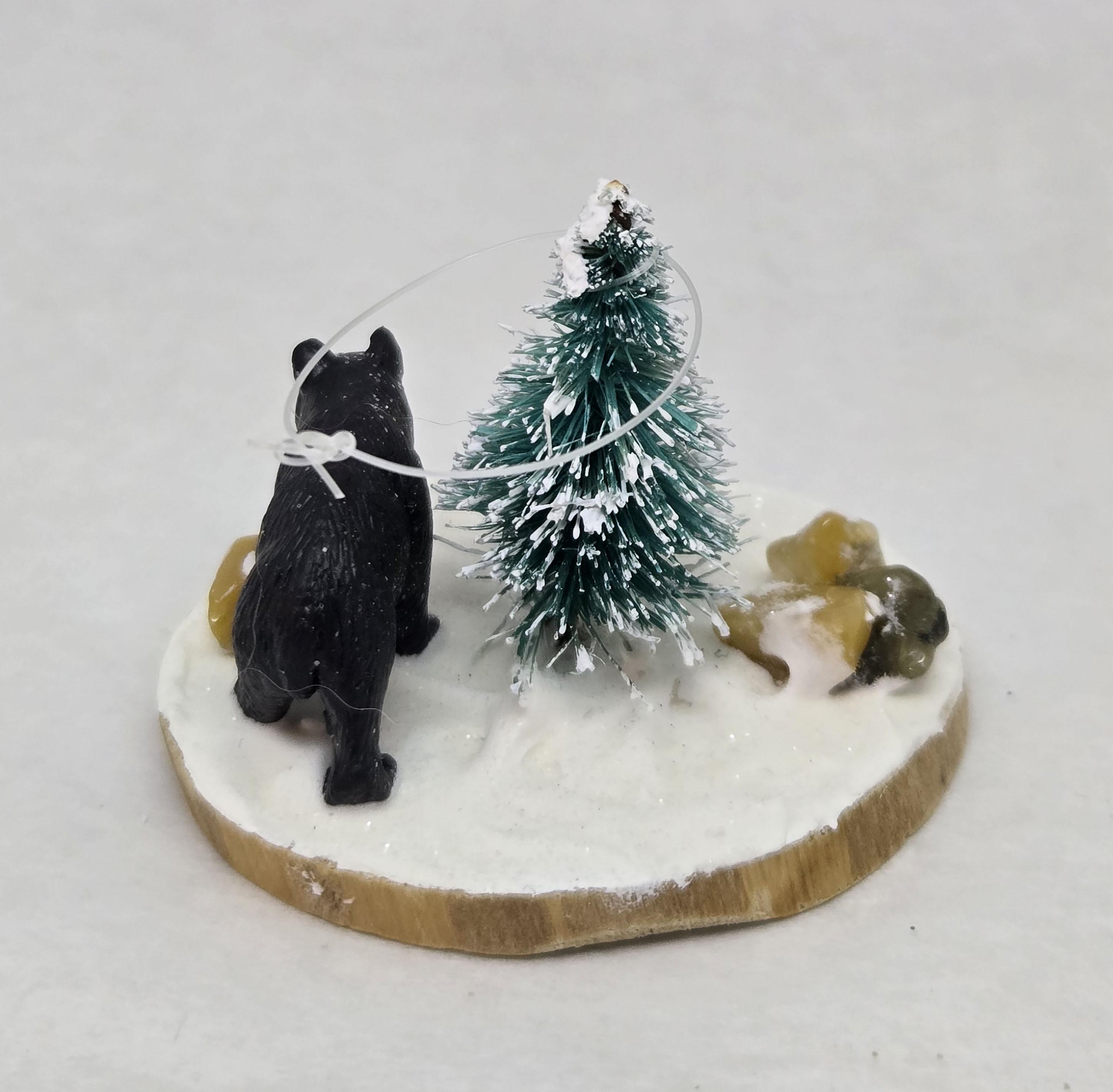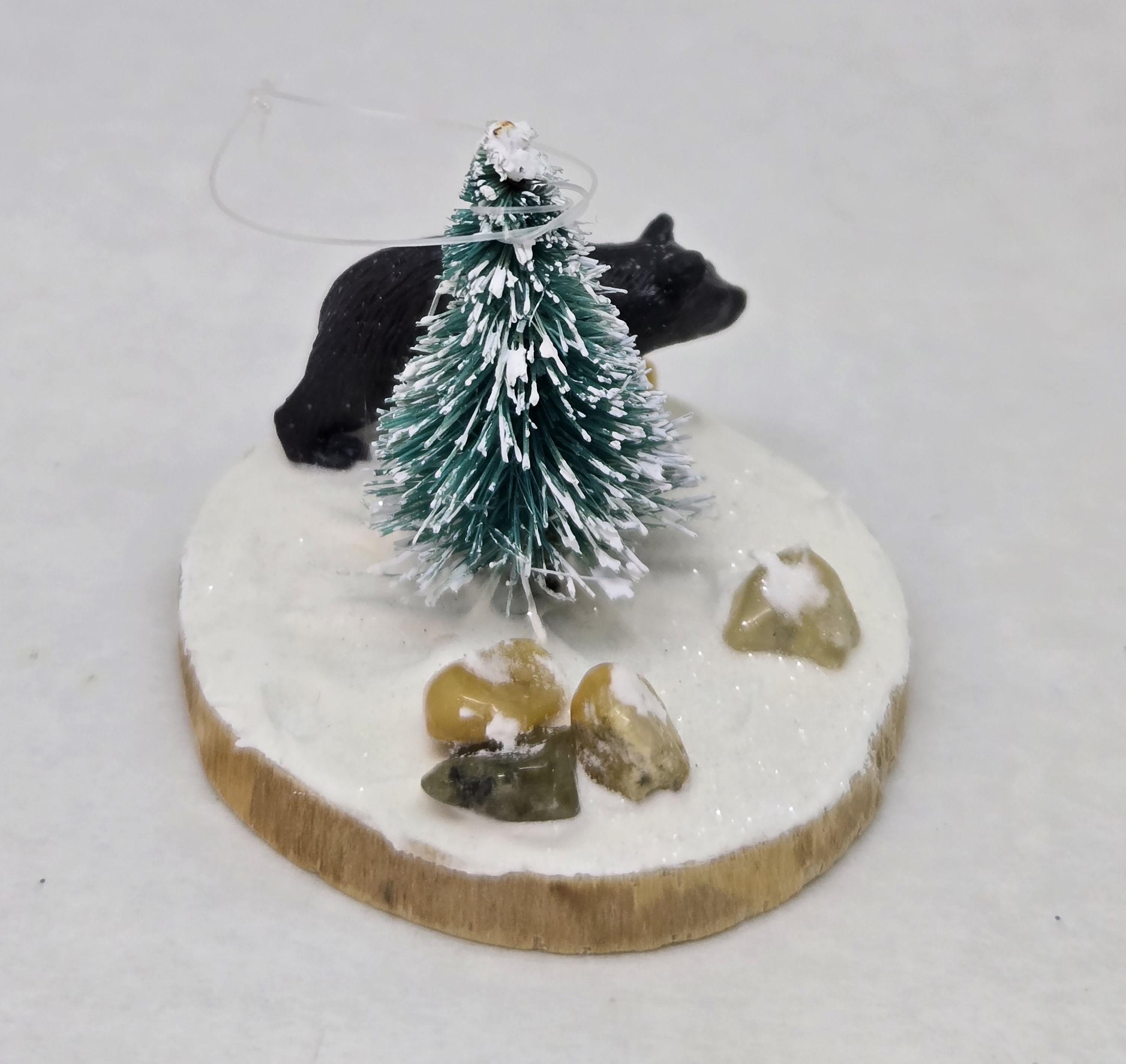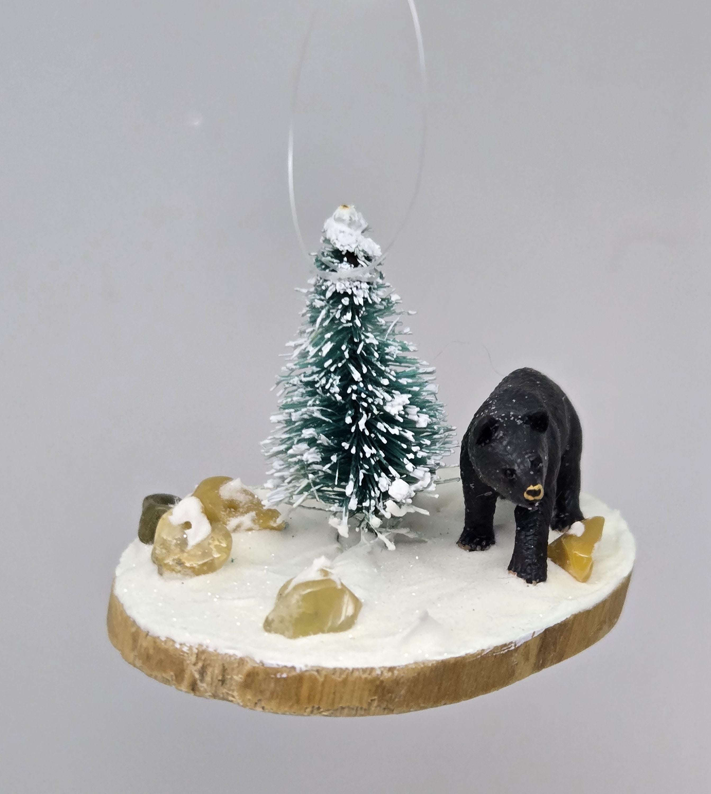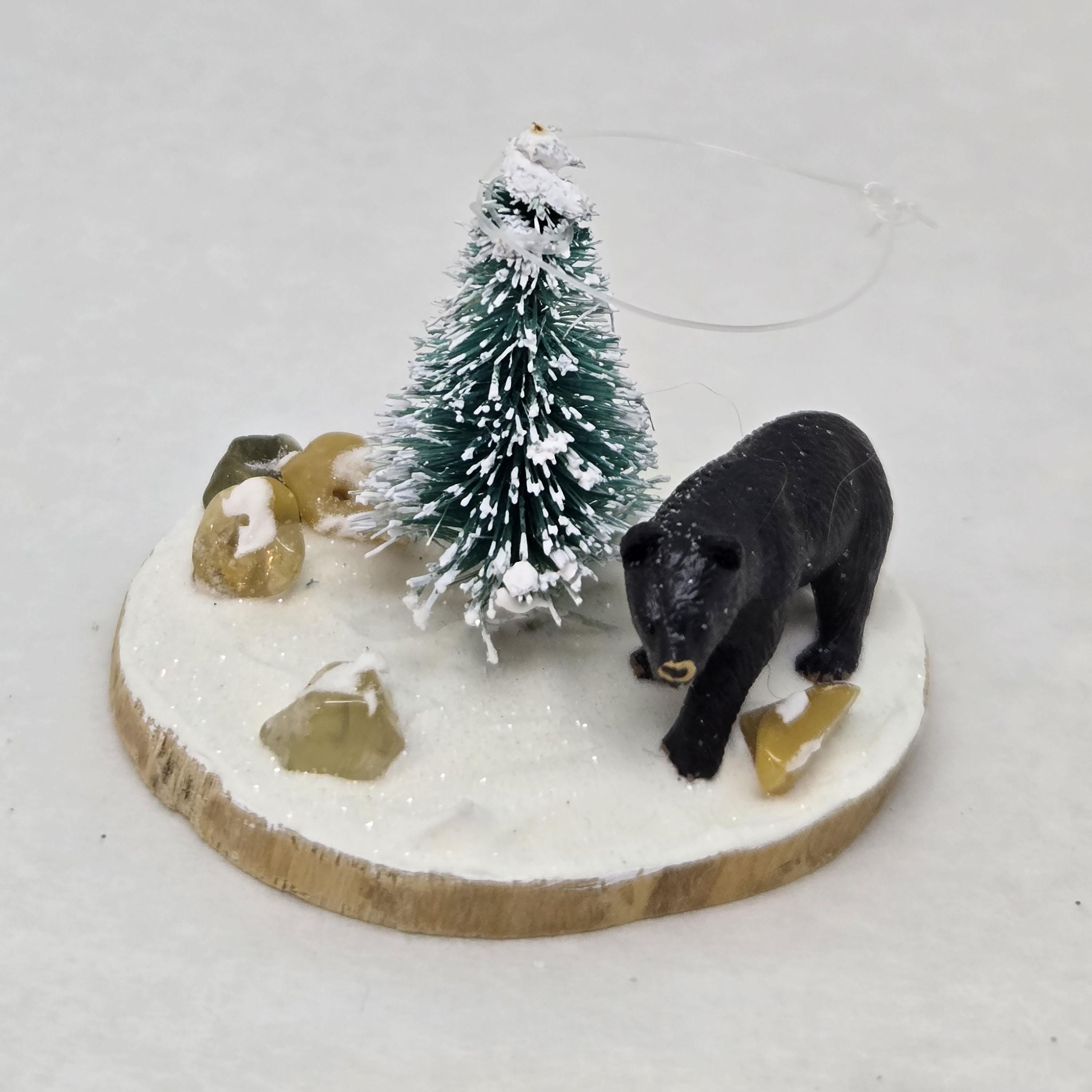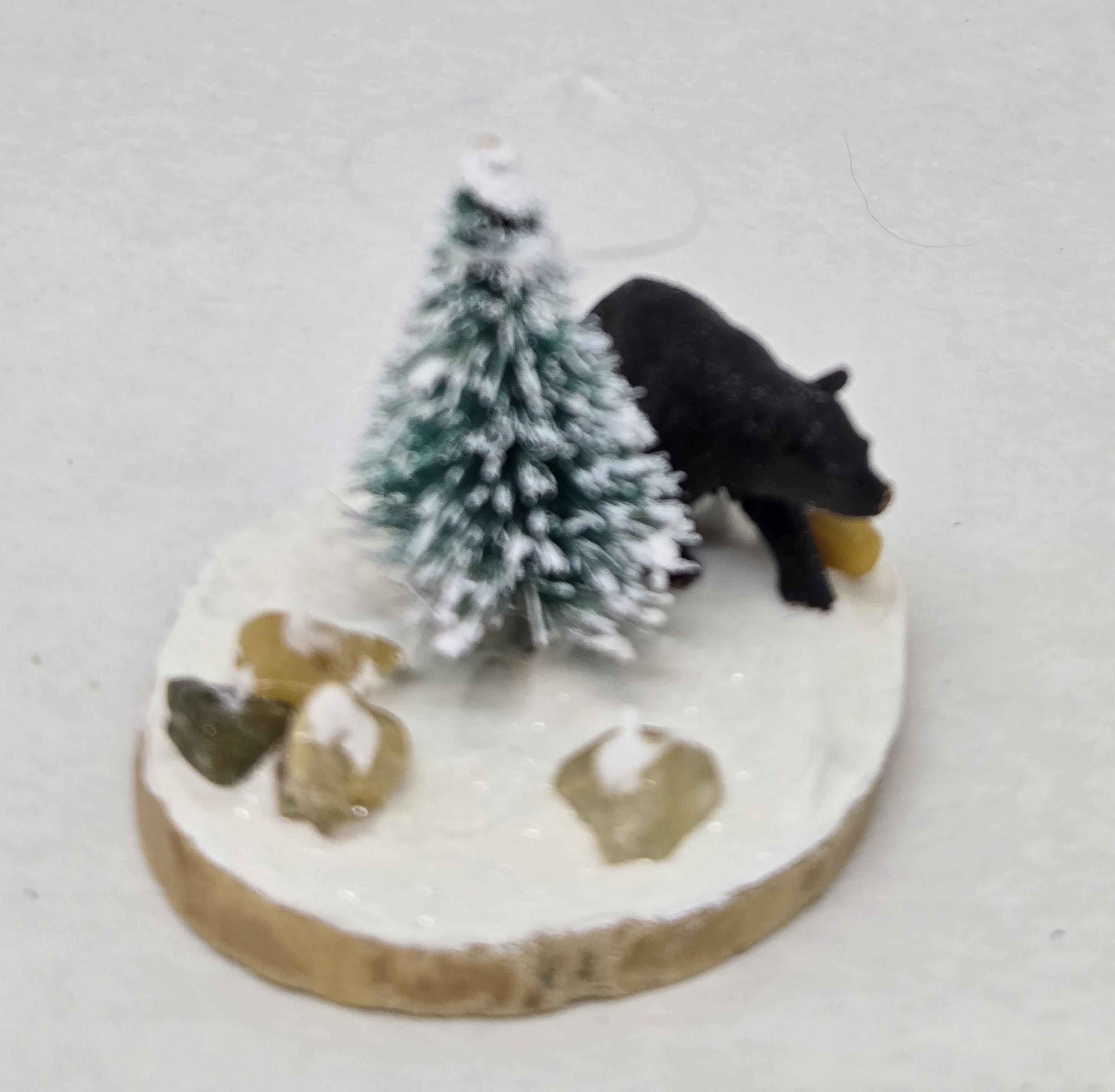 One of a kind, handcrafted Miniature Black Bear Ornament. This ornament is the perfect size for a small Christmas Tree. I think these miniatures are also fun to tie on a gift bag or wrapped package. The base of the ornament is wood. The bear is a Safari Good Luck Mini. The rocks are polished stones. The top is covered with artificial snow.