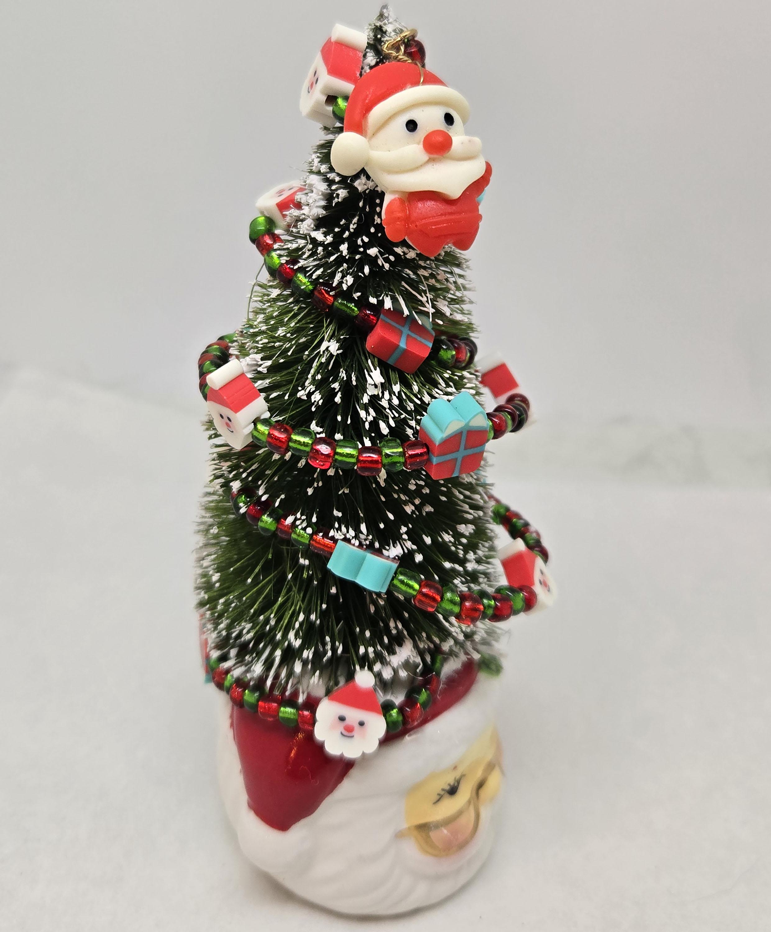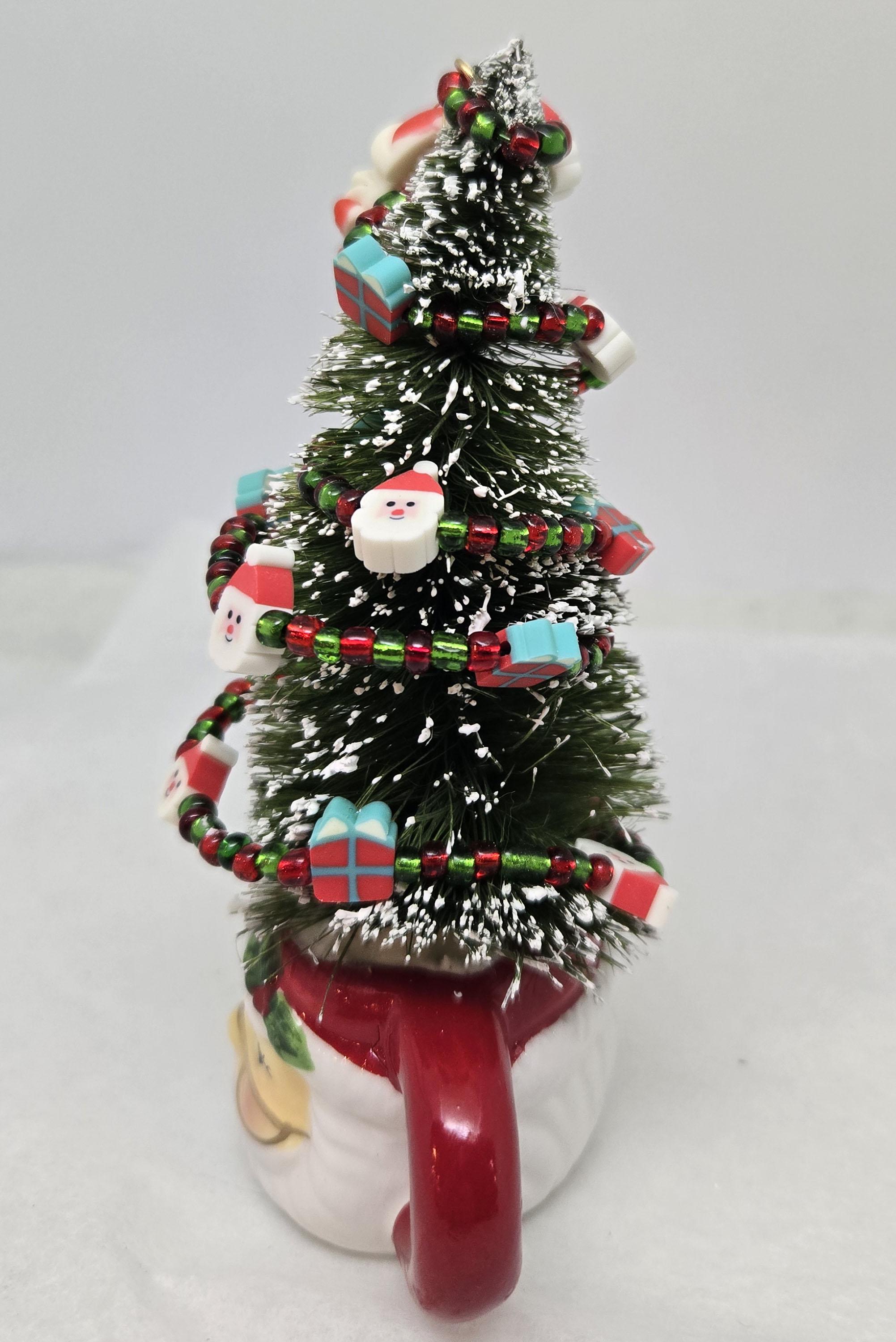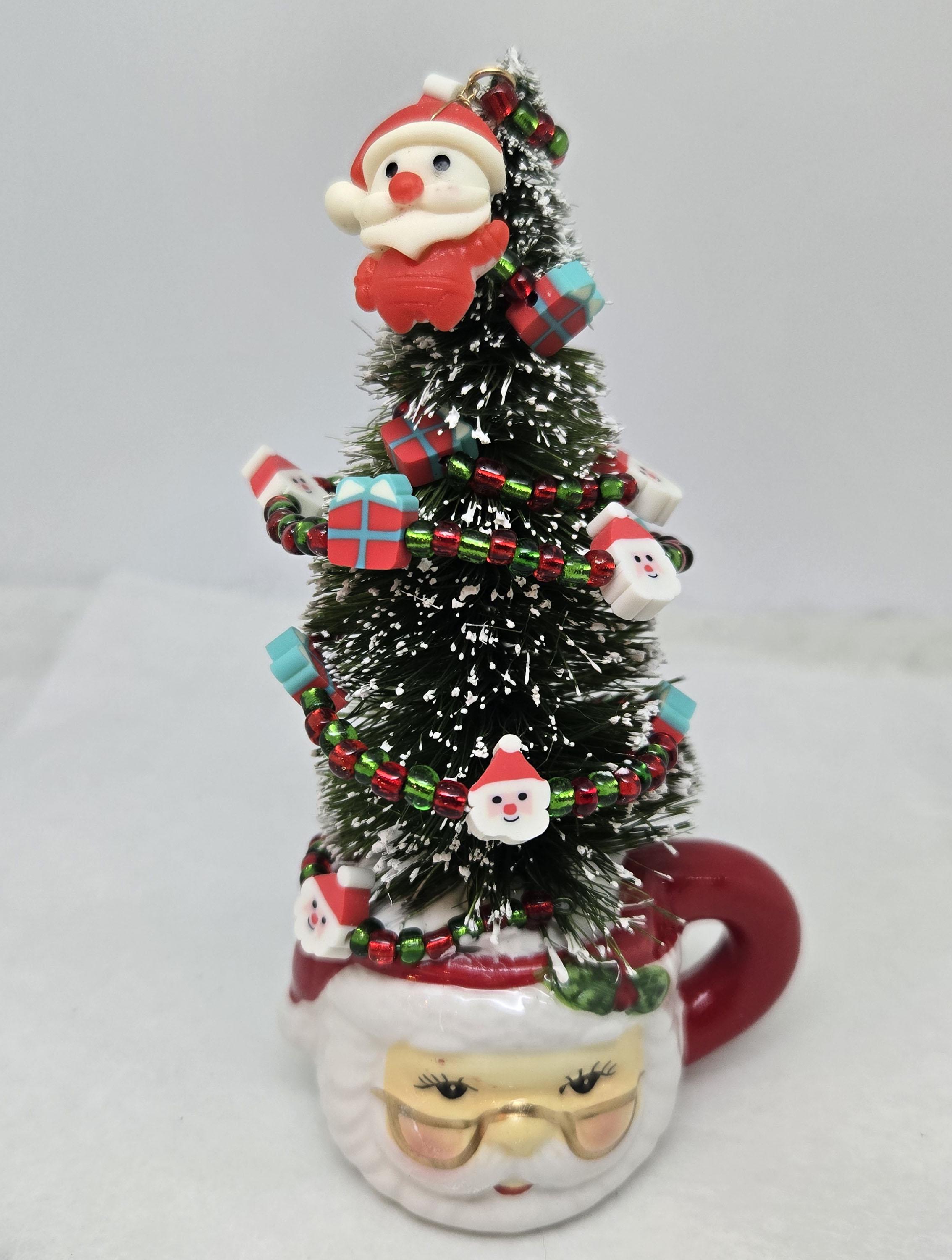 One of a kind, handcrafted Small, Tabletop Santa Themed Christmas Tree. The tree is 5 1/4 inches tall. Perfect to add to a small space, nestle in with other Christmas decorations or on your desktop. The tree is secured in the ceramic Santa mini mug with styrofoam and artificial snow. The tree is decorated with beads and santa and present shaped beads I strung on wire. I added the Santa charm to th top.