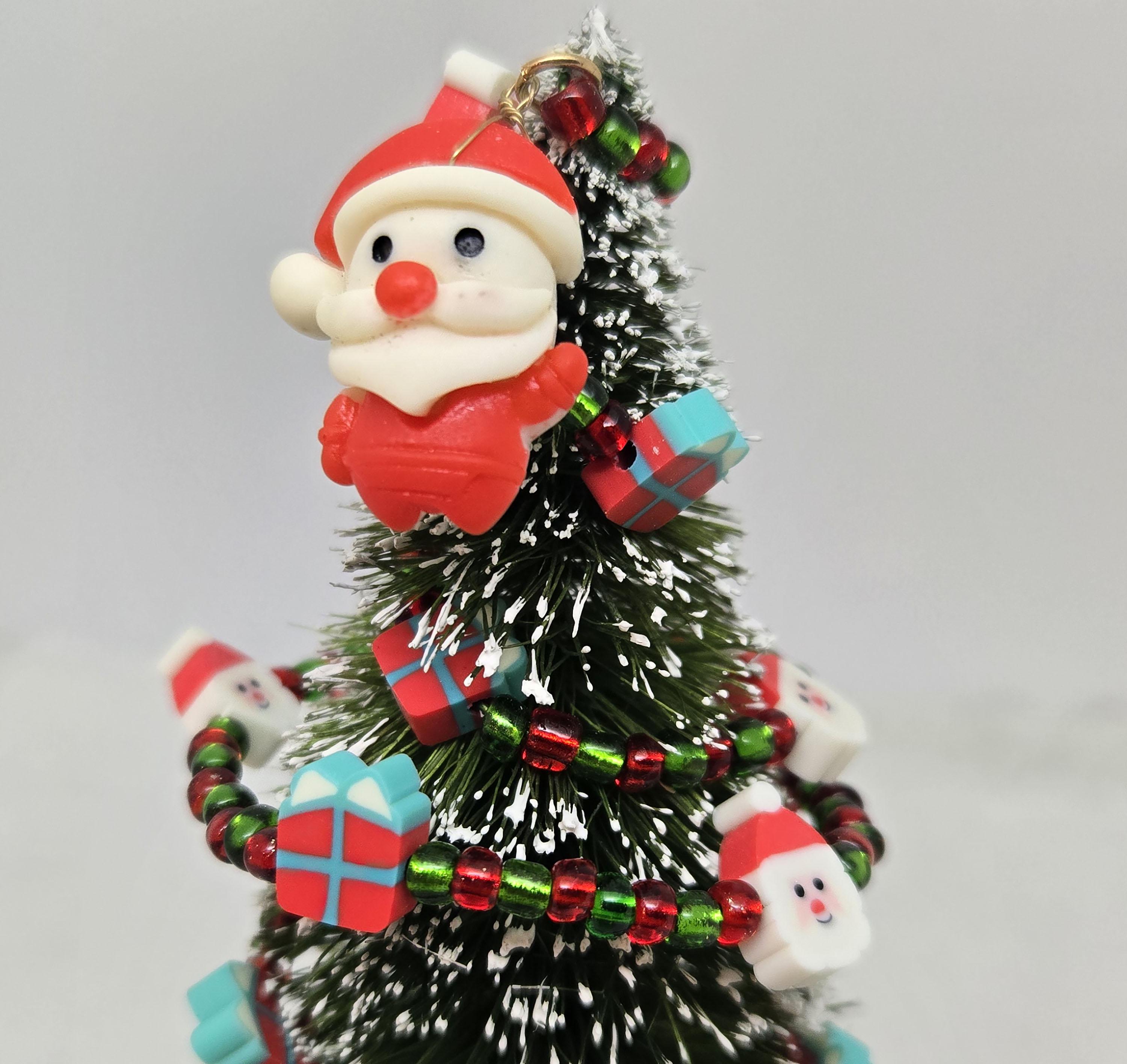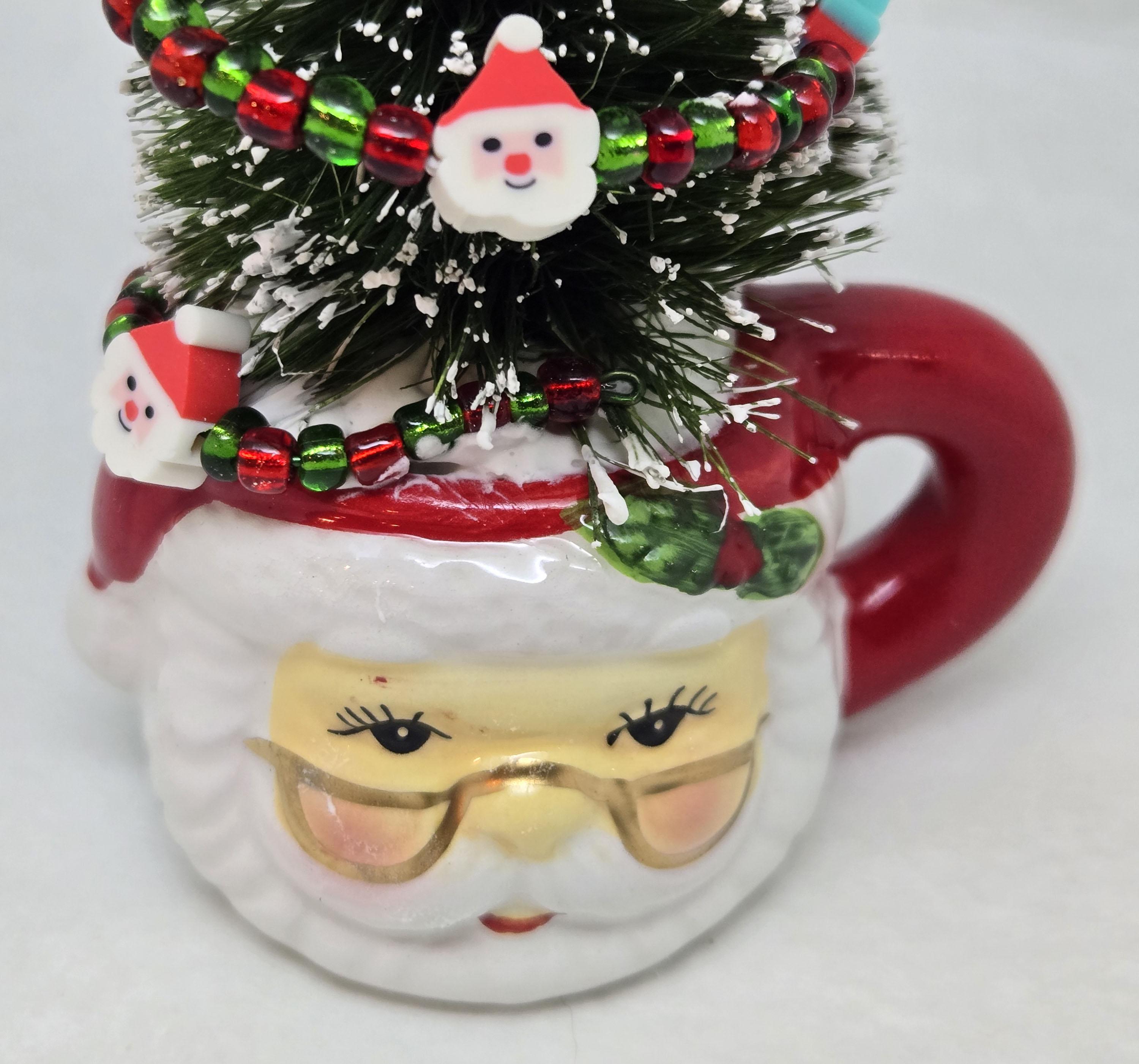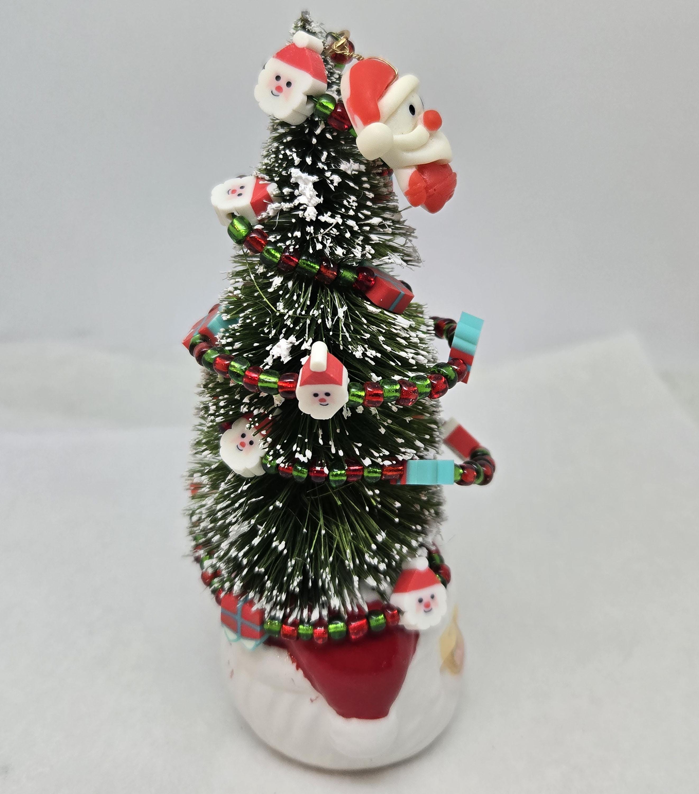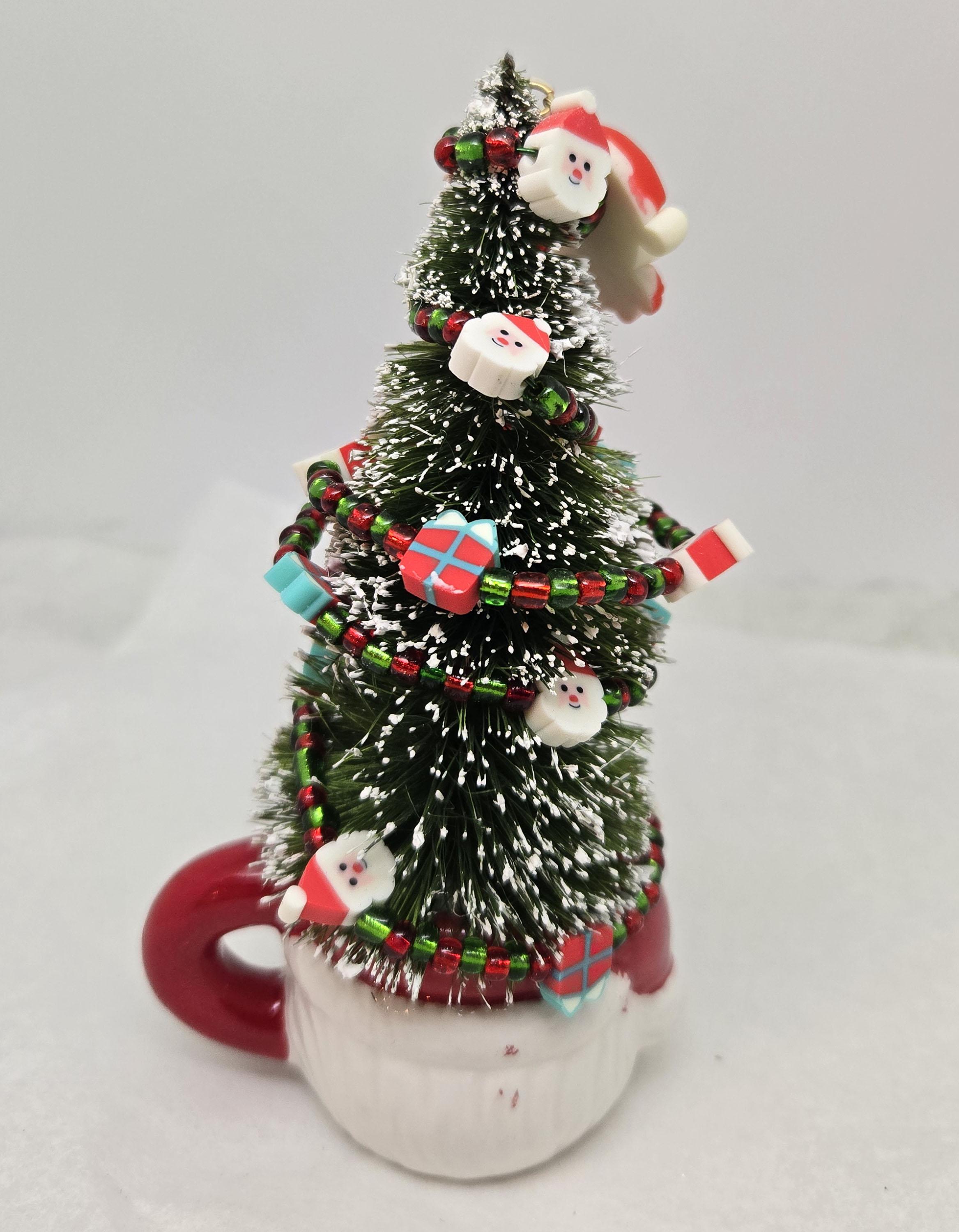 One of a kind, handcrafted Small, Tabletop Santa Themed Christmas Tree. The tree is 5 1/4 inches tall. Perfect to add to a small space, nestle in with other Christmas decorations or on your desktop. The tree is secured in the ceramic Santa mini mug with styrofoam and artificial snow. The tree is decorated with beads and santa and present shaped beads I strung on wire. I added the Santa charm to th top.