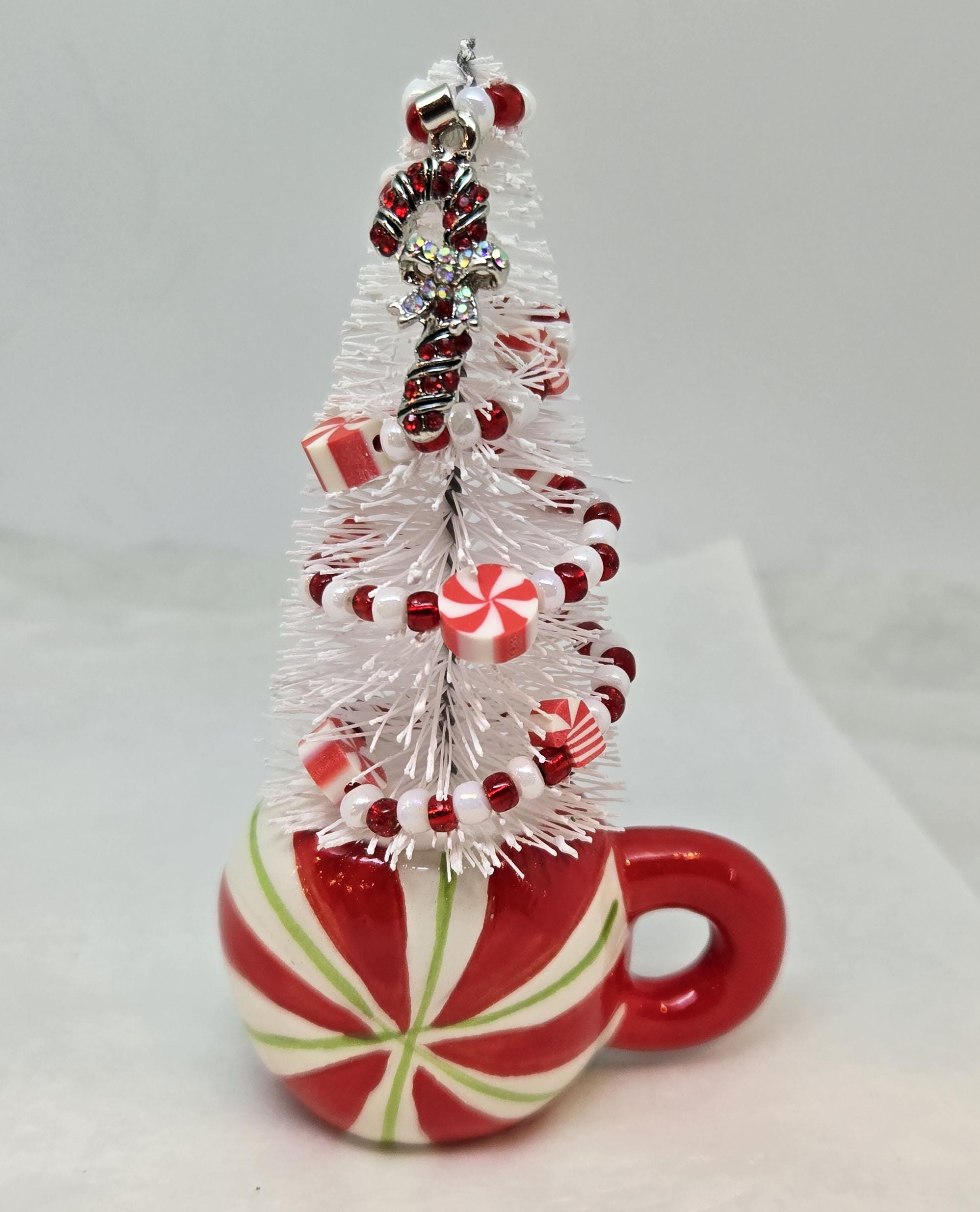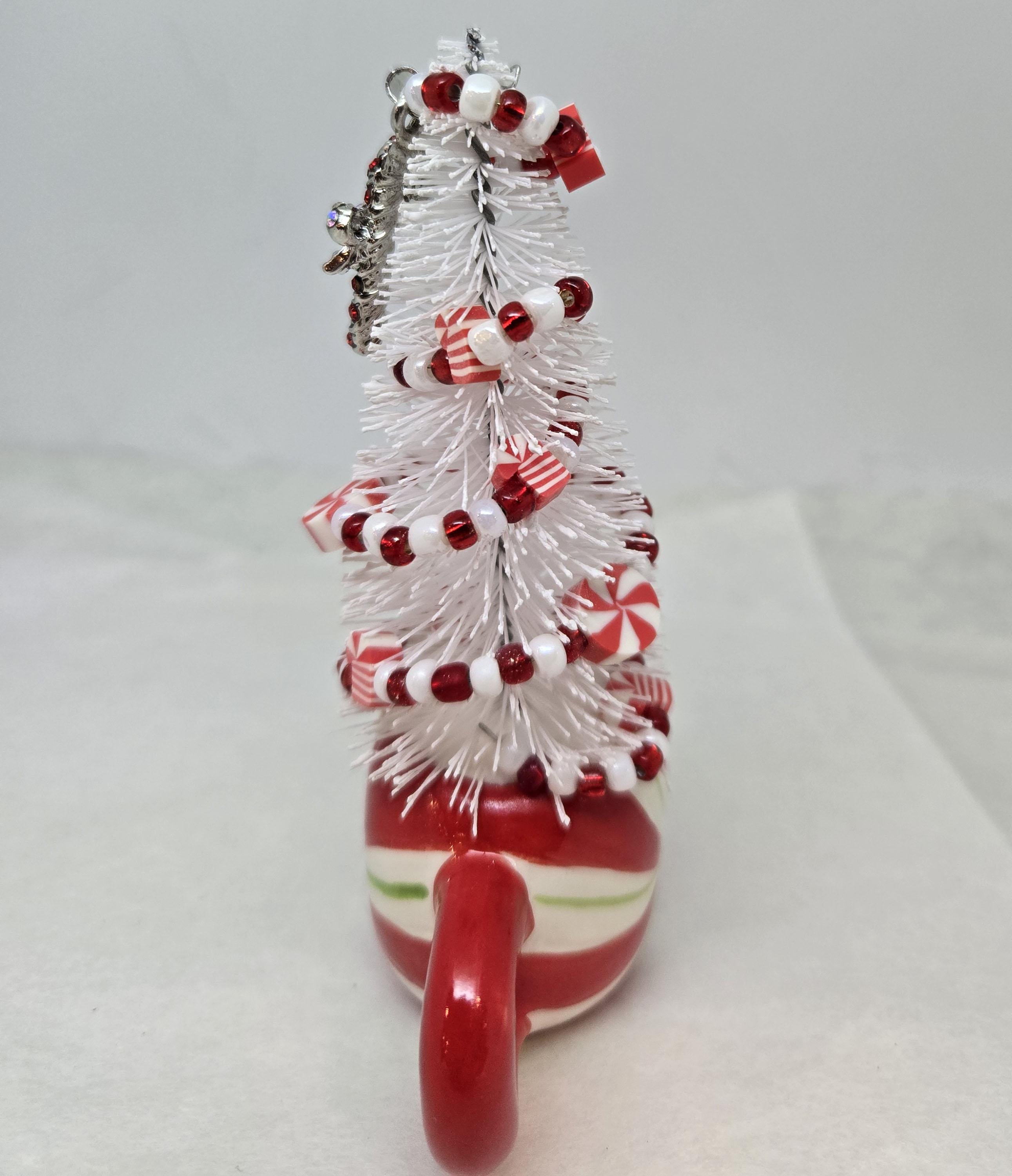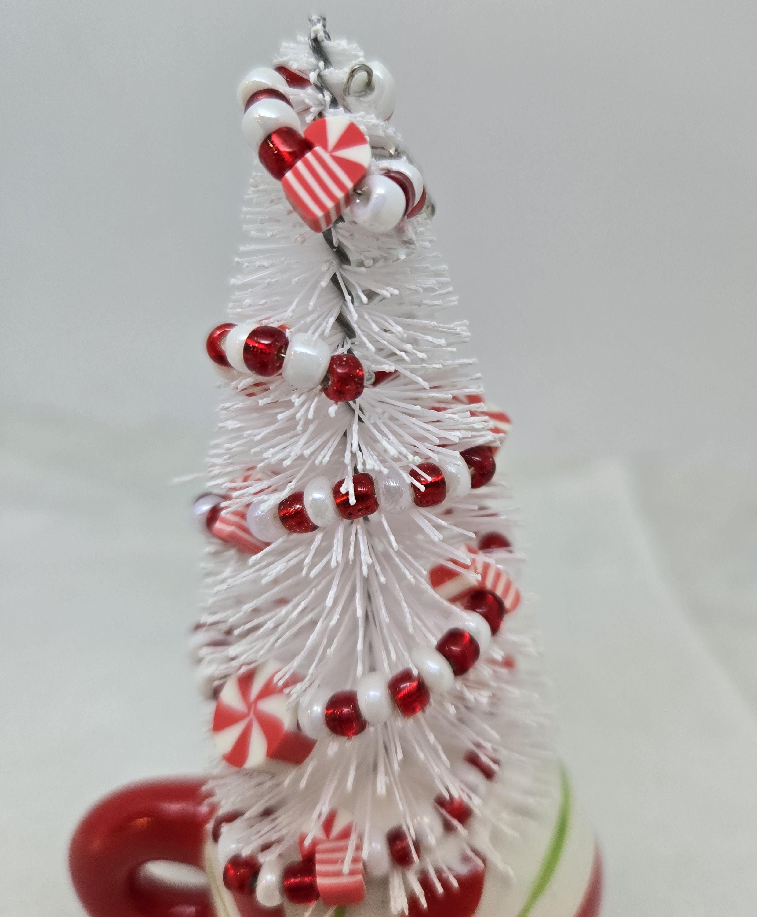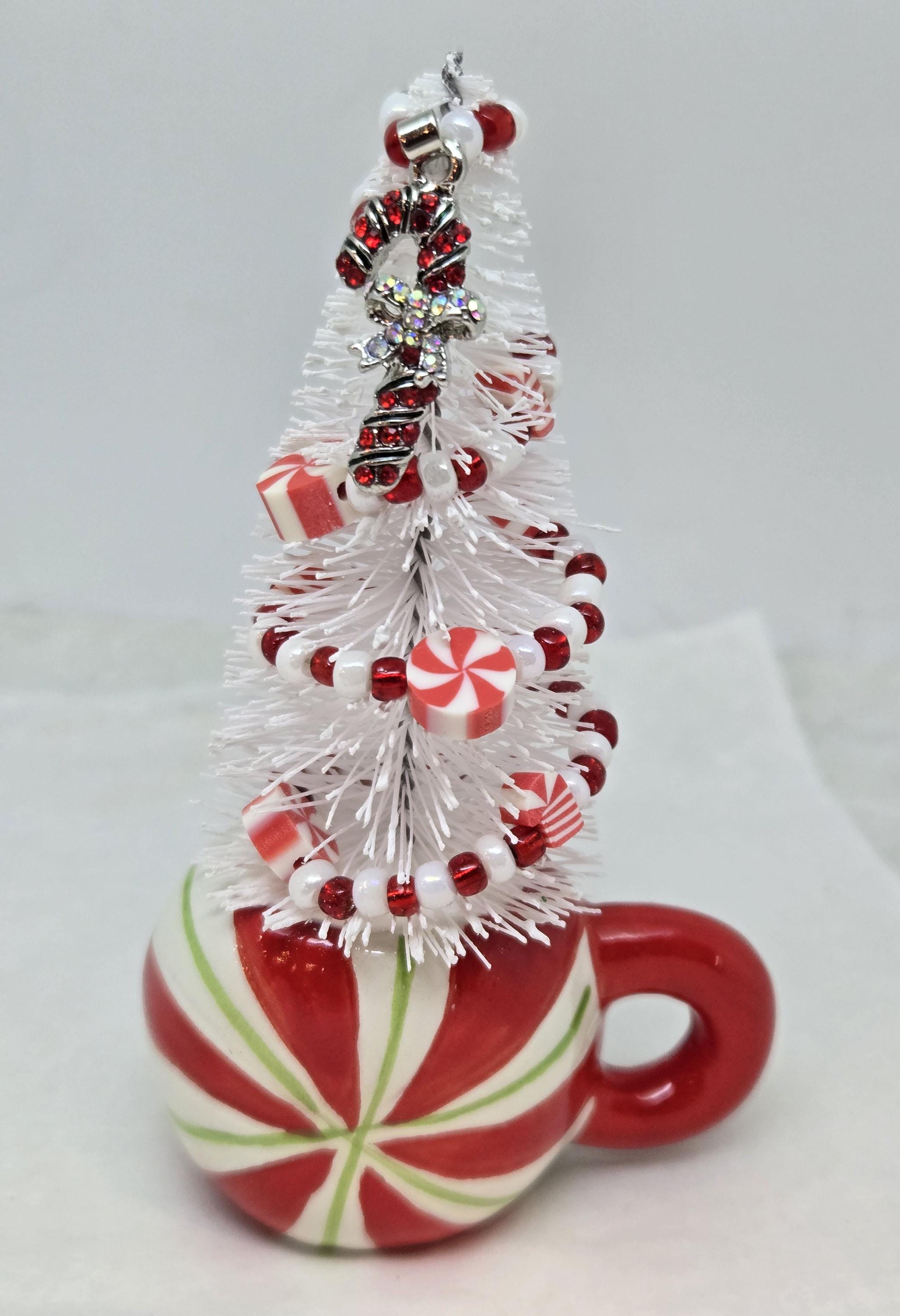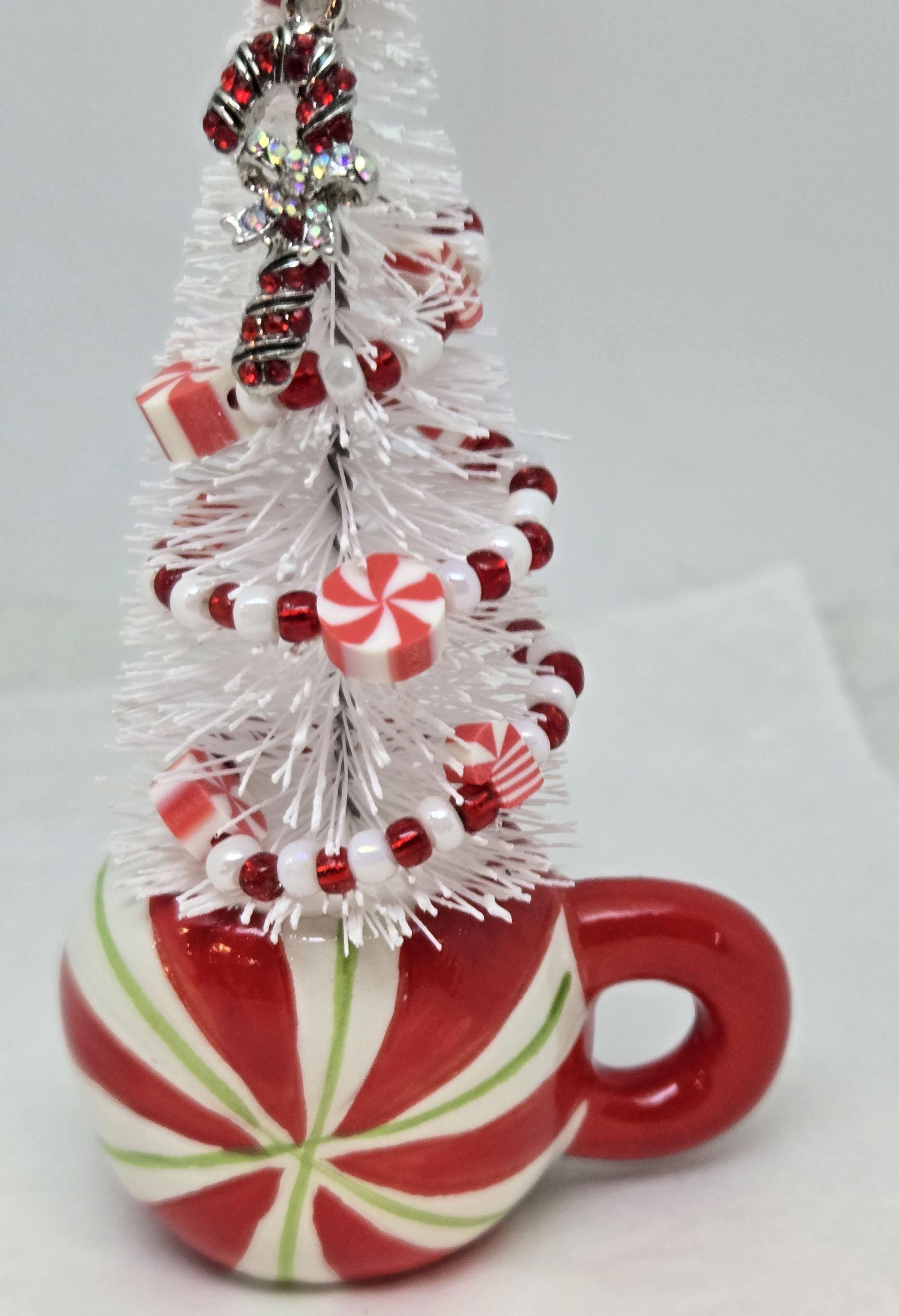 One of a kind, handcrafted Candy Cane Themed Miniature Holiday Tree. The tree stands 4 14 inches tall. The mini mug is ceramic. The tree is secured in the cup with styrofoam and artificial snow. I decorated the tree with beads and candy charms I strung on wire. I think this is a fun, colorful piece to nestle in with other decorations, give as a gift or use to decorate your desk.