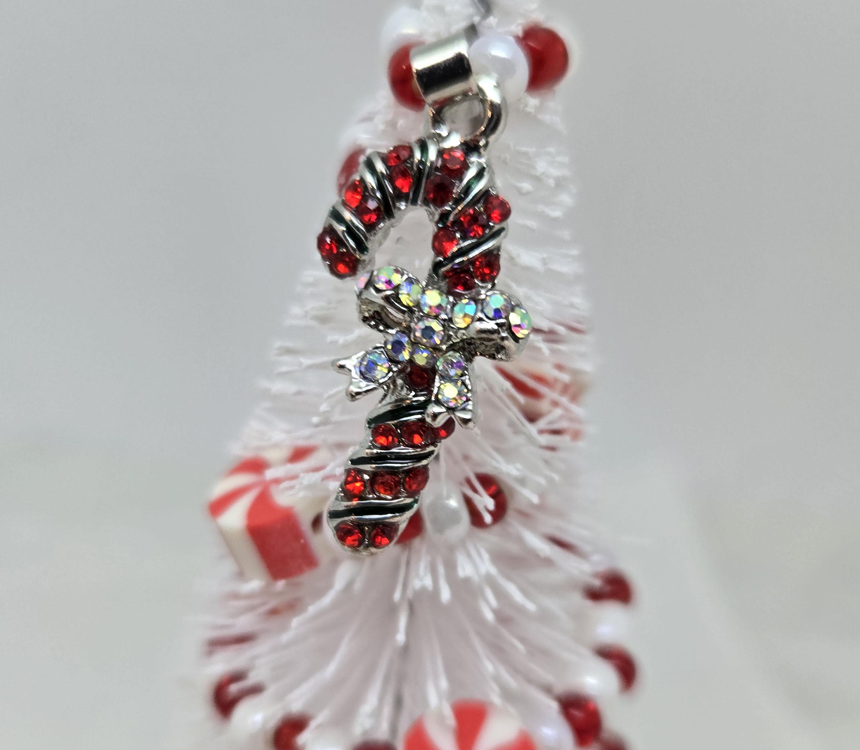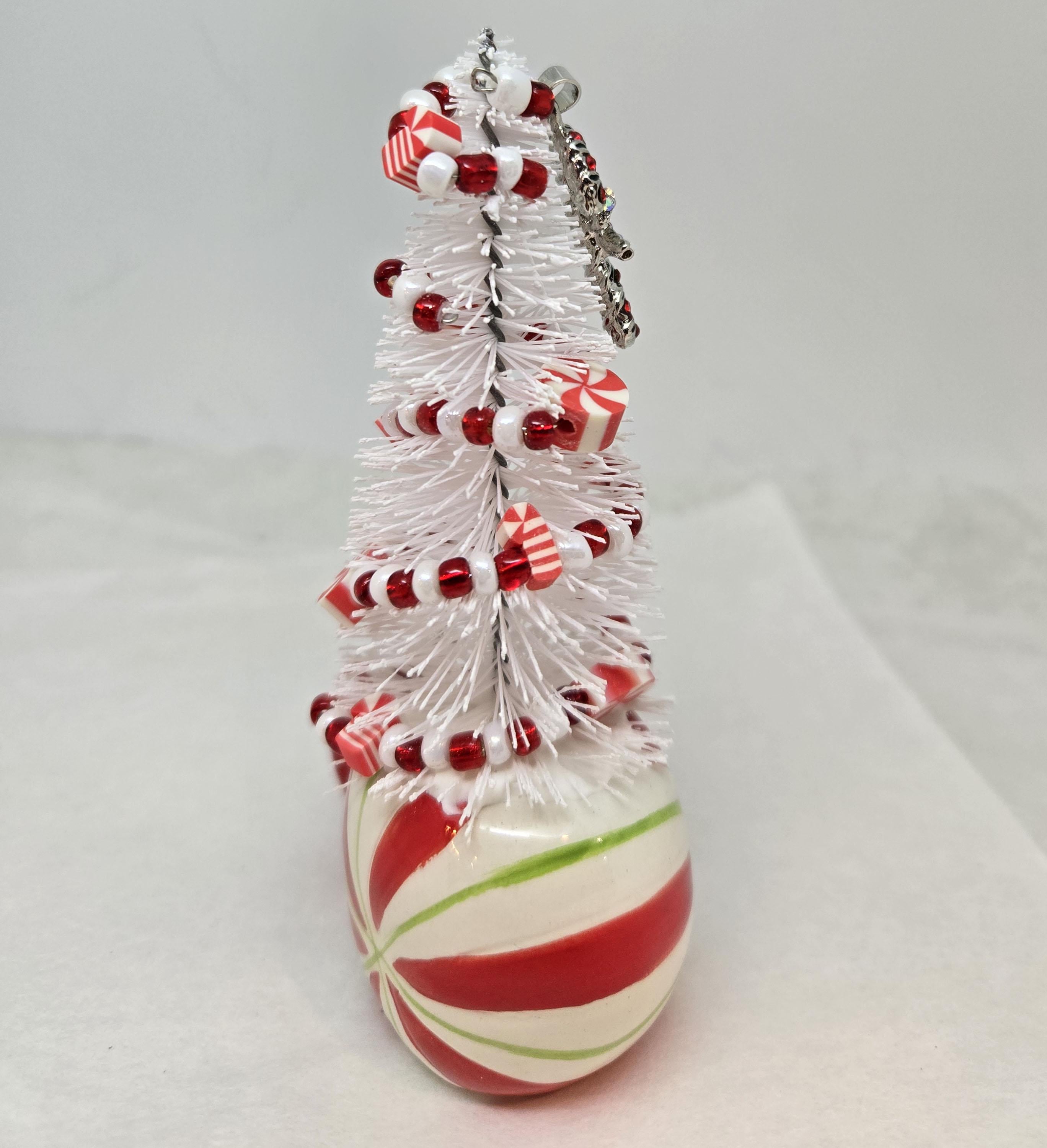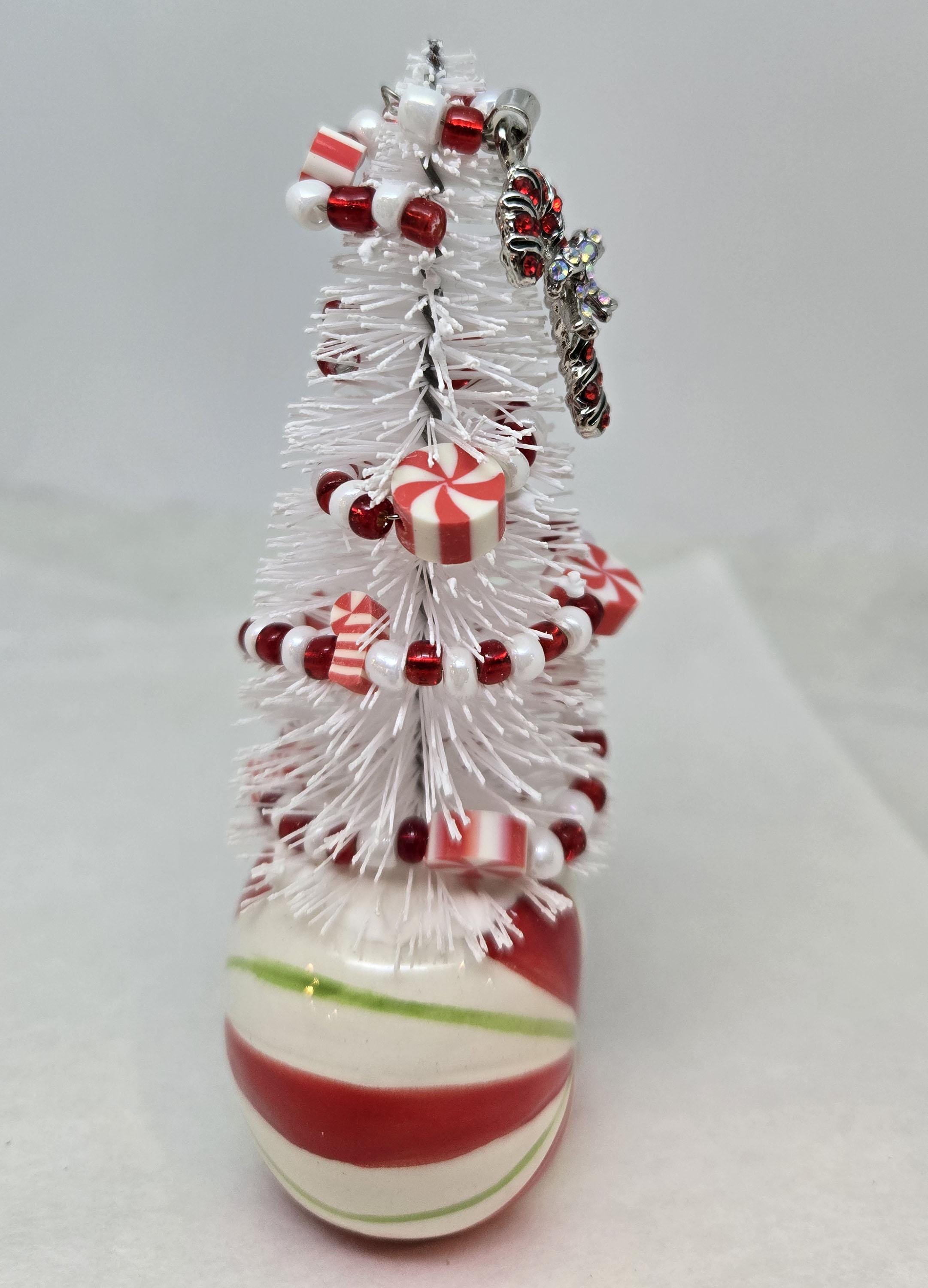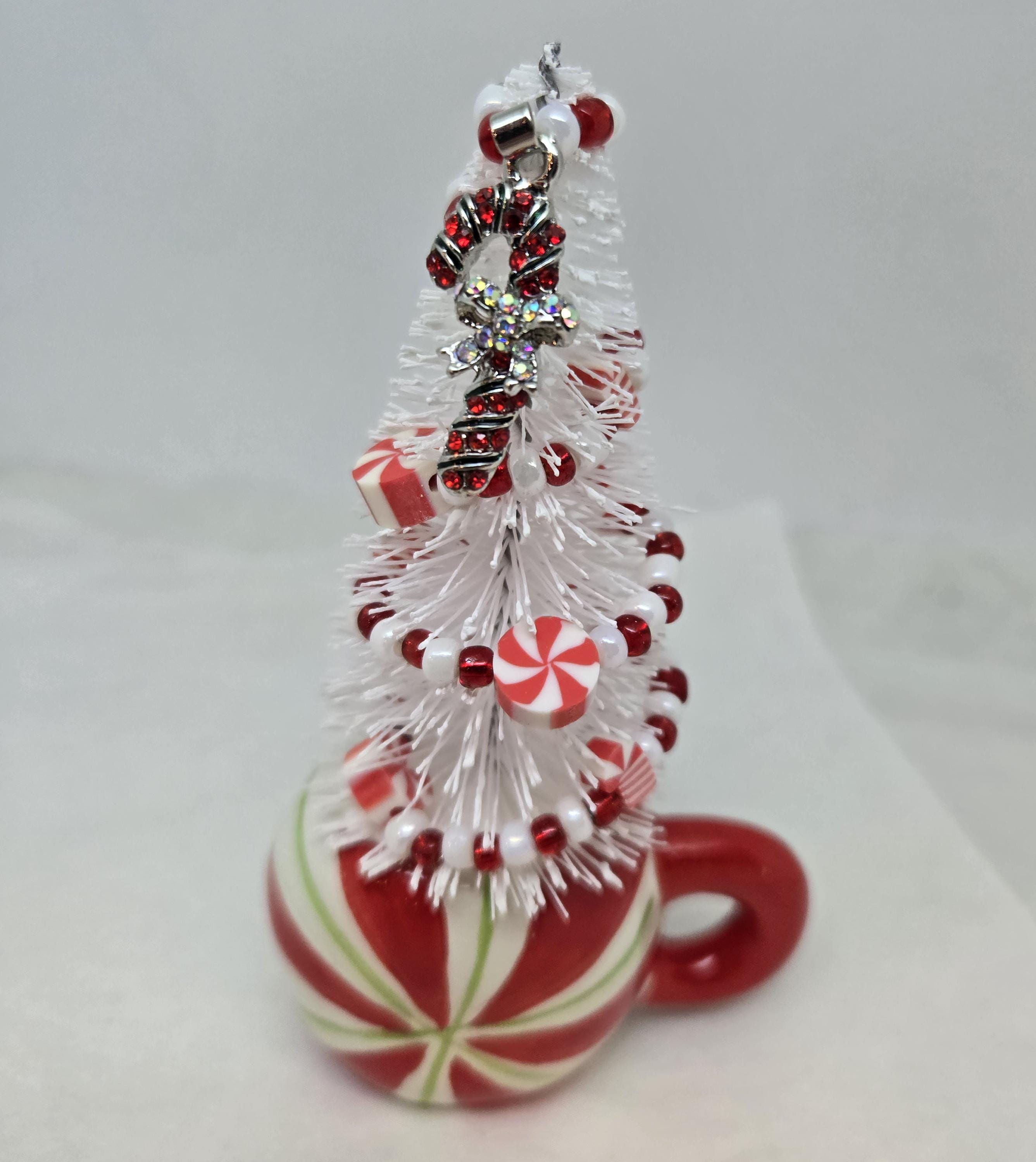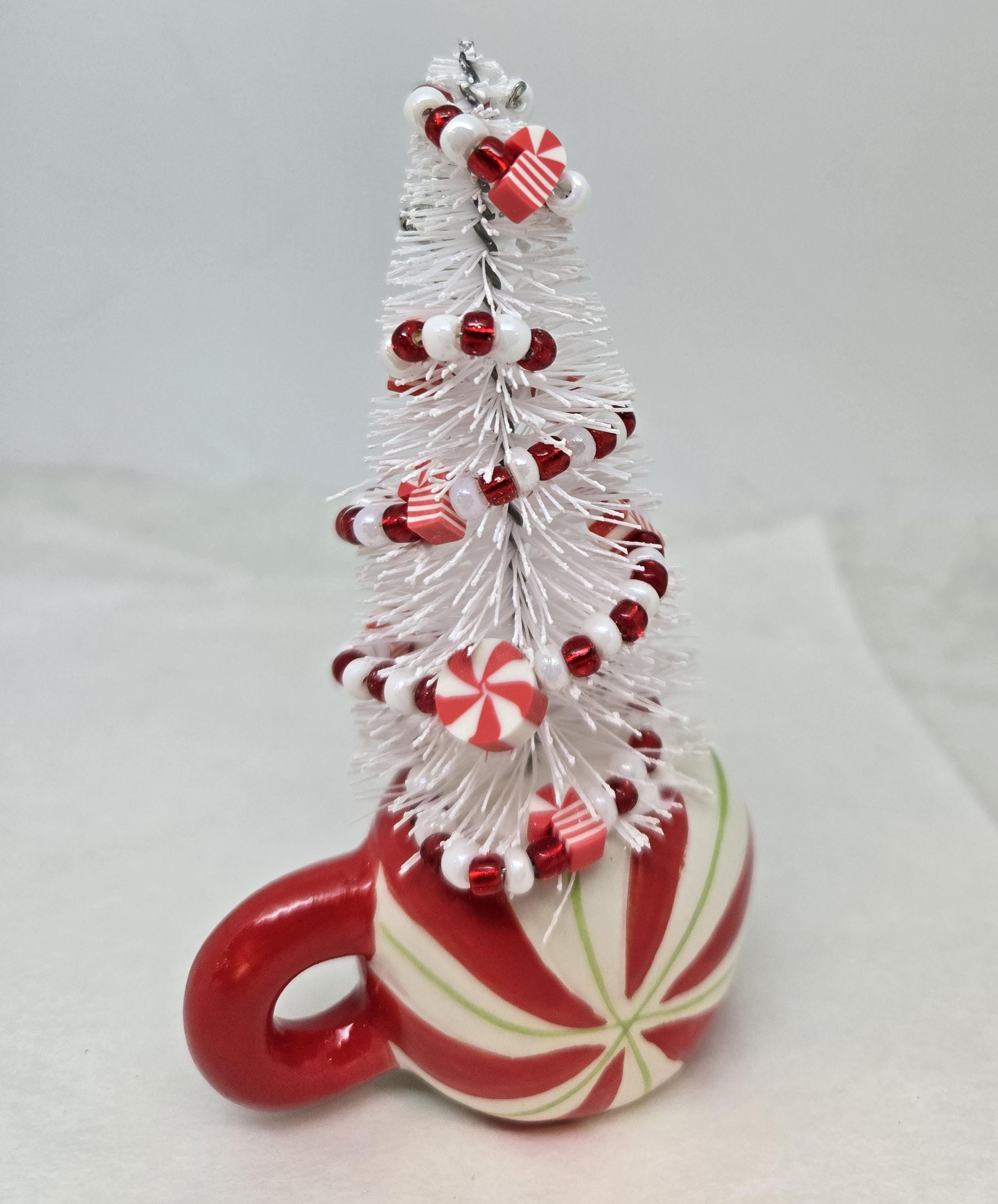 One of a kind, handcrafted Candy Cane Themed Miniature Holiday Tree. The tree stands 4 14 inches tall. The mini mug is ceramic. The tree is secured in the cup with styrofoam and artificial snow. I decorated the tree with beads and candy charms I strung on wire. I think this is a fun, colorful piece to nestle in with other decorations, give as a gift or use to decorate your desk.