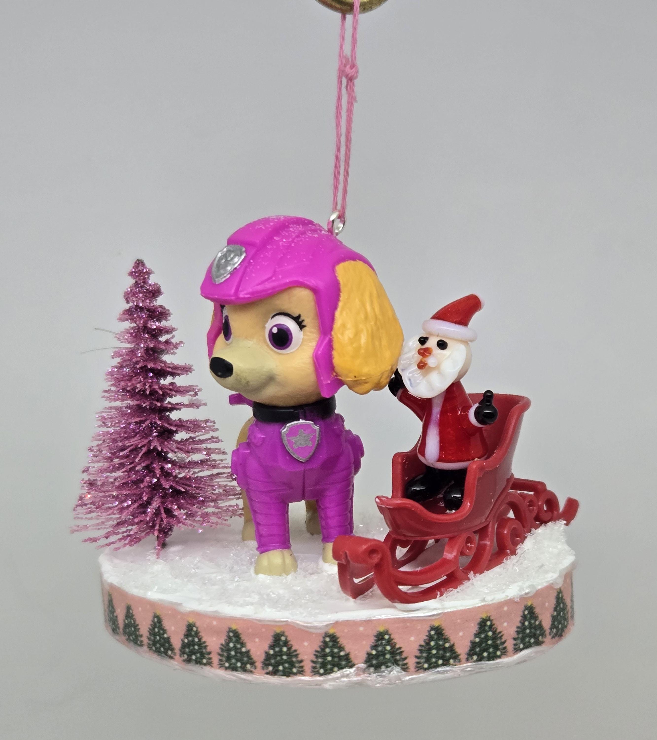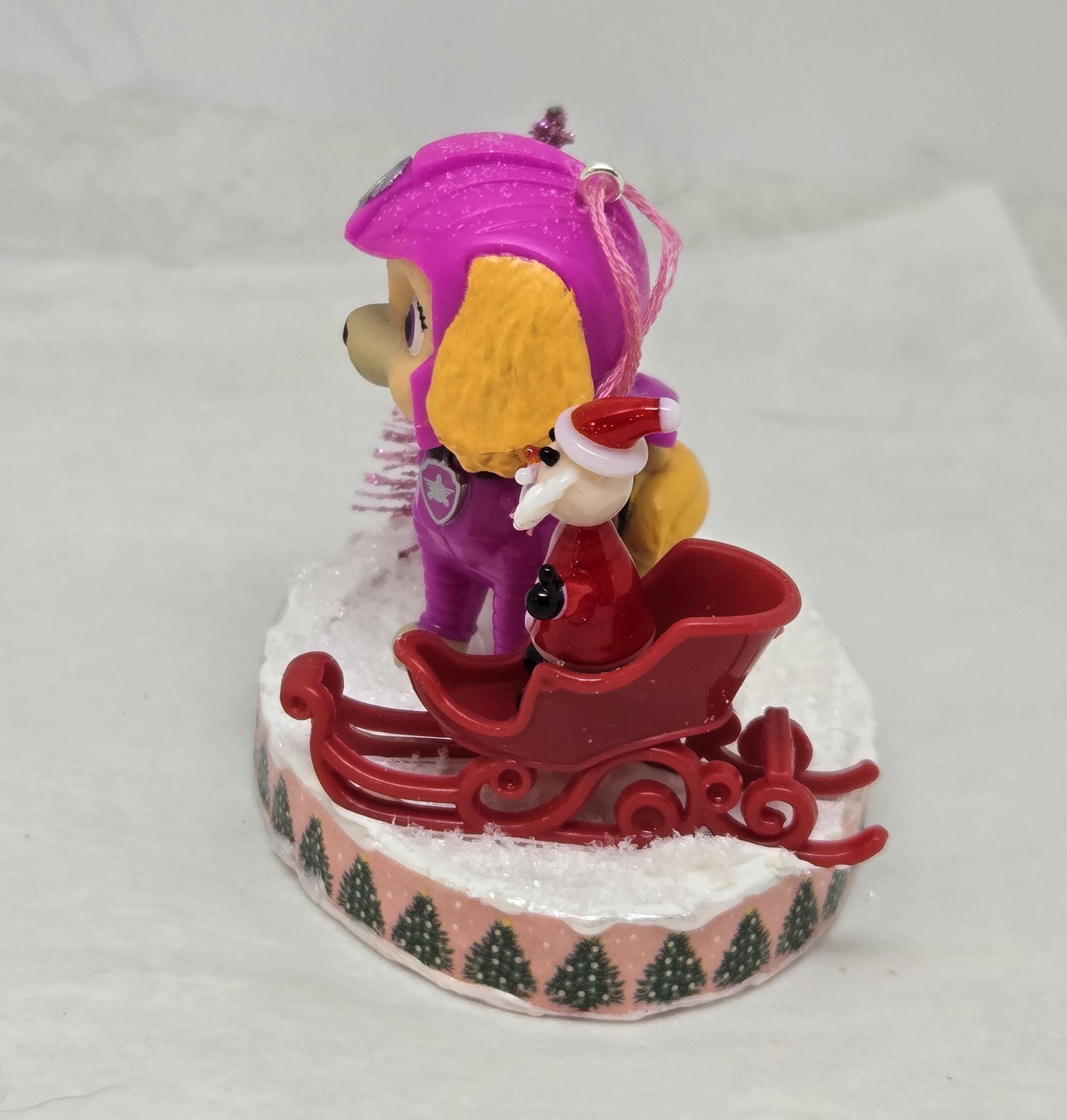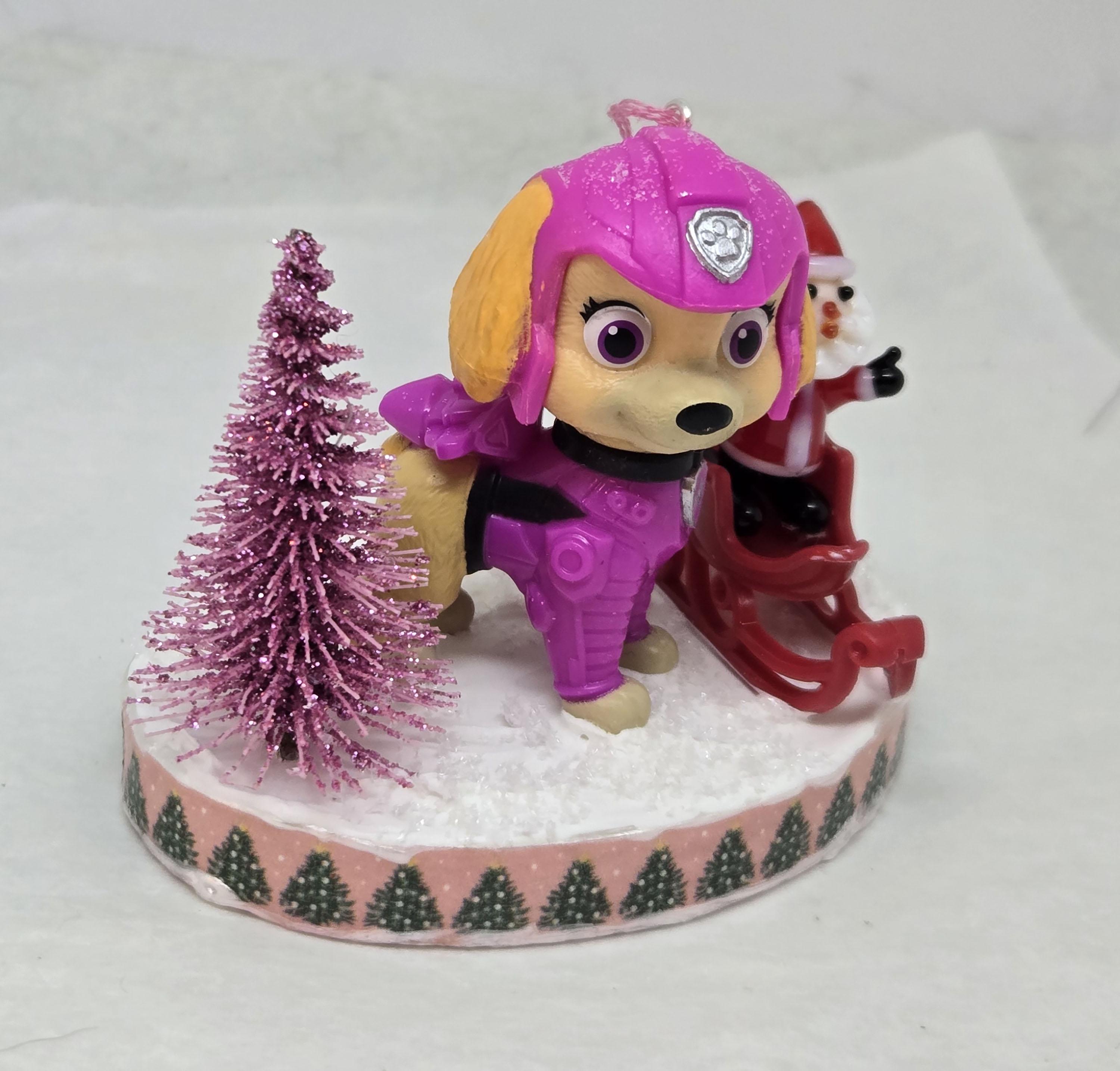 One of a kind, handcrafted Skye, Paw Patrol Christmas Ornament. Skye is conferring with Santa about taking over for Rudolph. Skye is a toy figurine I repurposed into this fun ornament. Santa and the sleigh are plastic miniature figurines. The base of this ornament is wood. I covered the bottom with scrapbook paper. The sides were painted then covered with washi tape with Liquid Pearl acrylic paint added to the edges. The bottom and sides were then sealed with decoupage. I painted the top then covered it with artificial snow.