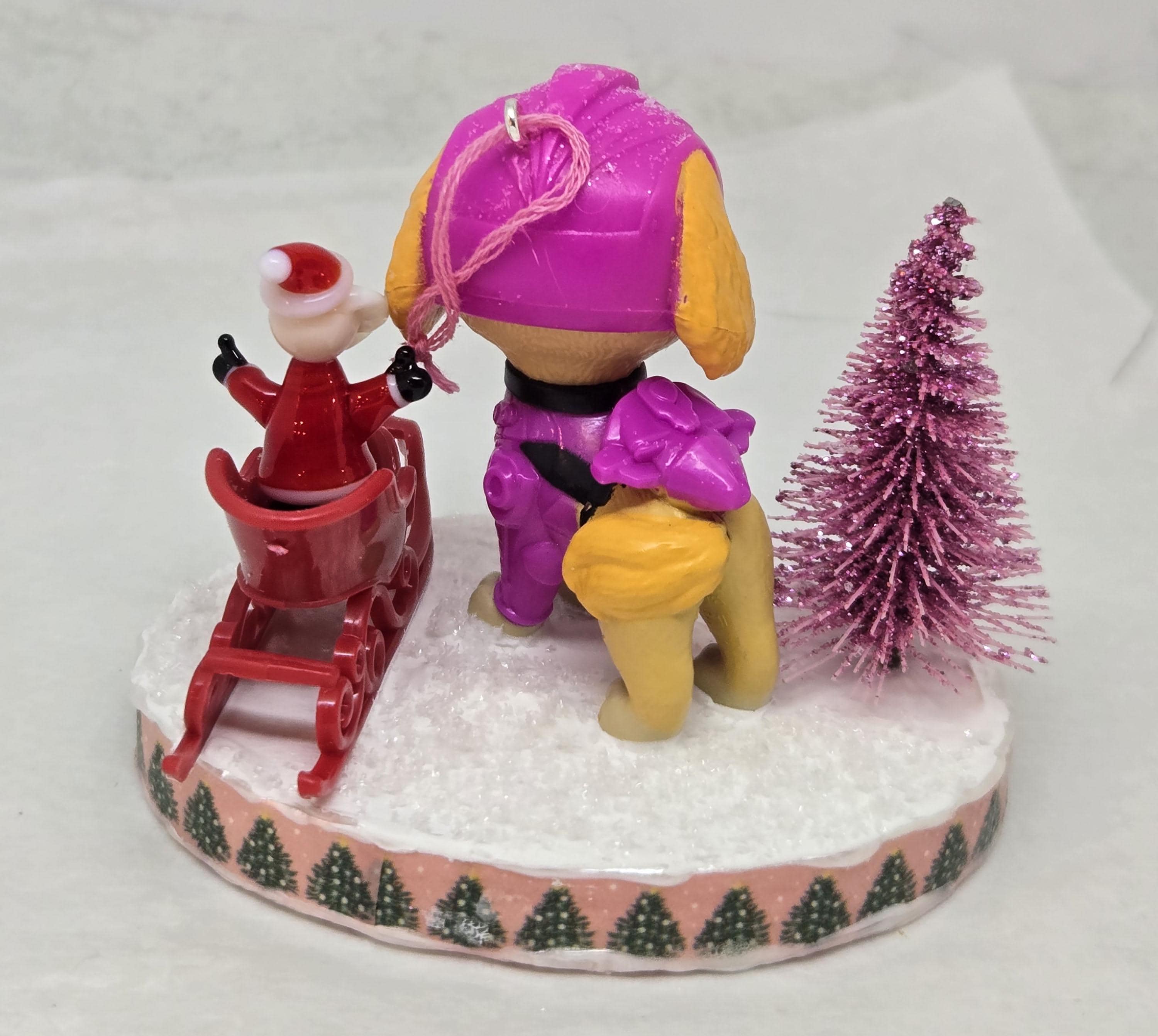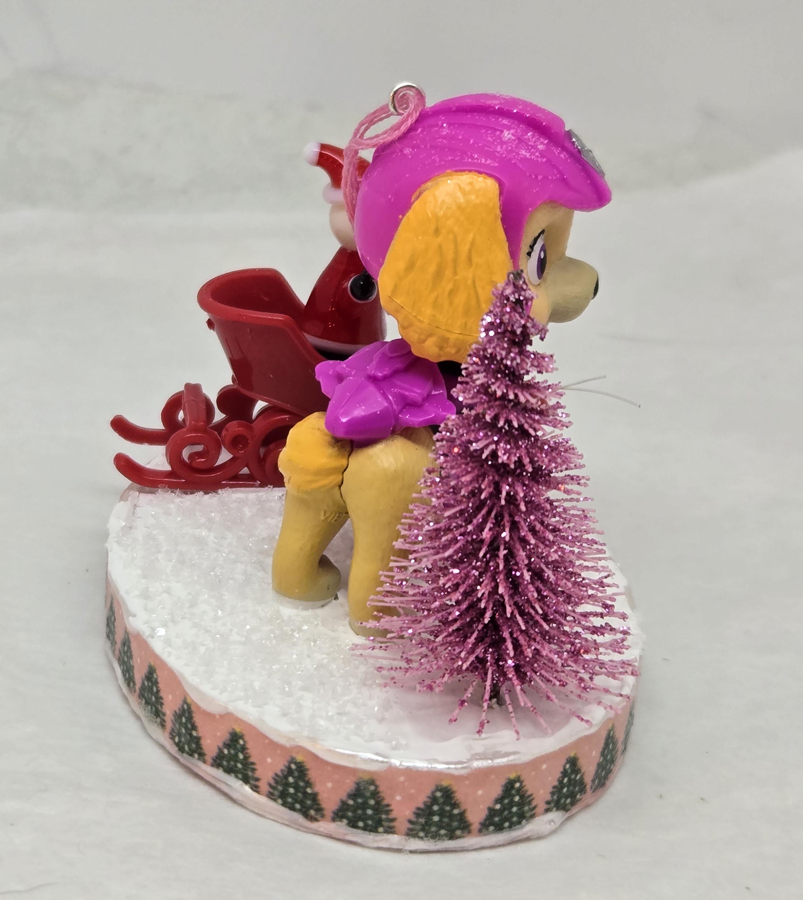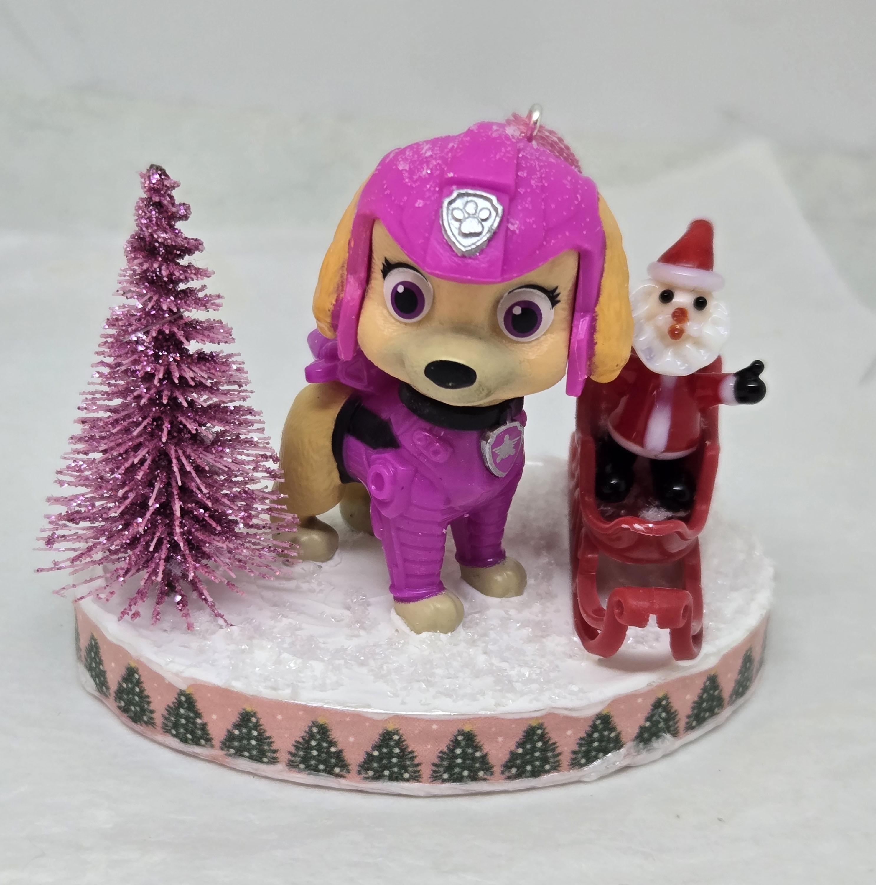 One of a kind, handcrafted Skye, Paw Patrol Christmas Ornament. Skye is conferring with Santa about taking over for Rudolph. Skye is a toy figurine I repurposed into this fun ornament. Santa and the sleigh are plastic miniature figurines. The base of this ornament is wood. I covered the bottom with scrapbook paper. The sides were painted then covered with washi tape with Liquid Pearl acrylic paint added to the edges. The bottom and sides were then sealed with decoupage. I painted the top then covered it with artificial snow.