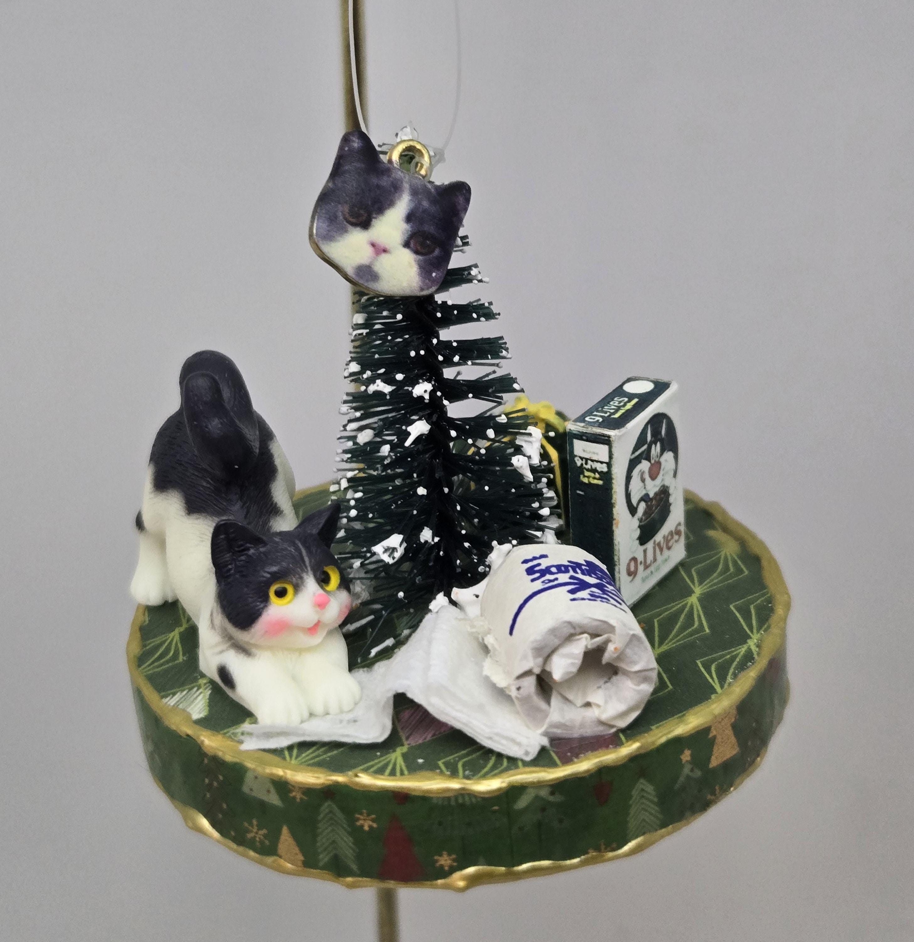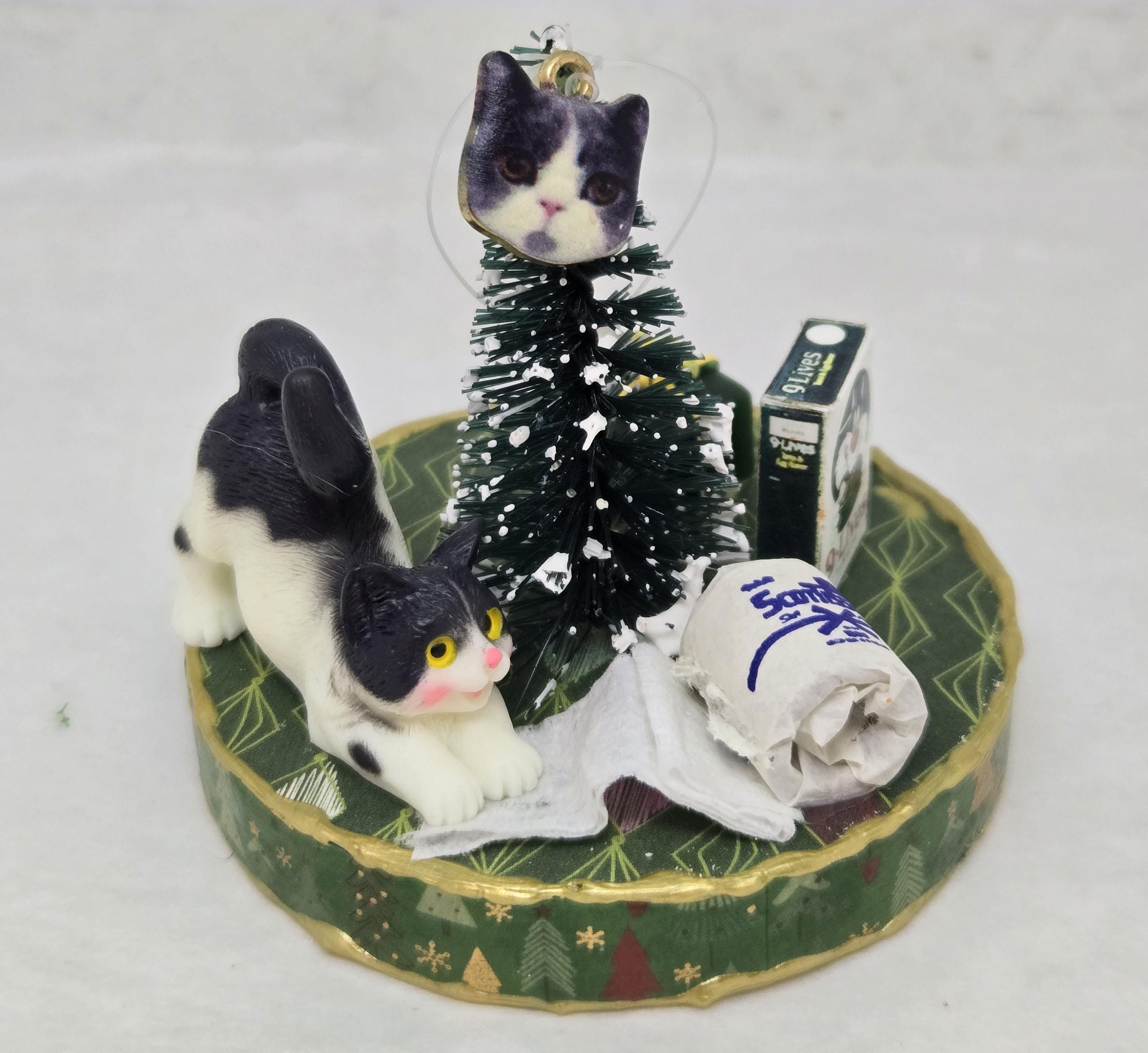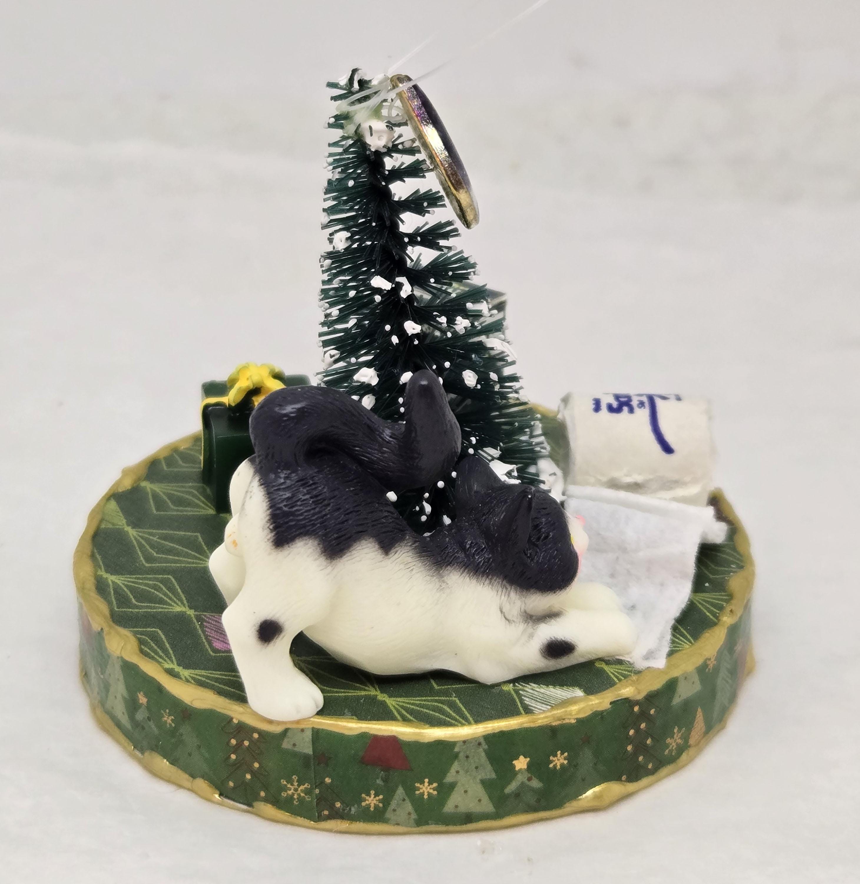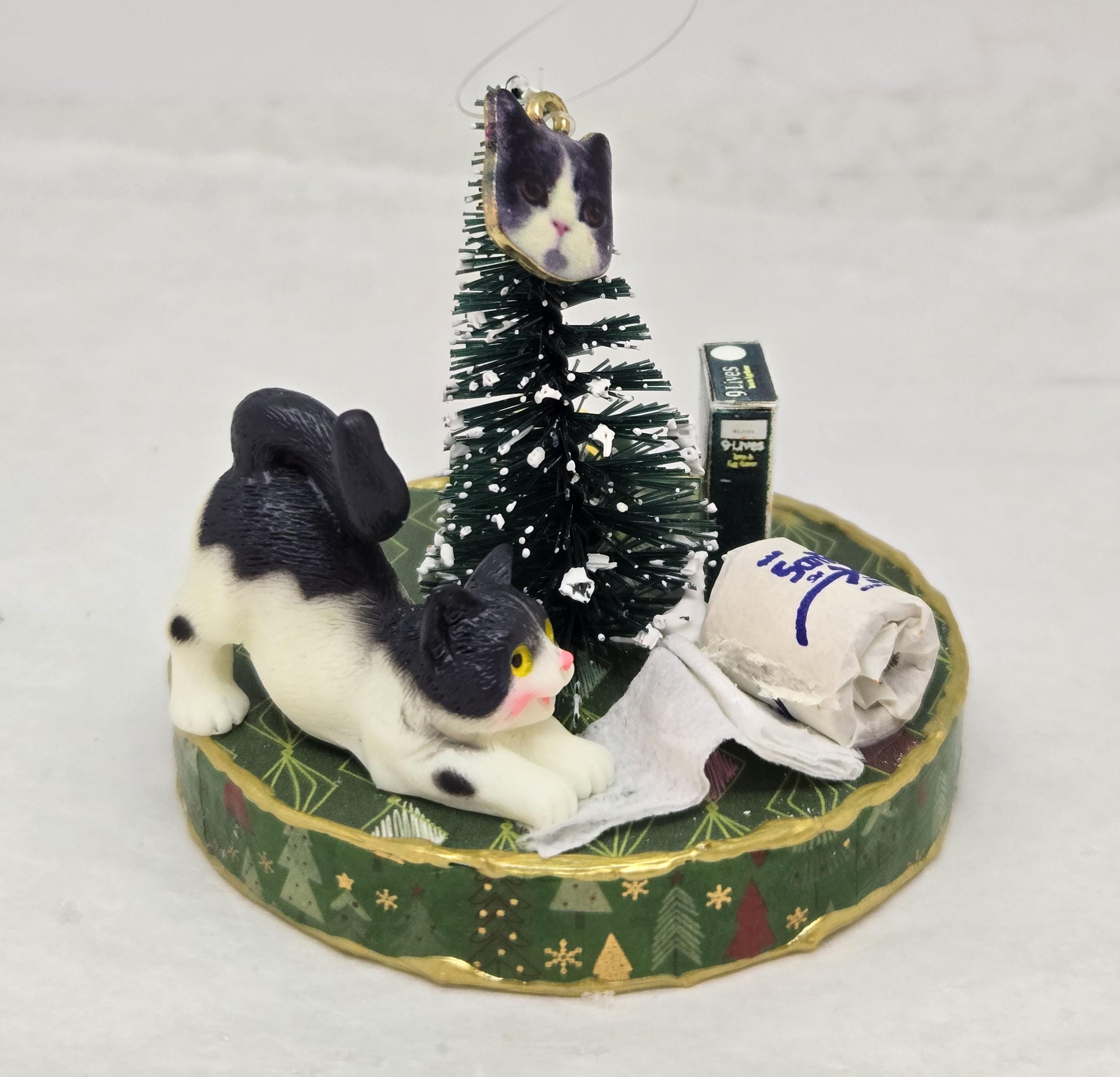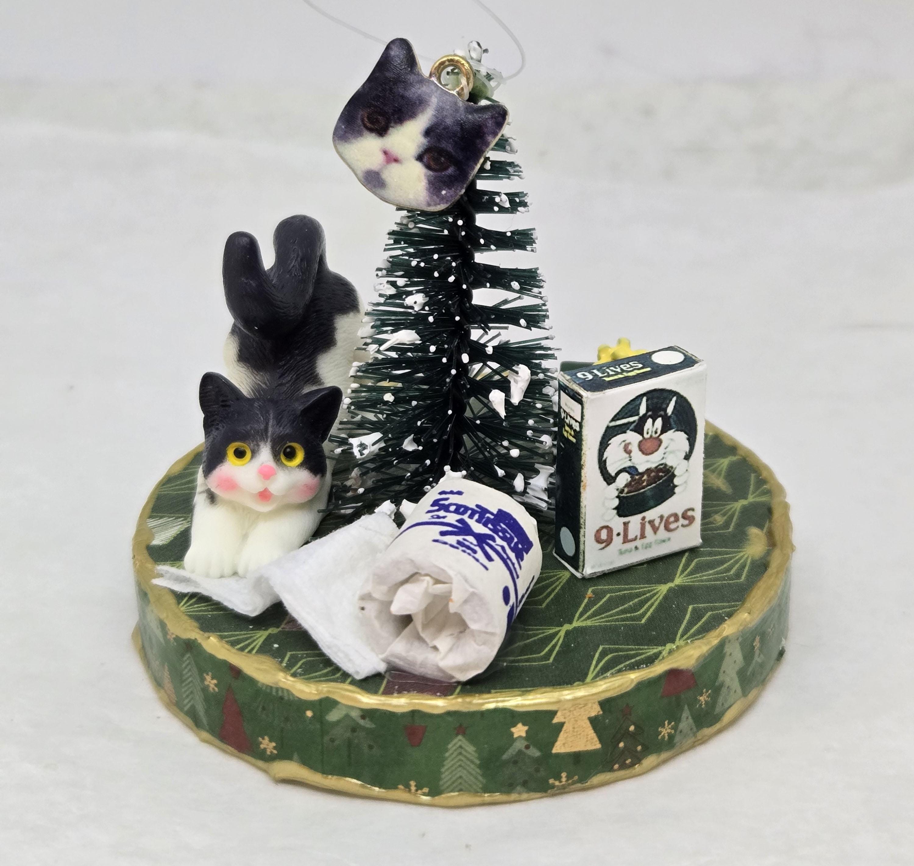 One of a kind, handcrafted Black and White Cat Christmas Ornament titled: Toilet Paper is One of my Favorite Things. The cat is a plastic miniature figurine. The toilet paper and box on 9 Lives are dollhouse miniature accessories. The tree is topped with a cat charm. The base of this ornament is wood. I covered the top and bottom with scrapbook paper. The sides were painted then covered with washi tape. I used Liquid Pearl paint on the edges. The entire base is sealed with decoupage.