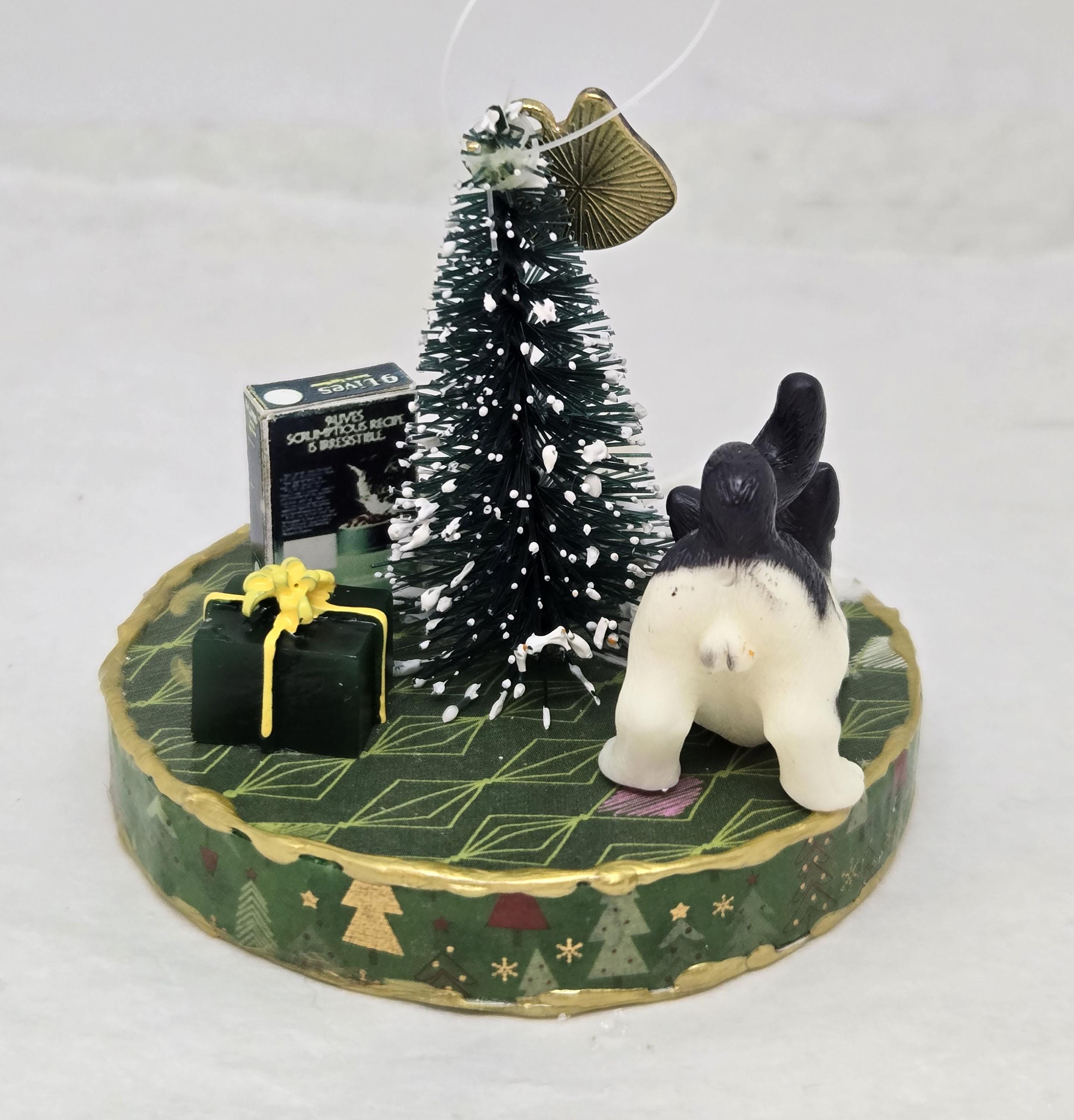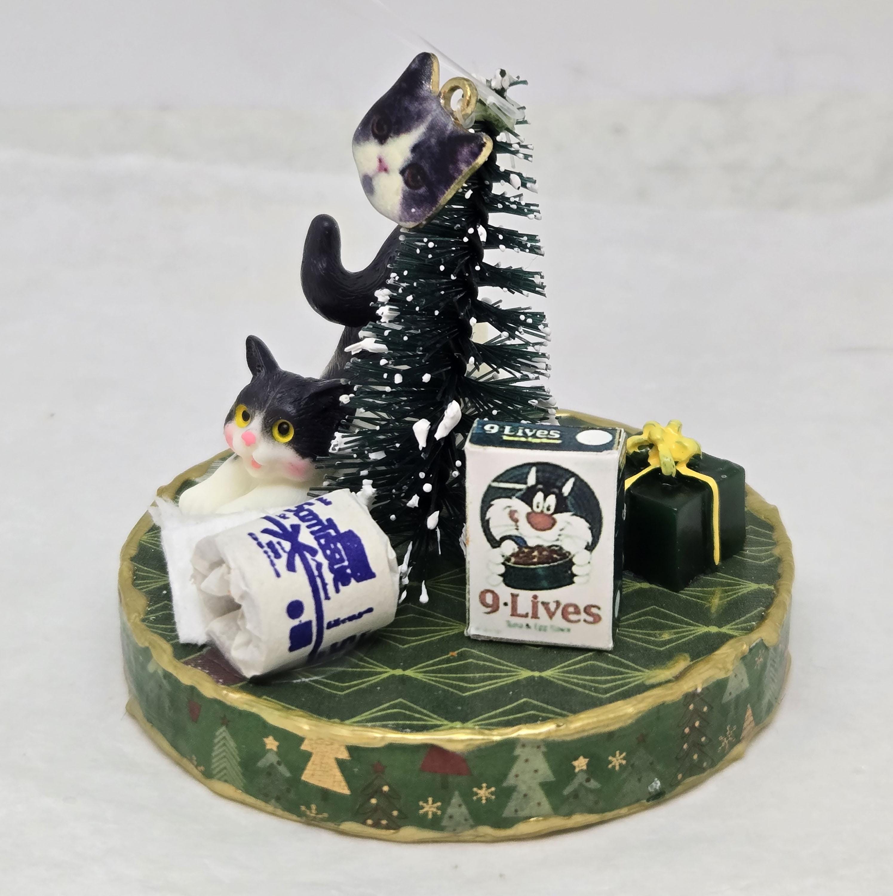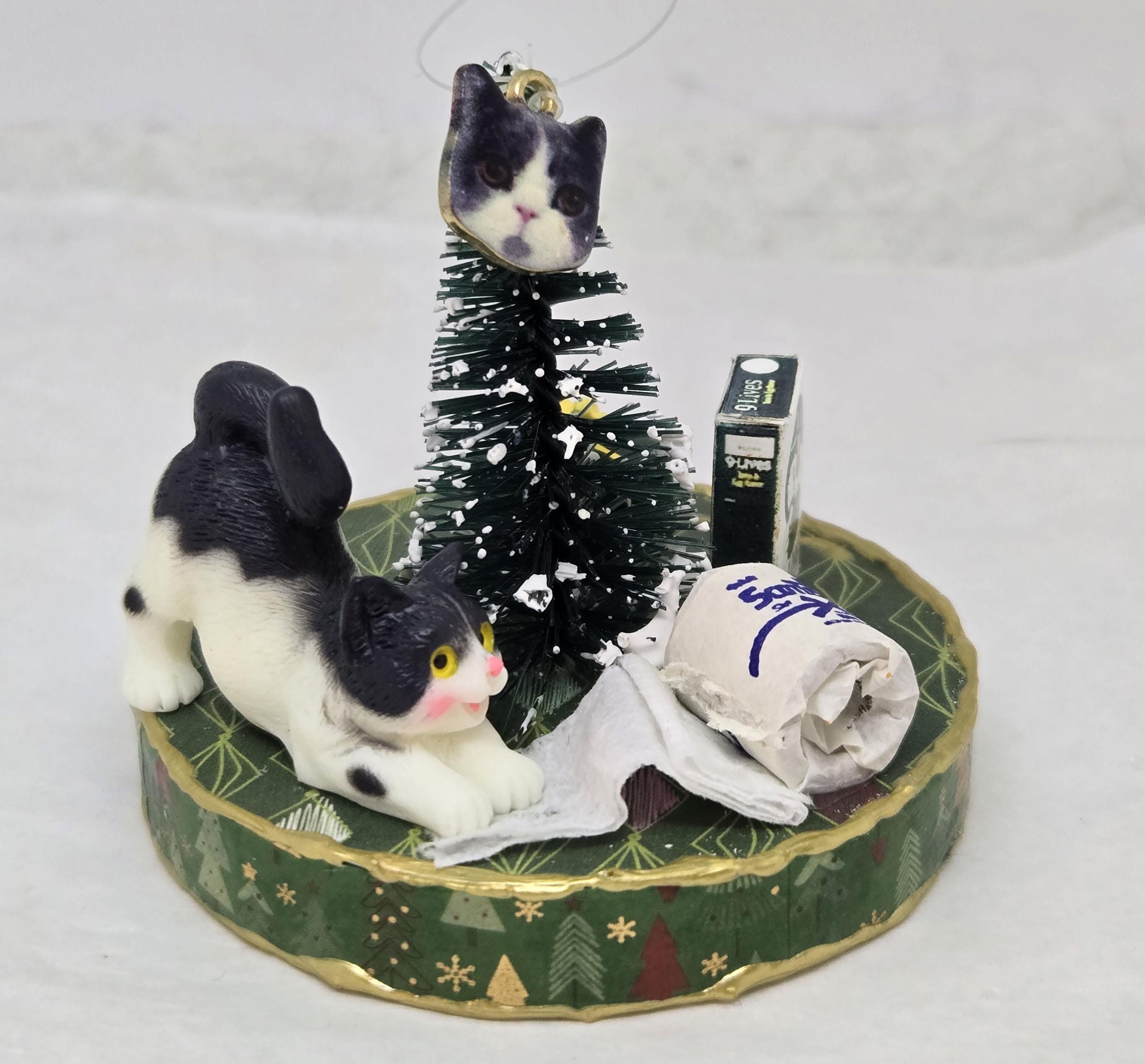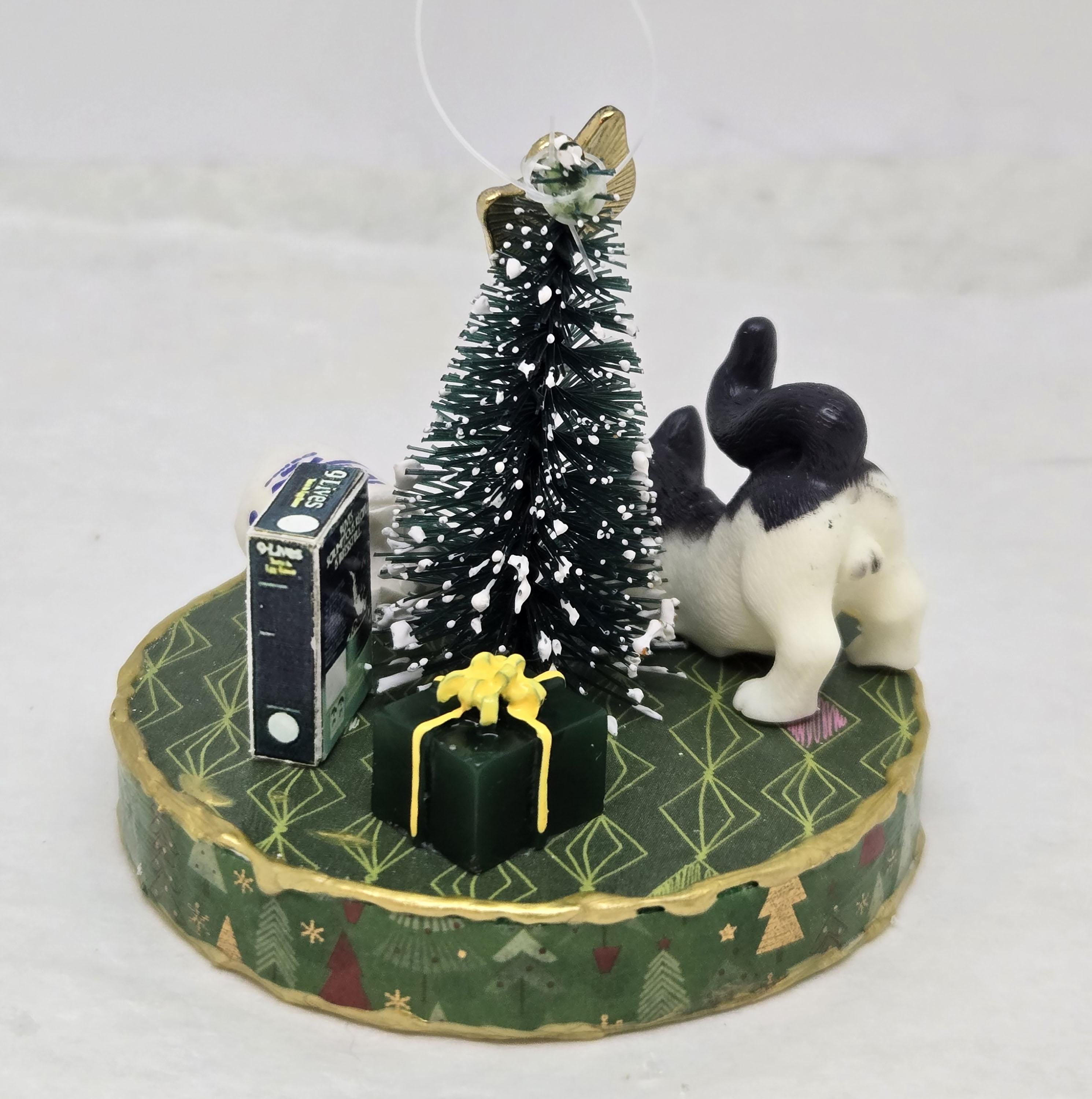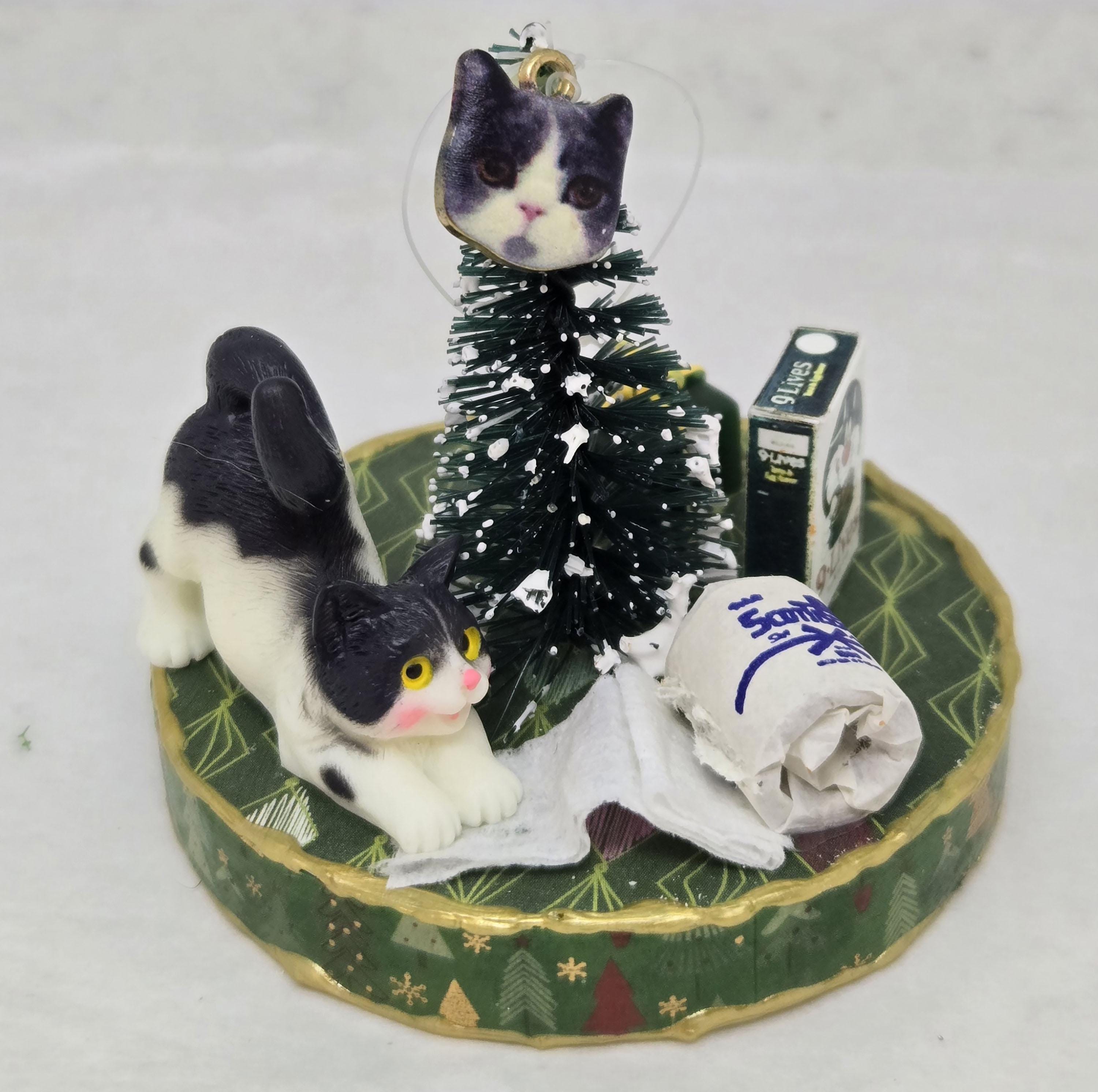 One of a kind, handcrafted Black and White Cat Christmas Ornament titled: Toilet Paper is One of my Favorite Things. The cat is a plastic miniature figurine. The toilet paper and box on 9 Lives are dollhouse miniature accessories. The tree is topped with a cat charm. The base of this ornament is wood. I covered the top and bottom with scrapbook paper. The sides were painted then covered with washi tape. I used Liquid Pearl paint on the edges. The entire base is sealed with decoupage.