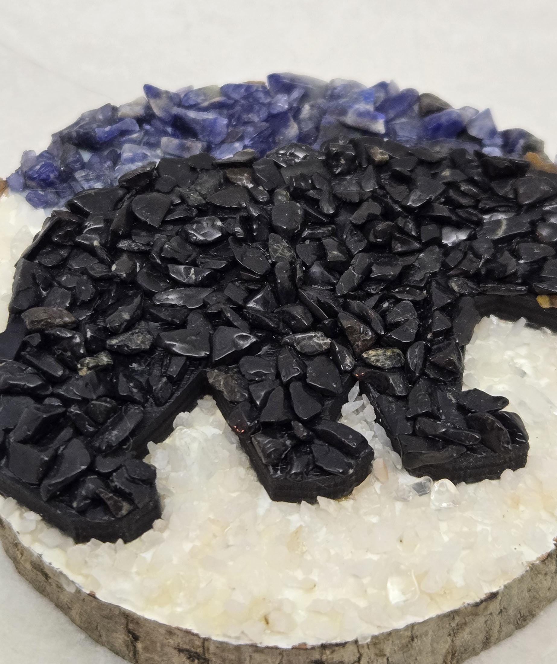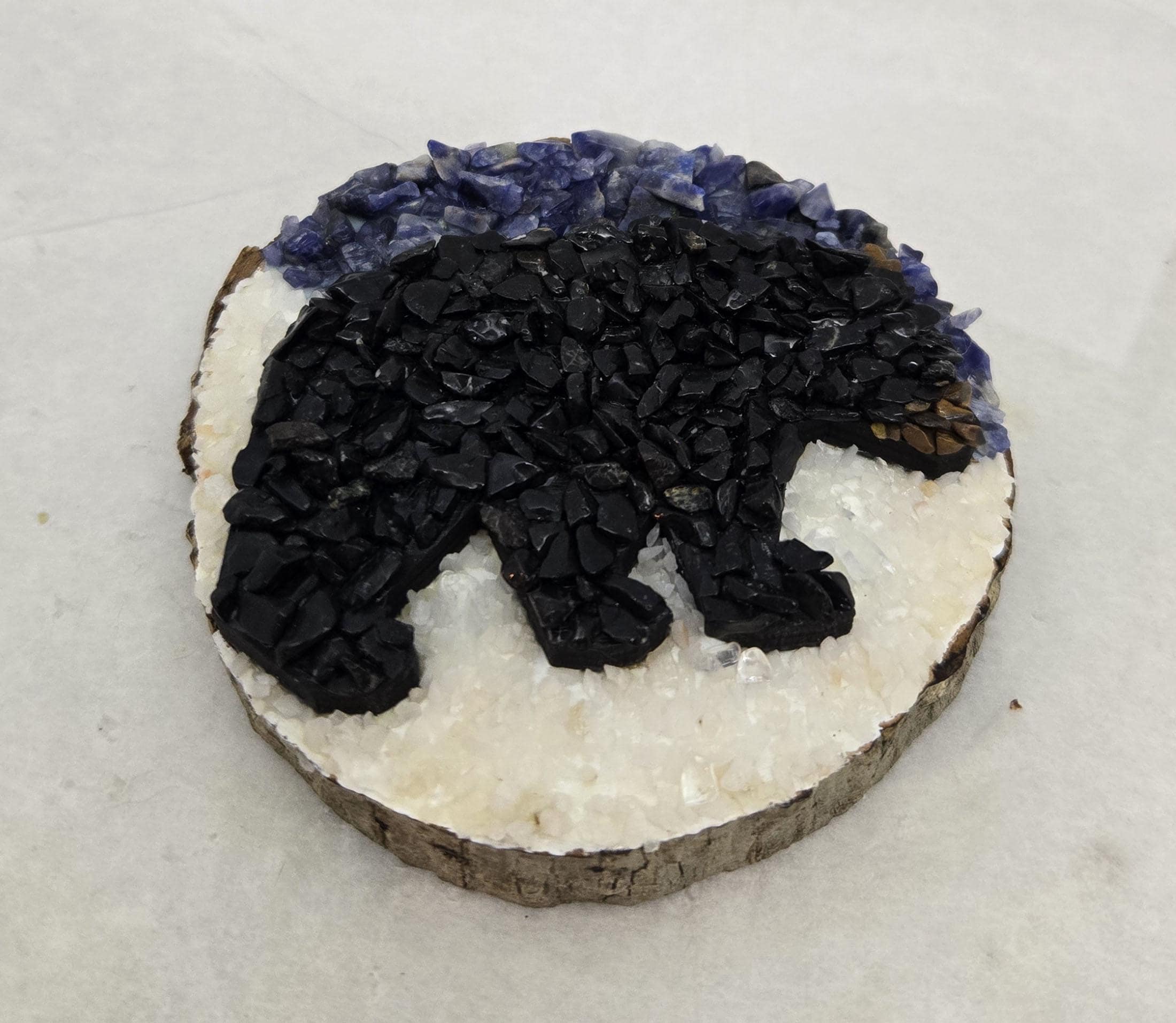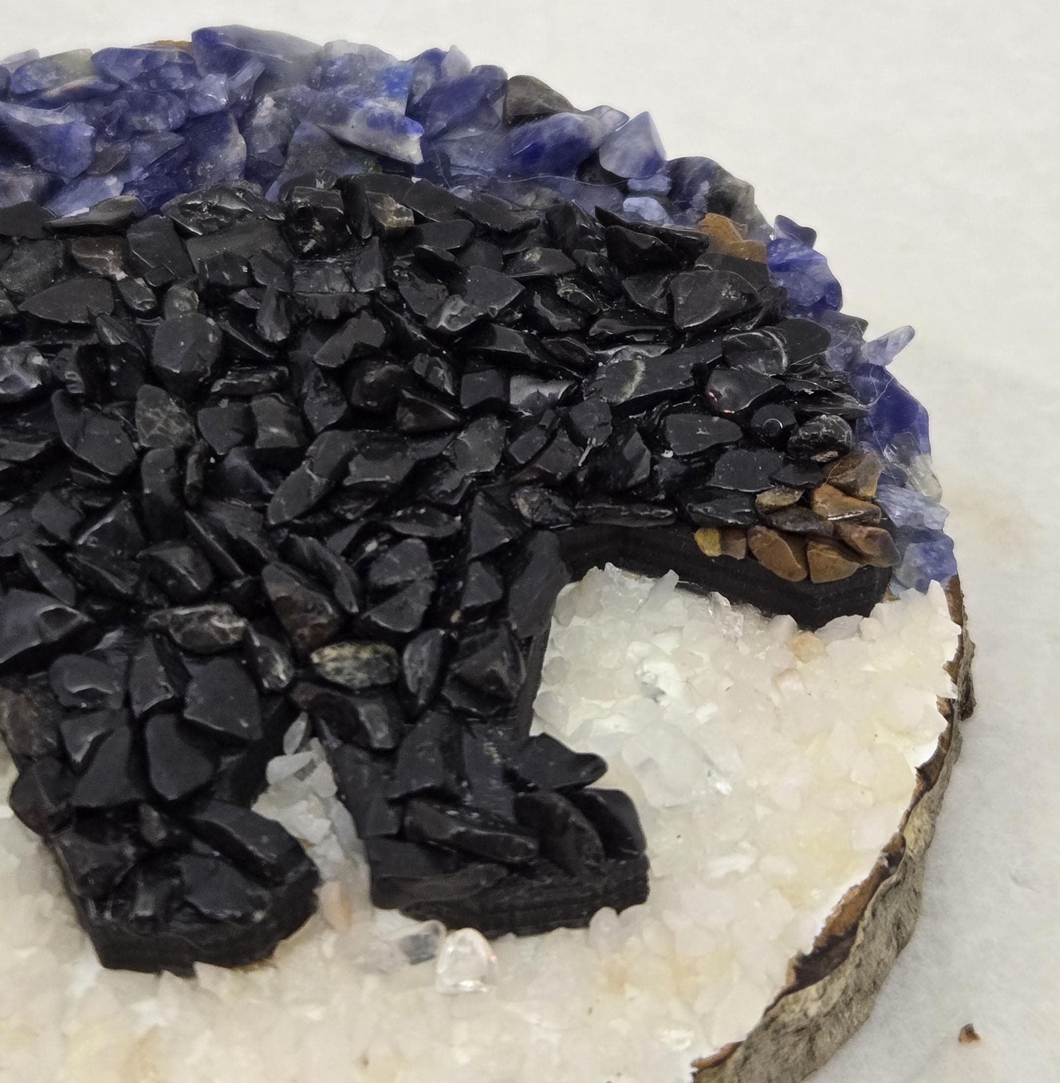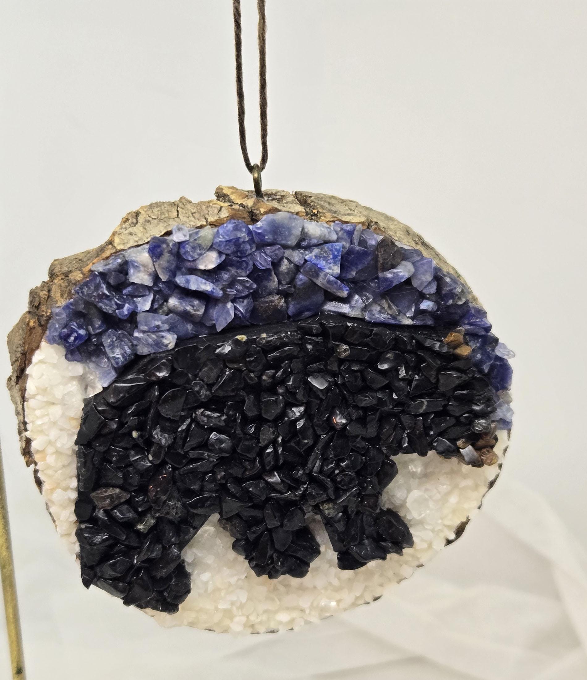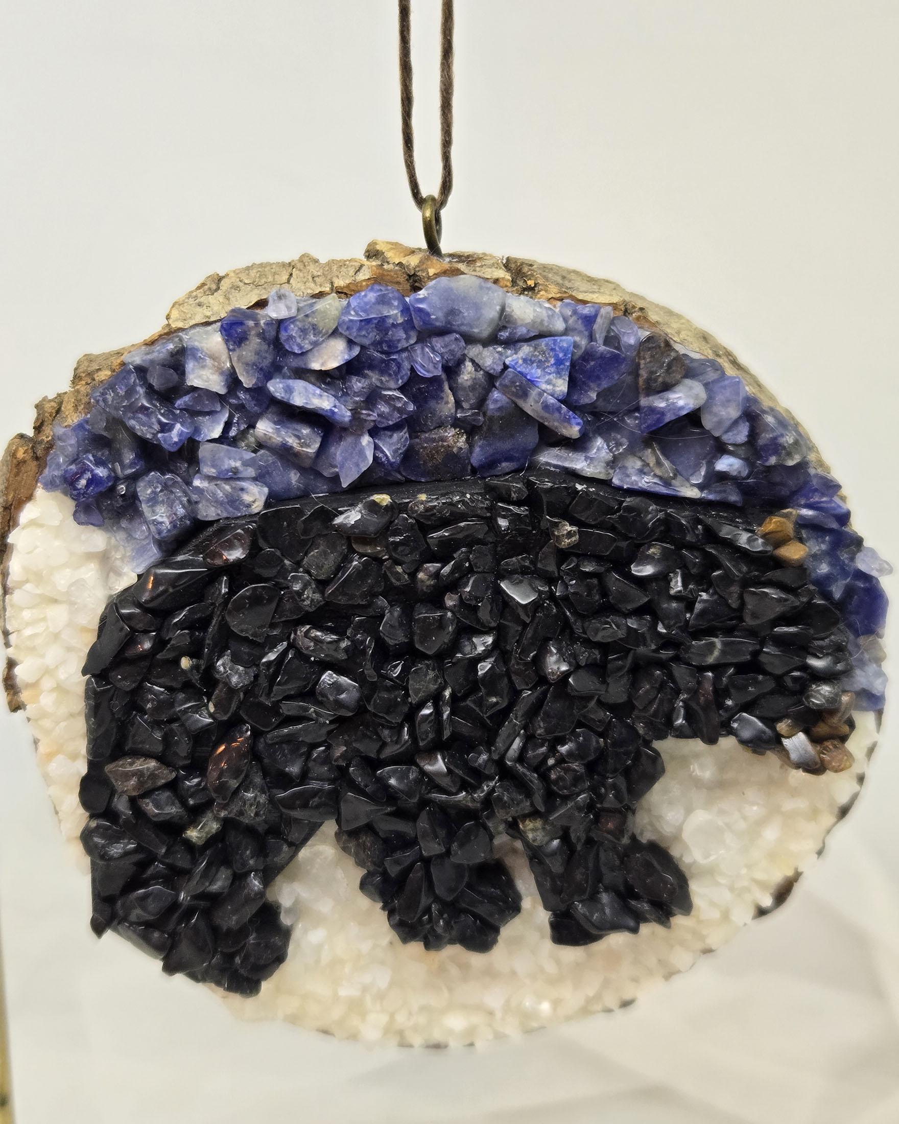 One of a kind, handcrafted Black Bear ornament titled: Walking in the Snow. I love bears, stones and snow and crafted this ornament to showcase all 3. The base of this is a slice of a tree branch. I painted the front surface before glueing on the stones. The bear is a wood cutout. The gemstones used to cover the base and bear are: Tourmaline, Tiger Eye, Moonstone and Sodalite.