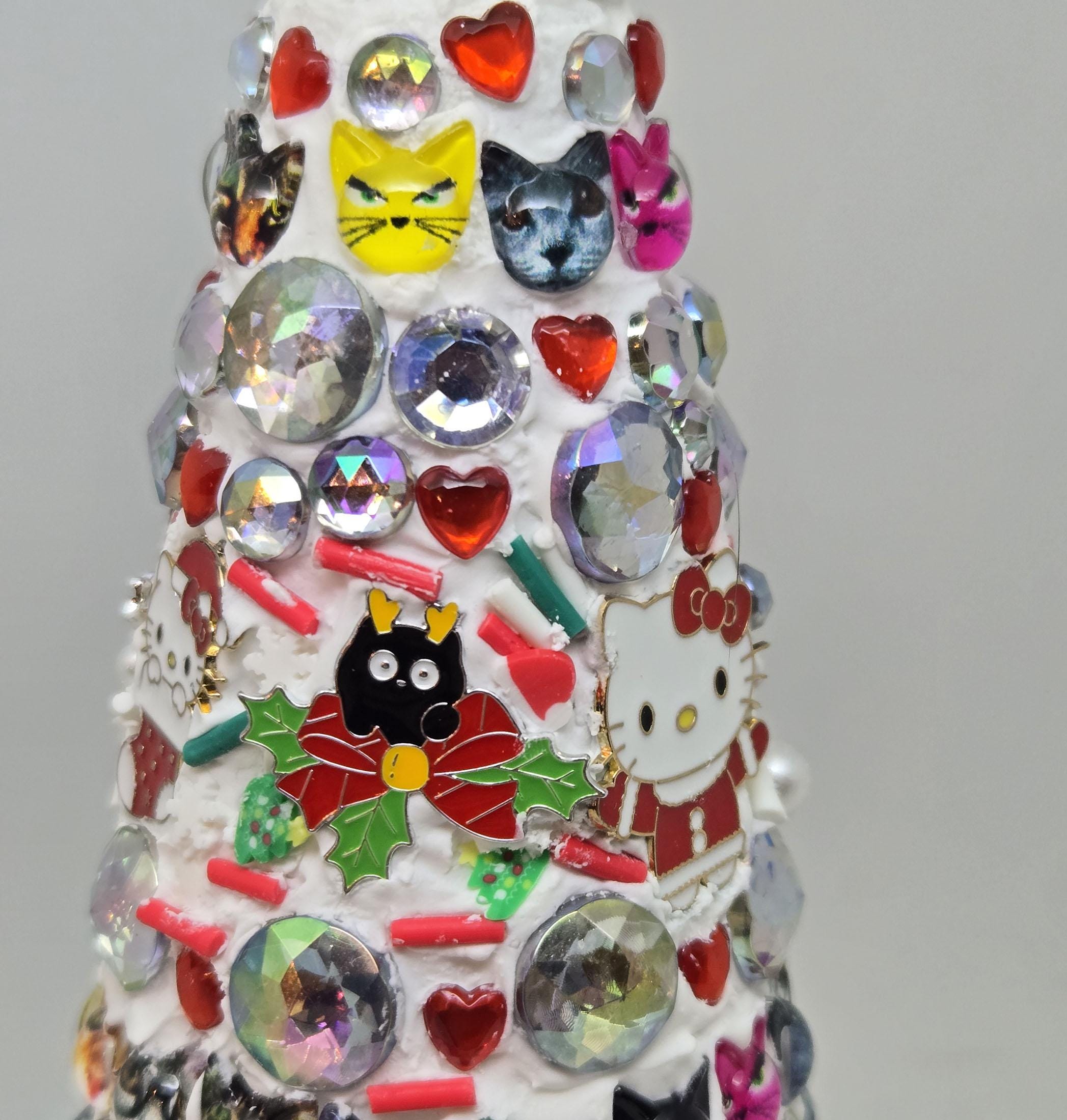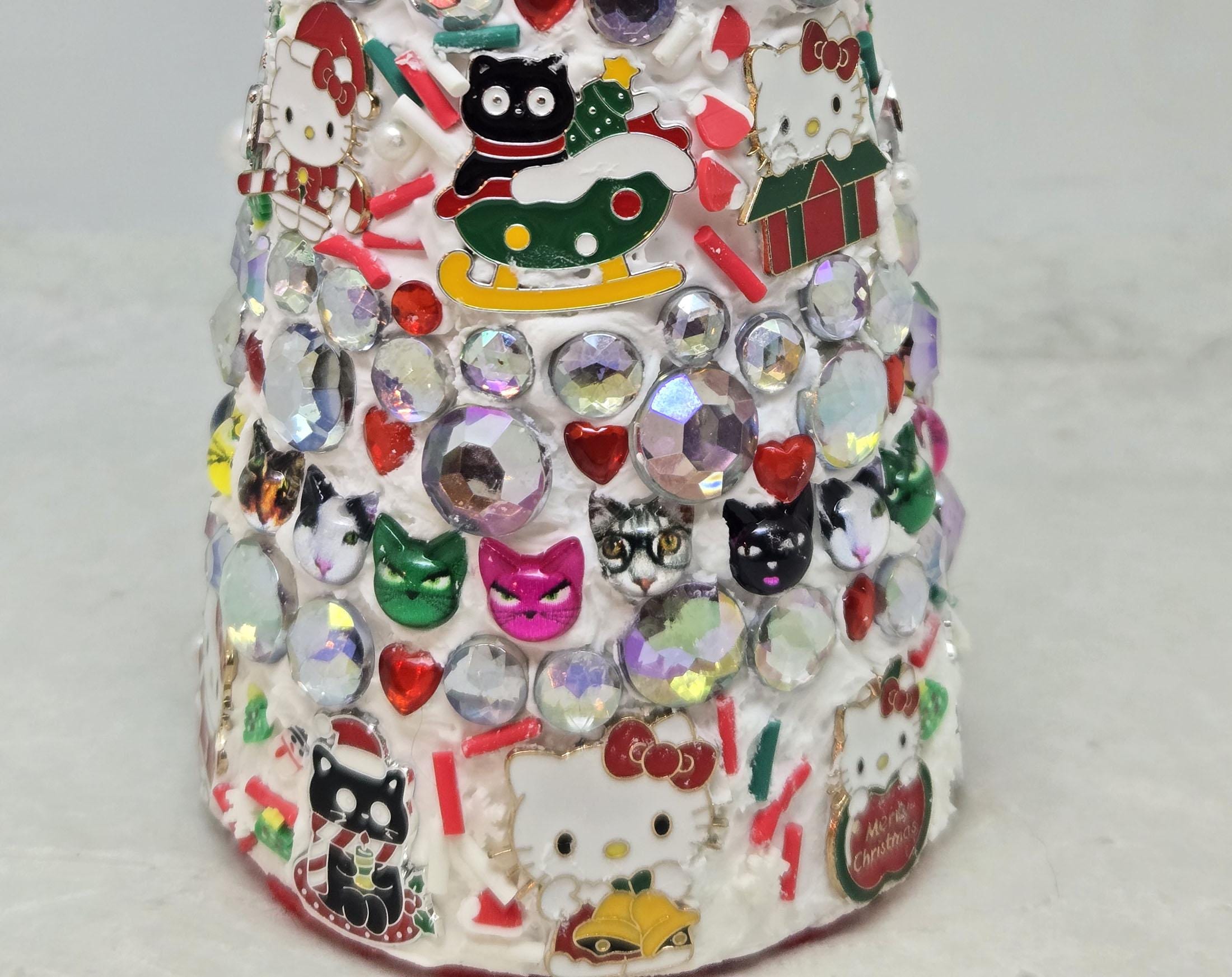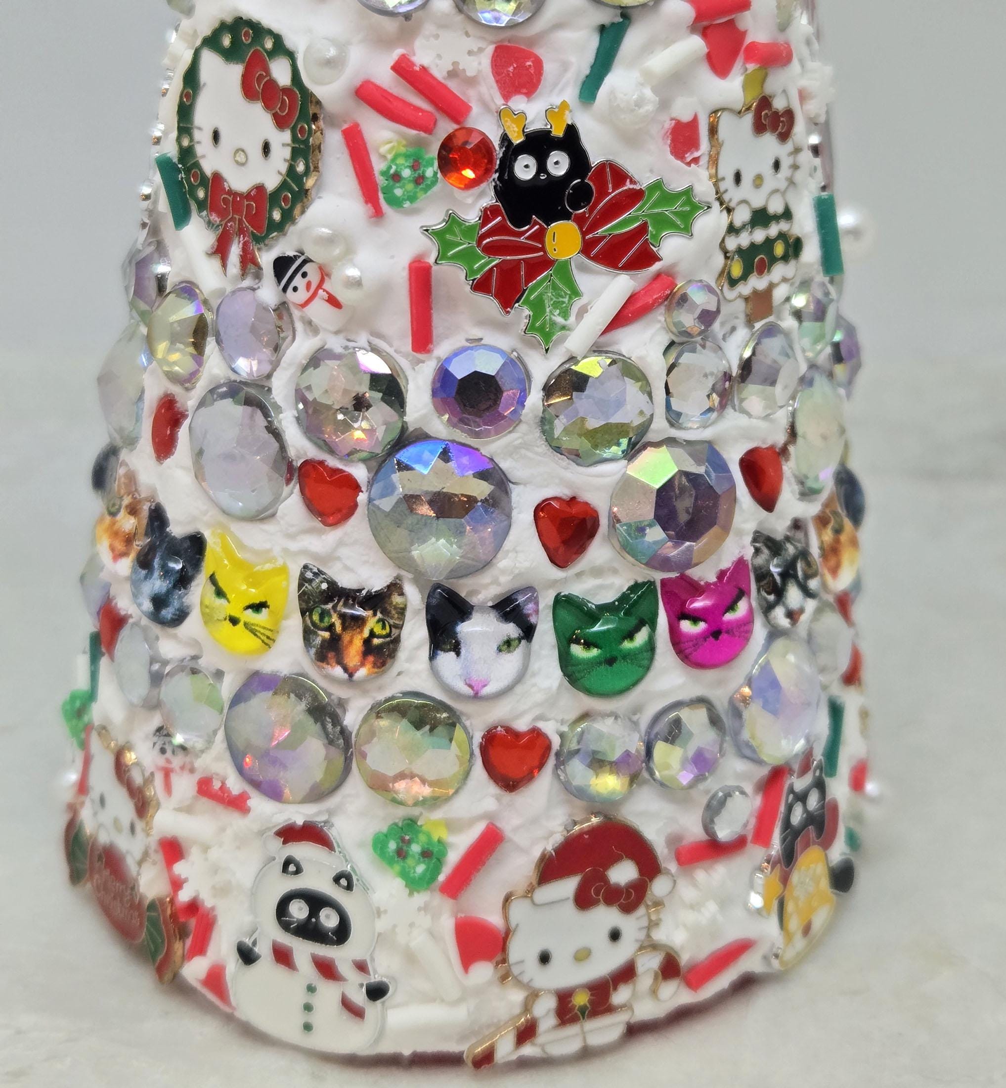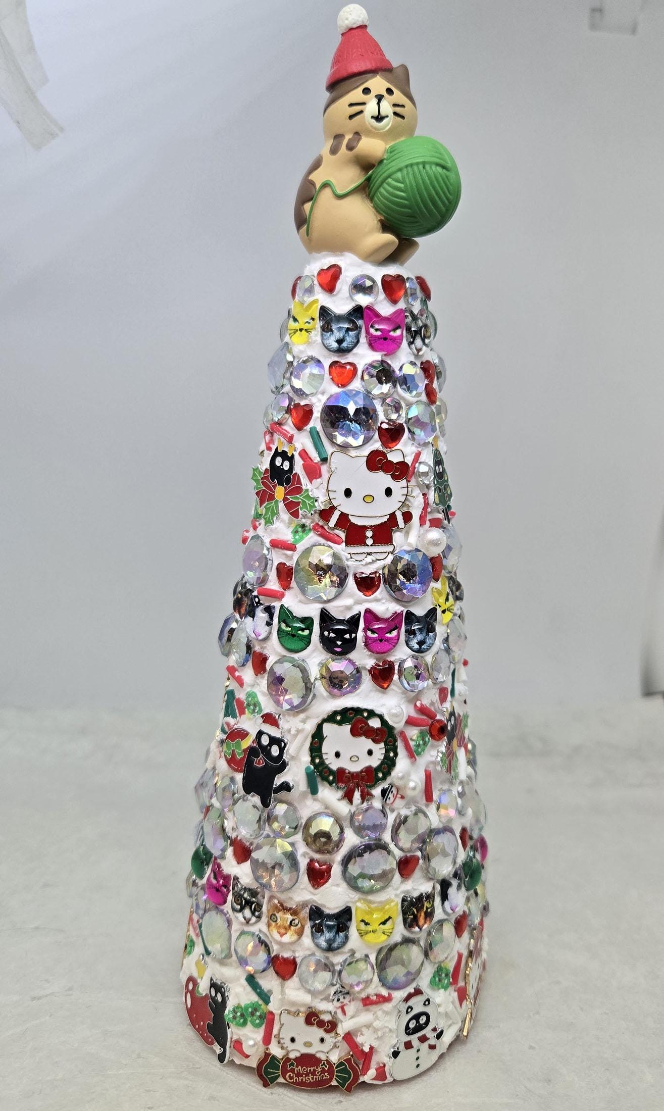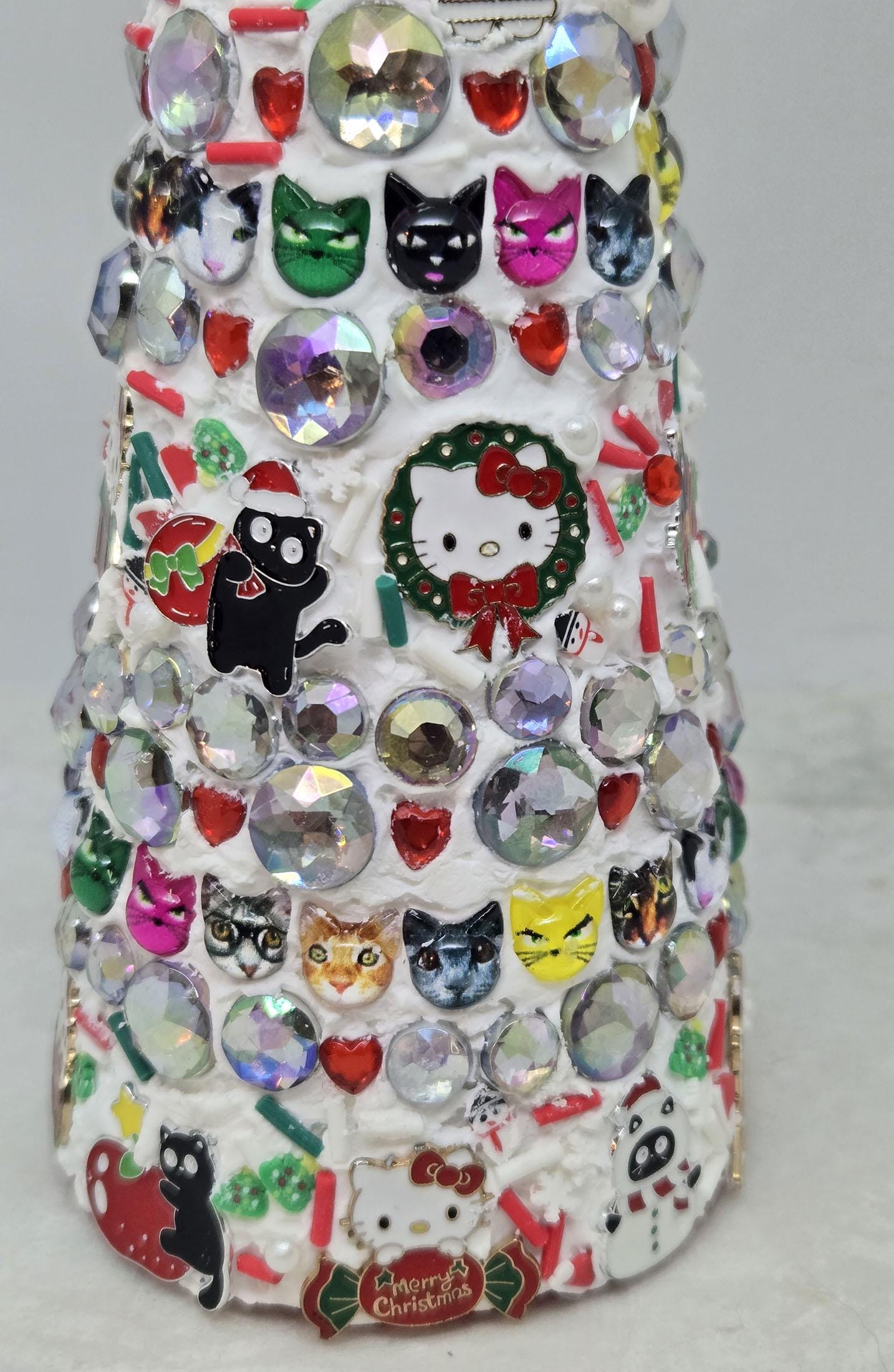 One of a kind, handcrafted Cat Themed tabletop Christmas Tree titled: Merry "Catmus" Tree. I crafted this tree starting with a styrofoam cone. Artificial snow was applied covering the entire cone. The "snow" also served to affix: metal cat charms, plastic cat face embellishments, acrylic flatback gemstones and foam Christmas confetti. A cartoonish cat figurine is the tree topper. The base of the cone was covered with red felt.