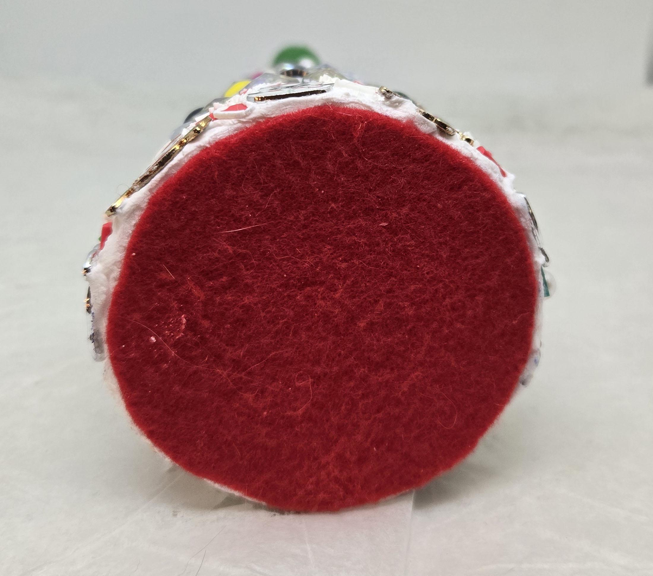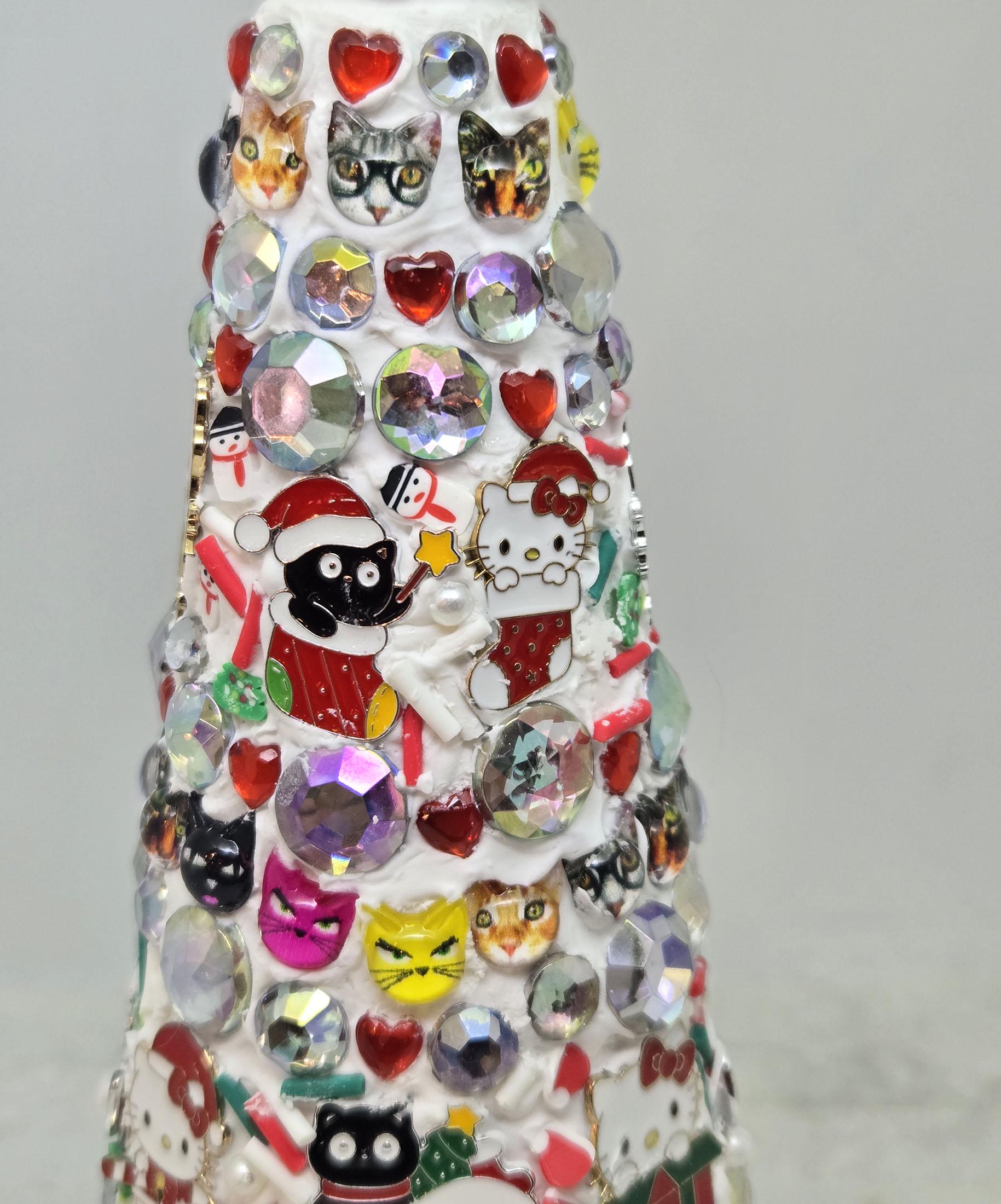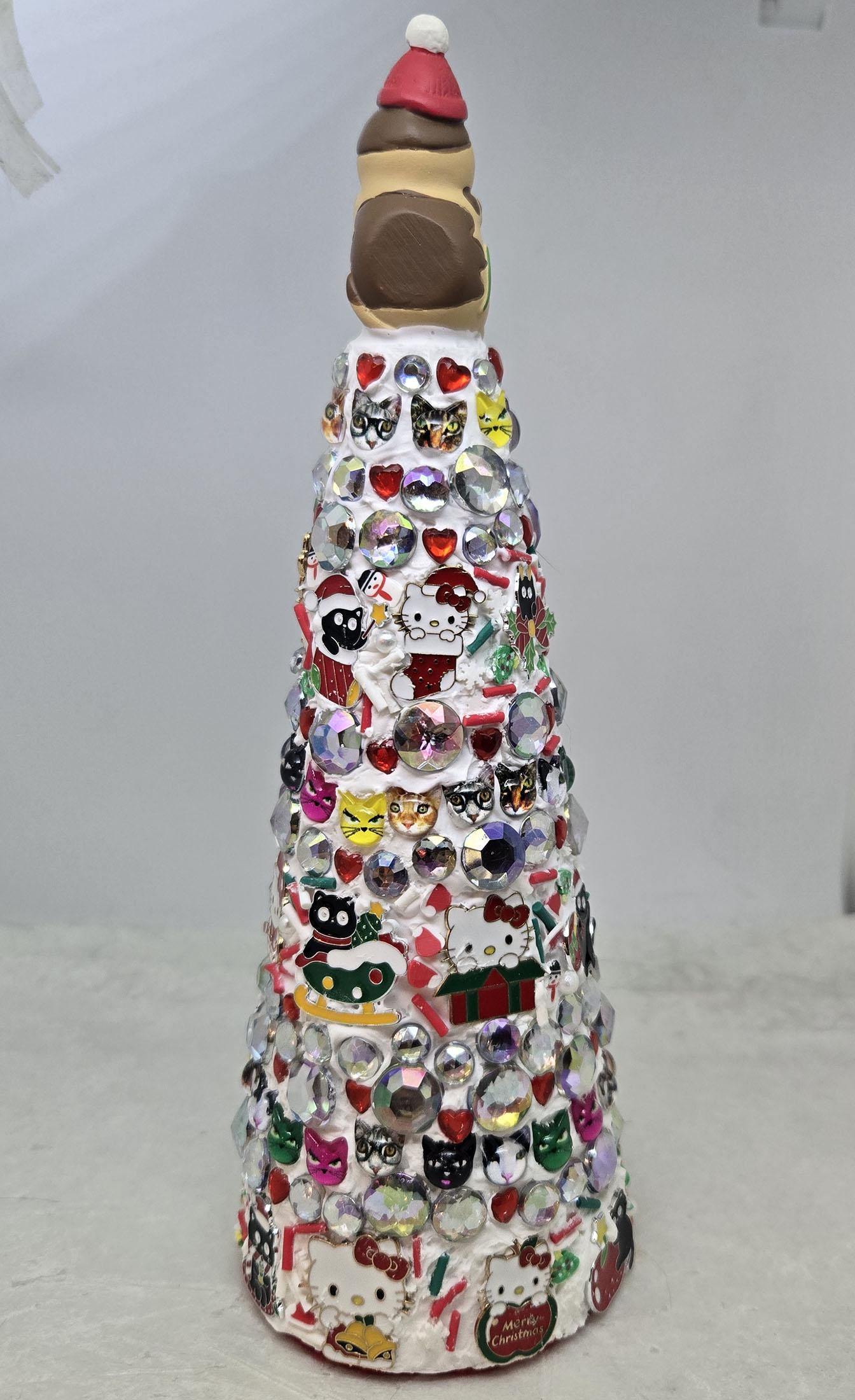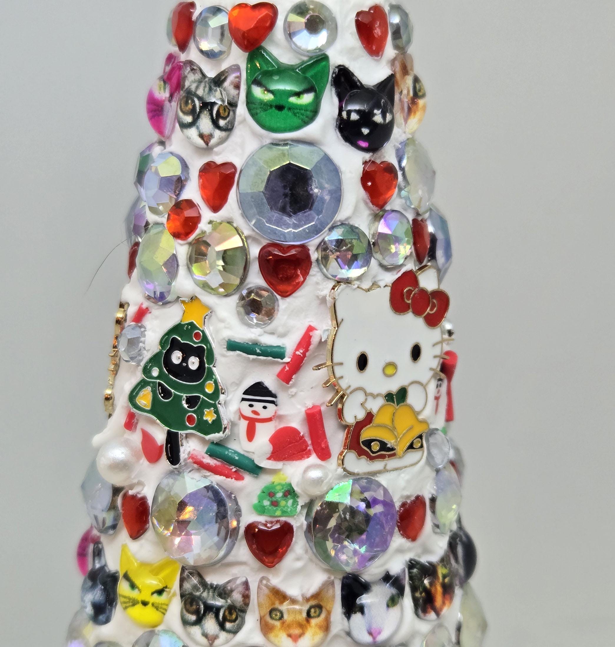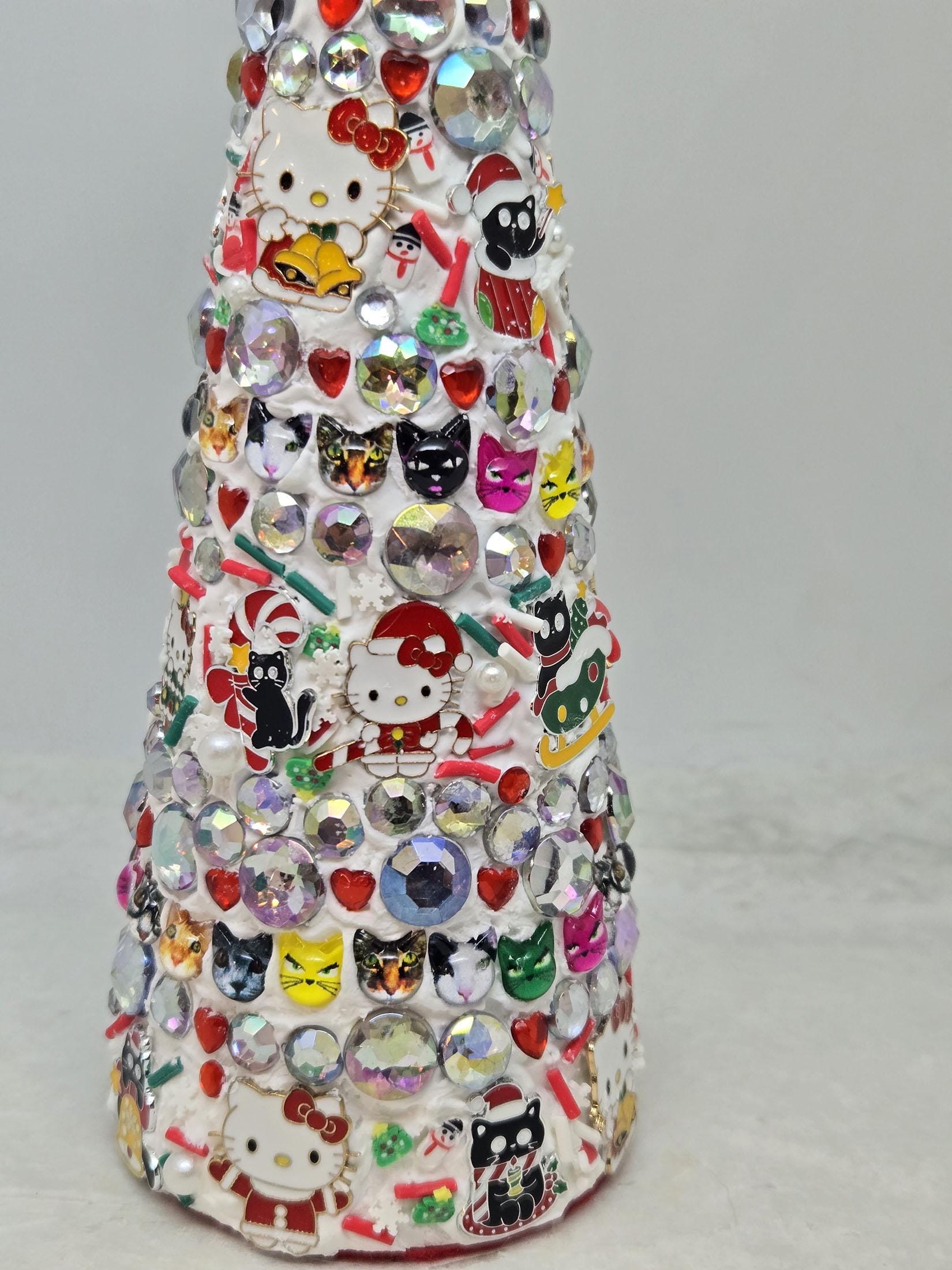 One of a kind, handcrafted Cat Themed tabletop Christmas Tree titled: Merry "Catmus" Tree. I crafted this tree starting with a styrofoam cone. Artificial snow was applied covering the entire cone. The "snow" also served to affix: metal cat charms, plastic cat face embellishments, acrylic flatback gemstones and foam Christmas confetti. A cartoonish cat figurine is the tree topper. The base of the cone was covered with red felt.