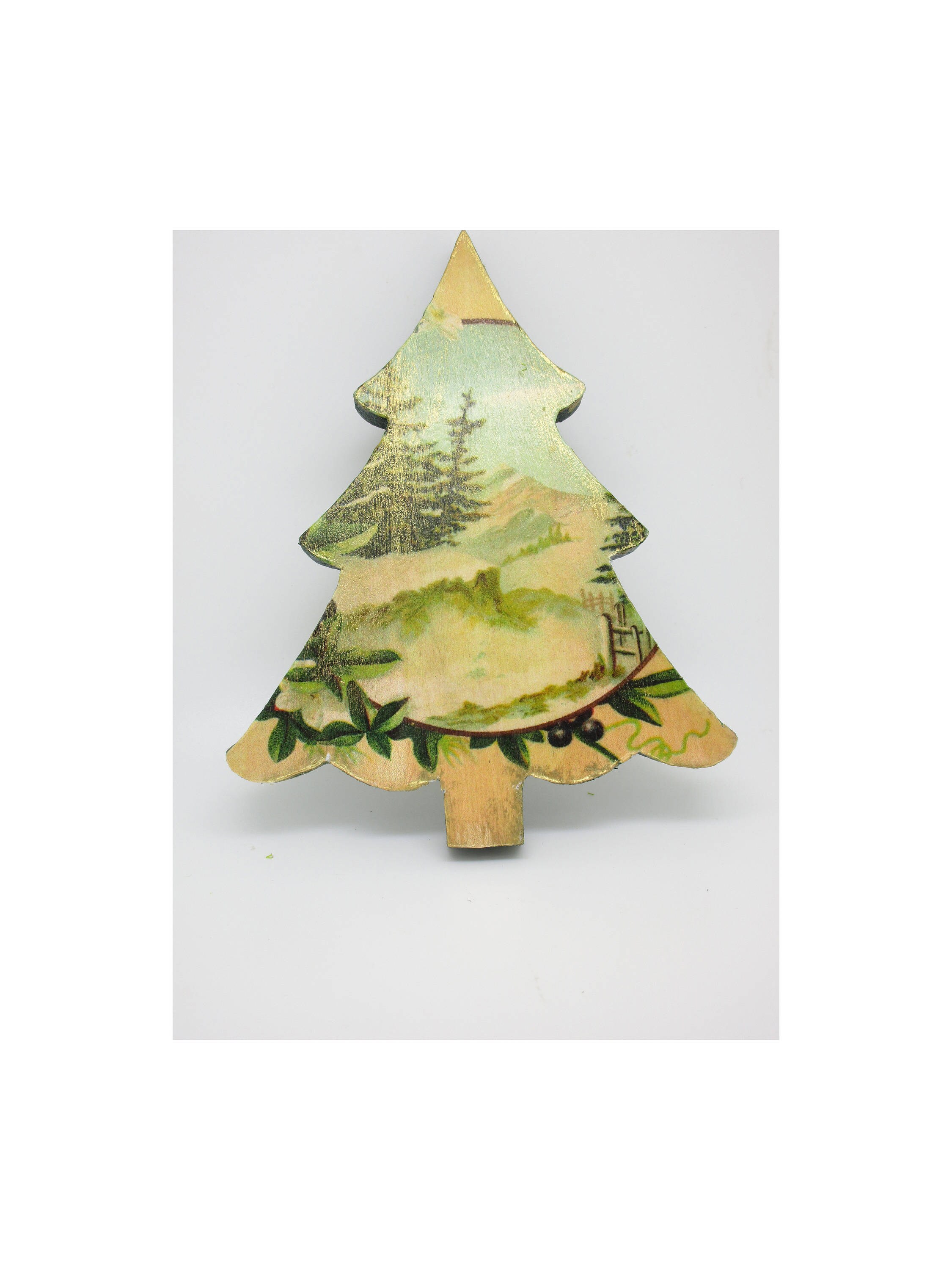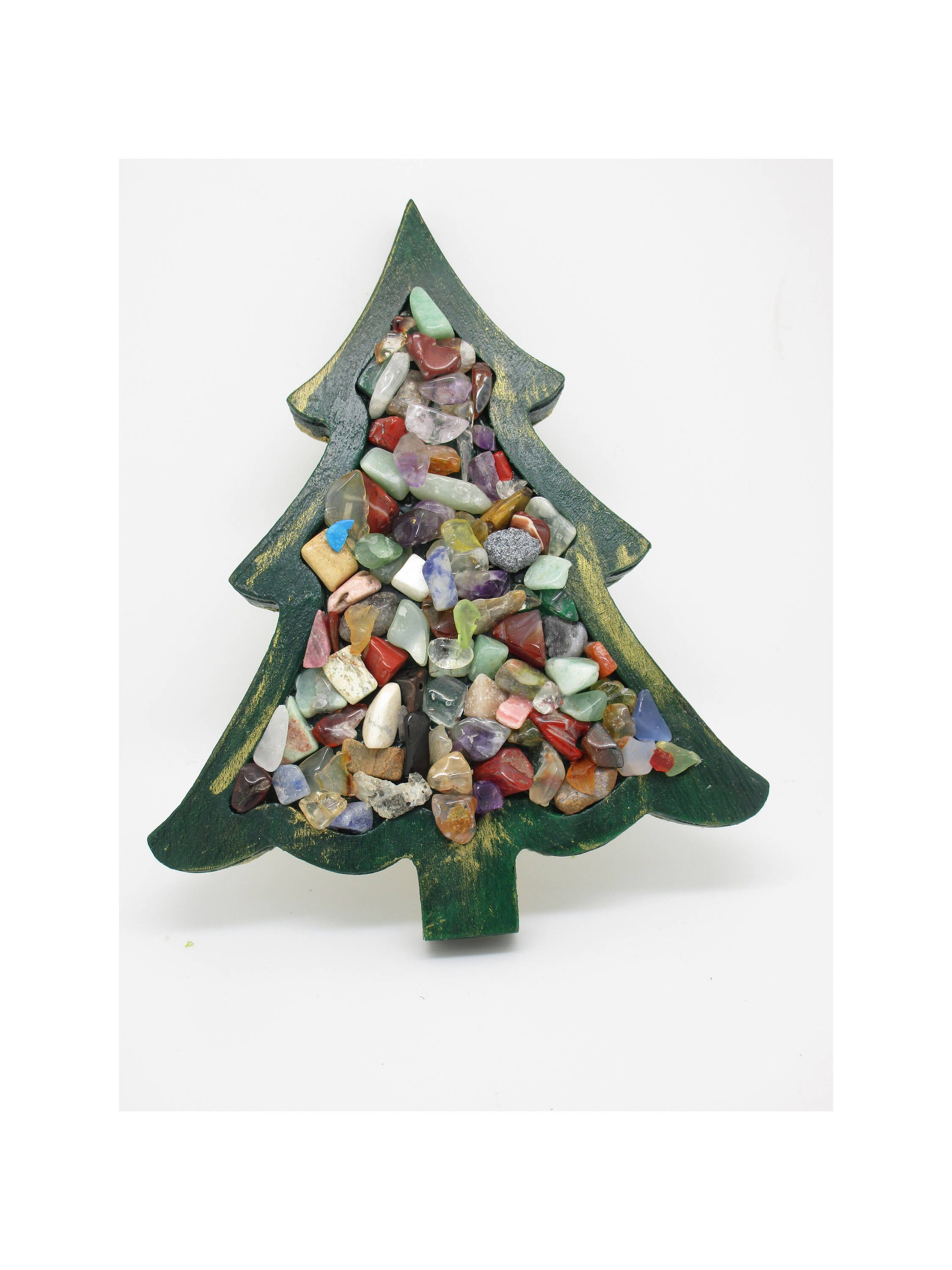 I crafted this one-of-a-kind ornament using a wood shaped tree form with a hollowed out center. I painted with wood, added accents of gold metallic wax and then sealed this with polyurthane. I filled the center with gemstone chips. These include, but are not limited to, amazonite, fluorite, rhodonite, jade and jasper. The back is covered with a vintage style winter mountain image sealed with antique mod podge and accented with a touch of the metallic wax.